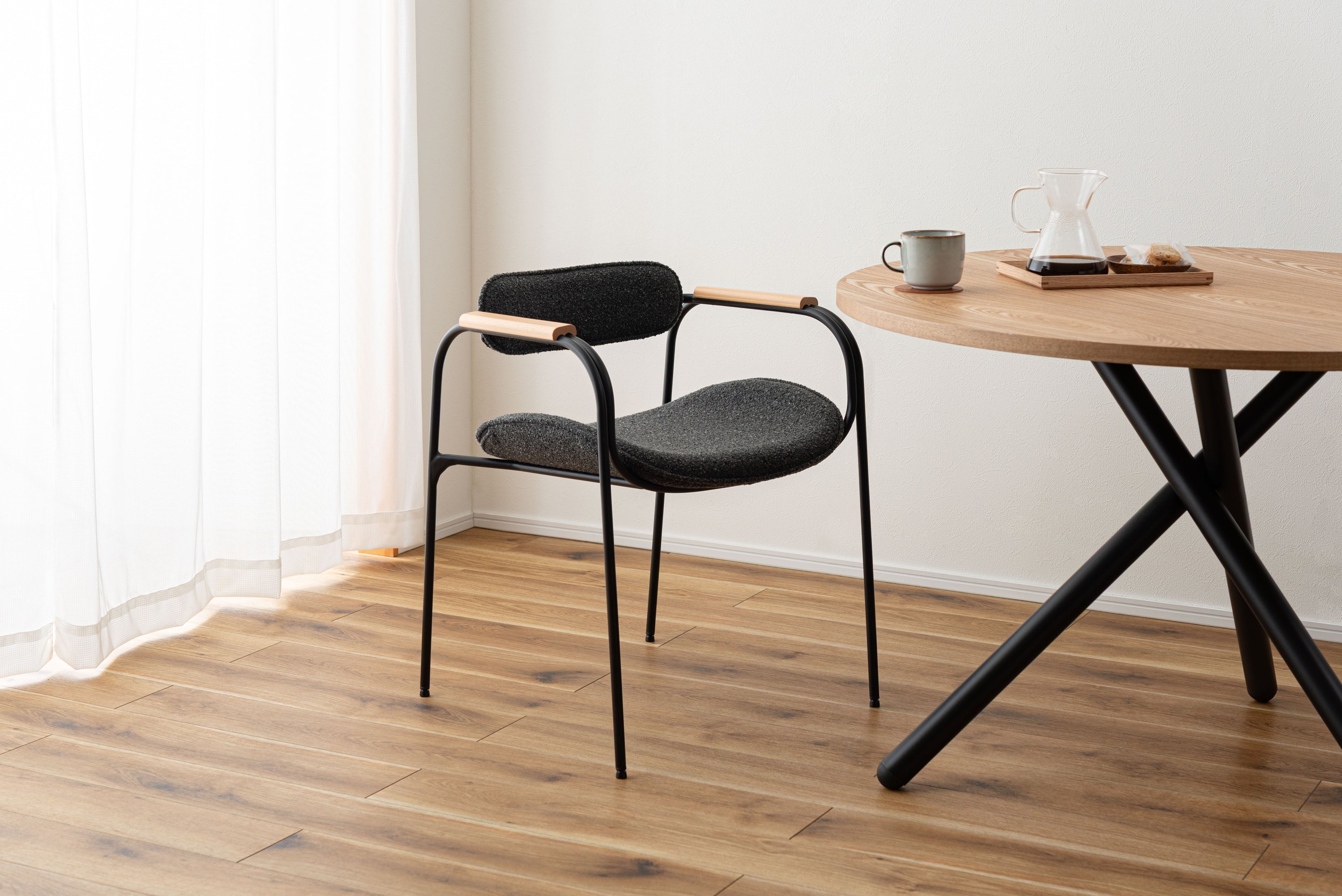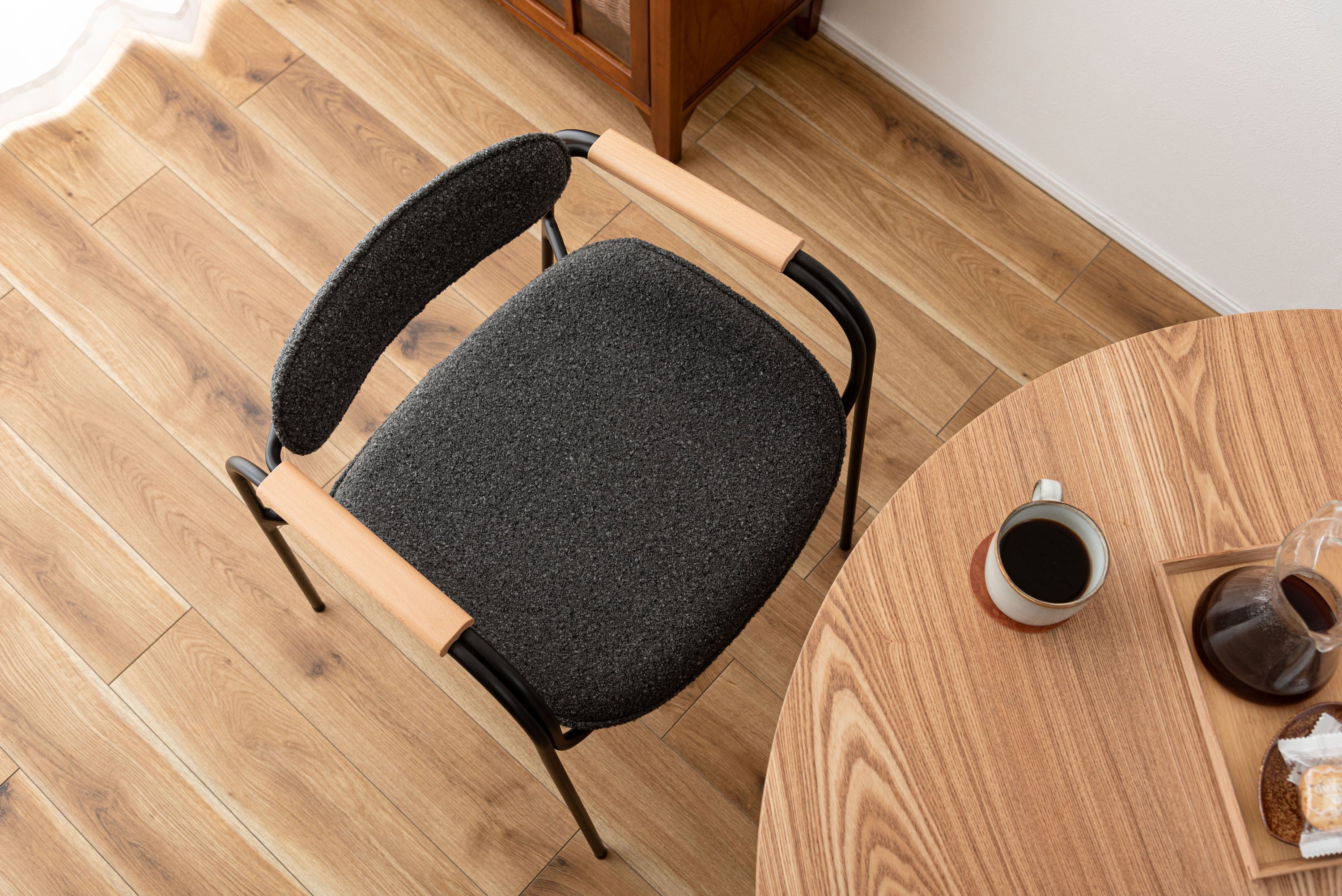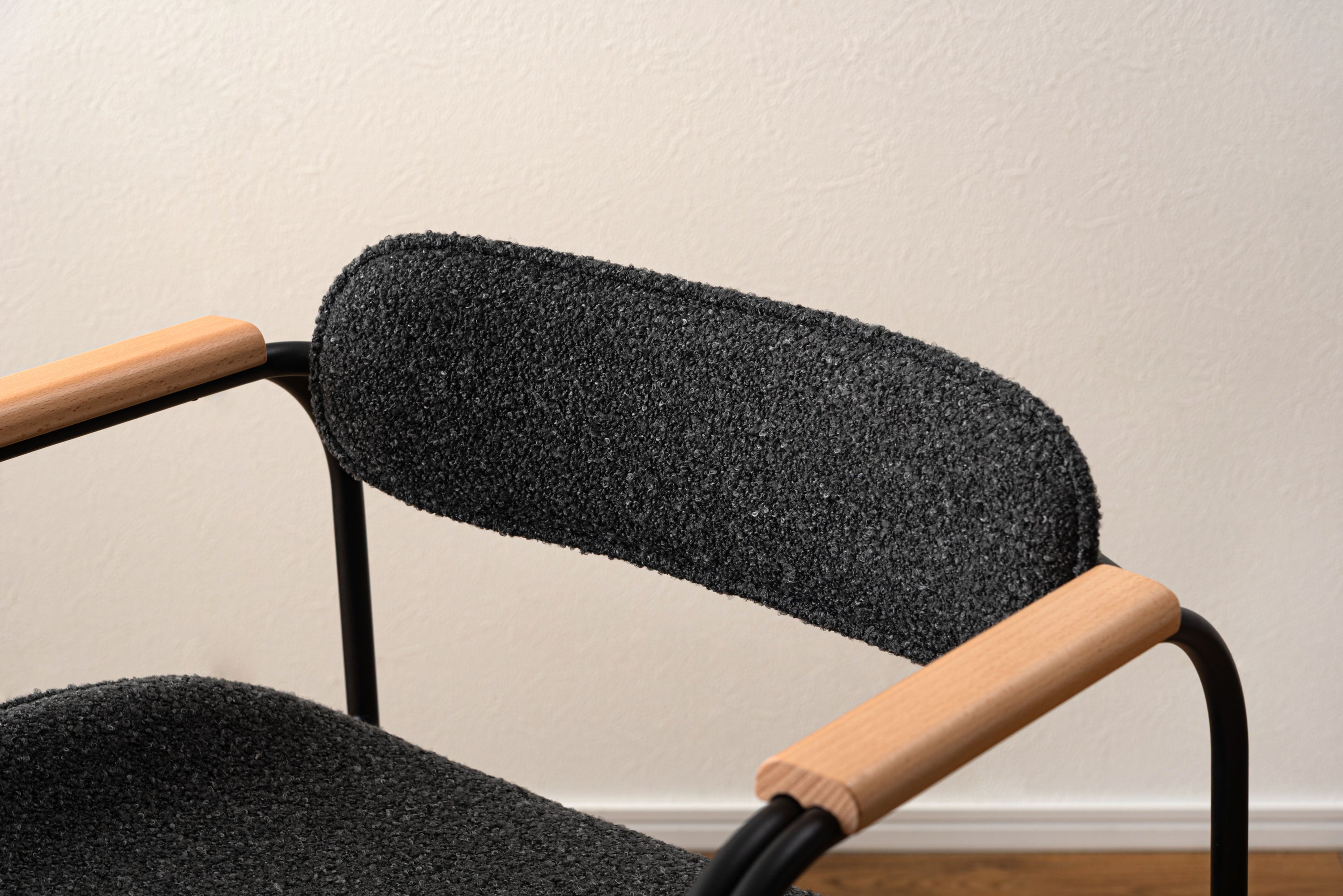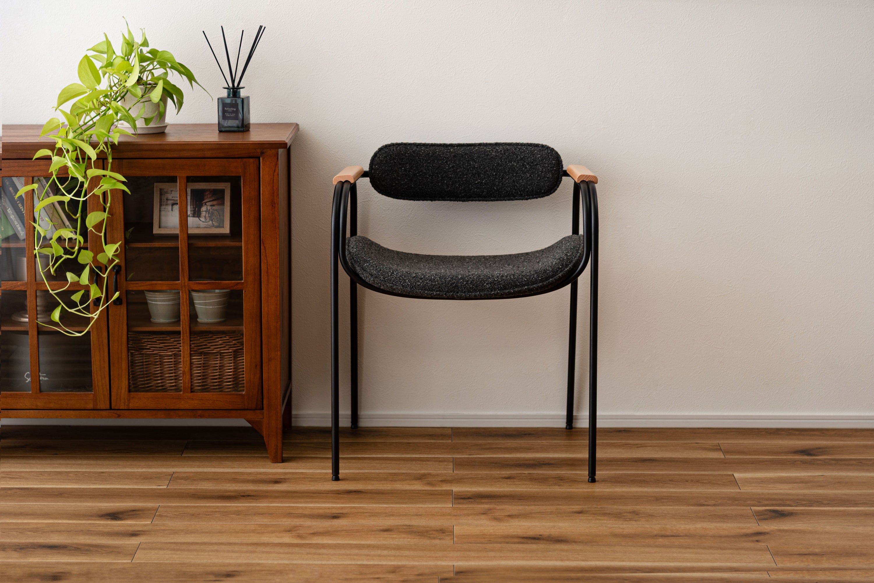 空間のアクセントになる洗練されたデザイン。すっきりとしたブラックスチールと、丸みを帯びたフォルムが個性的なアームチェア。緩やかに湾曲した座面が身体にフィットし、自然な姿勢をサポートしてくれます。表情豊かで落ち着いた色味のファブリックが、上質な印象を演出します。様々なインテリアとなじみながら、程よい存在感を放ちます。天然木を使用したアーム。身体にフィットする湾曲した座面。表情のあるファブリックを使用。首振り仕様