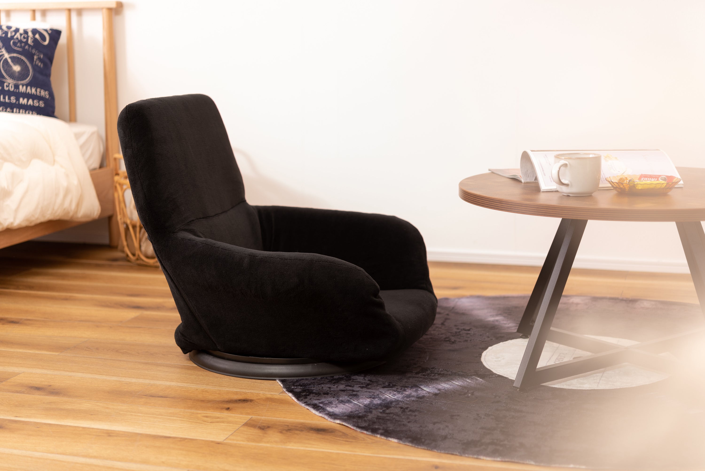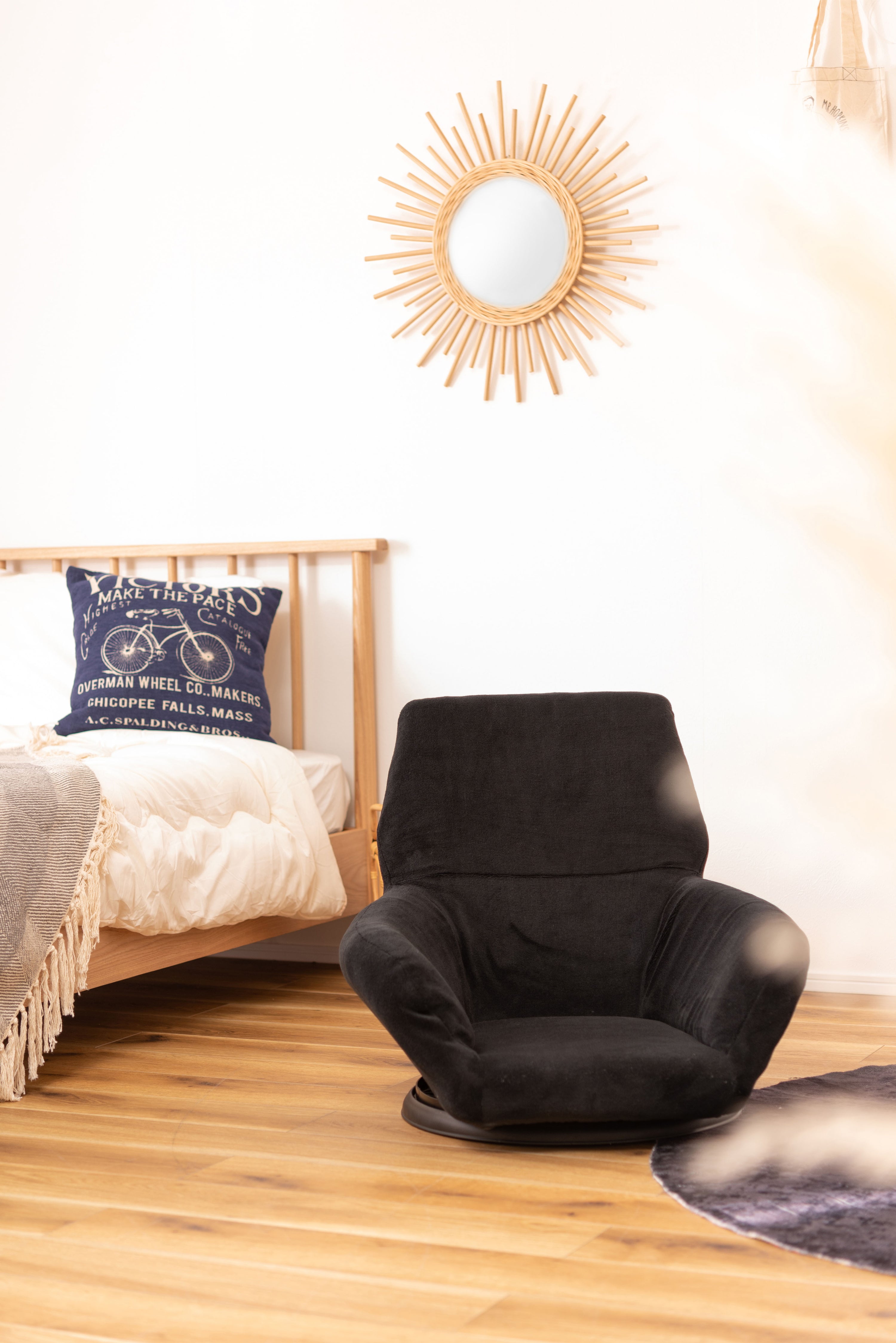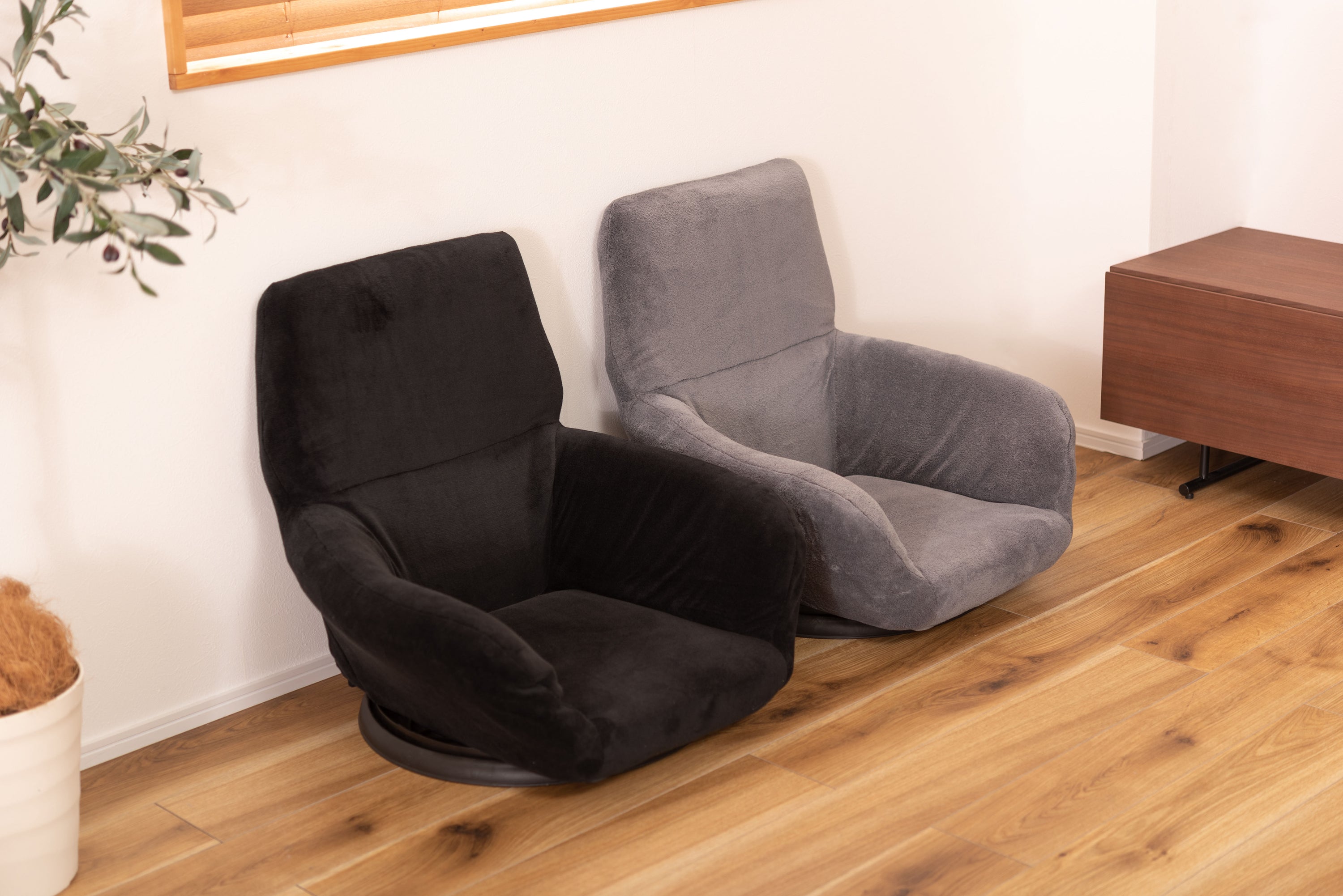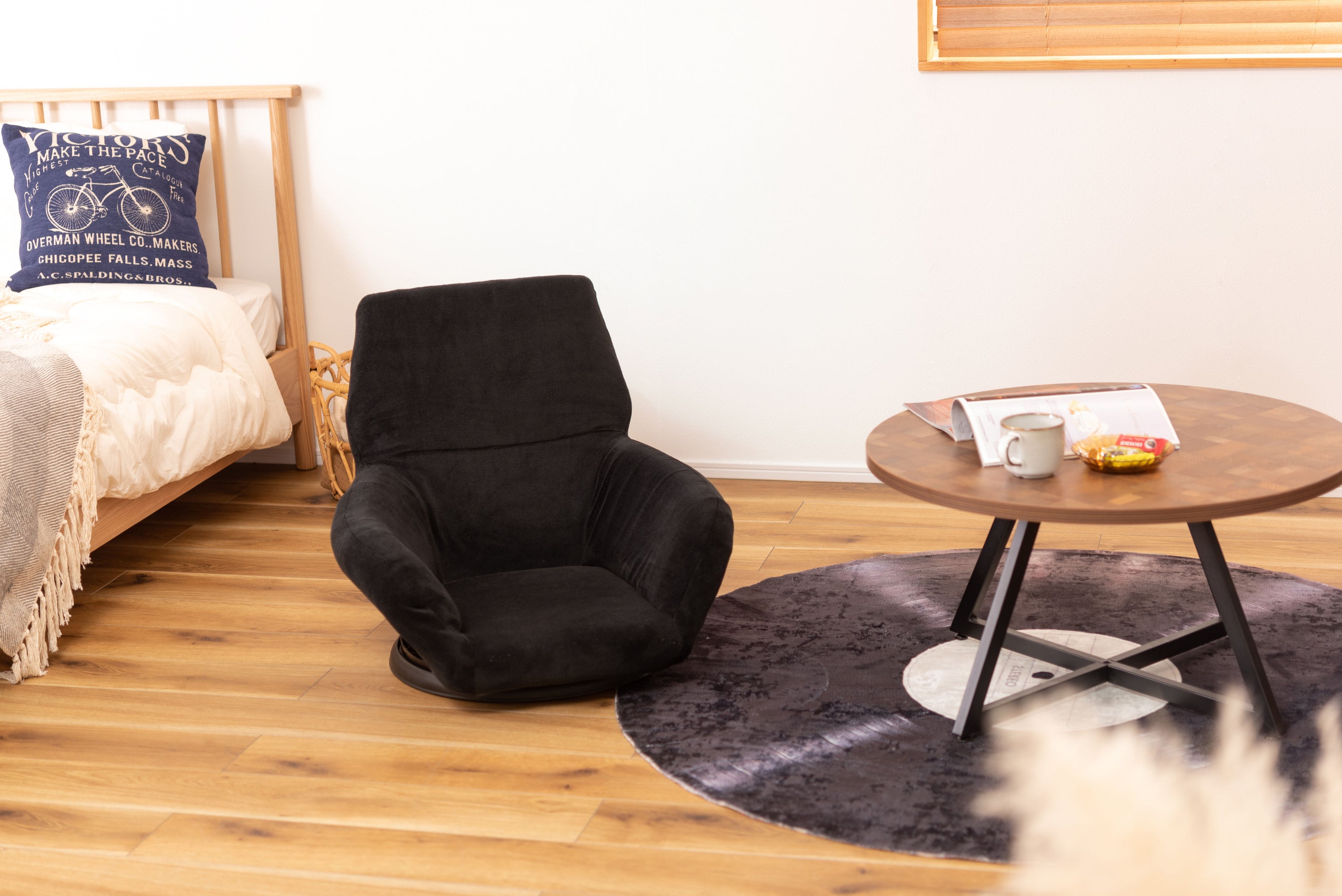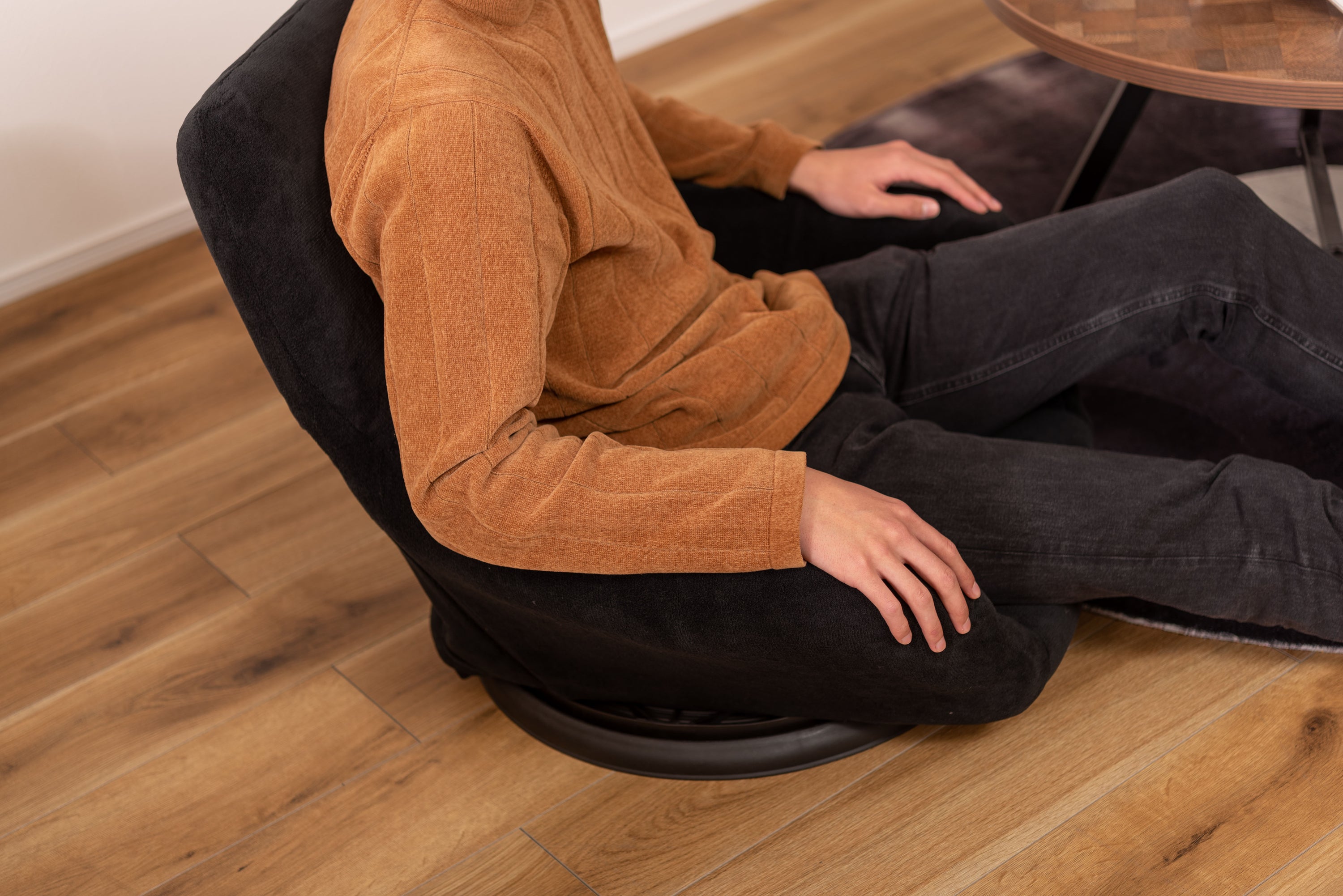 360度回転するので座ったまま向きを変えられ、狭いスペースでも動きやすさをサポートするフロアチェアです。柔らかい触感の生地が体を優しく包み込んでくれます。バケットタイプで包み込まれるような座り心地を体感でき、長時間座っても疲れにくい設計になっています。肘掛けが付いているので立ち座りがしやすく、安定感のある座り心地を実感できます。