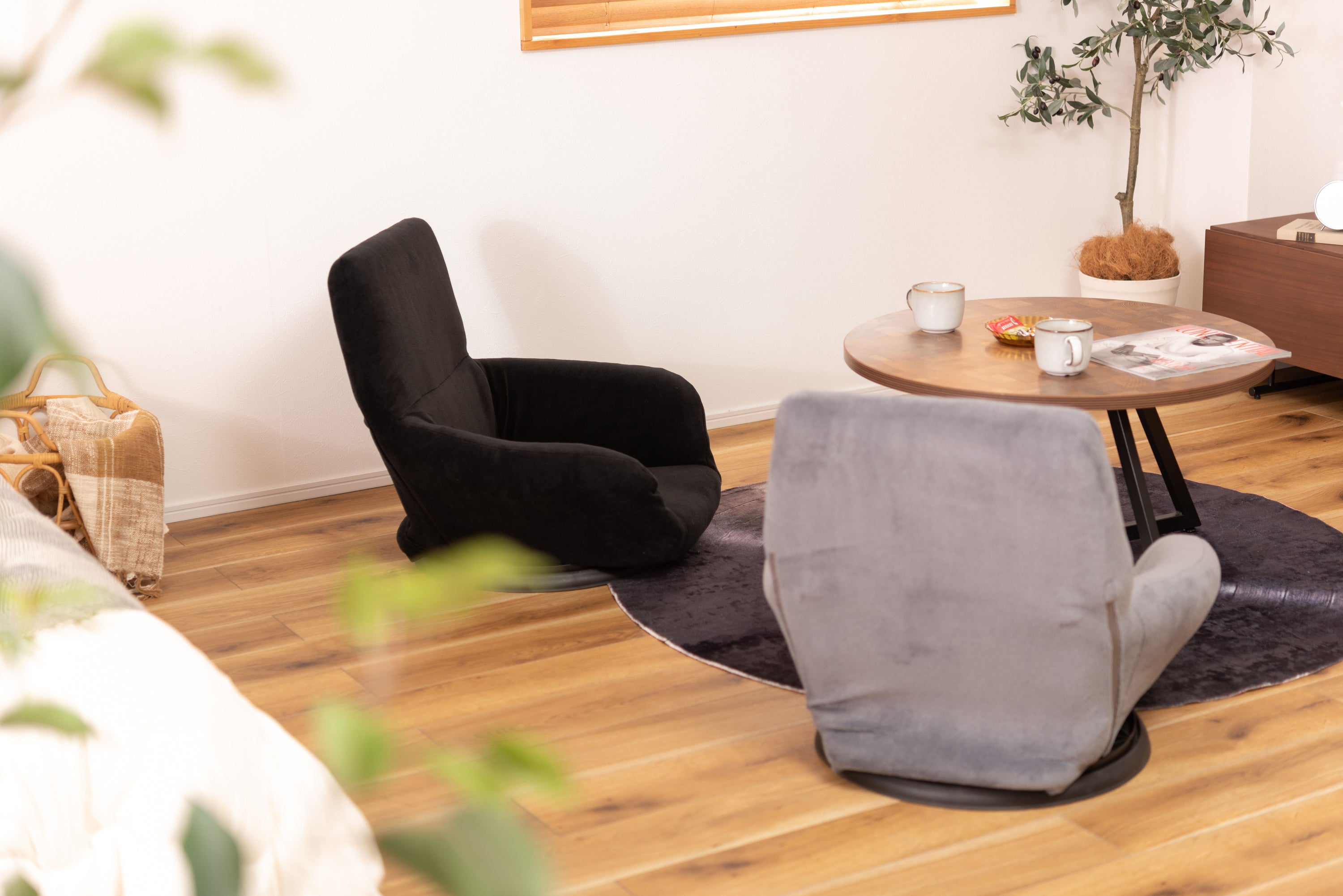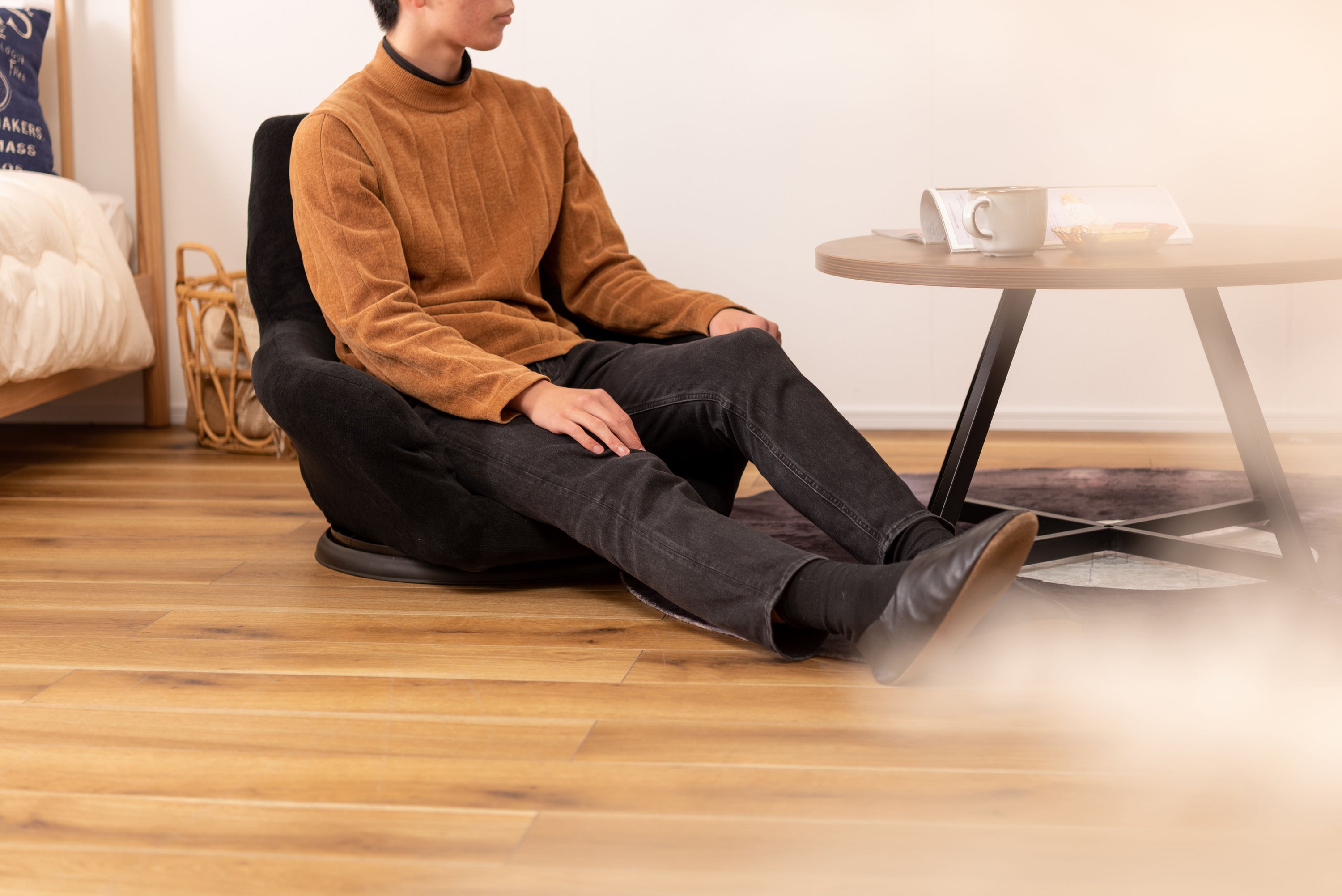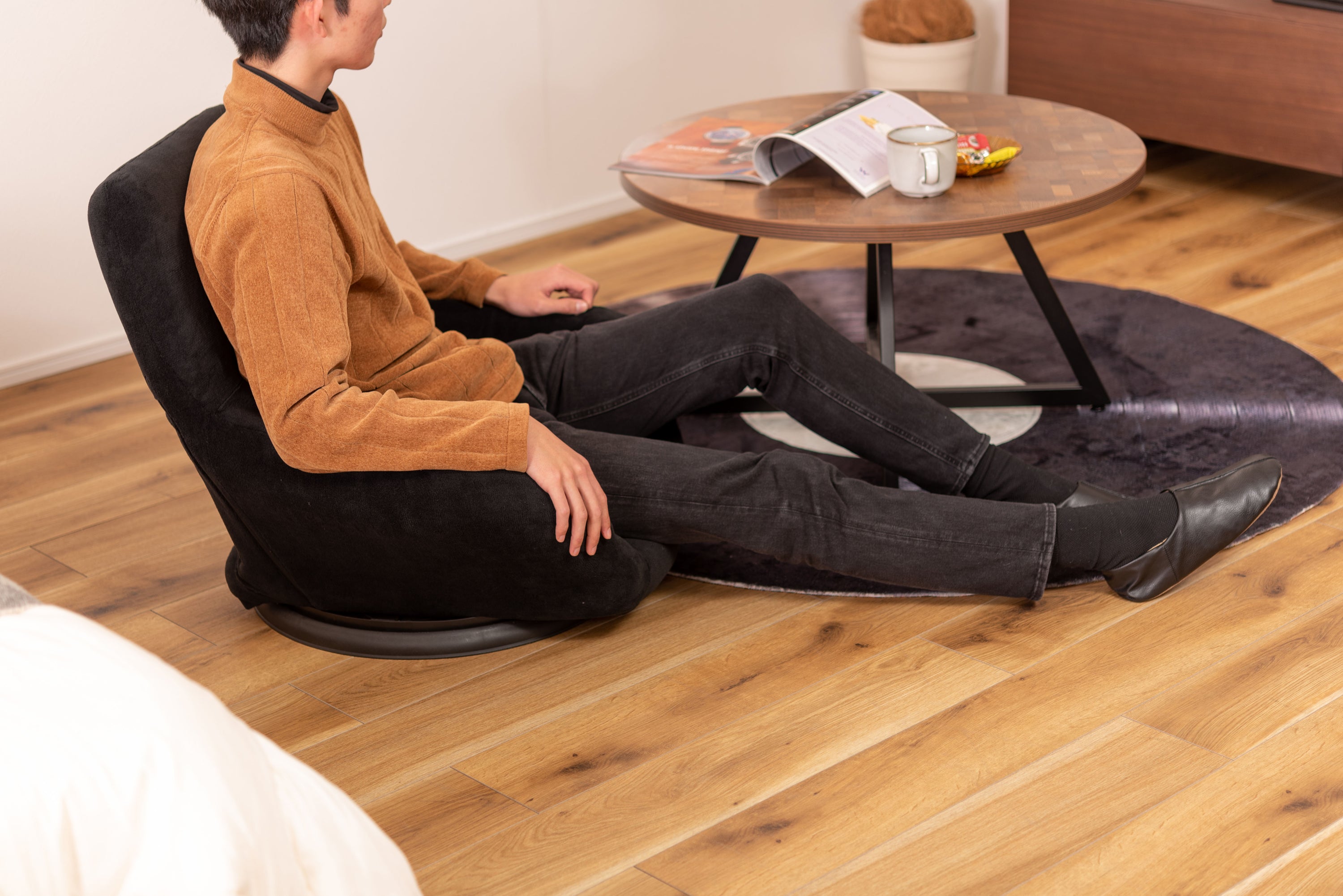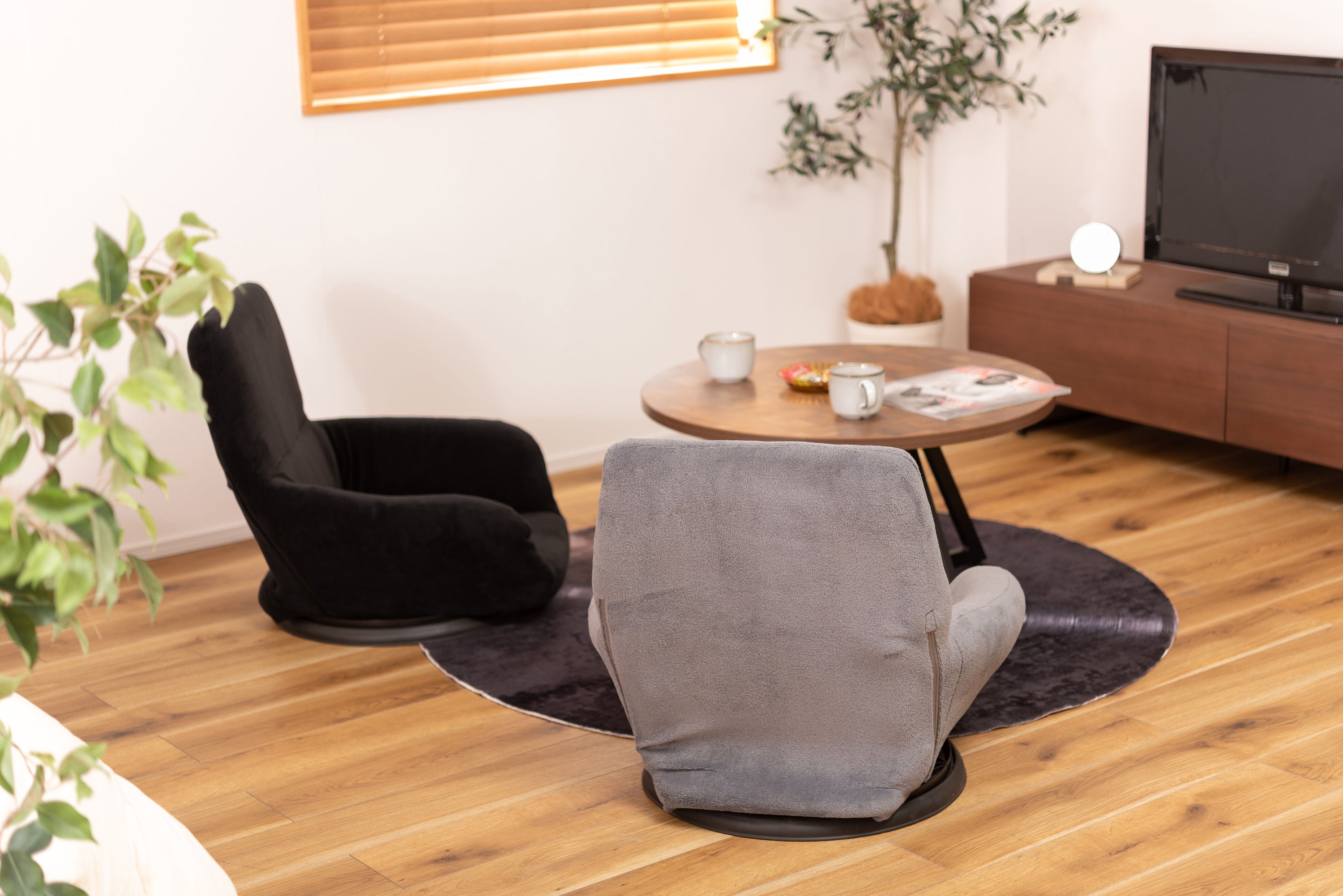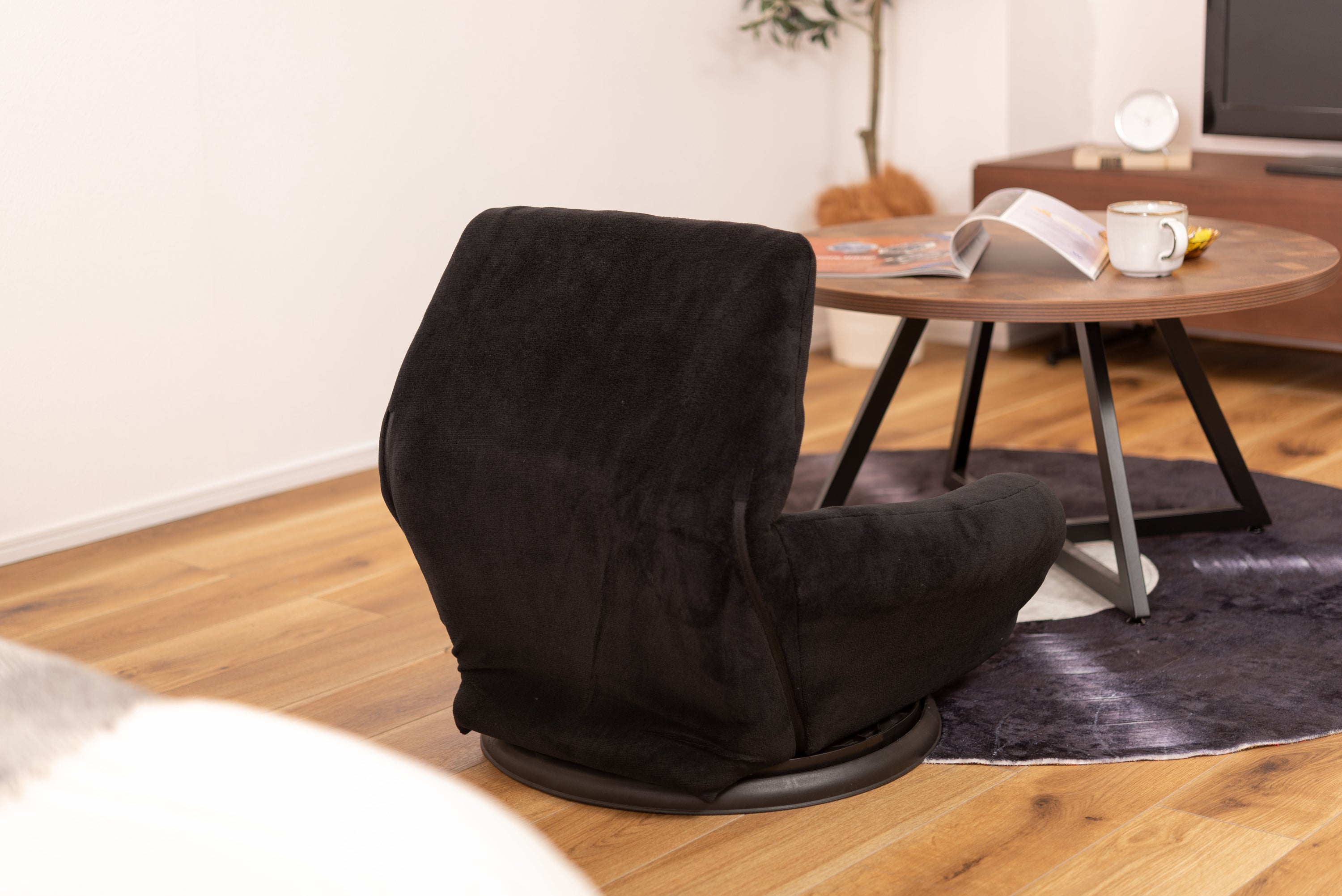 360度回転するので座ったまま向きを変えられ、狭いスペースでも動きやすさをサポートするフロアチェアです。柔らかい触感の生地が体を優しく包み込んでくれます。バケットタイプで包み込まれるような座り心地を体感でき、長時間座っても疲れにくい設計になっています。肘掛けが付いているので立ち座りがしやすく、安定感のある座り心地を実感できます。
