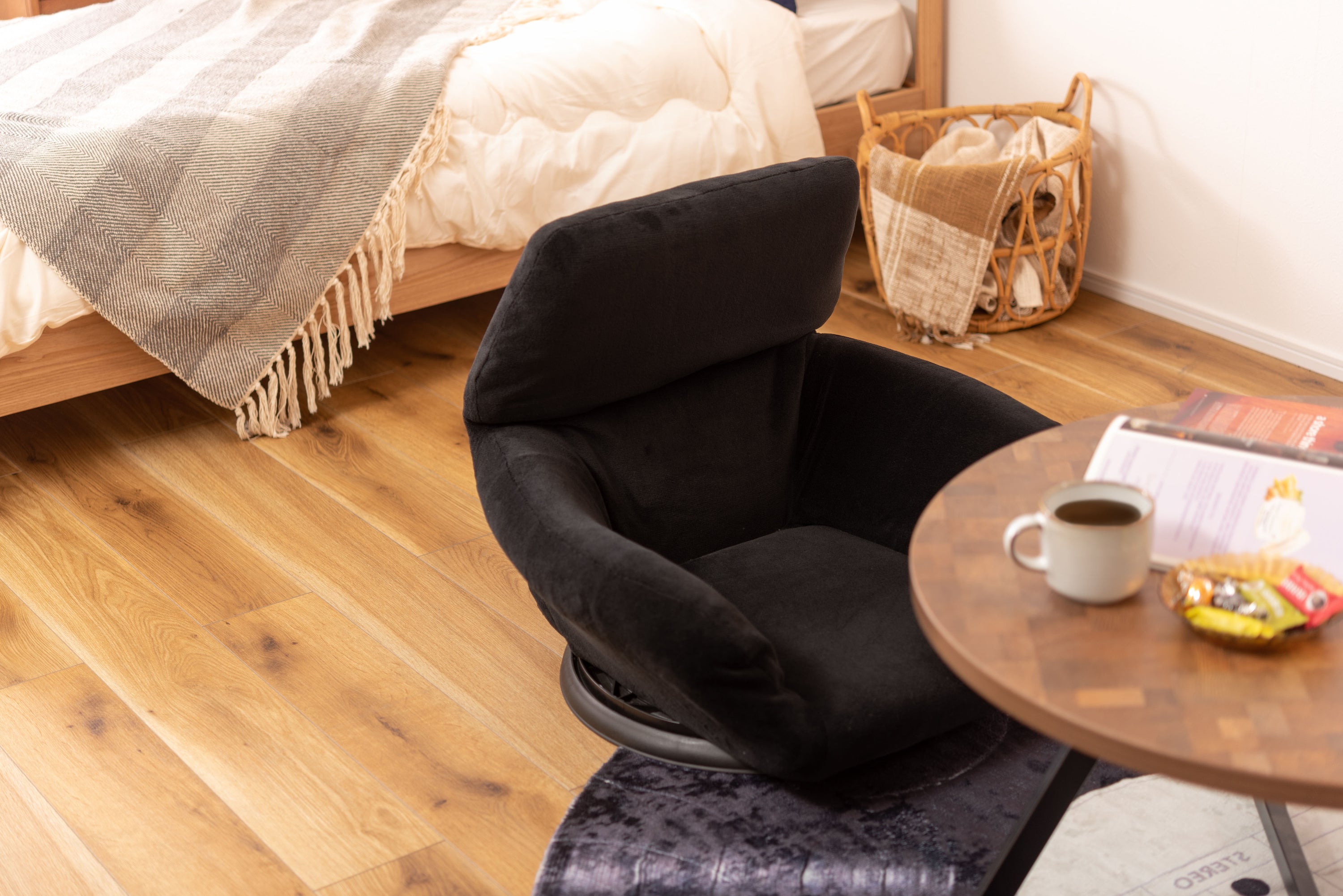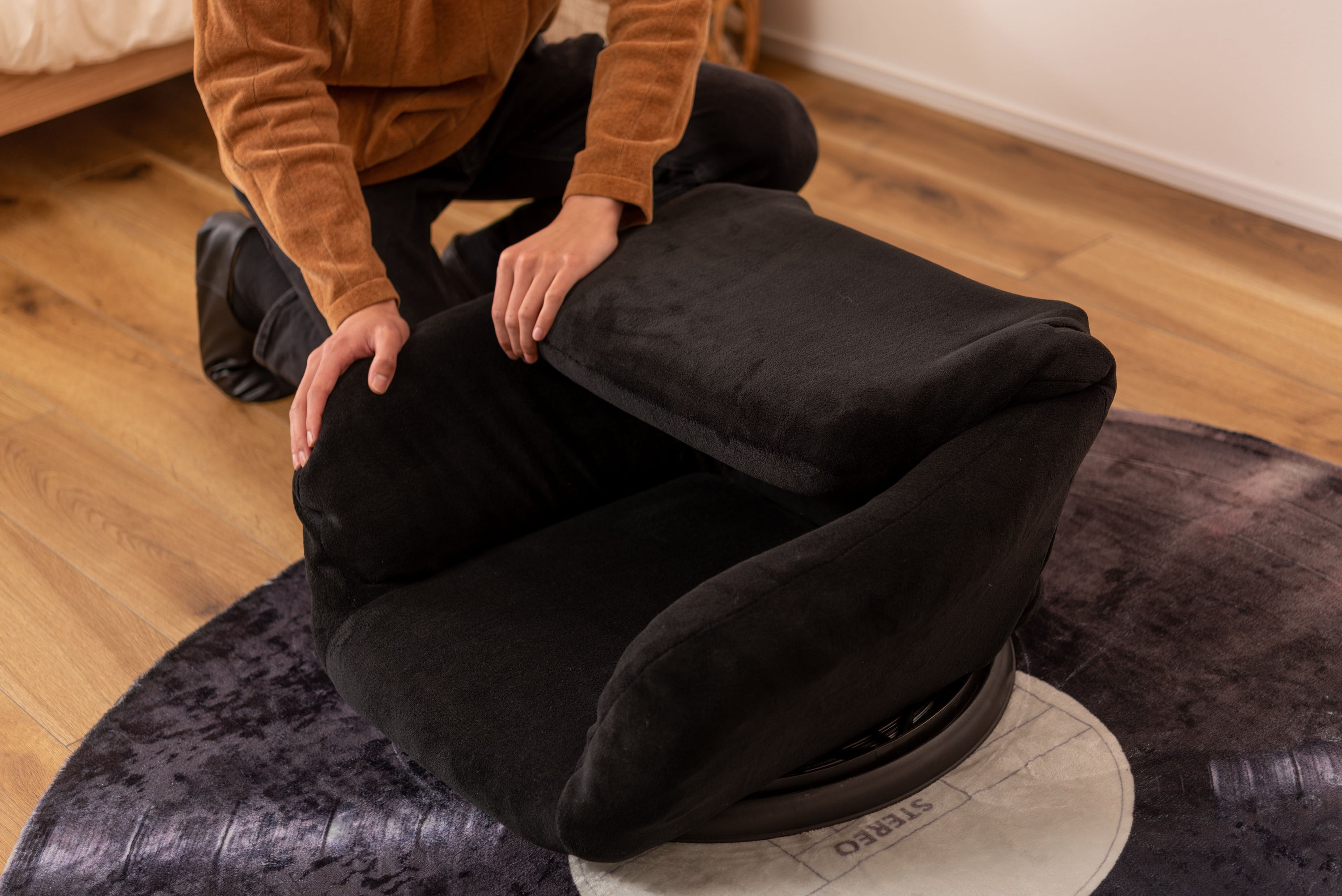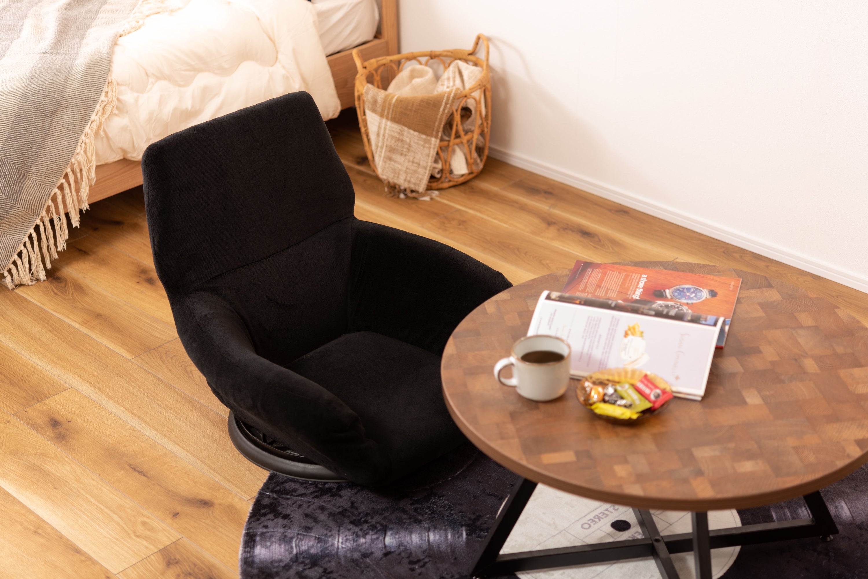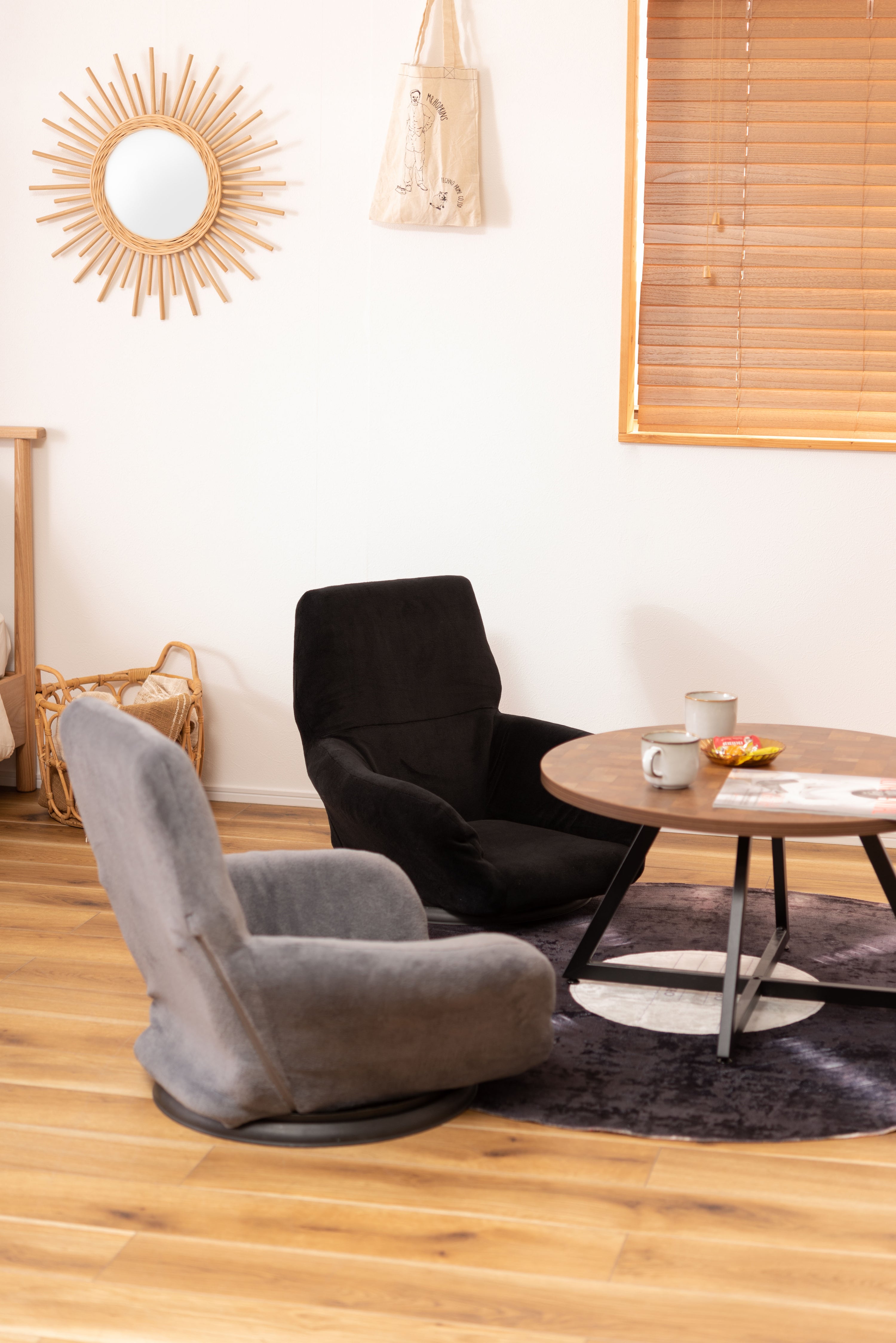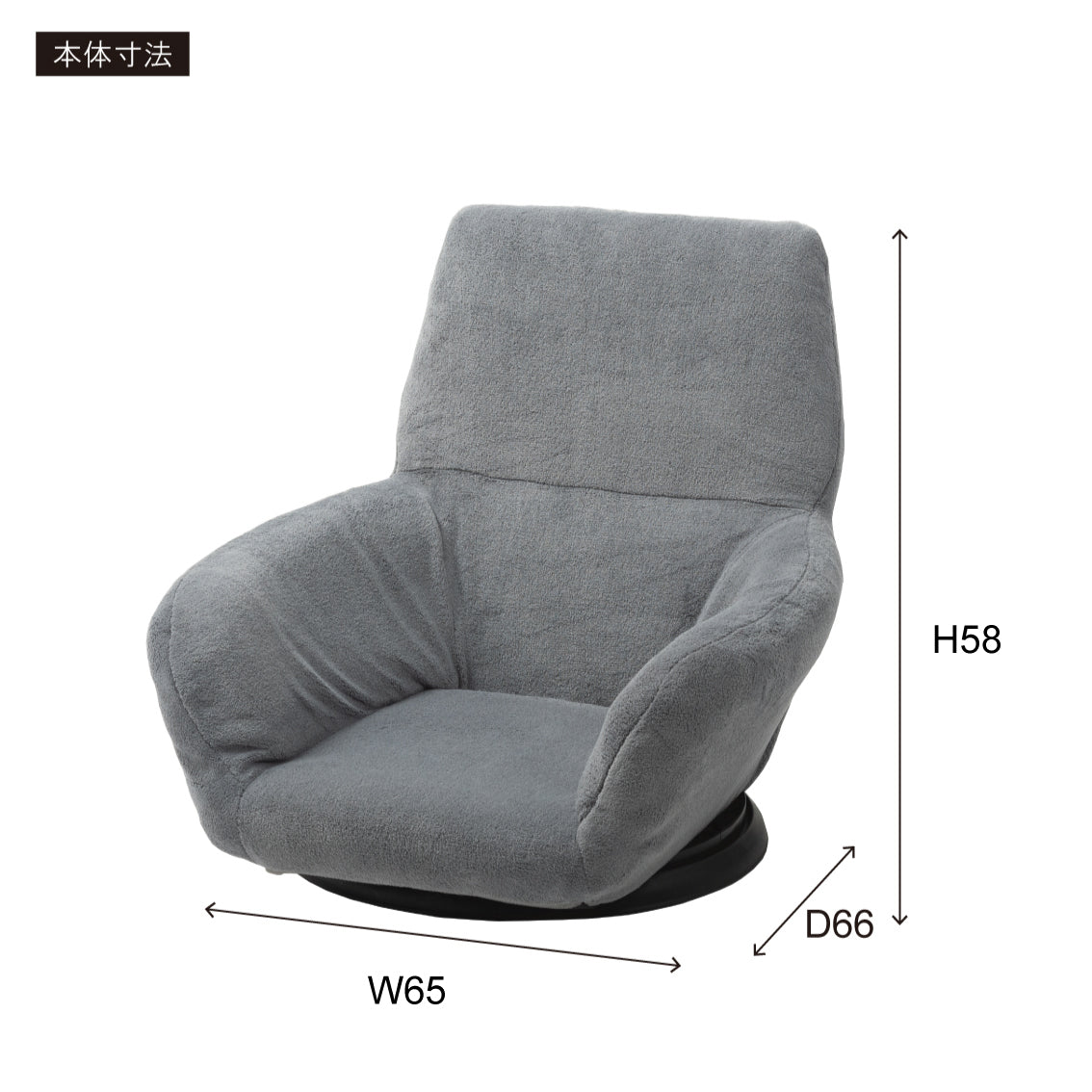 360度回転するので座ったまま向きを変えられ、狭いスペースでも動きやすさをサポートするフロアチェアです。柔らかい触感の生地が体を優しく包み込んでくれます。バケットタイプで包み込まれるような座り心地を体感でき、長時間座っても疲れにくい設計になっています。肘掛けが付いているので立ち座りがしやすく、安定感のある座り心地を実感できます。