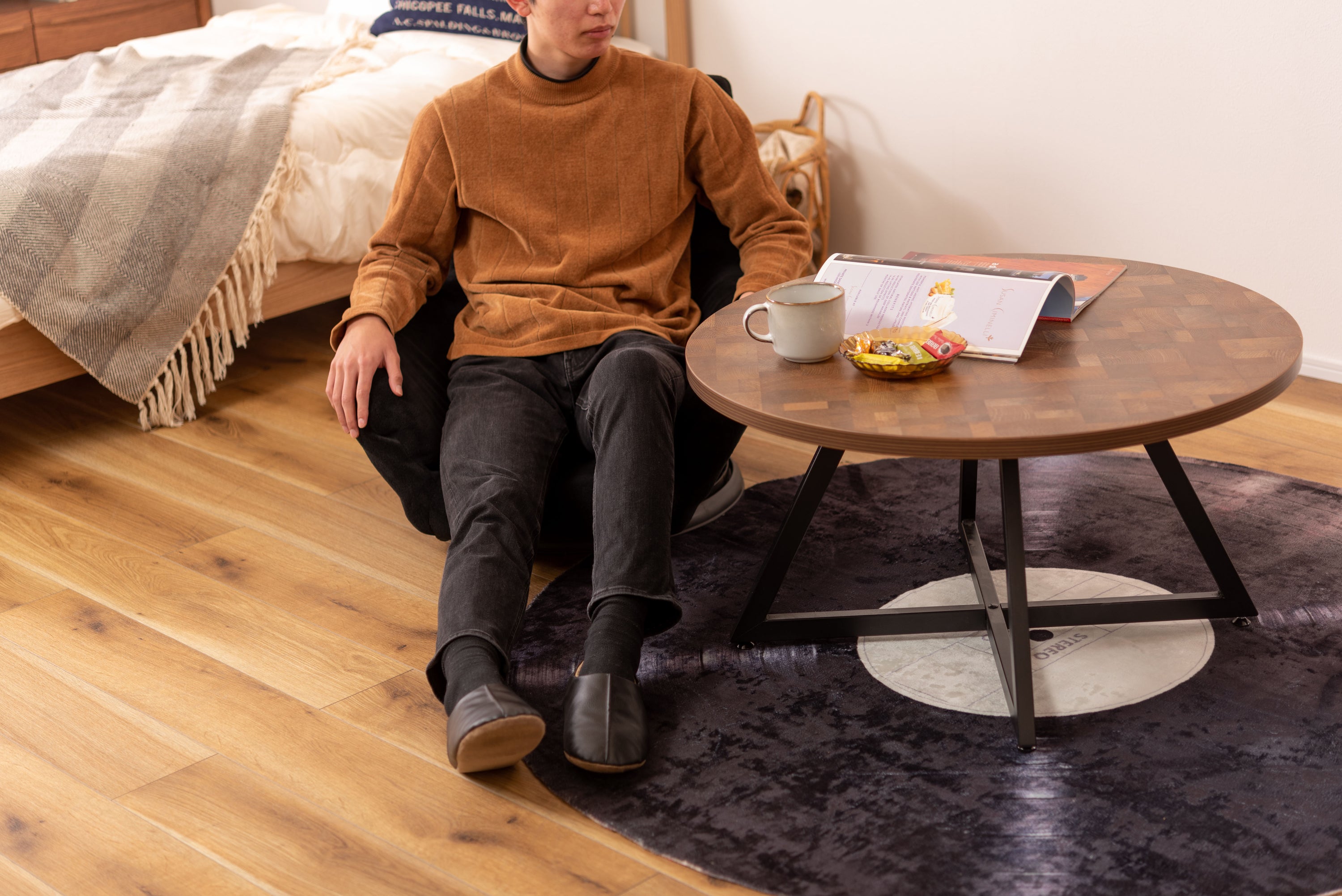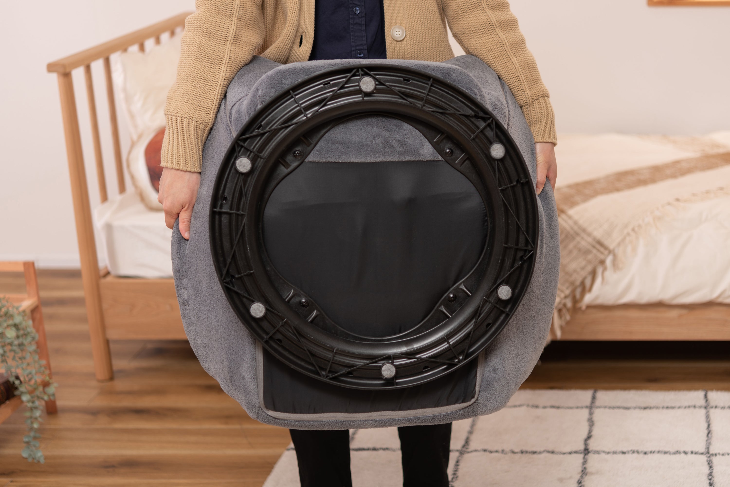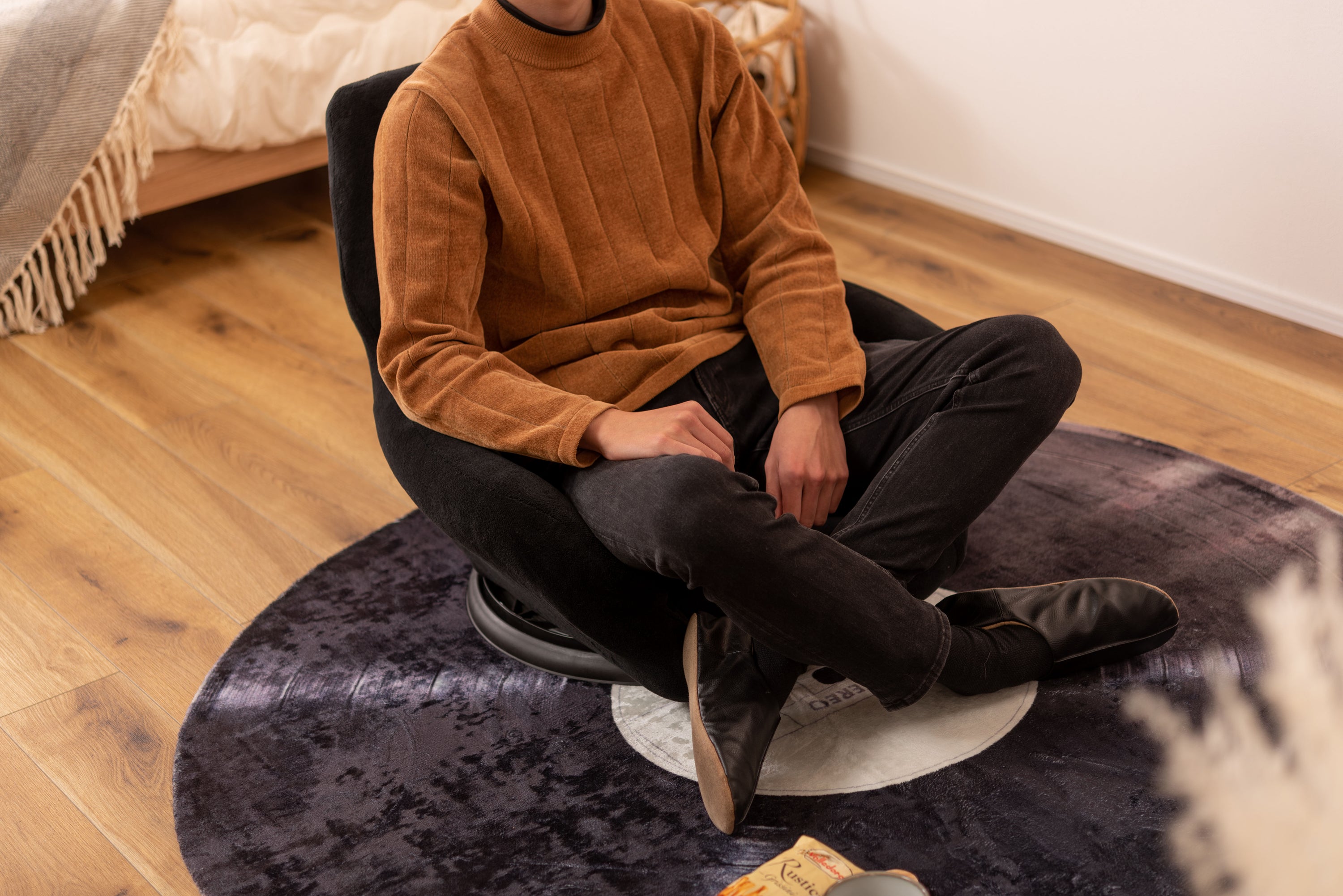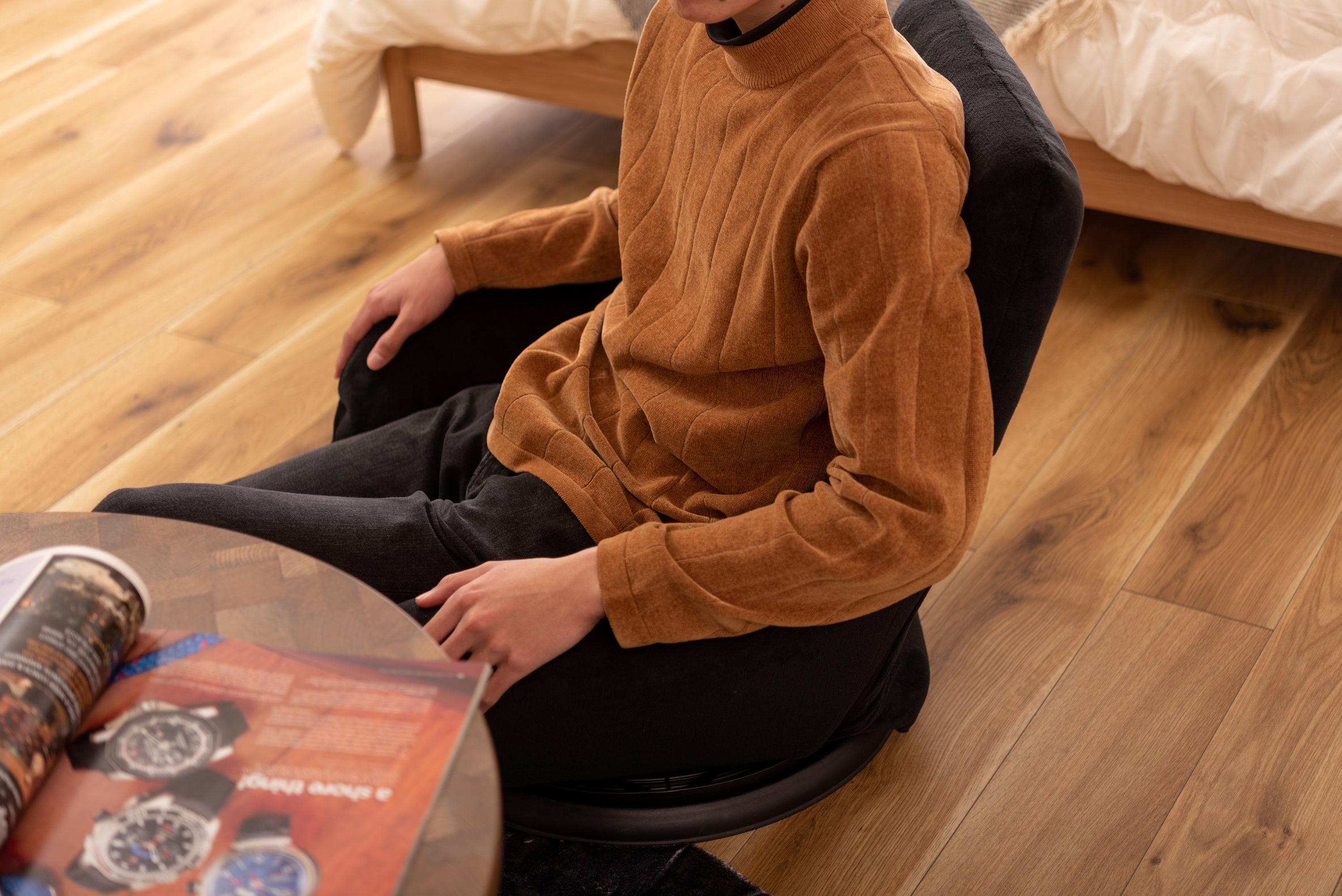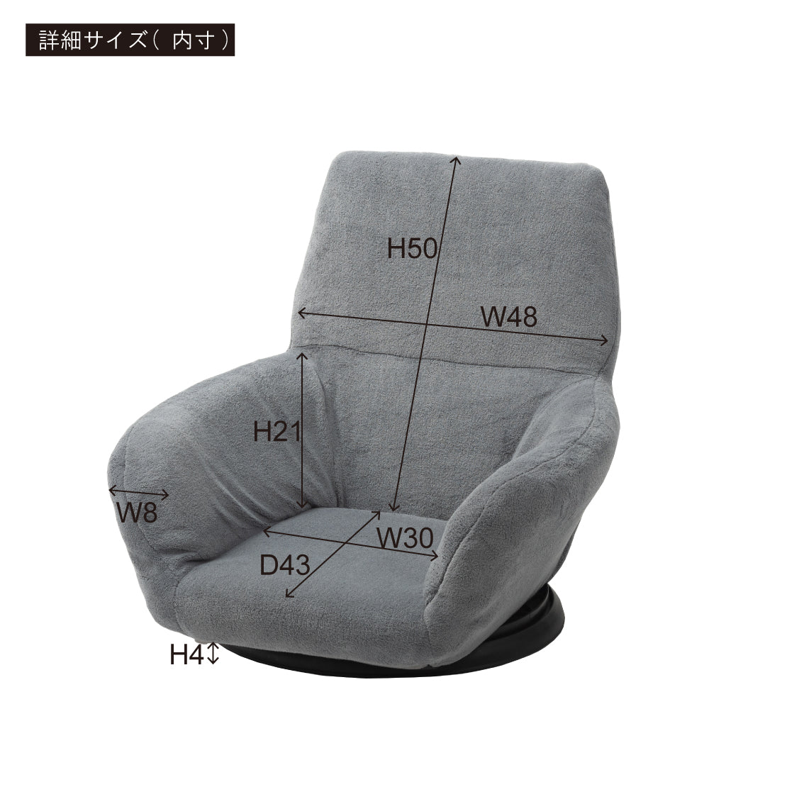 360度回転するので座ったまま向きを変えられ、狭いスペースでも動きやすさをサポートするフロアチェアです。柔らかい触感の生地が体を優しく包み込んでくれます。バケットタイプで包み込まれるような座り心地を体感でき、長時間座っても疲れにくい設計になっています。肘掛けが付いているので立ち座りがしやすく、安定感のある座り心地を実感できます。
