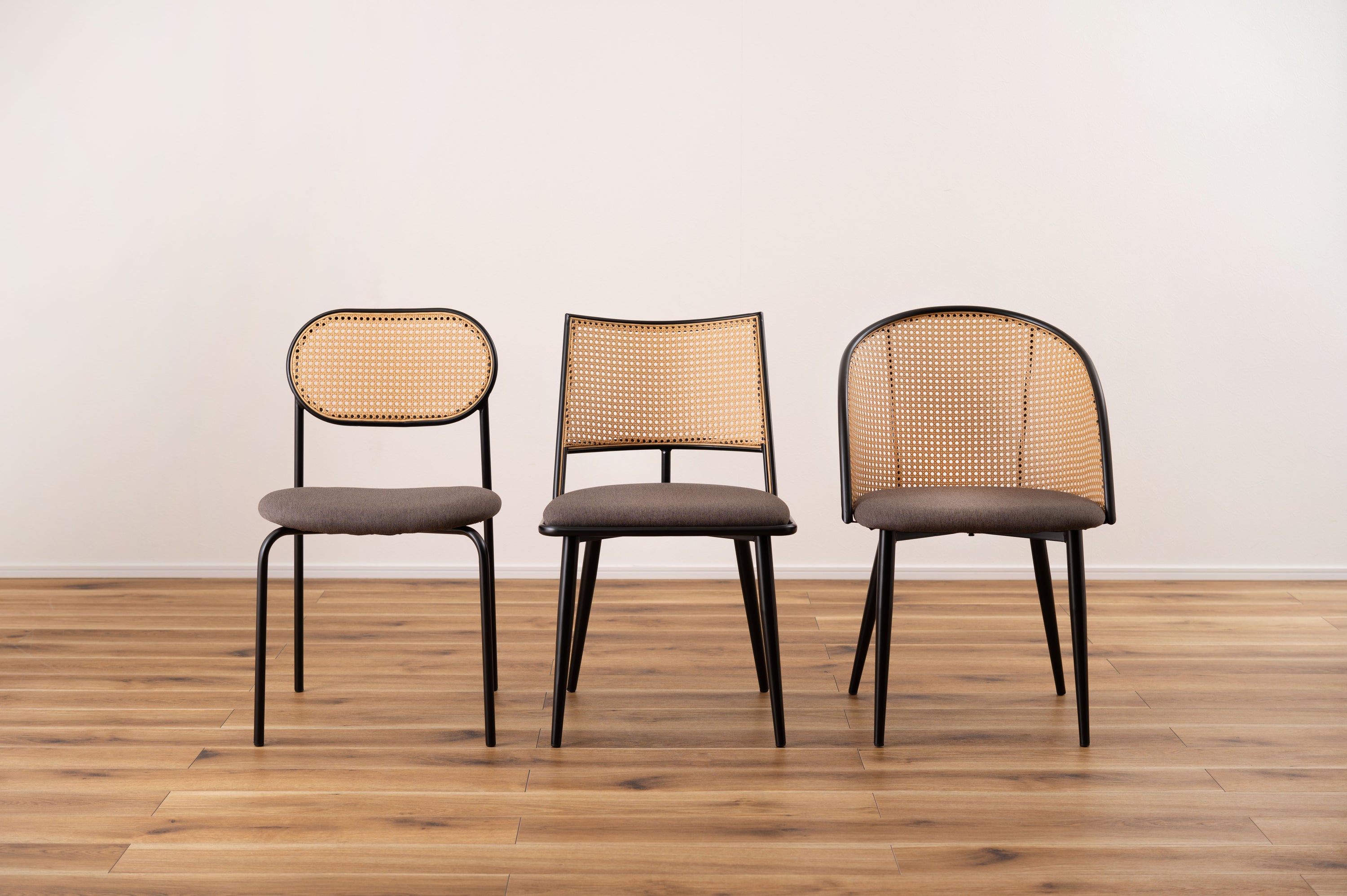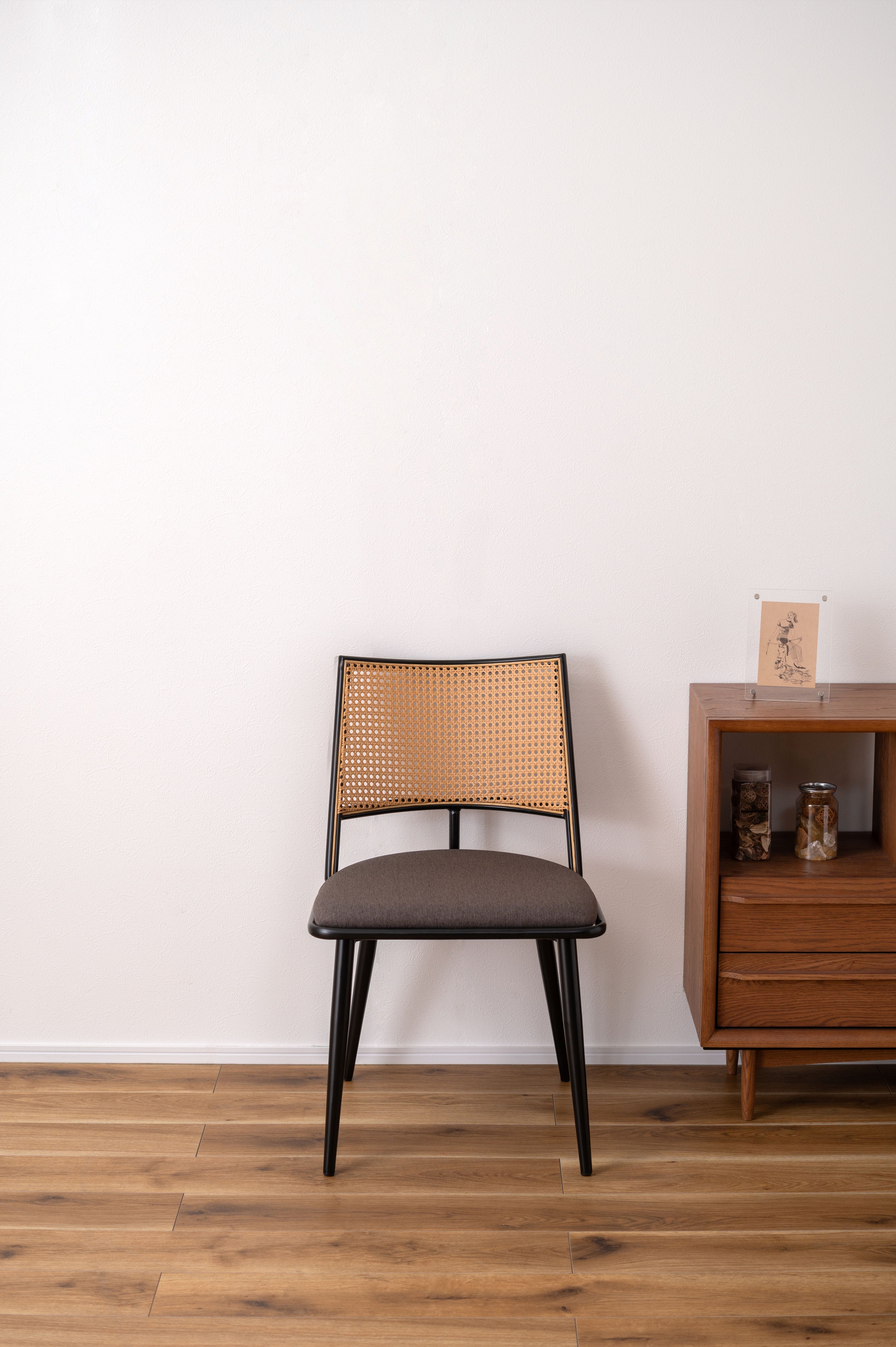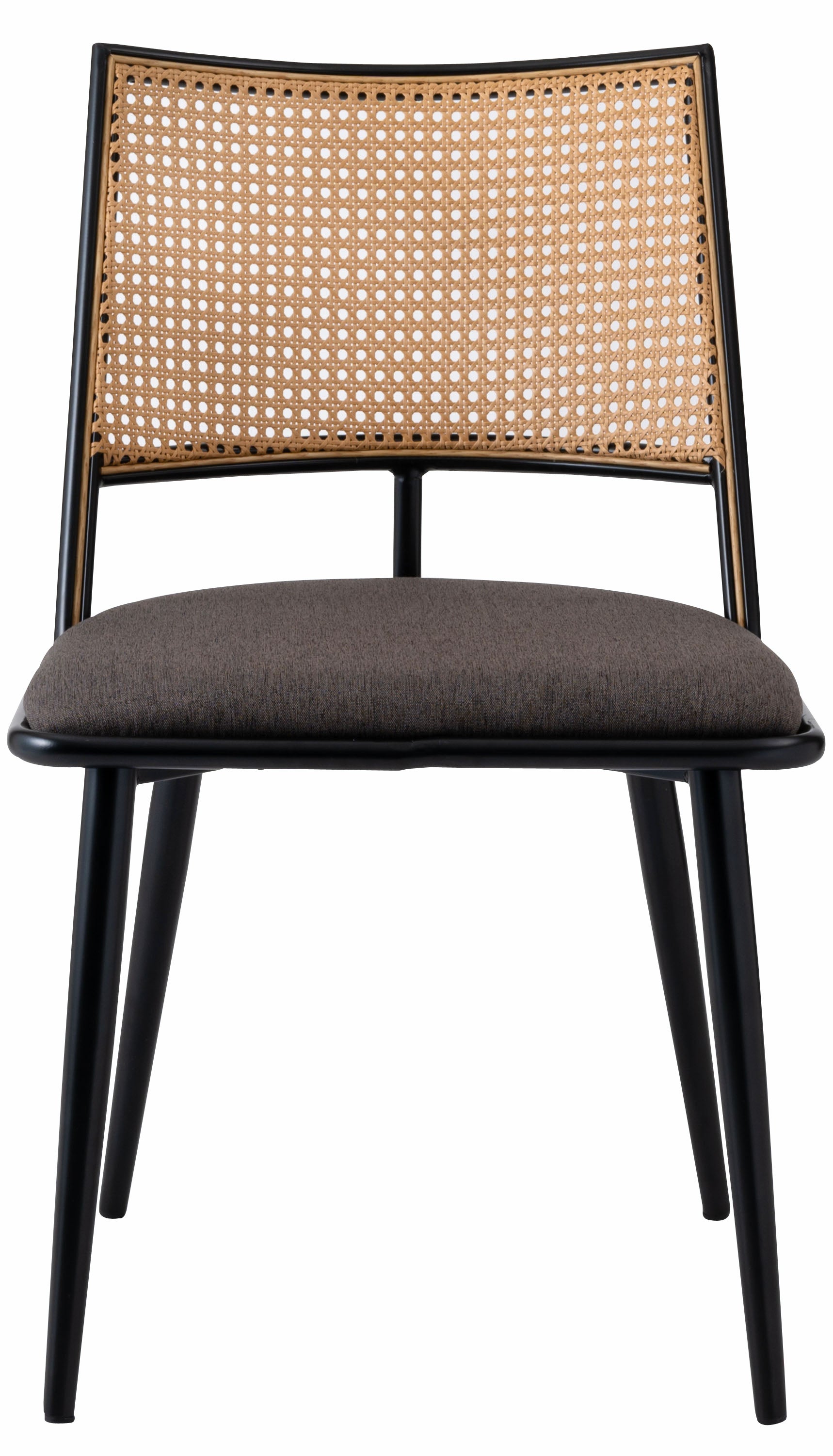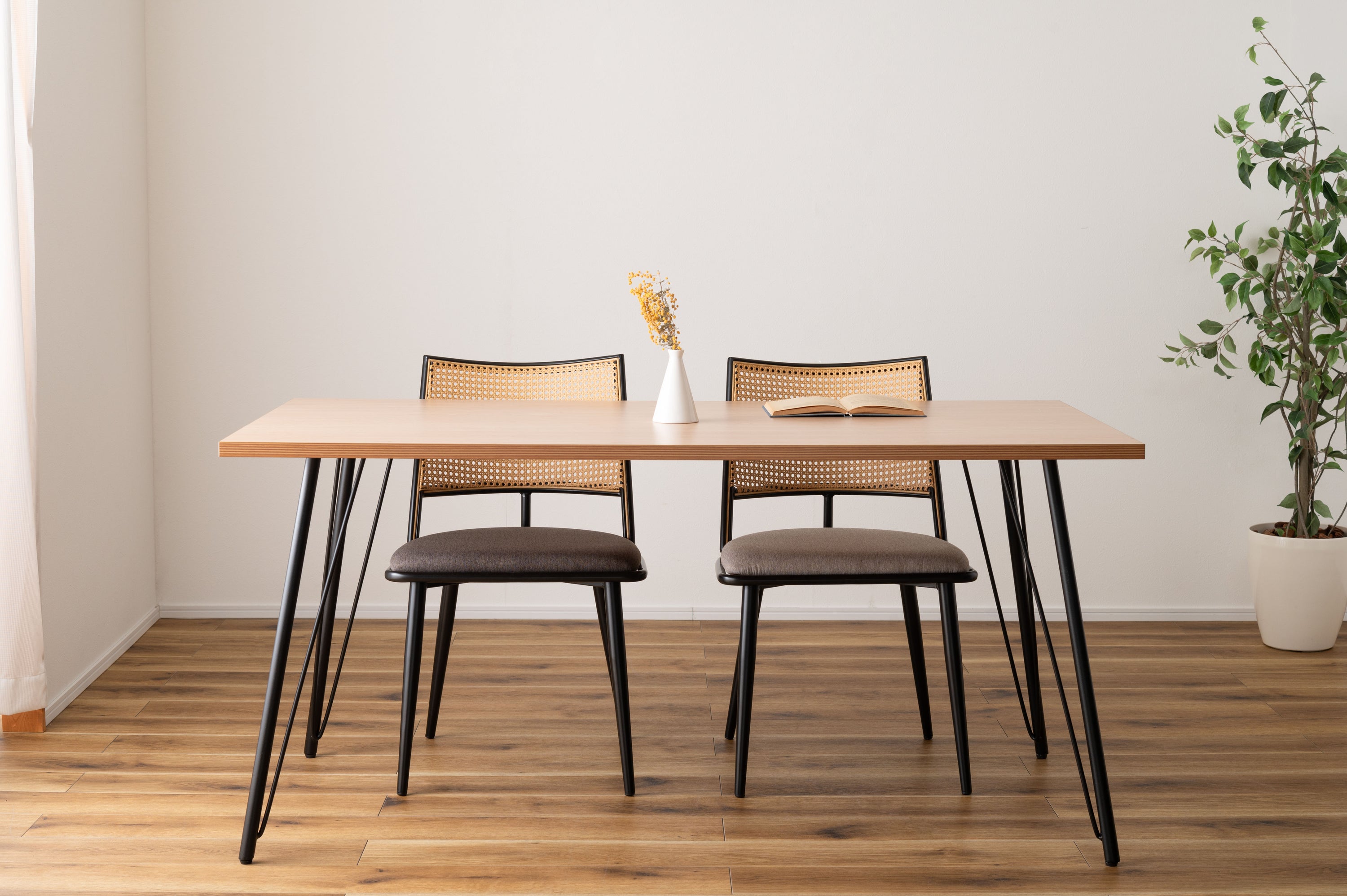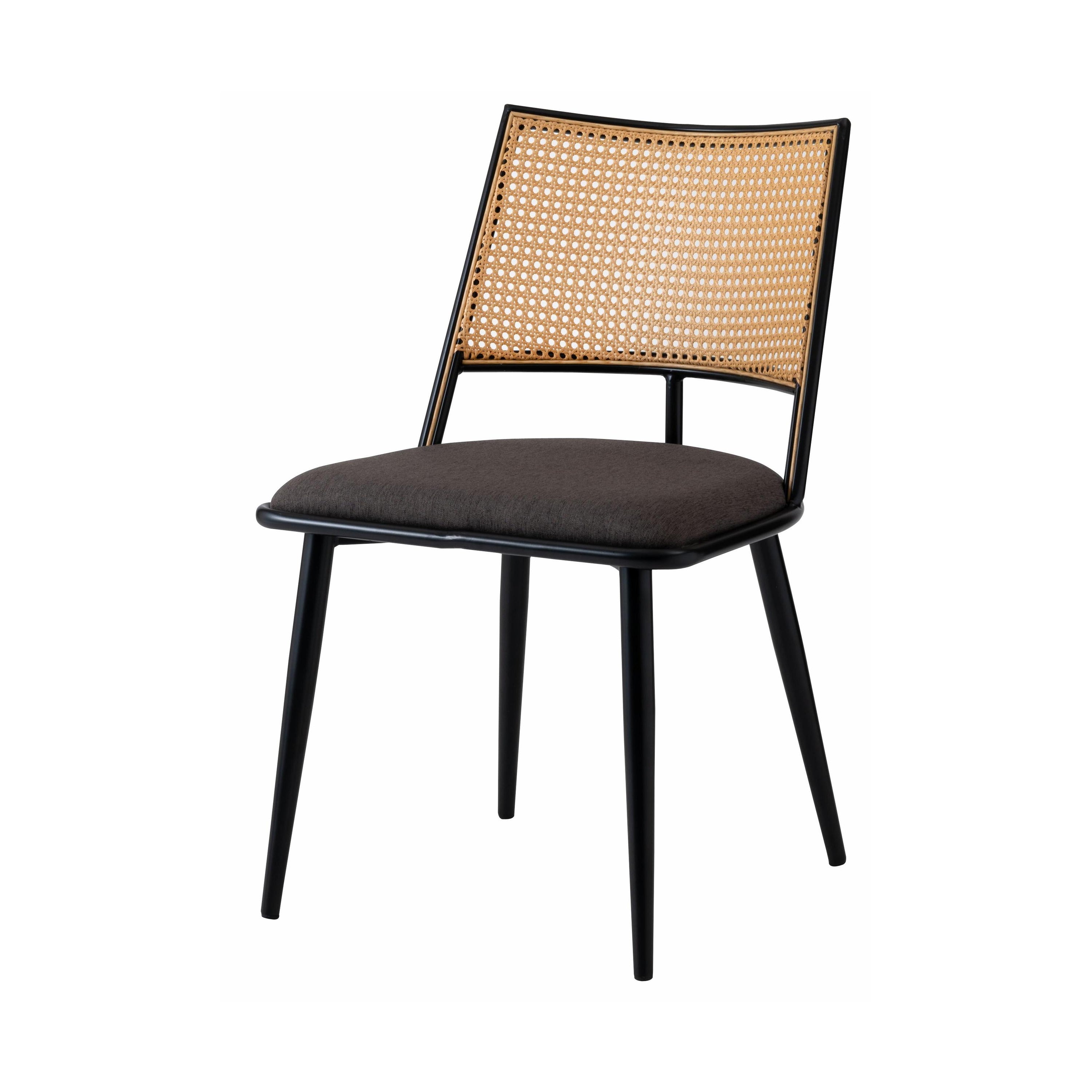 ラタン調×ファブリックのスタイリッシュなデザイン。 ポリエチレン素材のラタン調デザインを施した背面と、ファブリック素材の座面の組み合わせが新鮮なチェア。 あたたかみがありながらもスタイリッシュなスチールの細脚でぐっと引き締まった印象も与えてくれます。