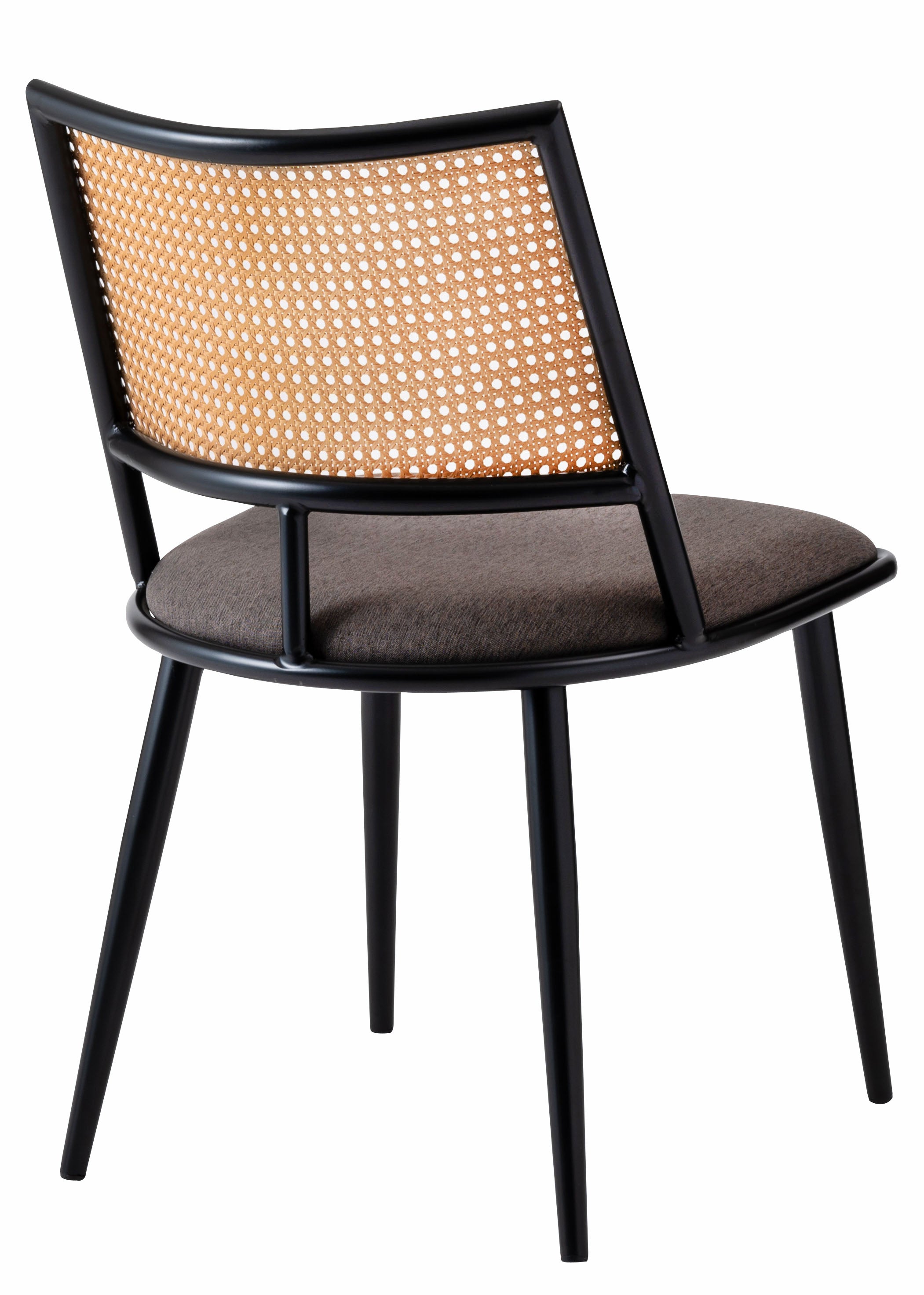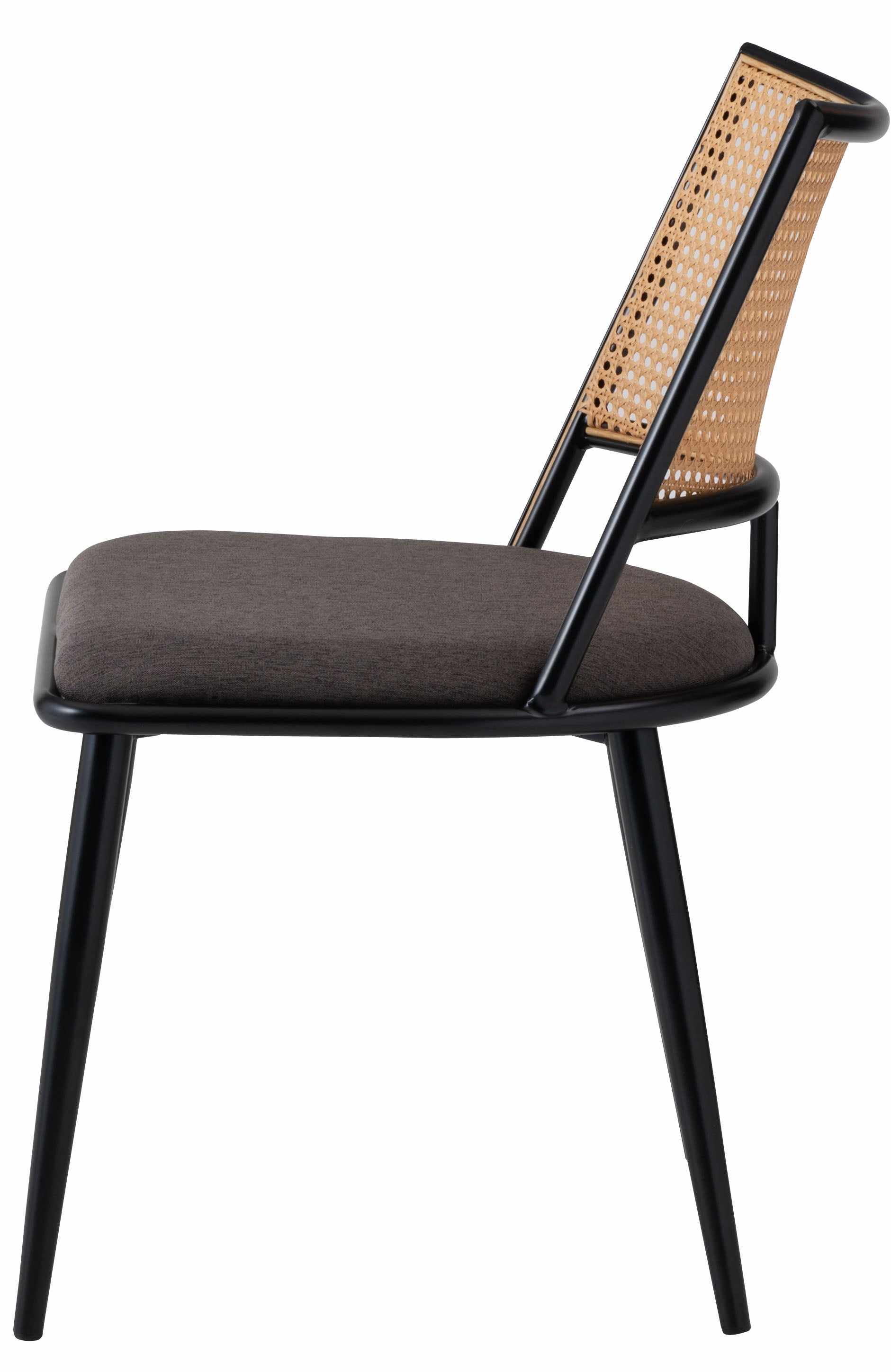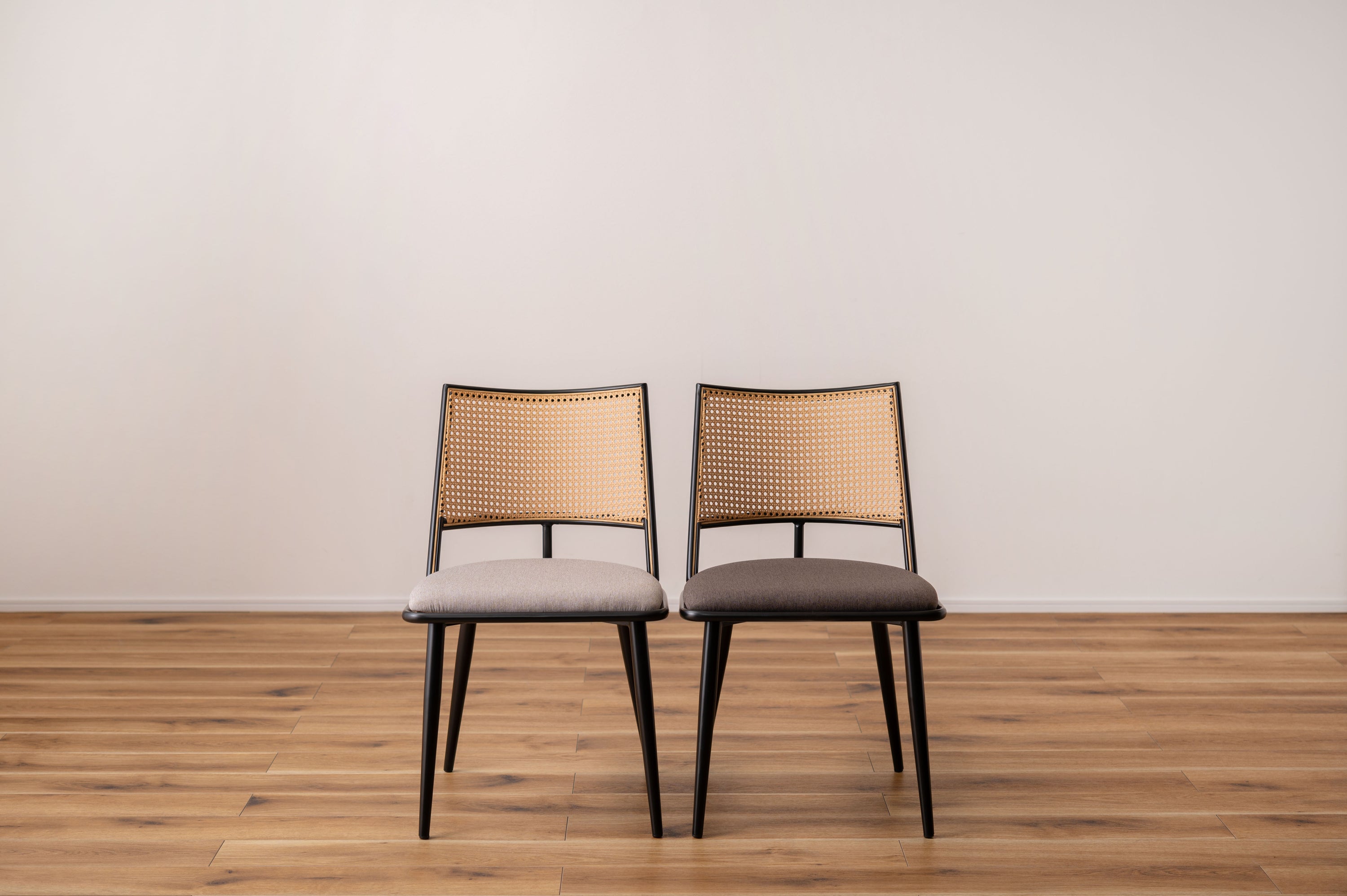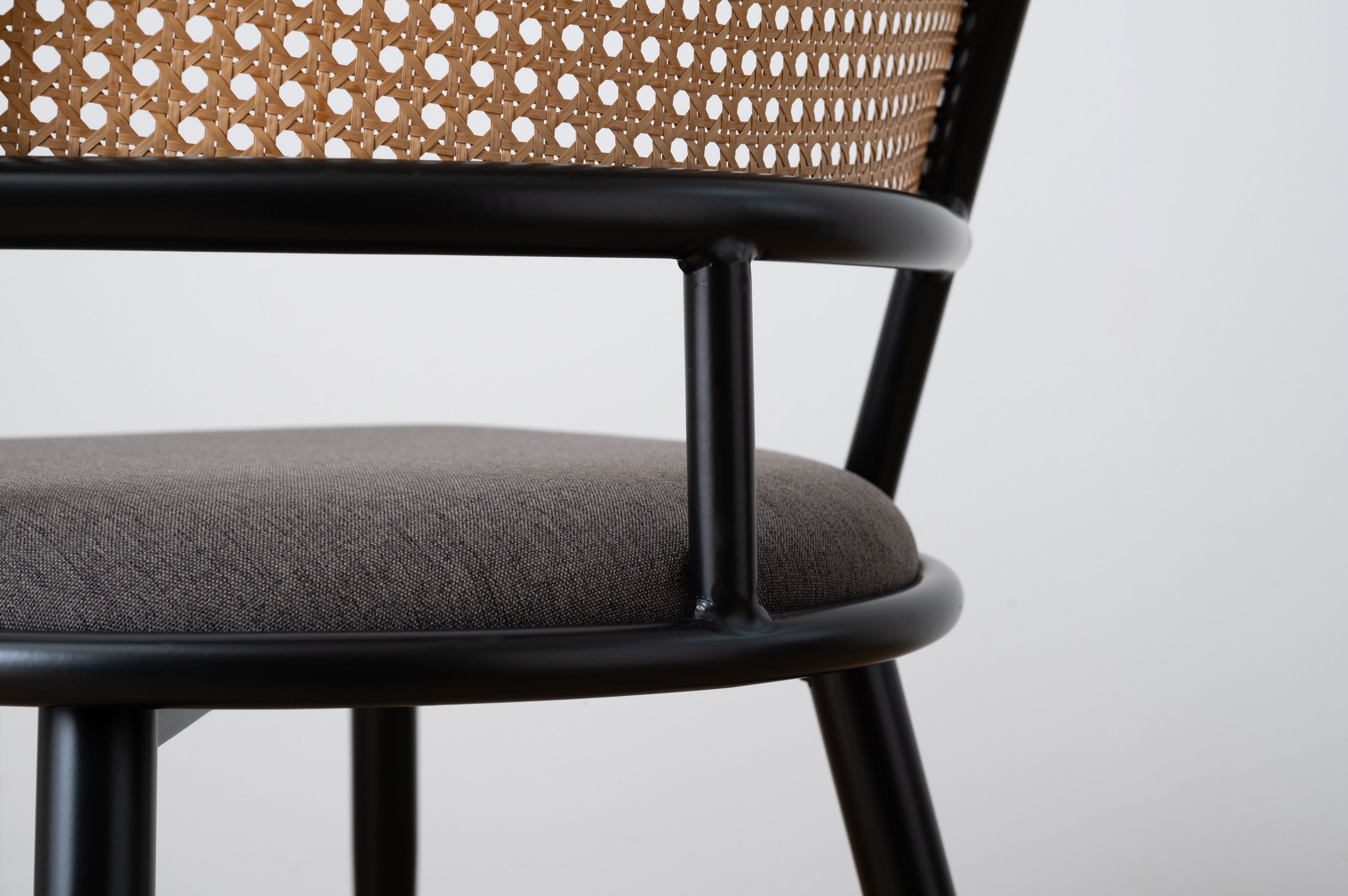 ラタン調×ファブリックのスタイリッシュなデザイン。 ポリエチレン素材のラタン調デザインを施した背面と、ファブリック素材の座面の組み合わせが新鮮なチェア。 あたたかみがありながらもスタイリッシュなスチールの細脚でぐっと引き締まった印象も与えてくれます。