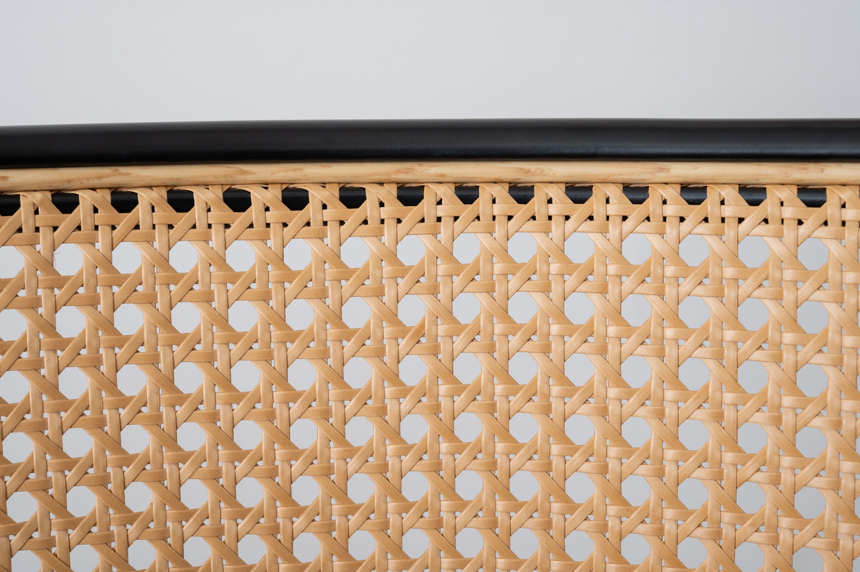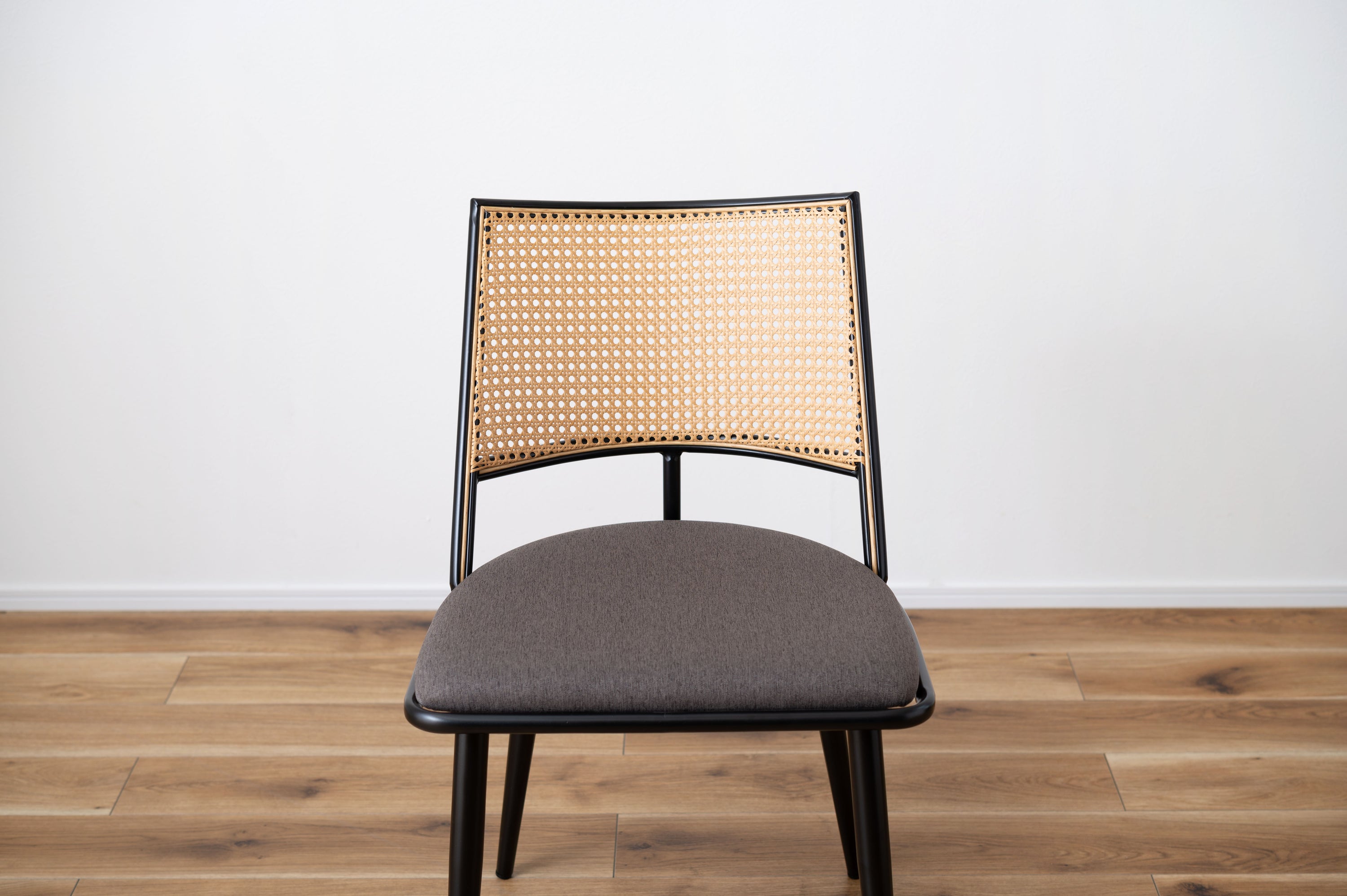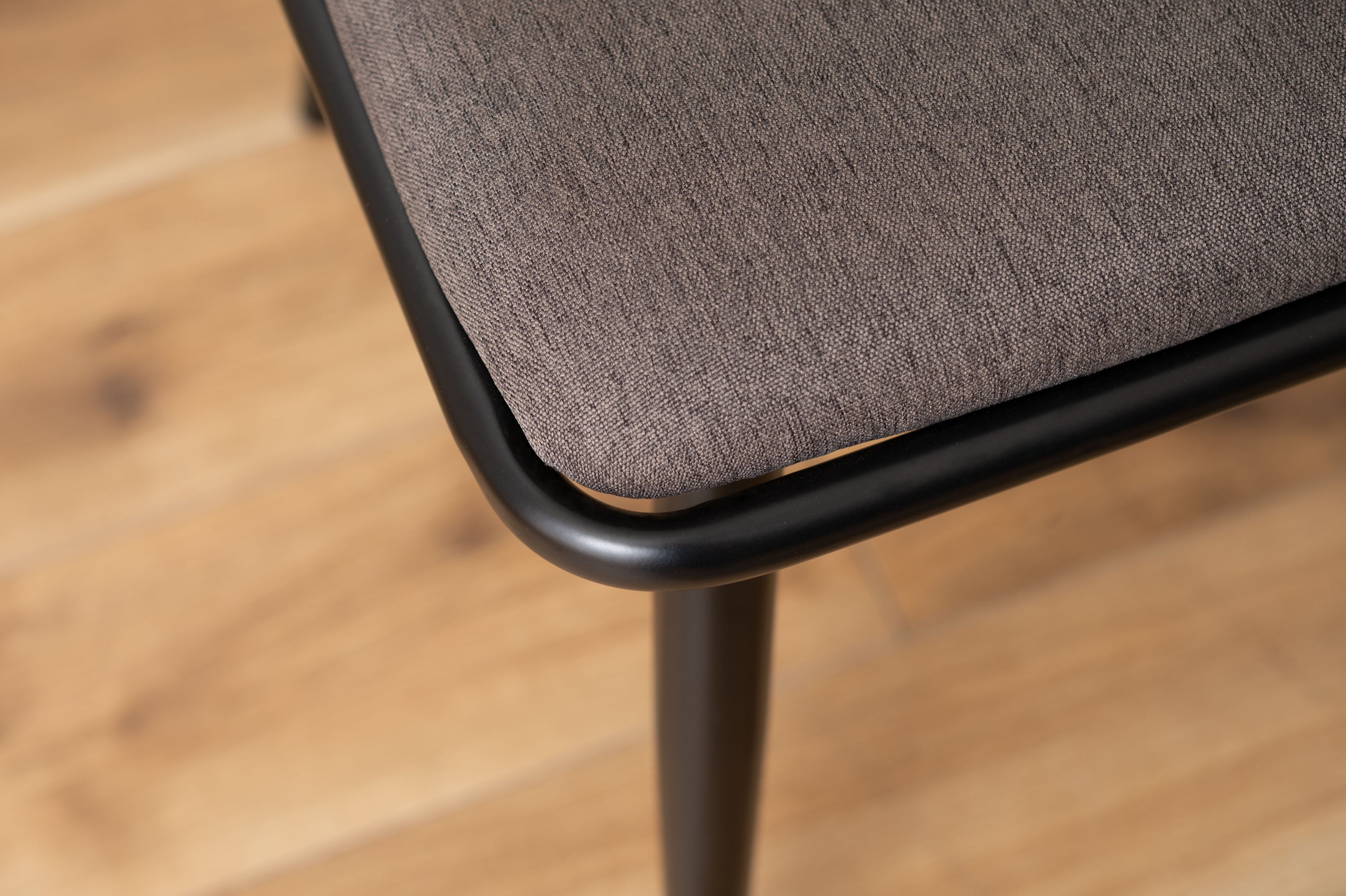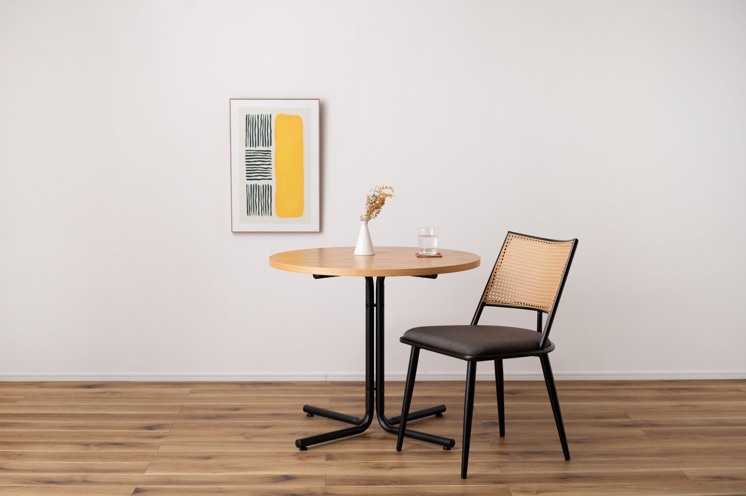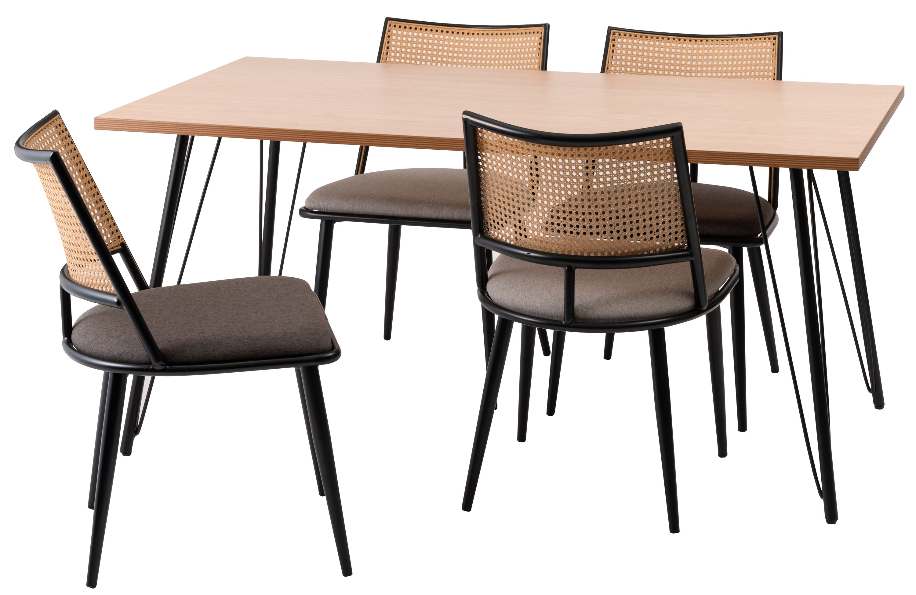 ラタン調×ファブリックのスタイリッシュなデザイン。 ポリエチレン素材のラタン調デザインを施した背面と、ファブリック素材の座面の組み合わせが新鮮なチェア。 あたたかみがありながらもスタイリッシュなスチールの細脚でぐっと引き締まった印象も与えてくれます。