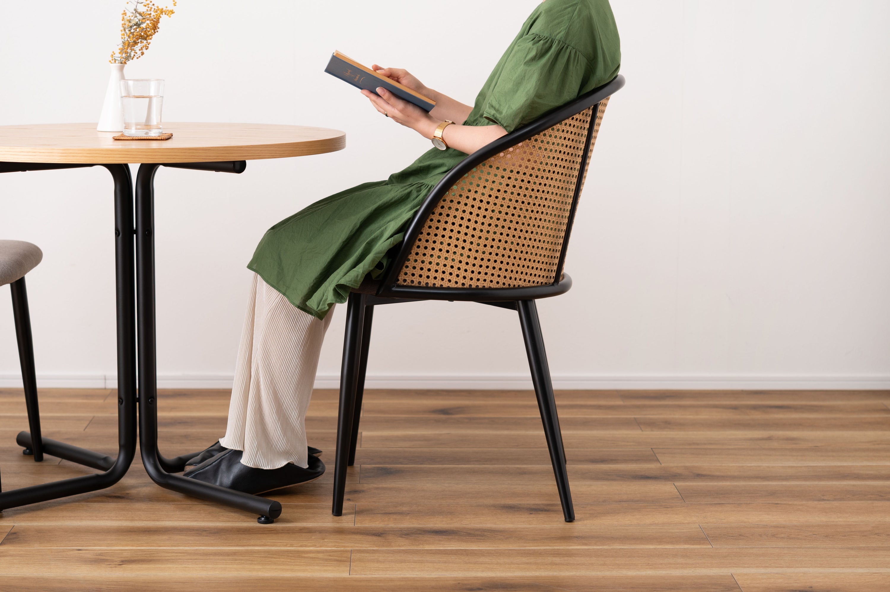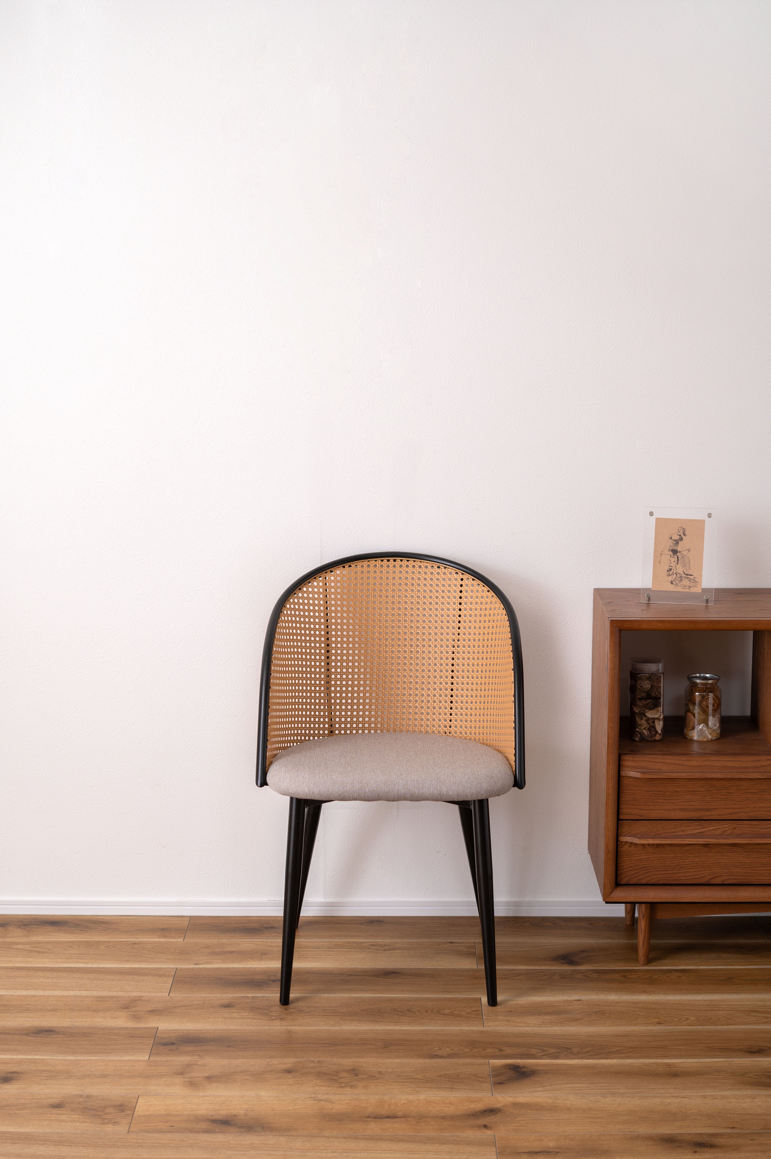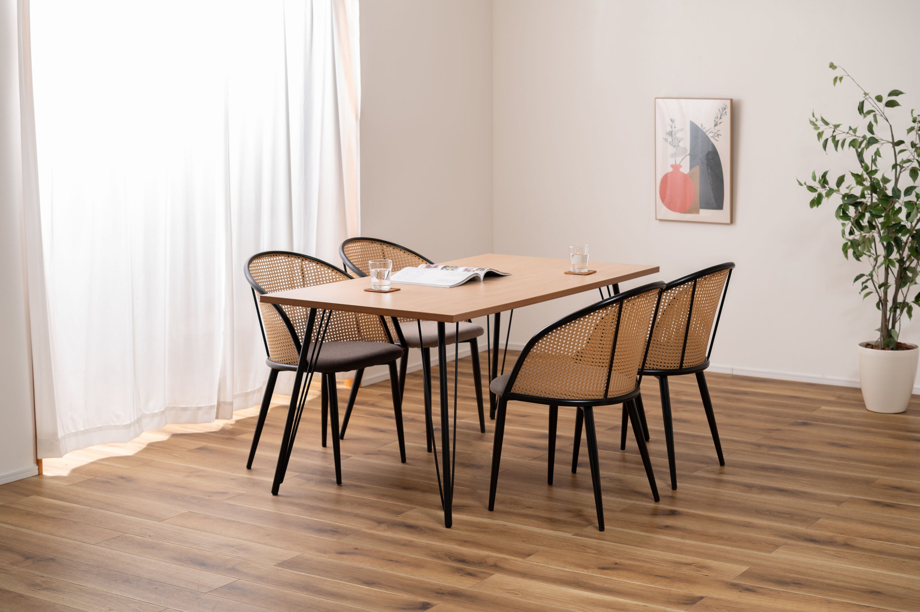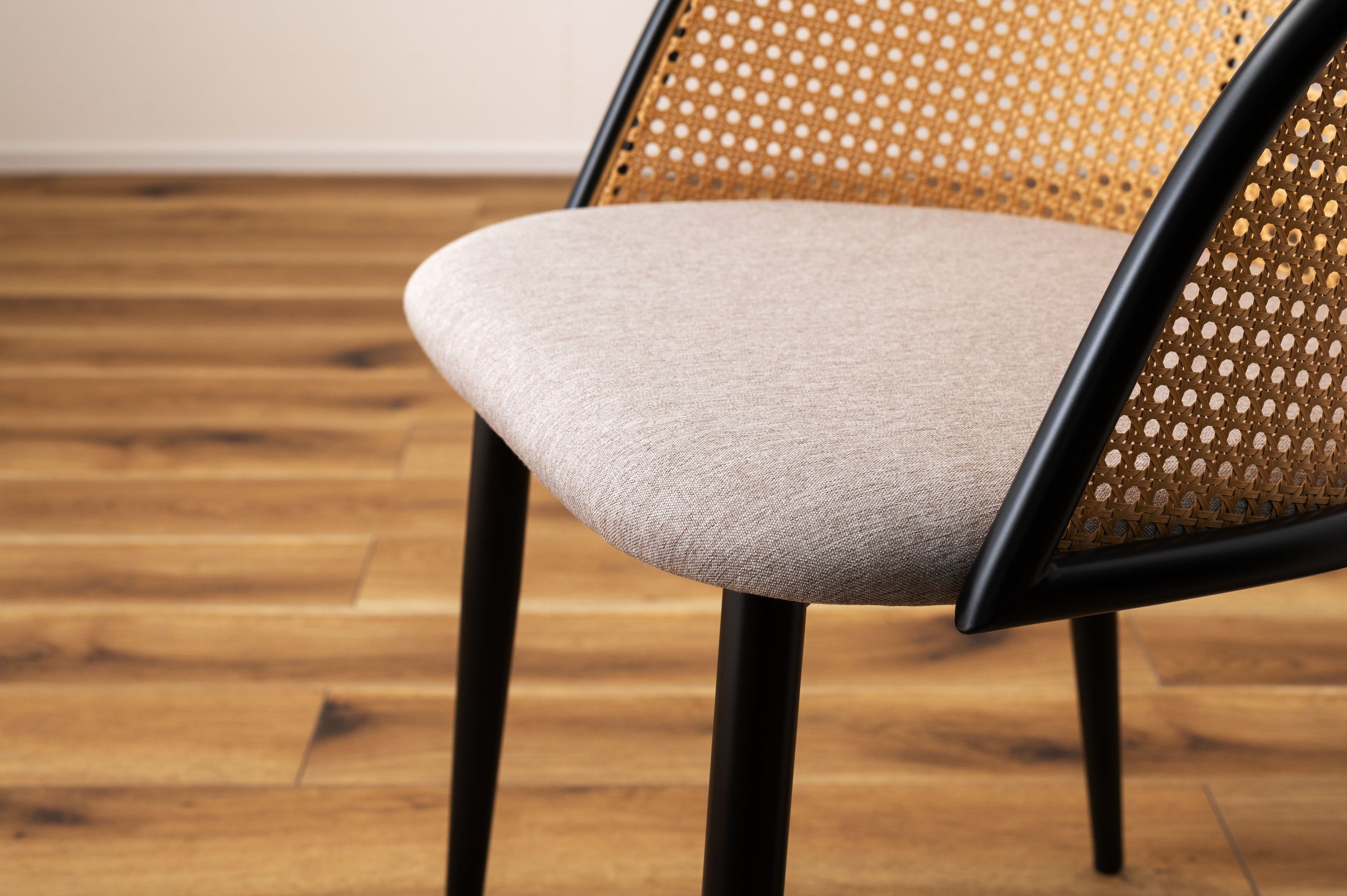 ラタン調×ファブリックのスタイリッシュなデザイン。 ポリエチレン素材のラタン調デザインを施した背面と、ファブリック素材の座面の組み合わせが新鮮なチェア。 あたたかみがありながらもスタイリッシュなスチールの細脚でぐっと引き締まった印象も与えてくれます。