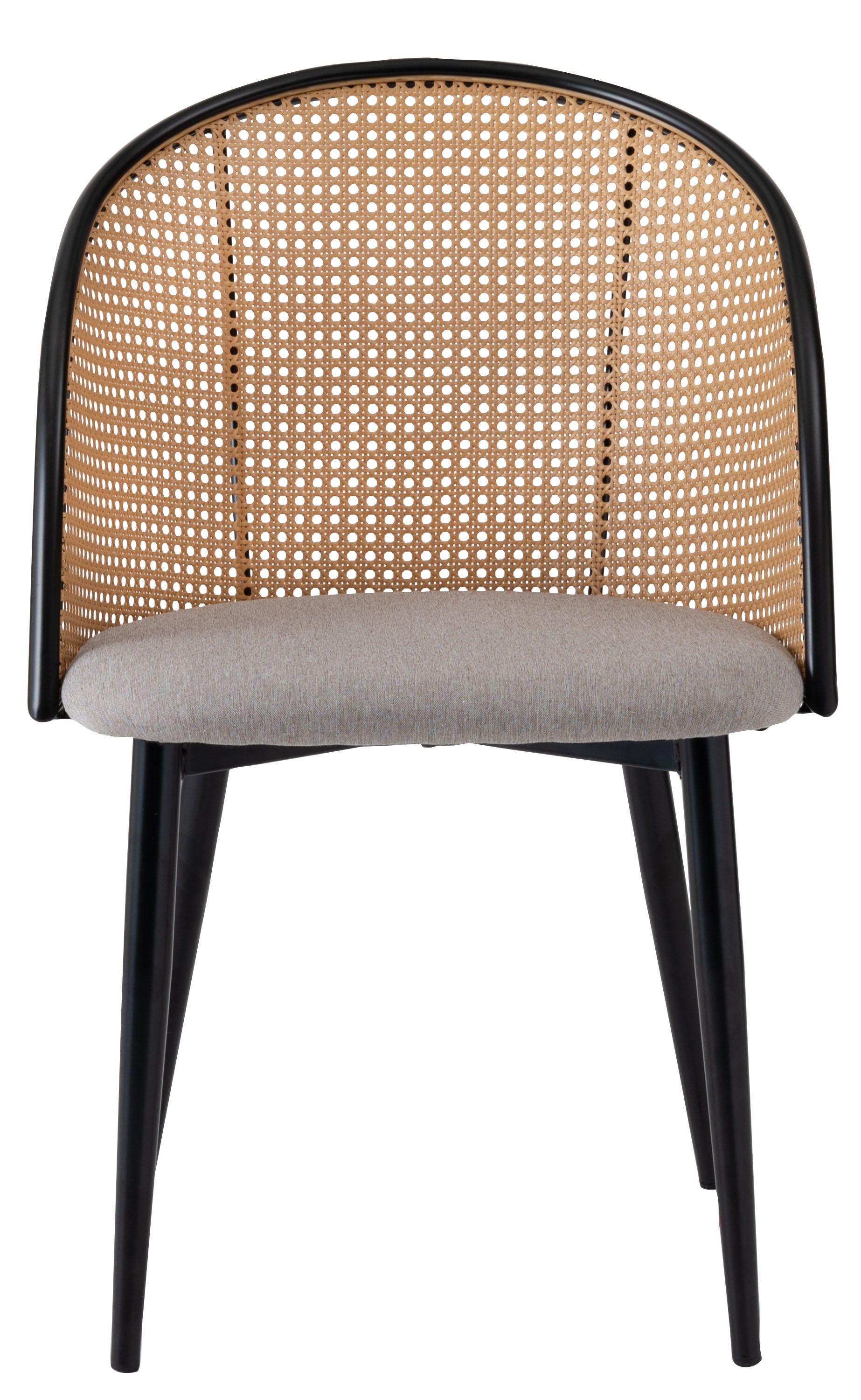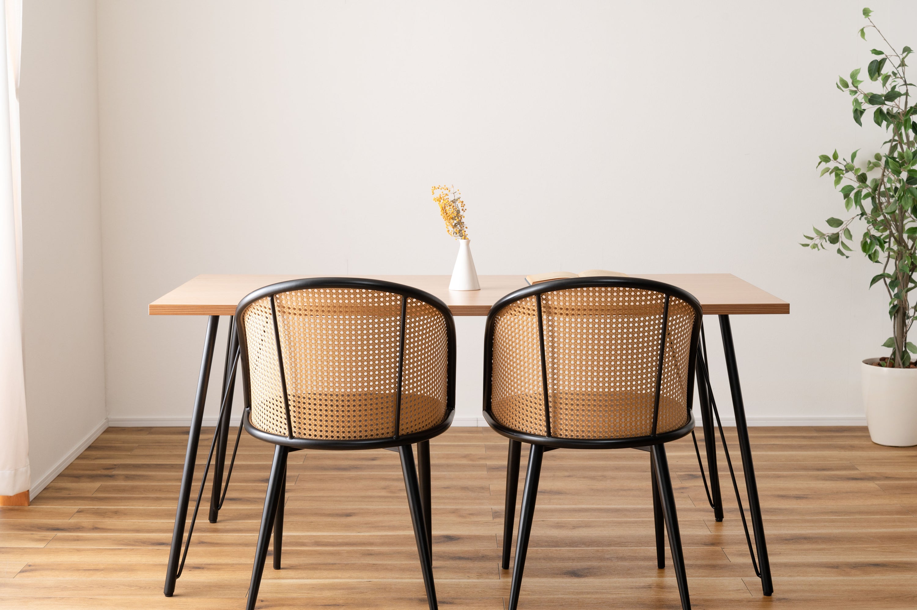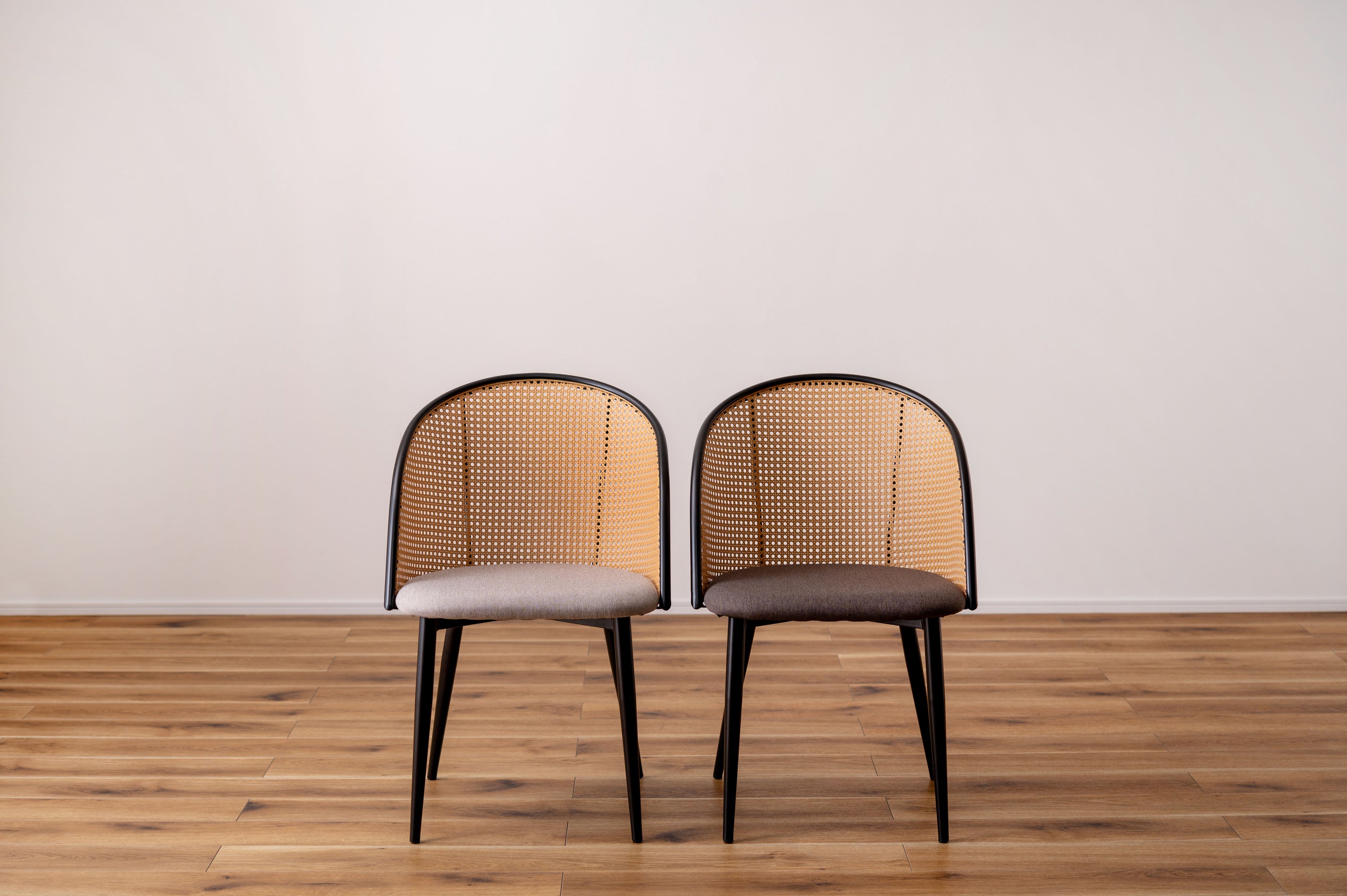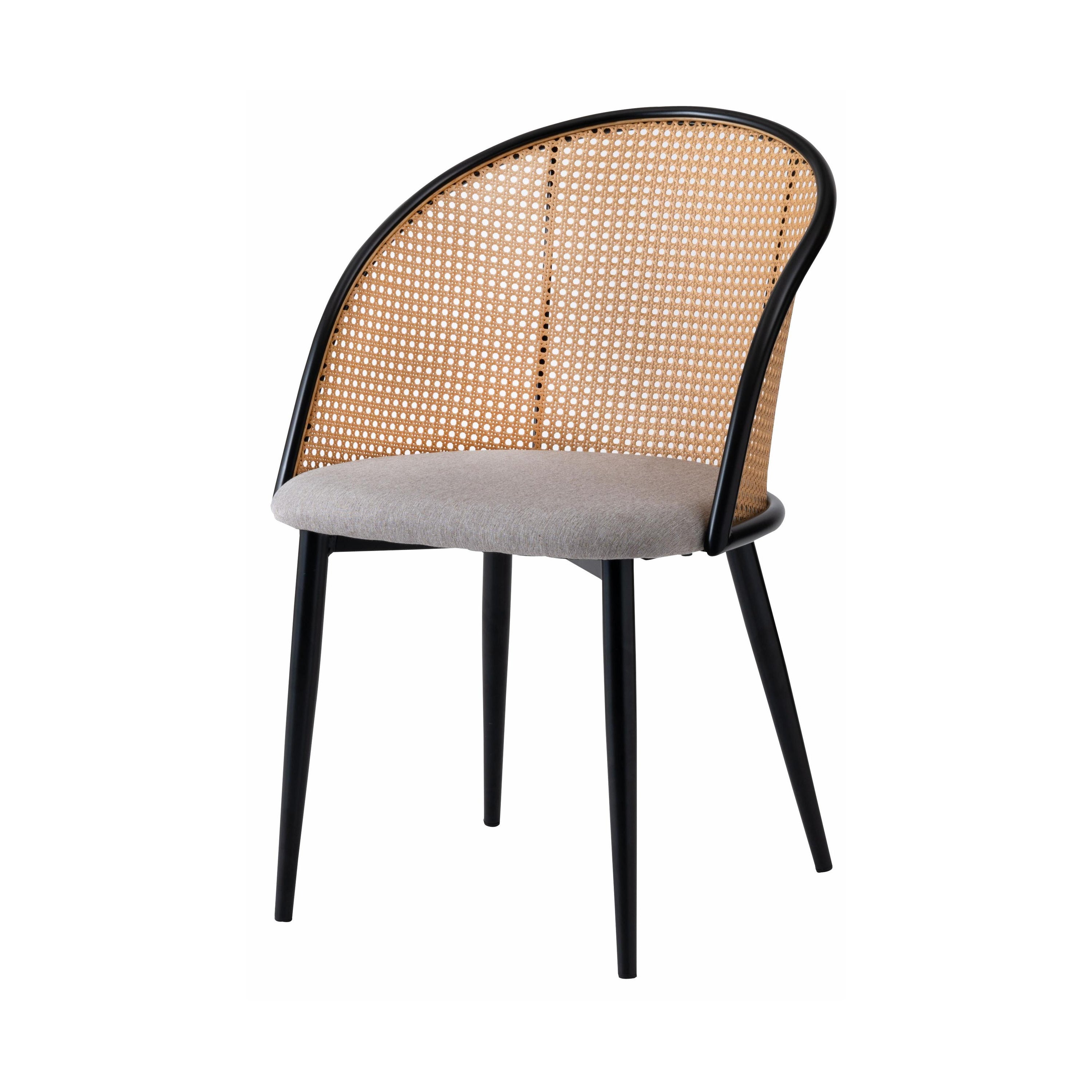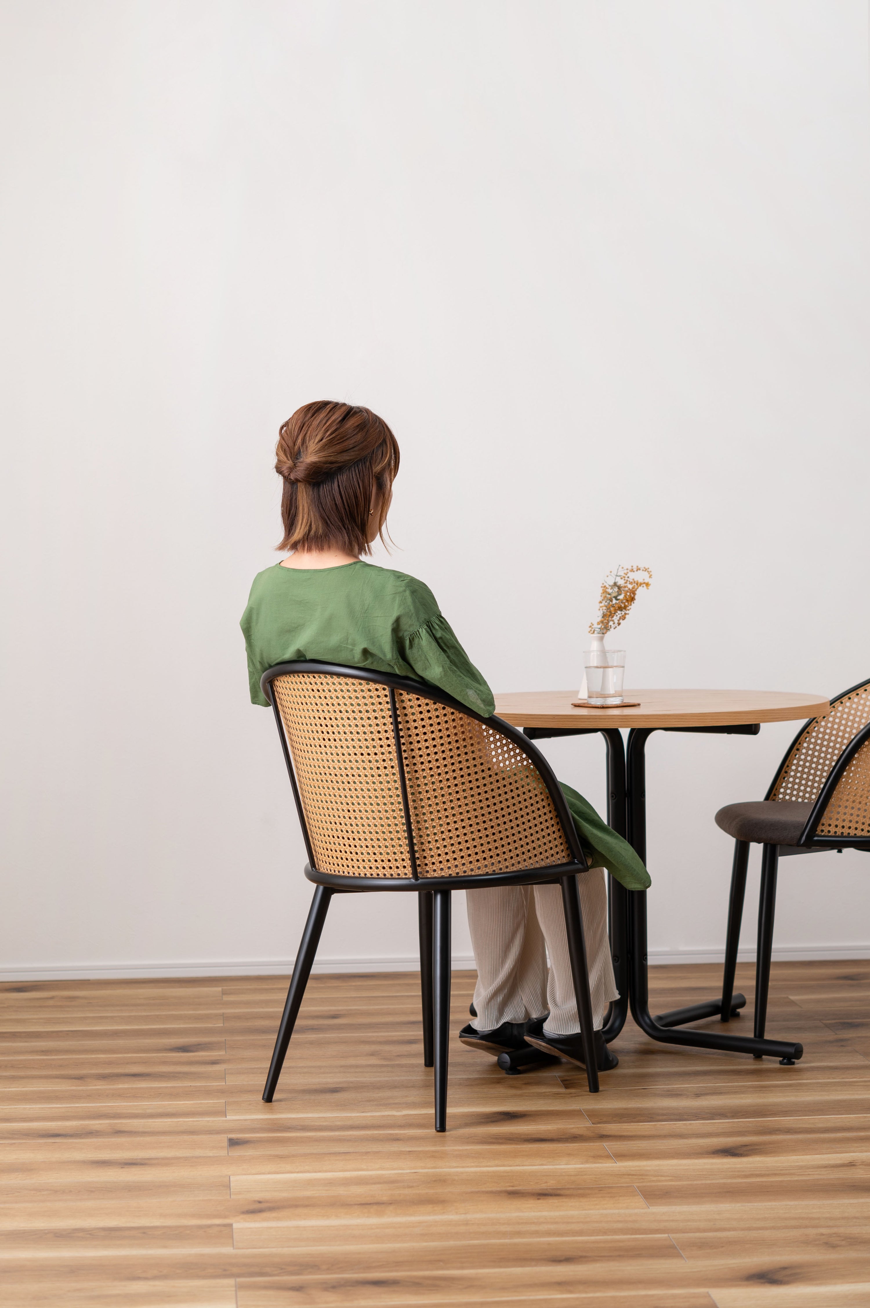 ラタン調×ファブリックのスタイリッシュなデザイン。 ポリエチレン素材のラタン調デザインを施した背面と、ファブリック素材の座面の組み合わせが新鮮なチェア。 あたたかみがありながらもスタイリッシュなスチールの細脚でぐっと引き締まった印象も与えてくれます。