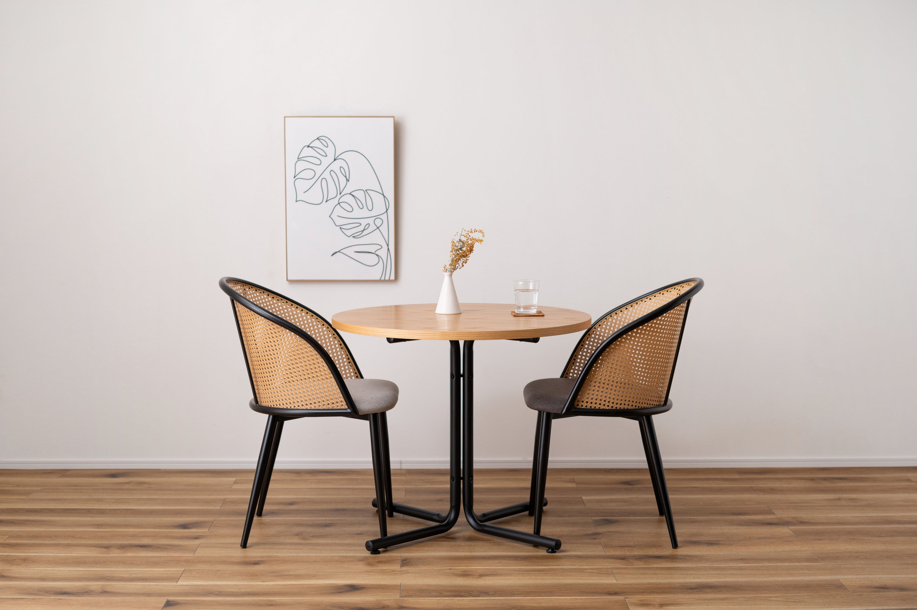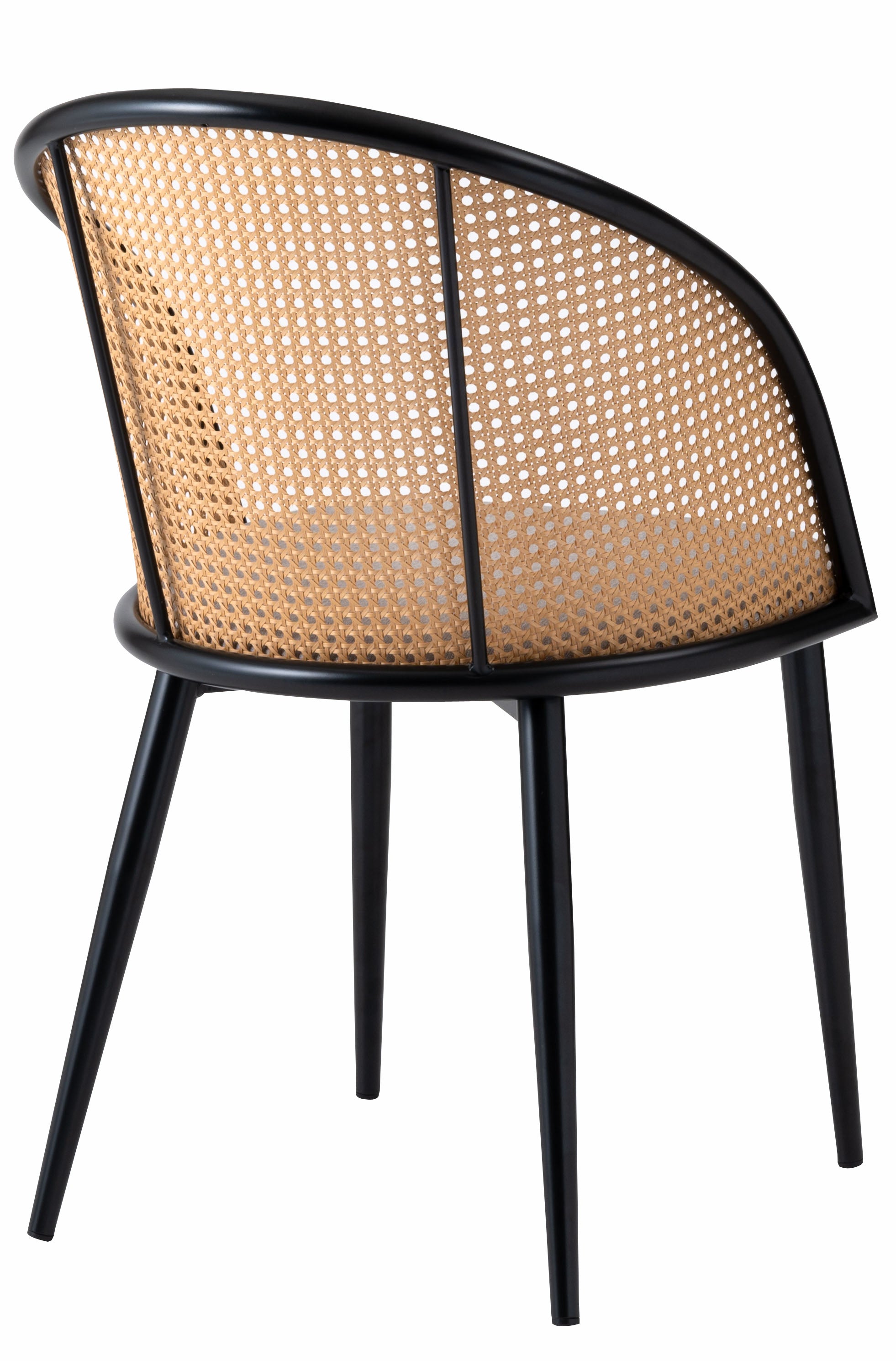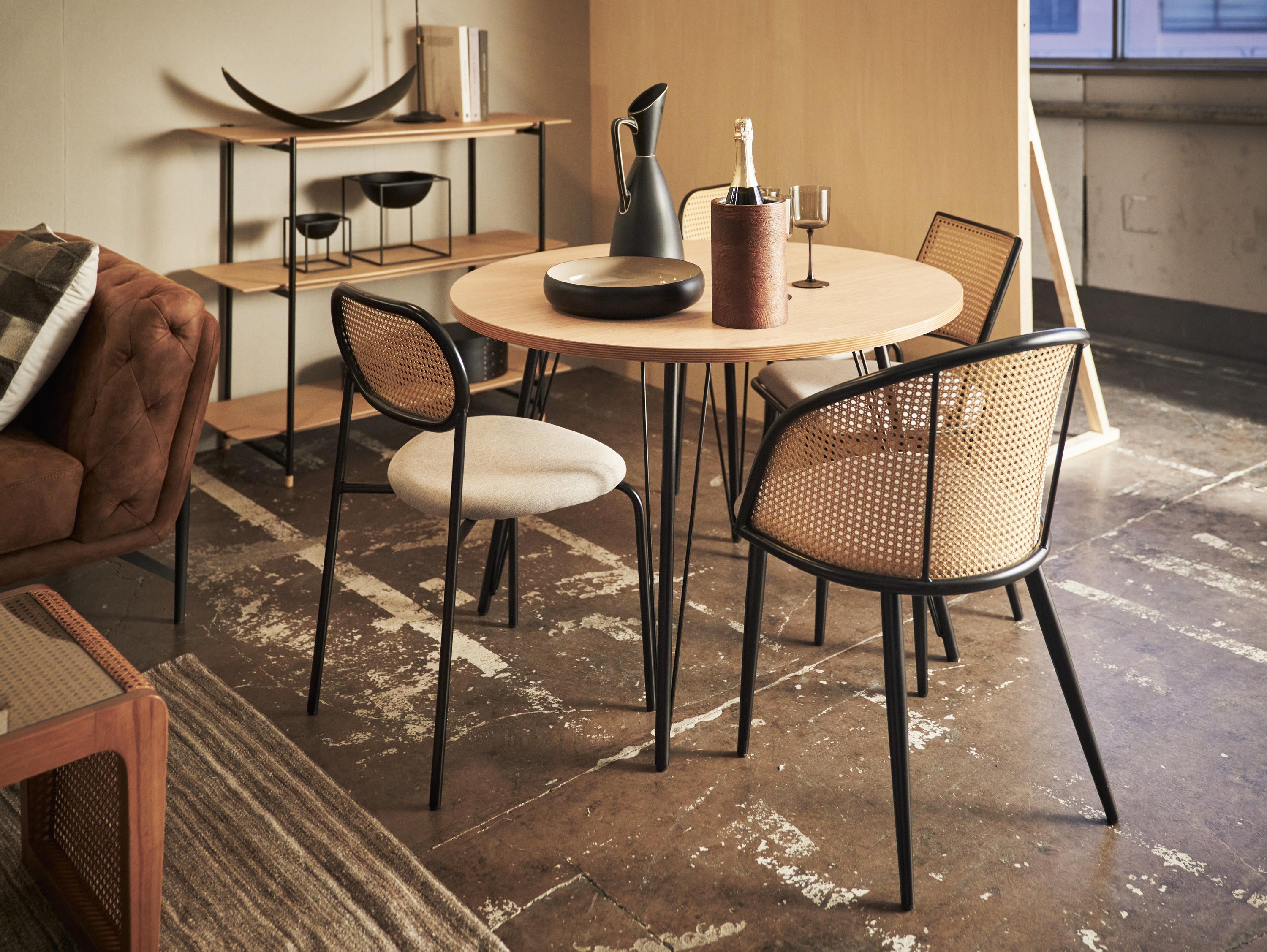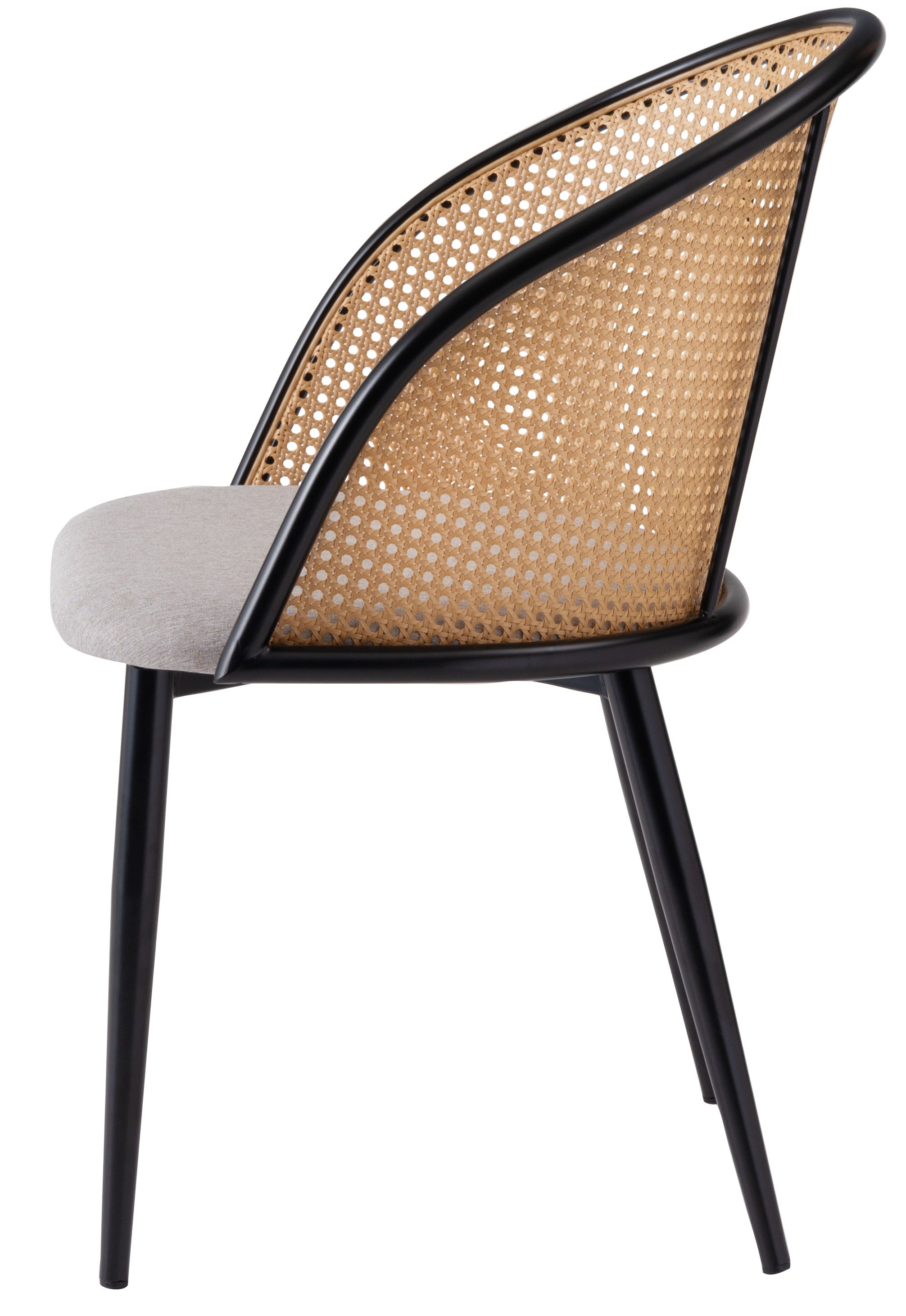 ラタン調×ファブリックのスタイリッシュなデザイン。 ポリエチレン素材のラタン調デザインを施した背面と、ファブリック素材の座面の組み合わせが新鮮なチェア。 あたたかみがありながらもスタイリッシュなスチールの細脚でぐっと引き締まった印象も与えてくれます。