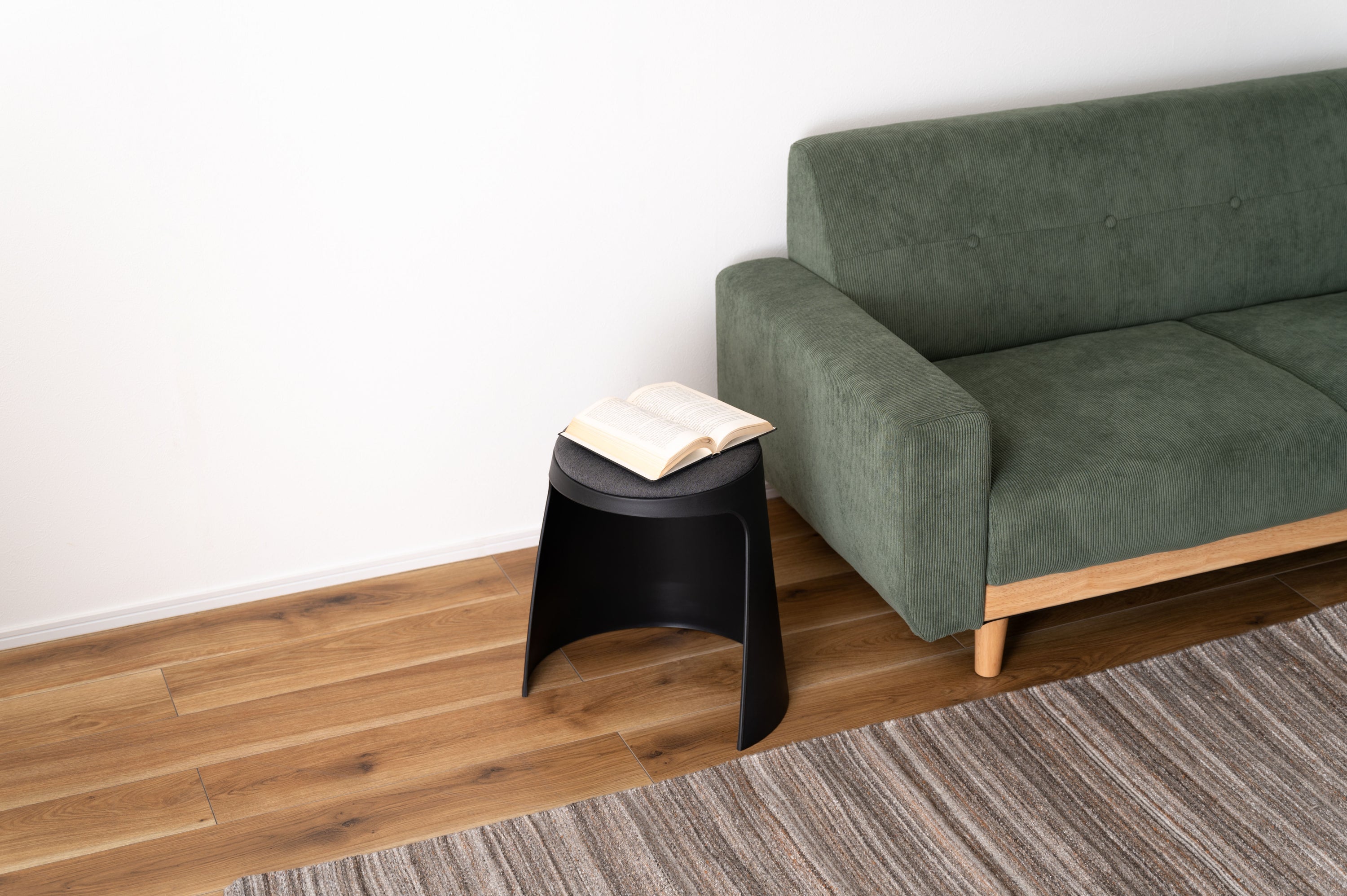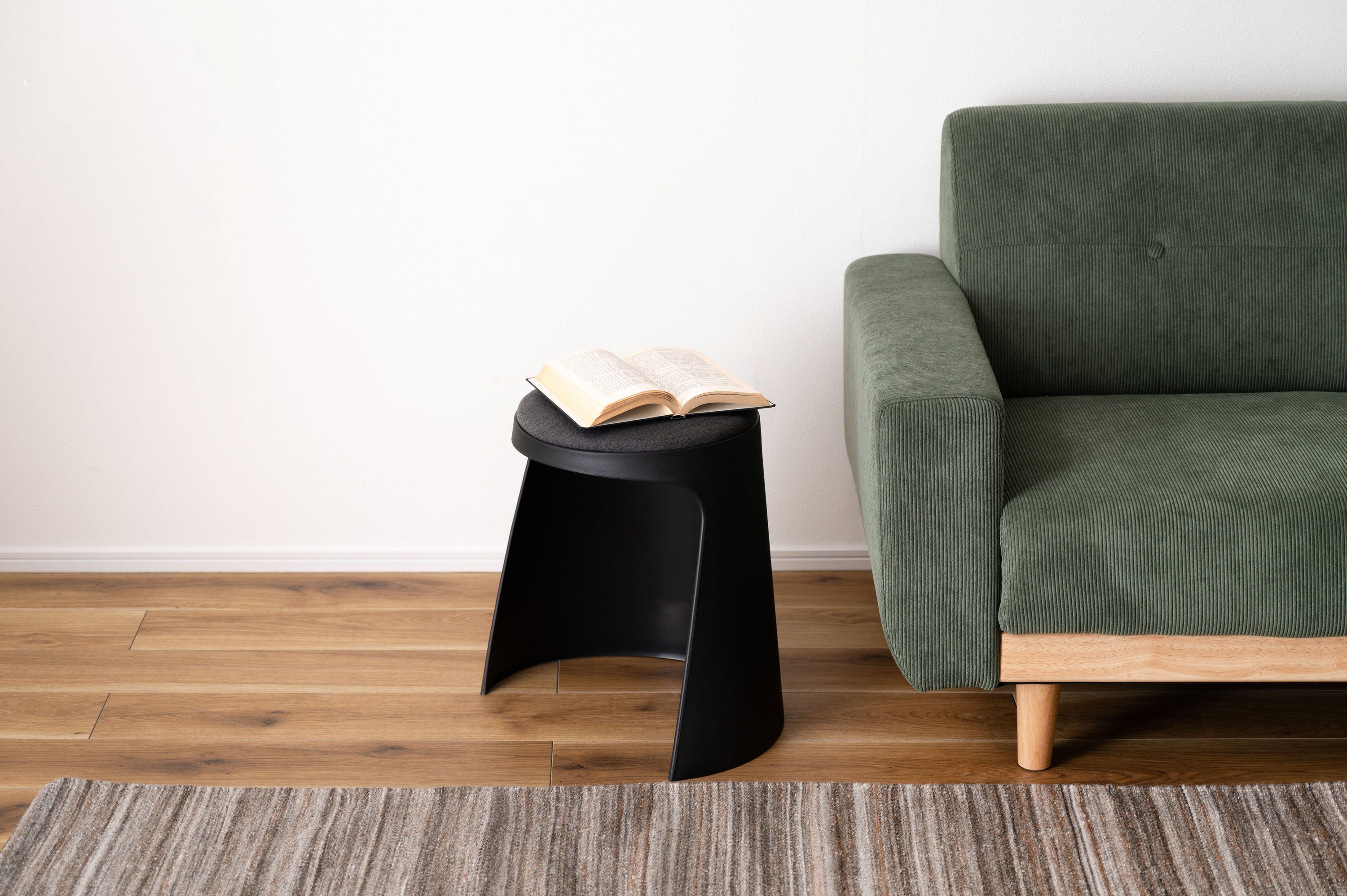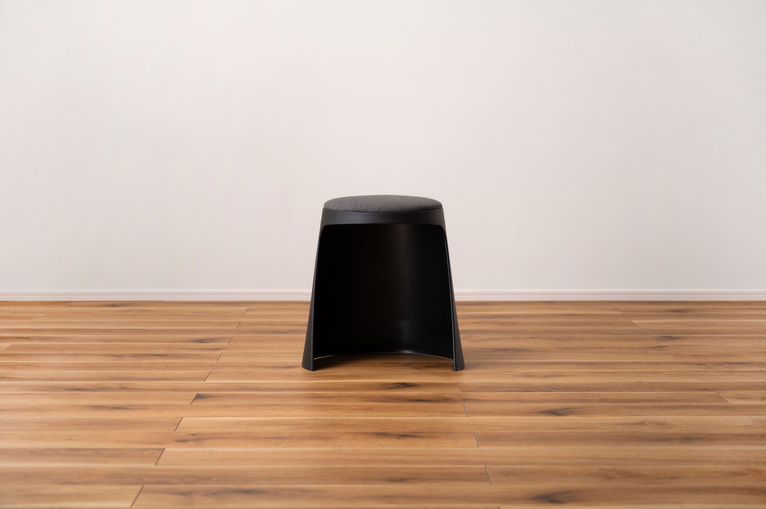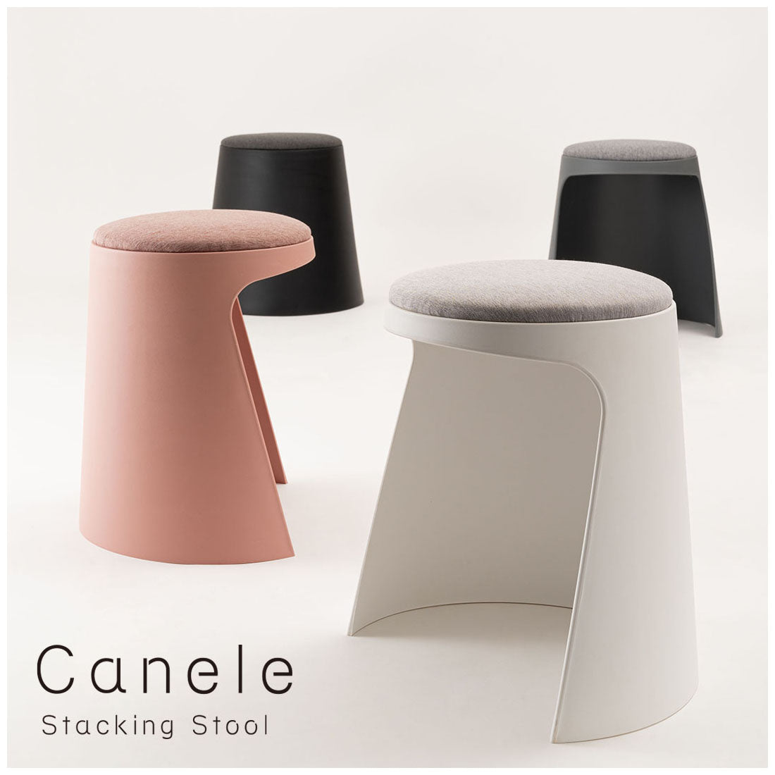 デザイン性と機能性、両方叶えるスタッキングスツール「カヌレ」 座面下に大きく空いた空間は、個性的なフォルムのデザイン性を高めるだけでなく、足を入れられる事で座りやすくなる機能性も兼ね備えています。 座面にはファブリックを使用し、その座りやすさをより追求しました。