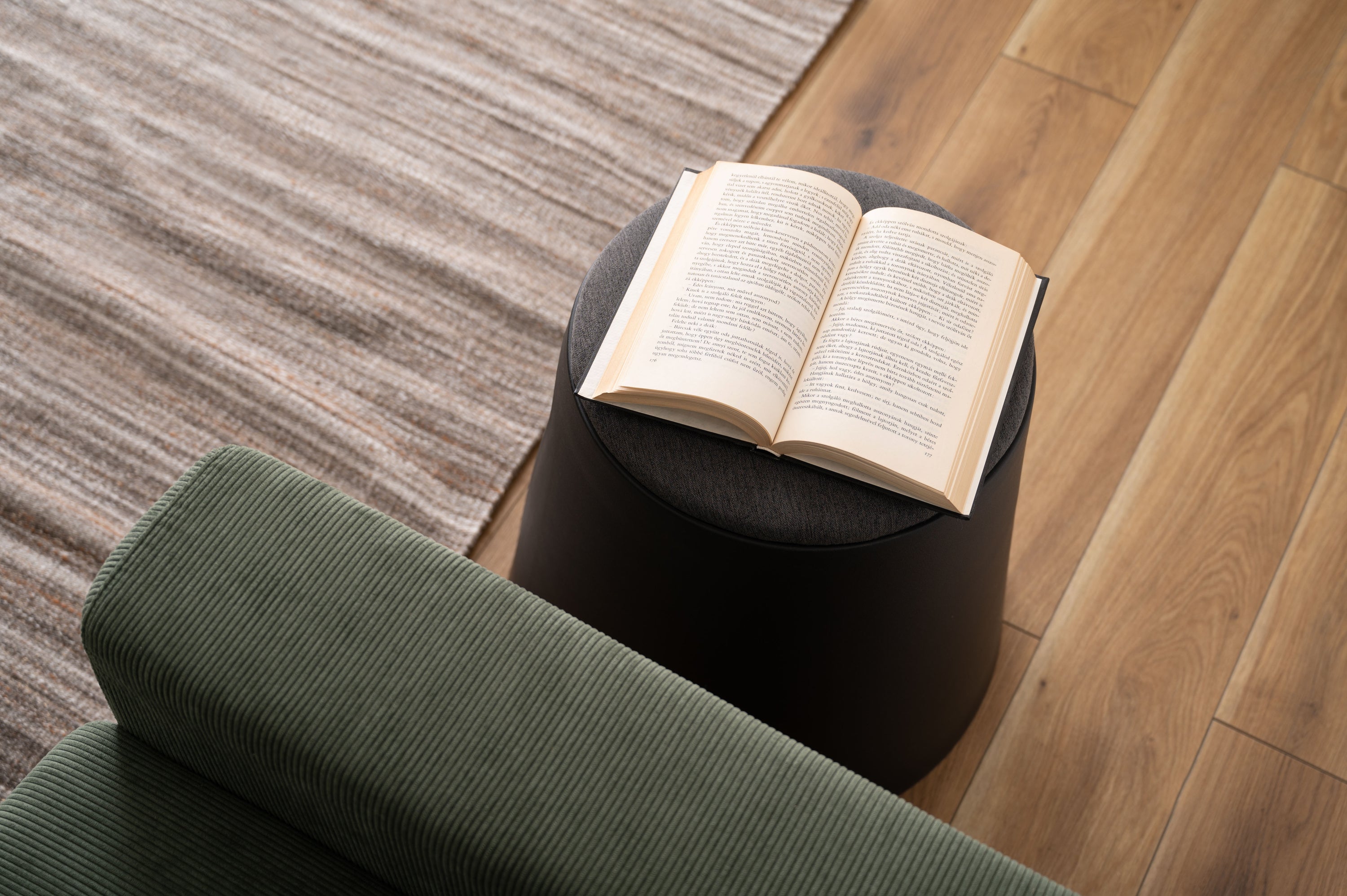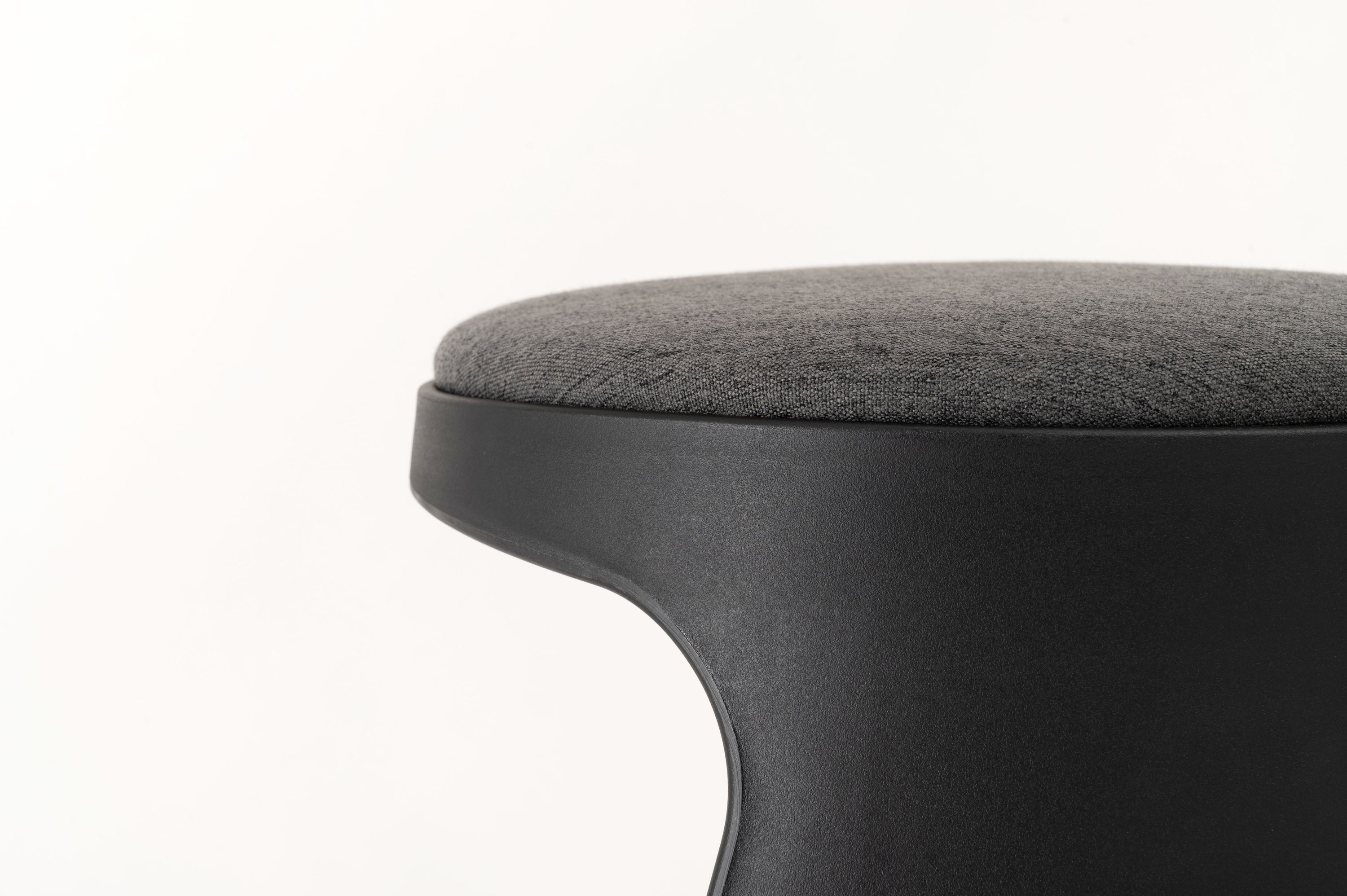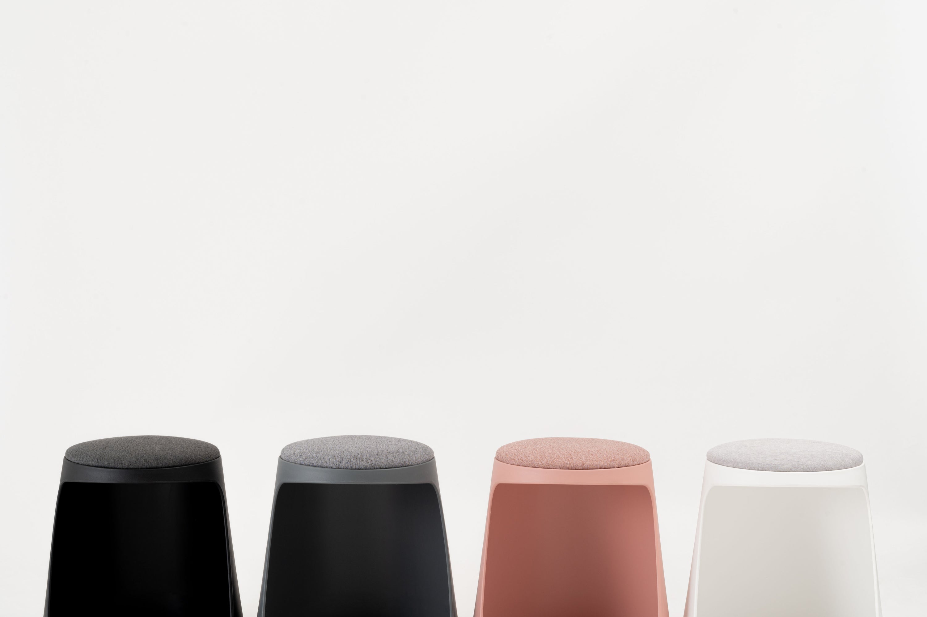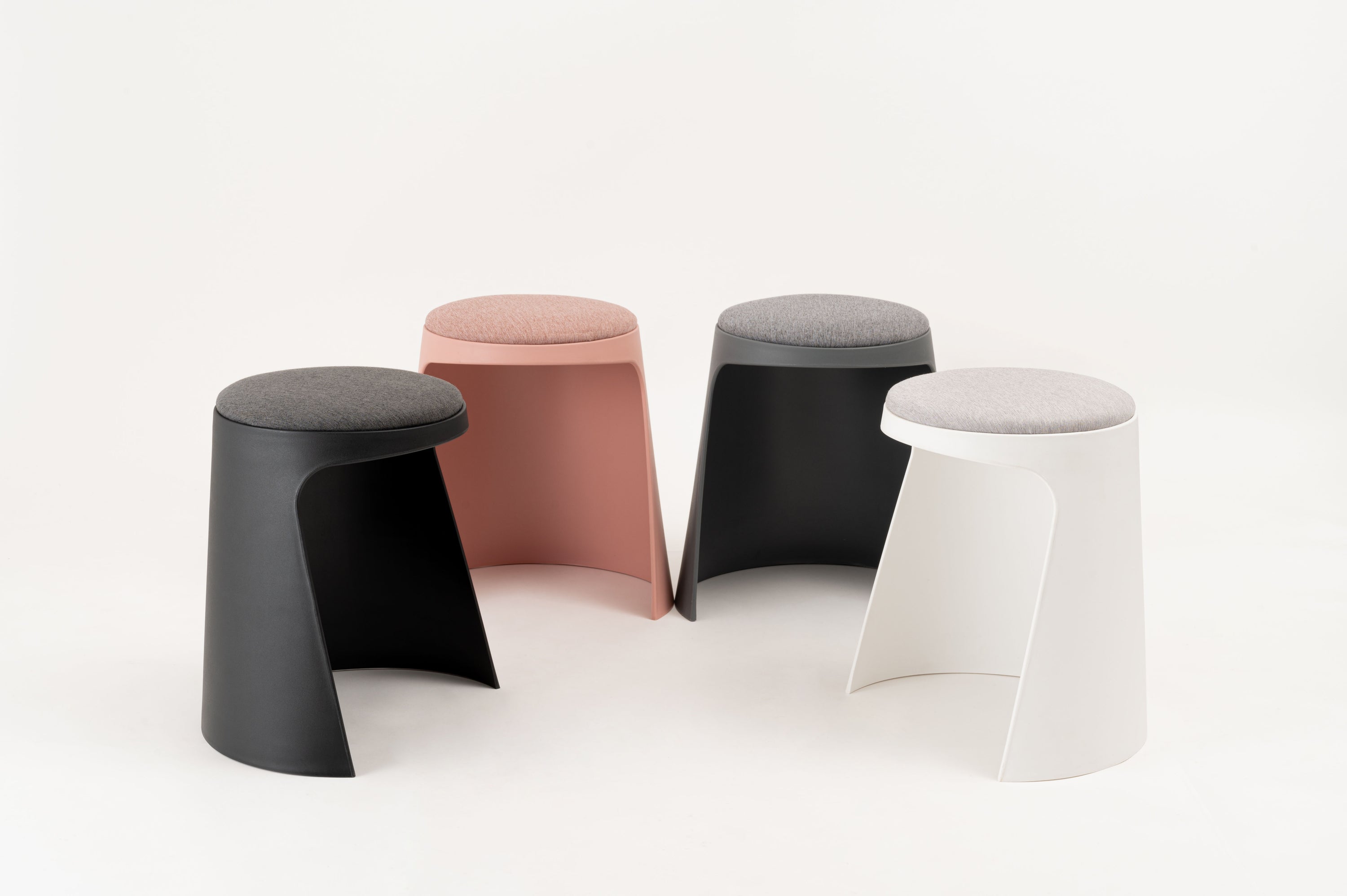 デザイン性と機能性、両方叶えるスタッキングスツール「カヌレ」 座面下に大きく空いた空間は、個性的なフォルムのデザイン性を高めるだけでなく、足を入れられる事で座りやすくなる機能性も兼ね備えています。 座面にはファブリックを使用し、その座りやすさをより追求しました。