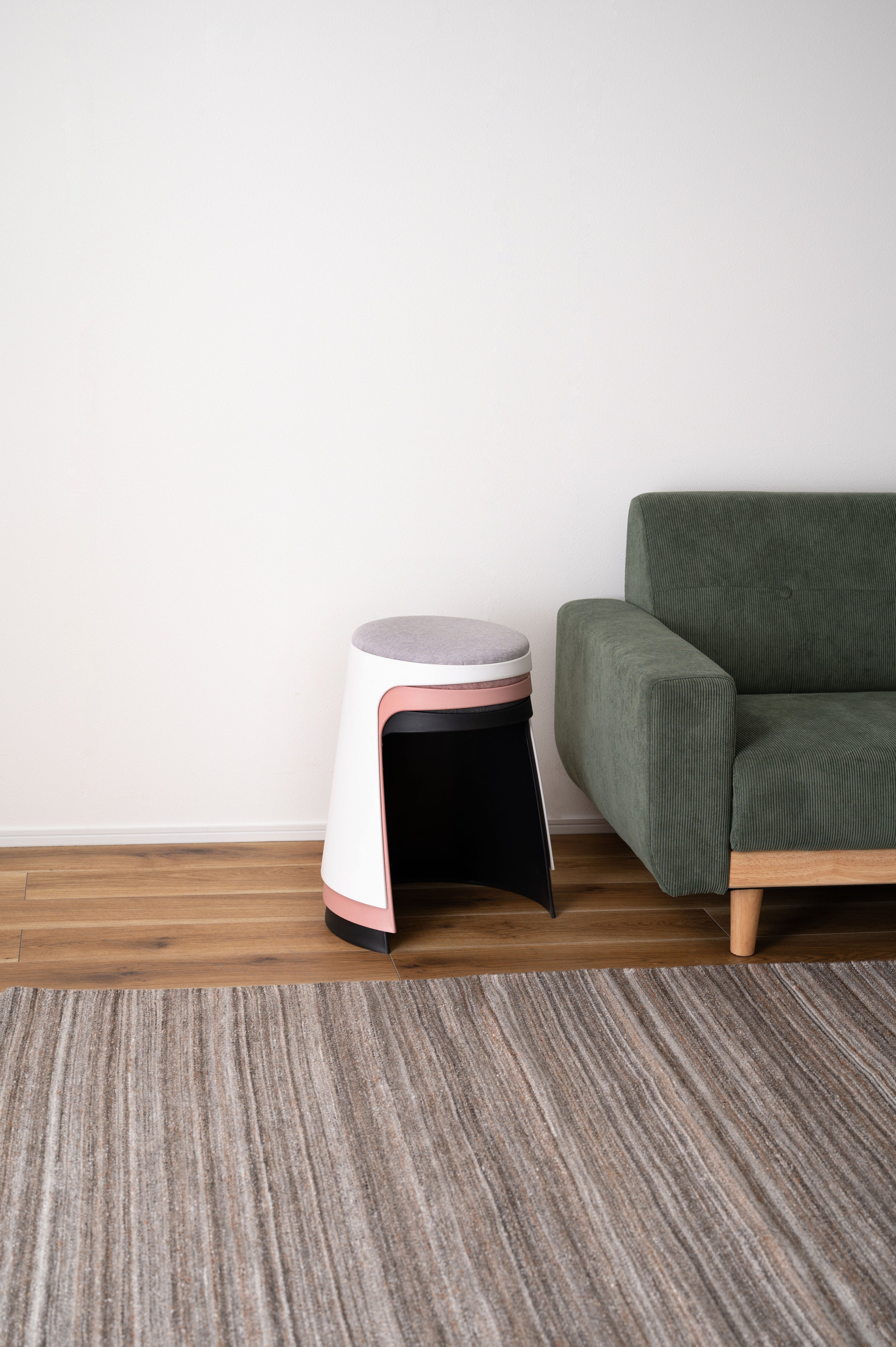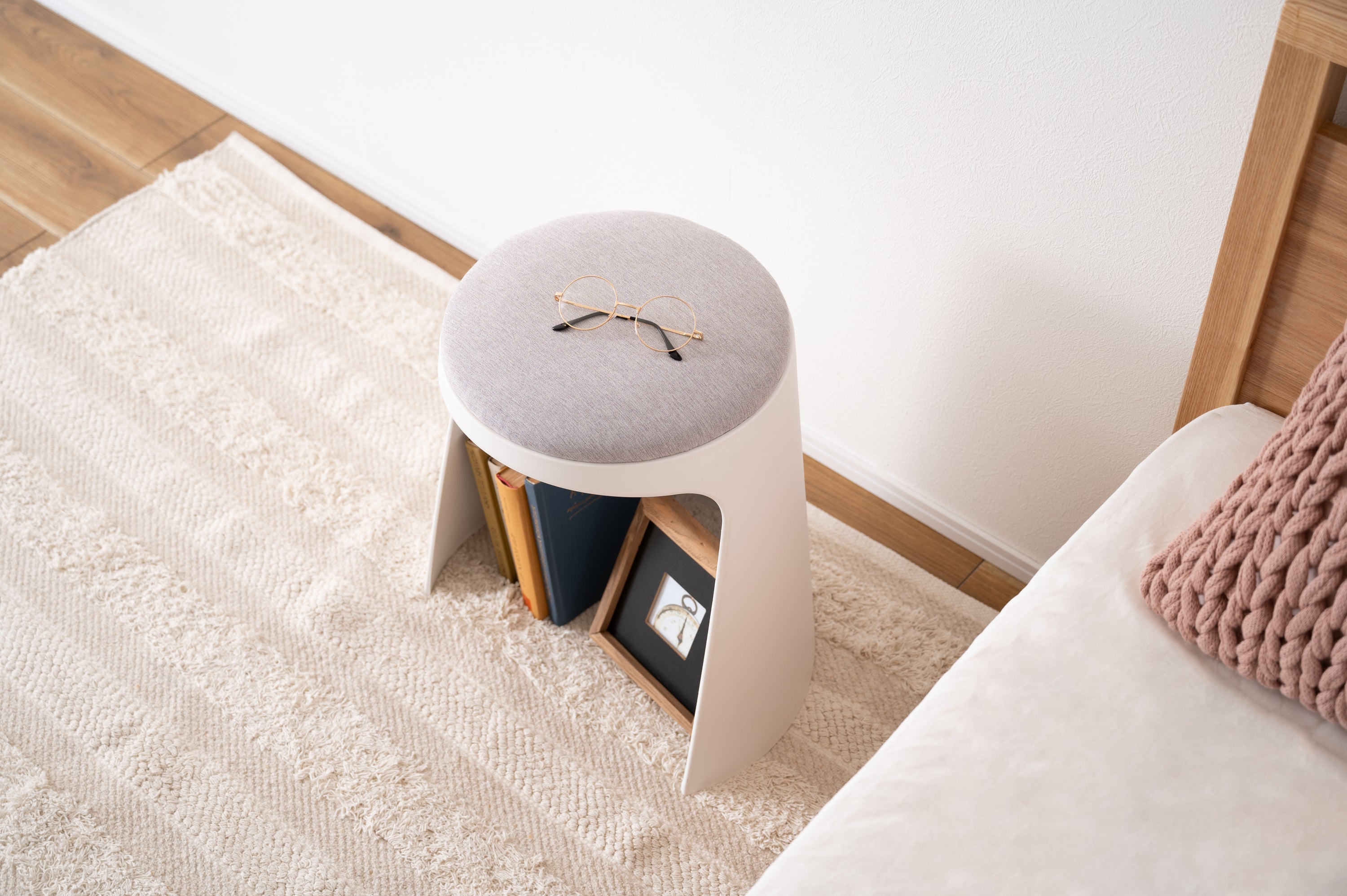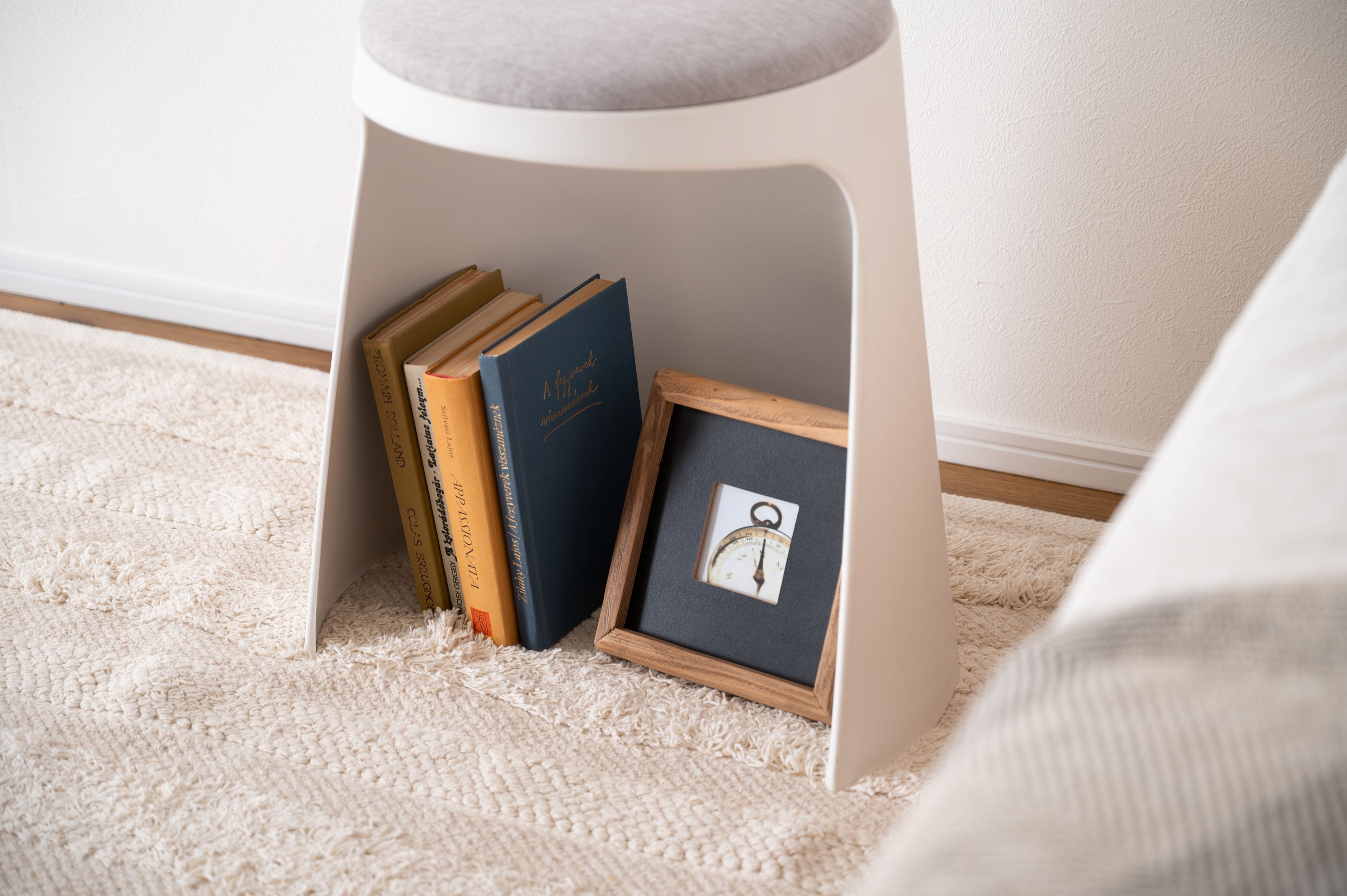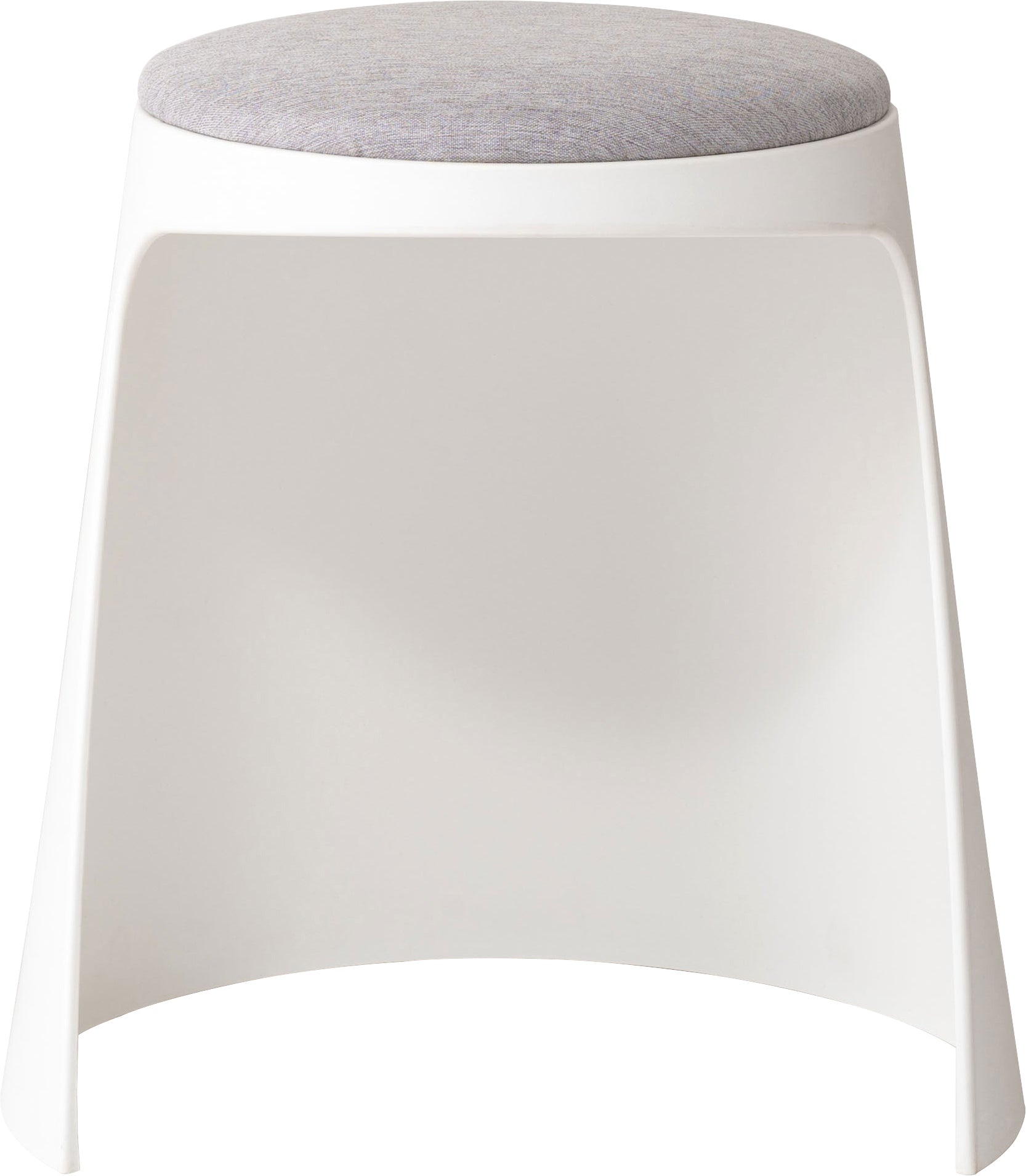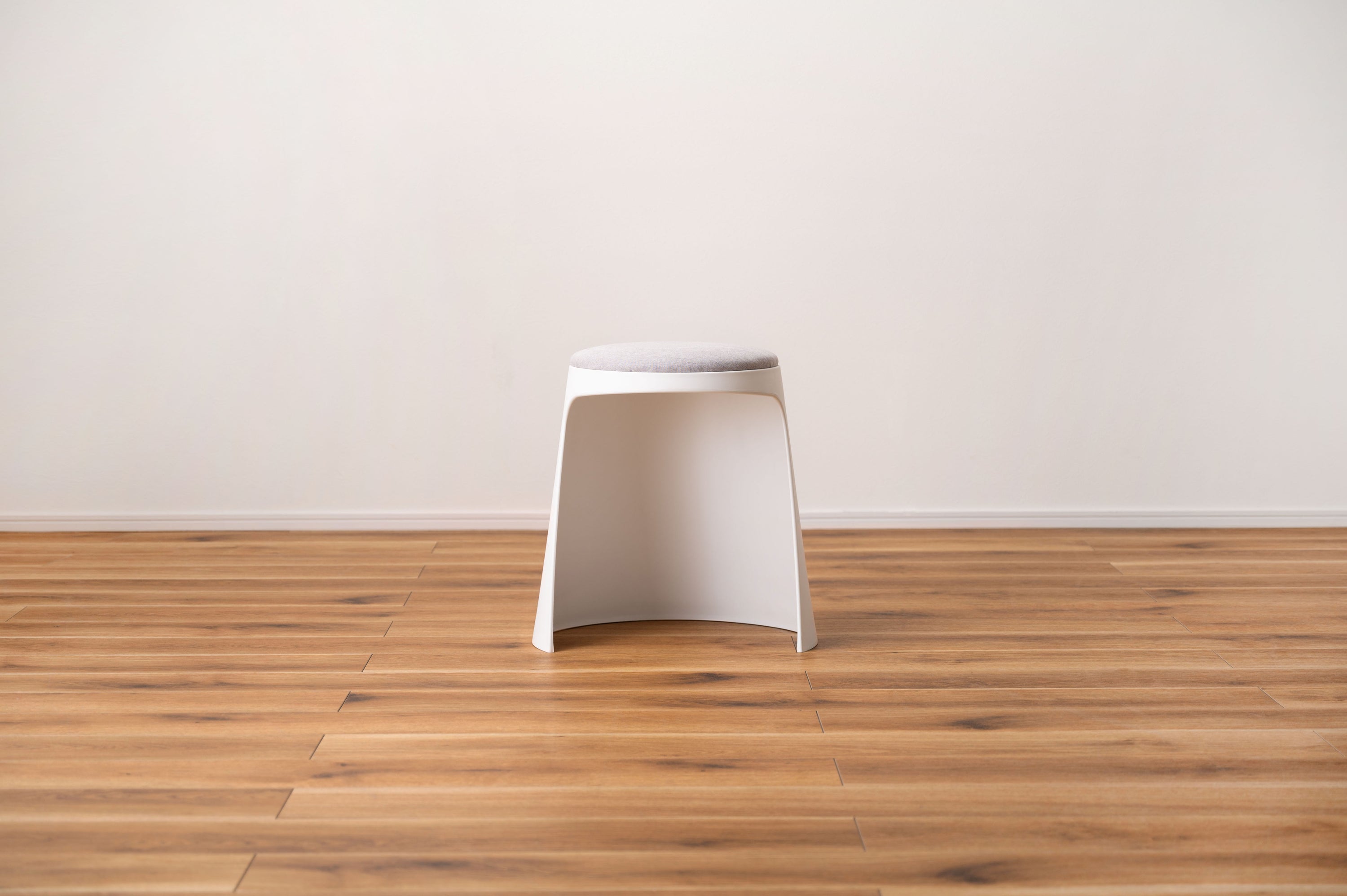 デザイン性と機能性、両方叶えるスタッキングスツール「カヌレ」 座面下に大きく空いた空間は、個性的なフォルムのデザイン性を高めるだけでなく、足を入れられる事で座りやすくなる機能性も兼ね備えています。 座面にはファブリックを使用し、その座りやすさをより追求しました。