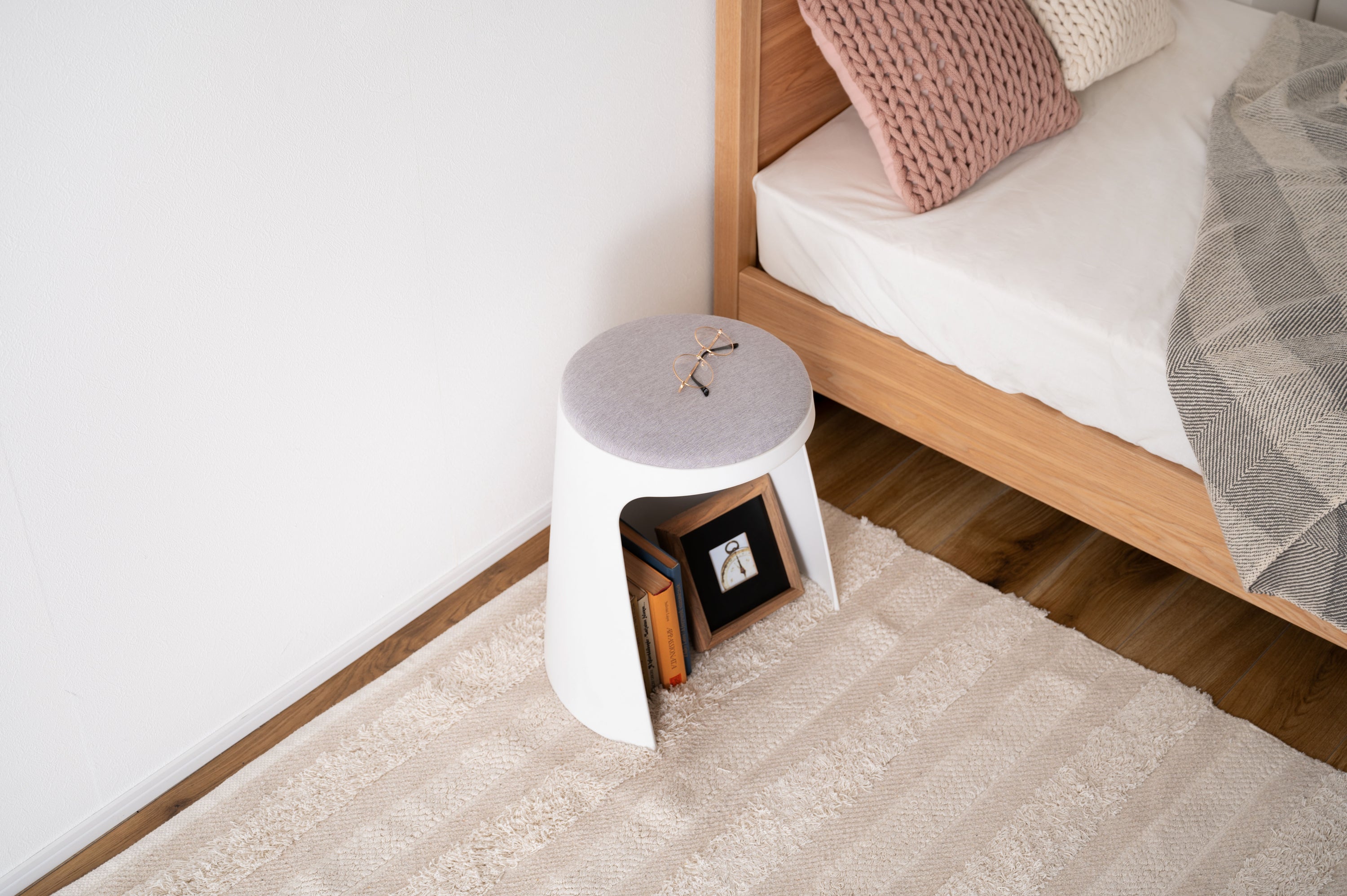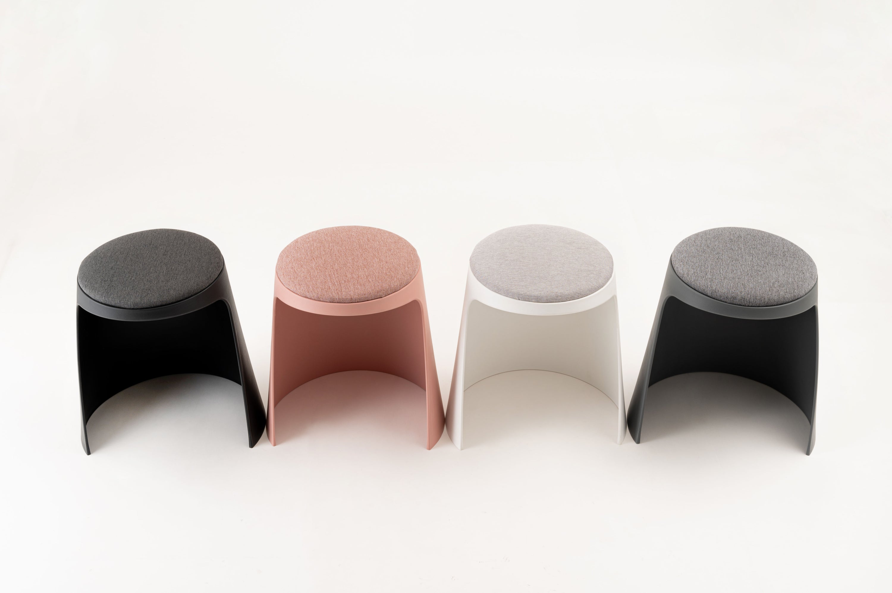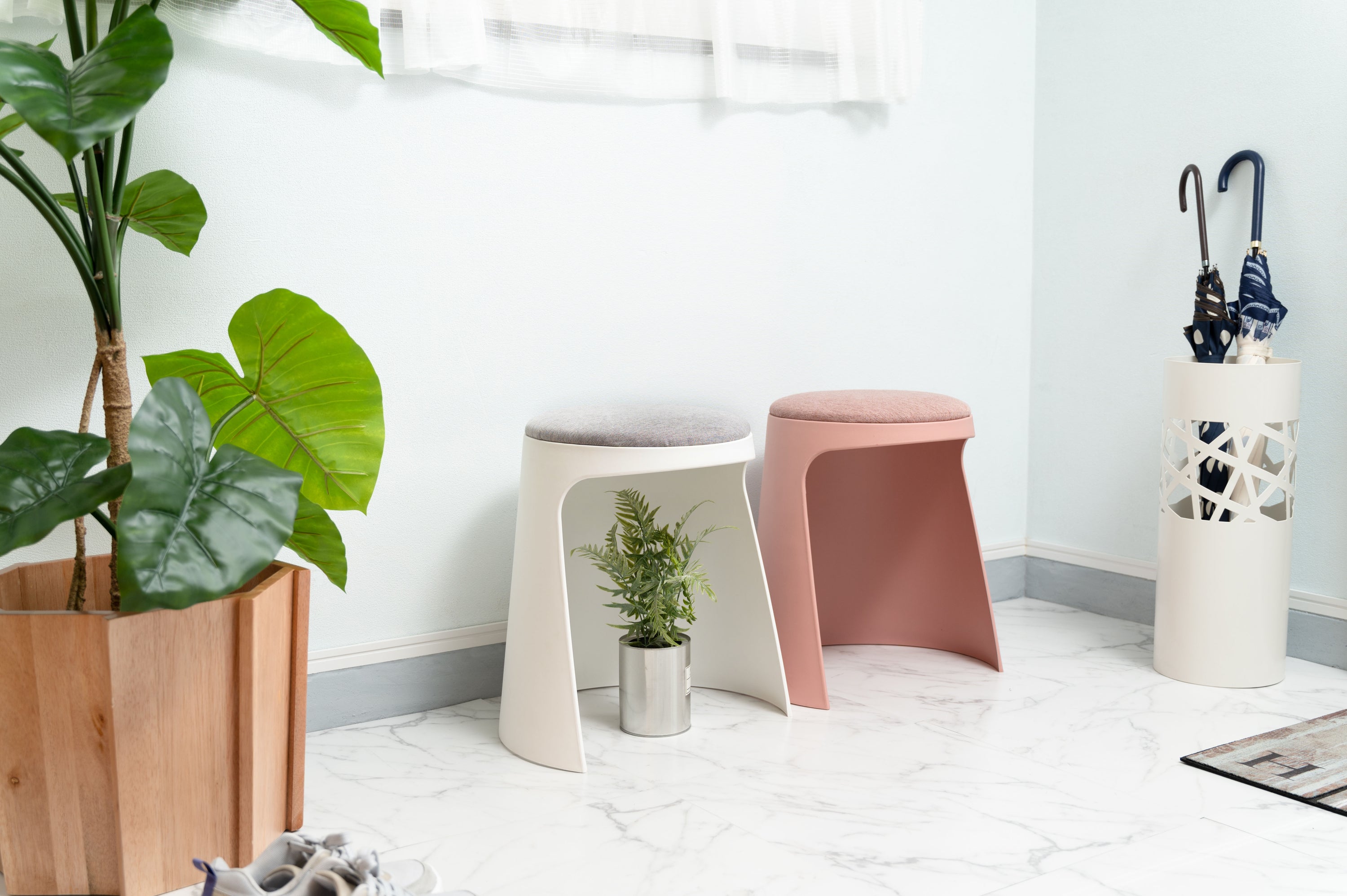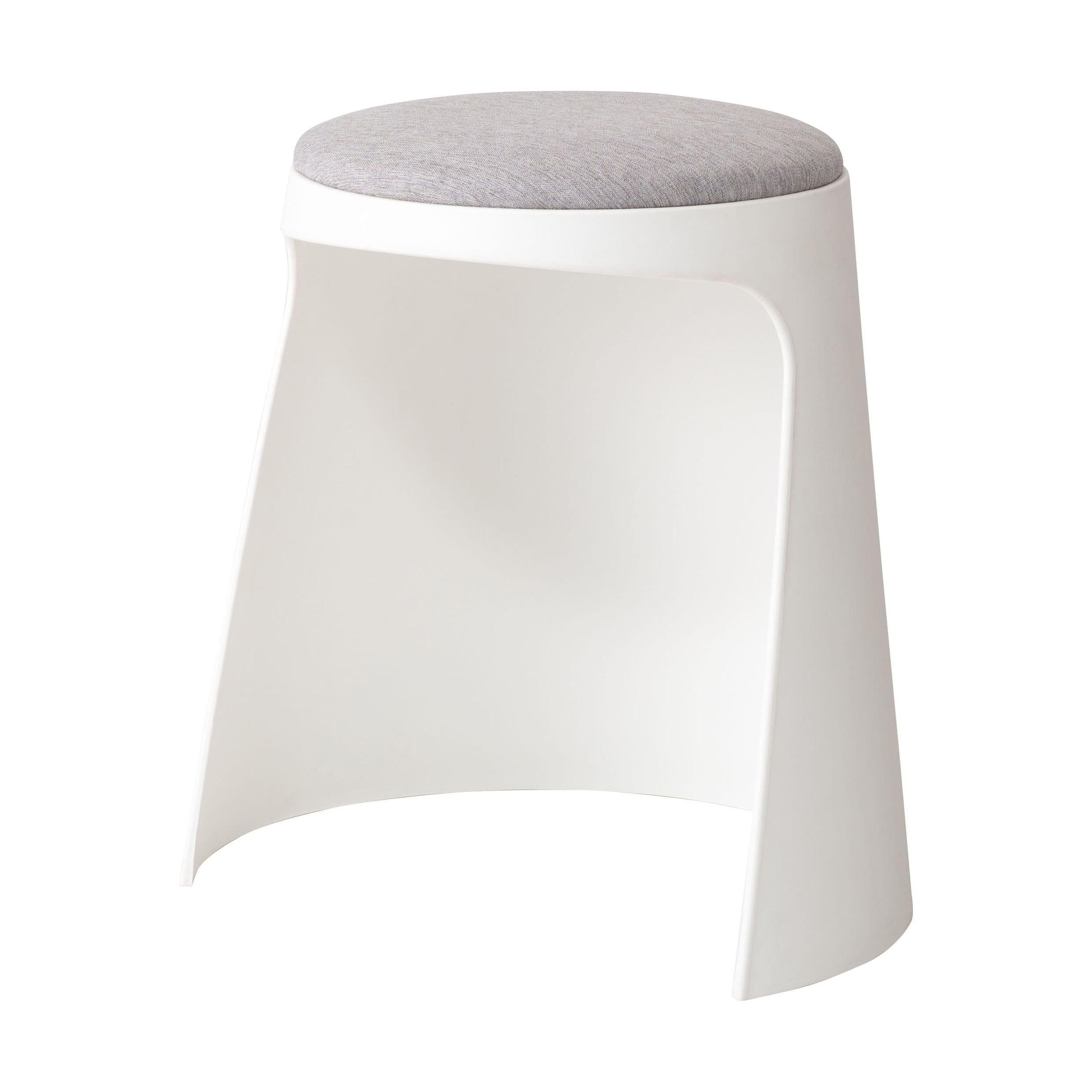 デザイン性と機能性、両方叶えるスタッキングスツール「カヌレ」 座面下に大きく空いた空間は、個性的なフォルムのデザイン性を高めるだけでなく、足を入れられる事で座りやすくなる機能性も兼ね備えています。 座面にはファブリックを使用し、その座りやすさをより追求しました。