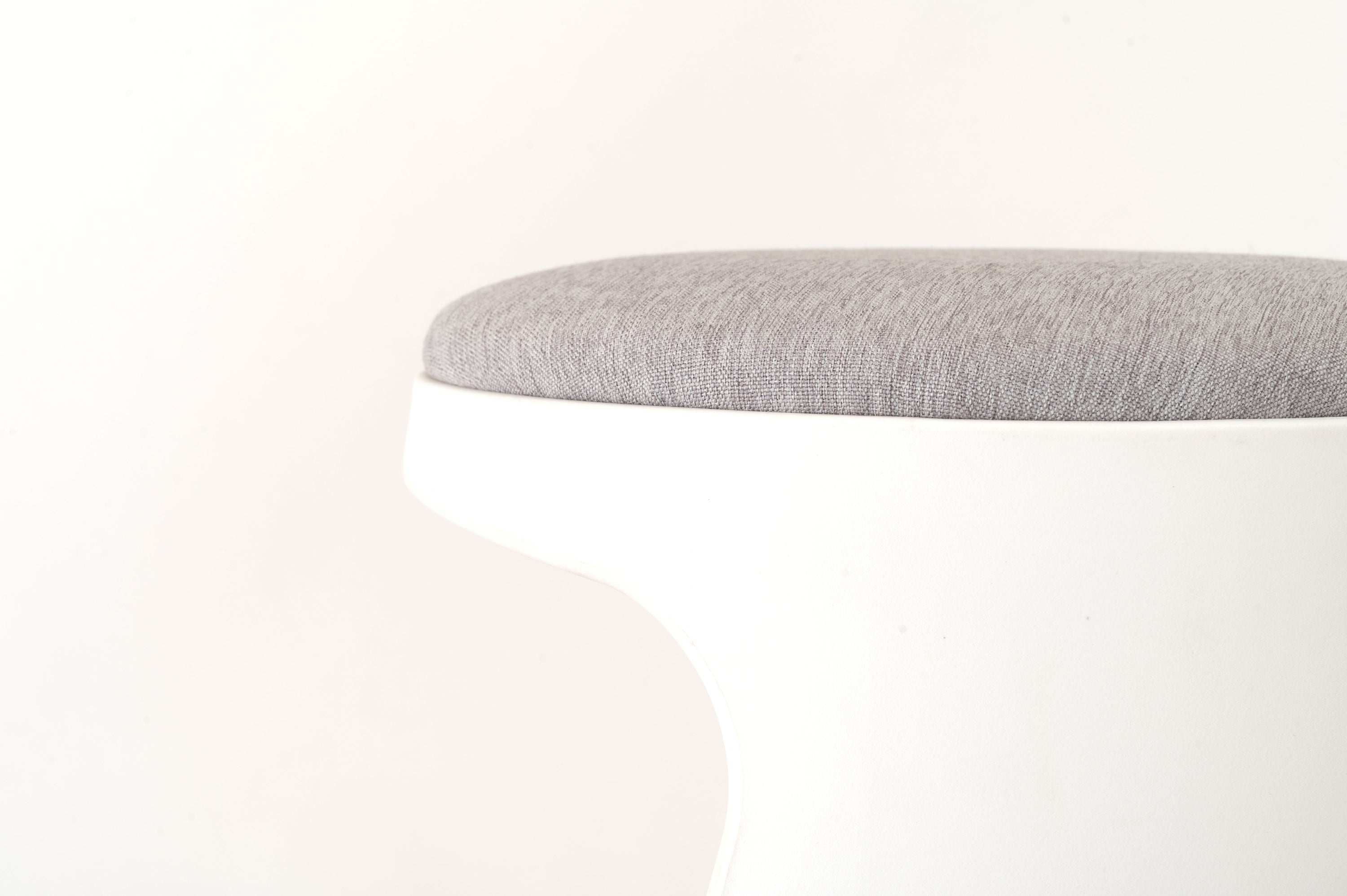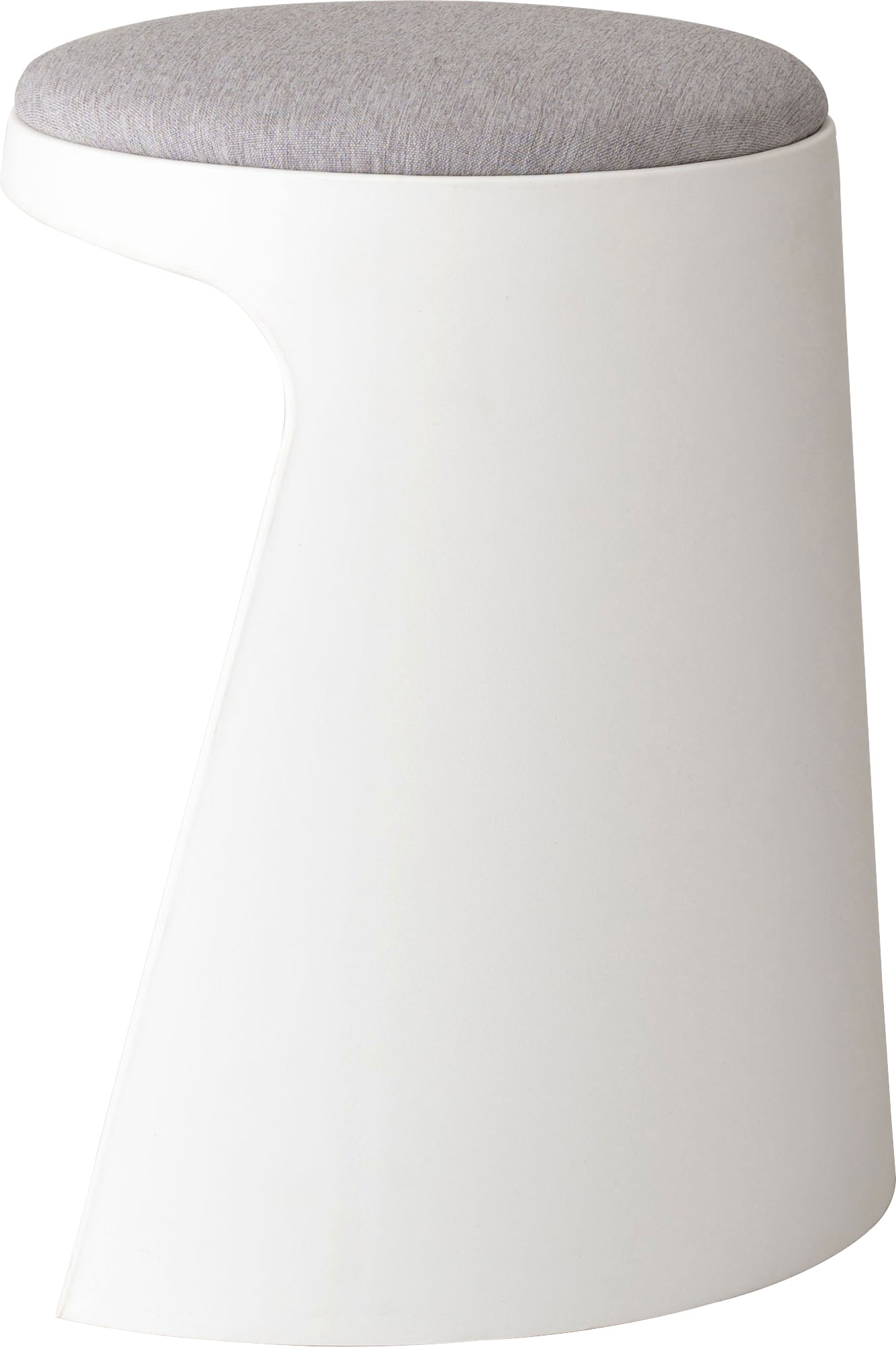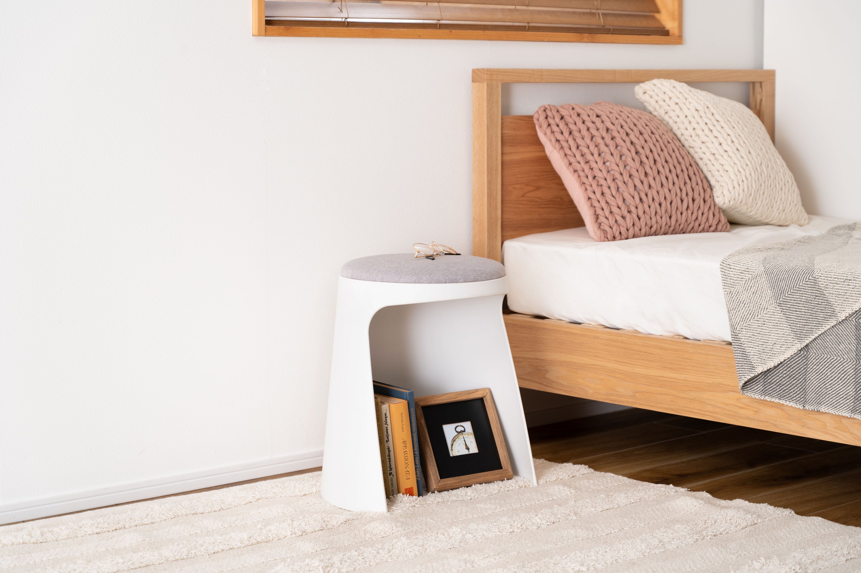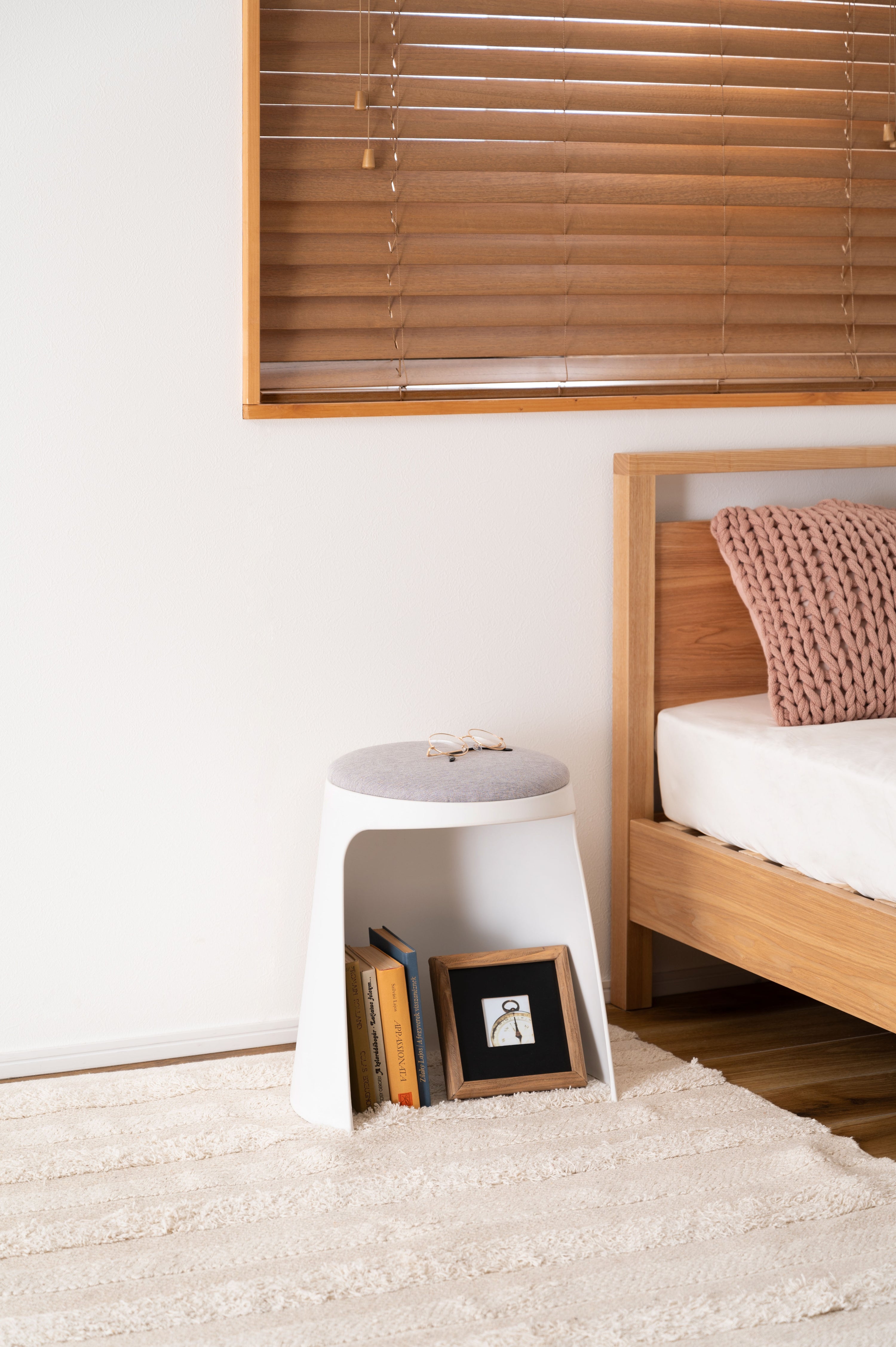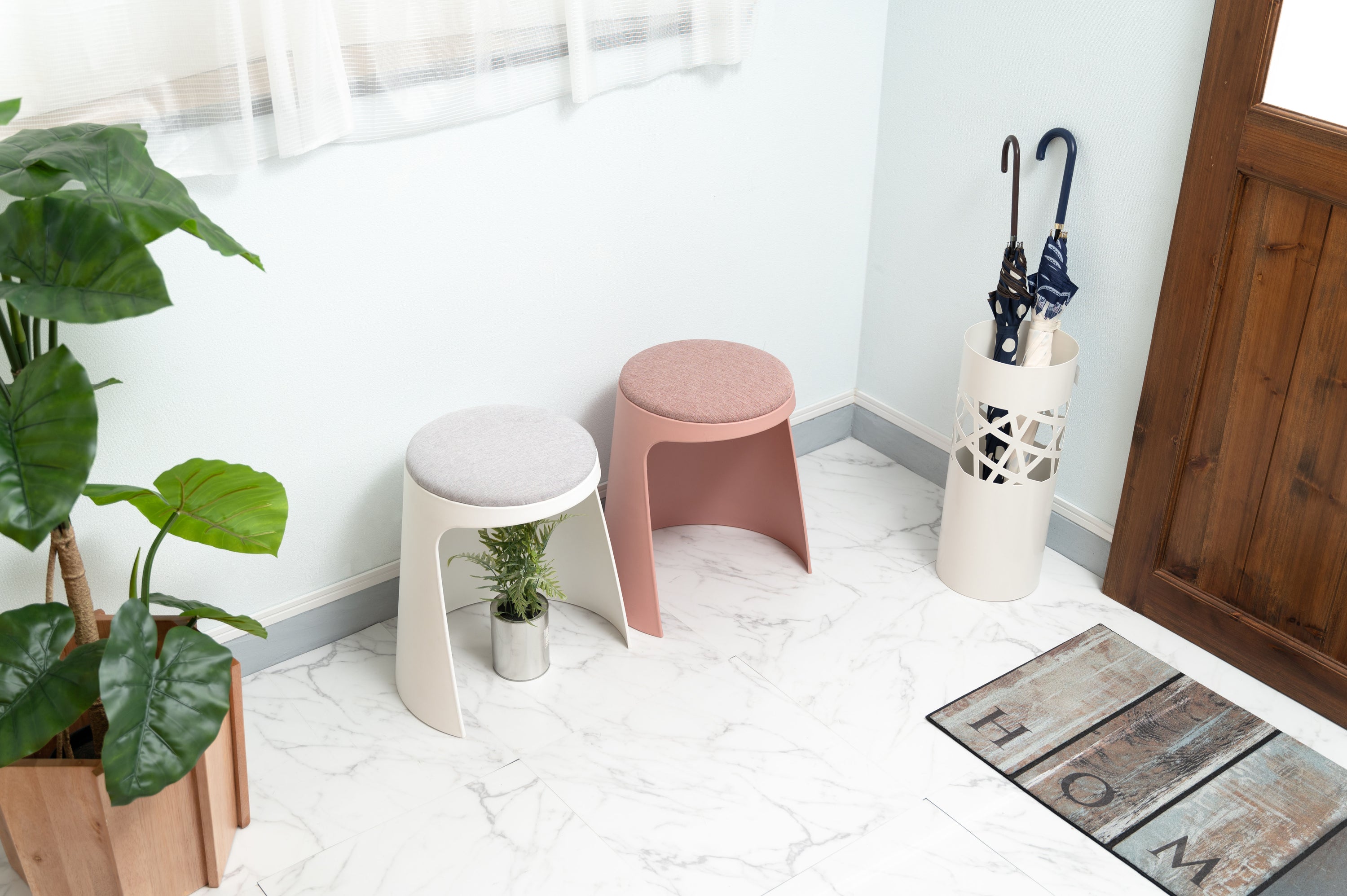 デザイン性と機能性、両方叶えるスタッキングスツール「カヌレ」 座面下に大きく空いた空間は、個性的なフォルムのデザイン性を高めるだけでなく、足を入れられる事で座りやすくなる機能性も兼ね備えています。 座面にはファブリックを使用し、その座りやすさをより追求しました。