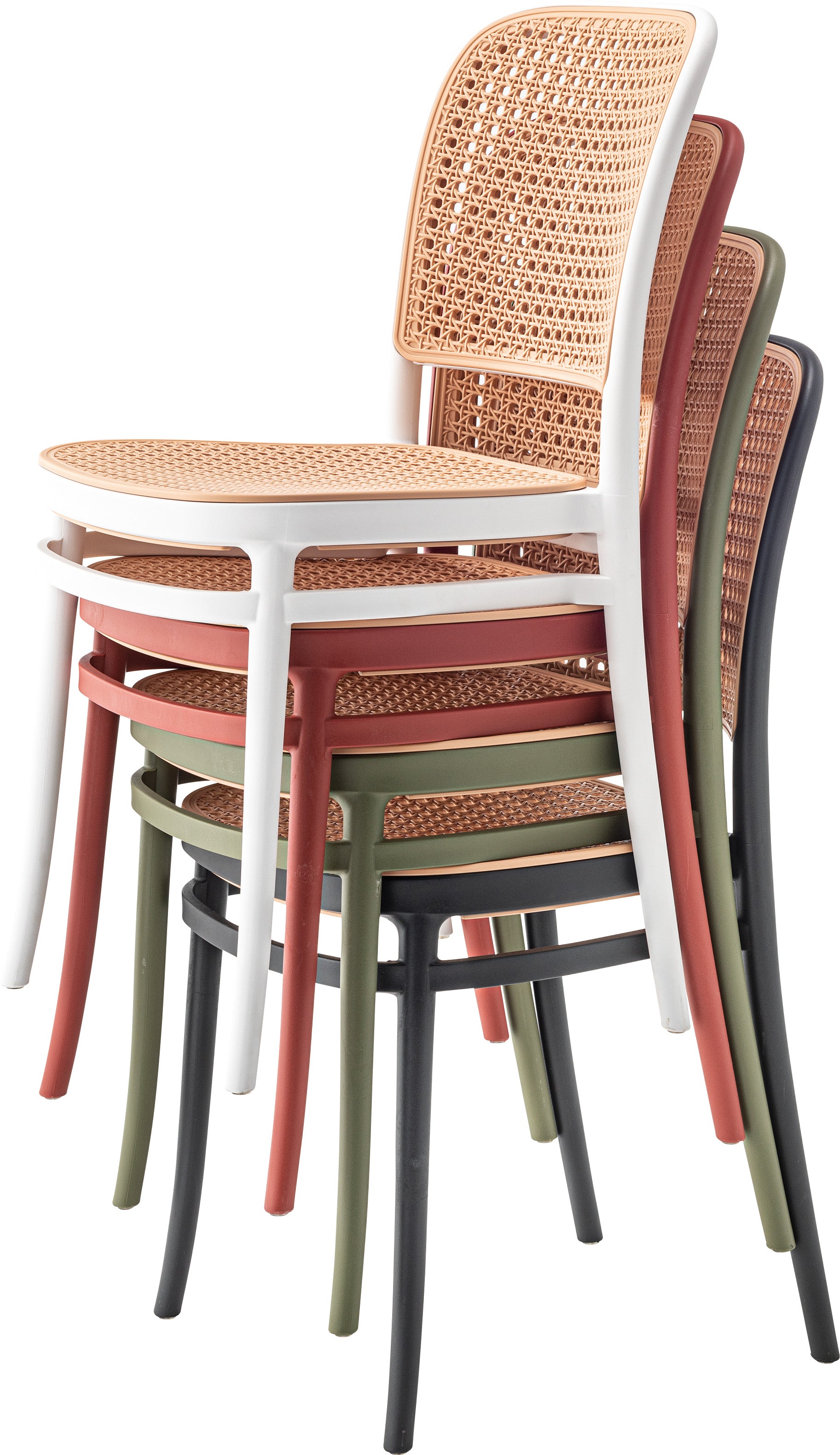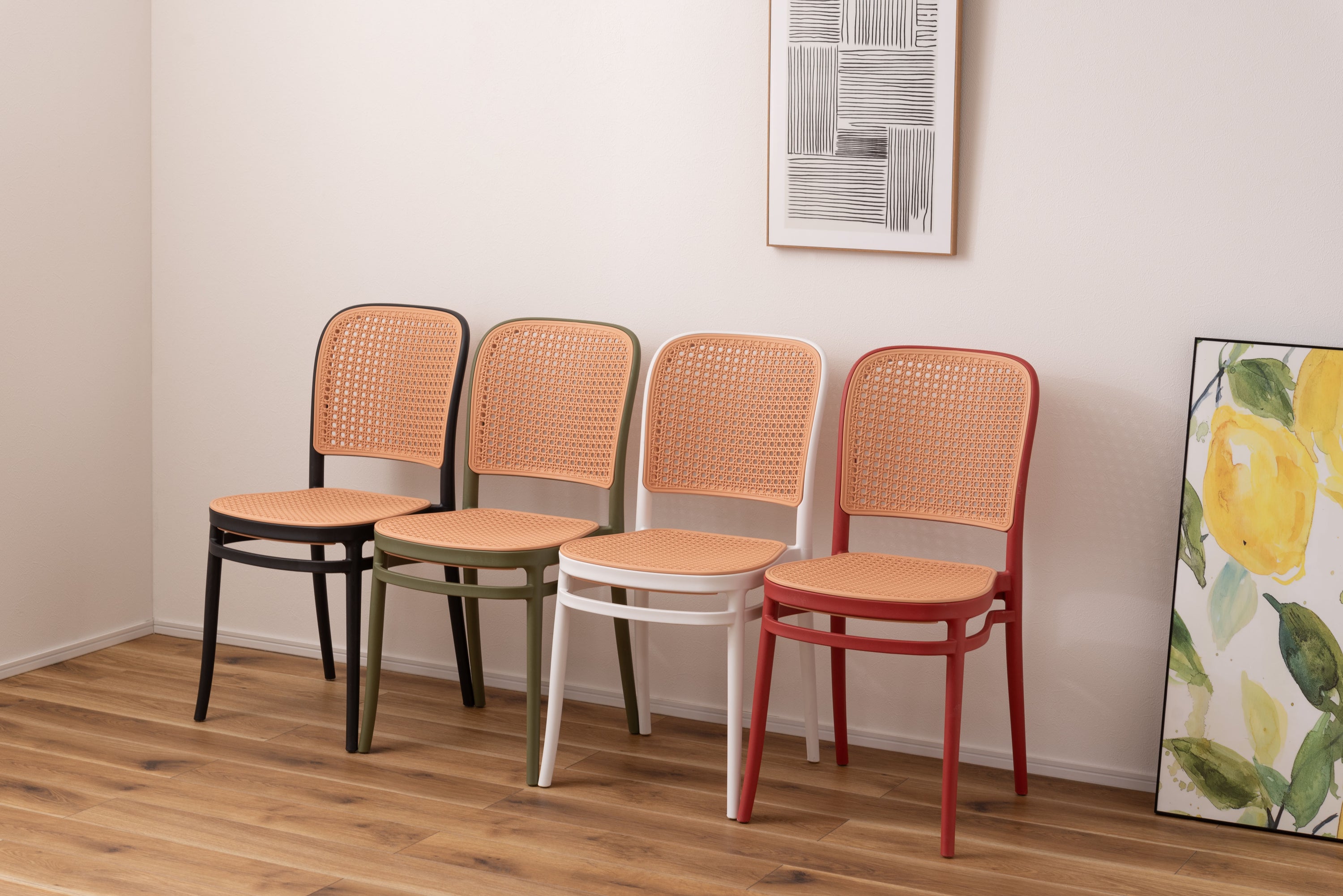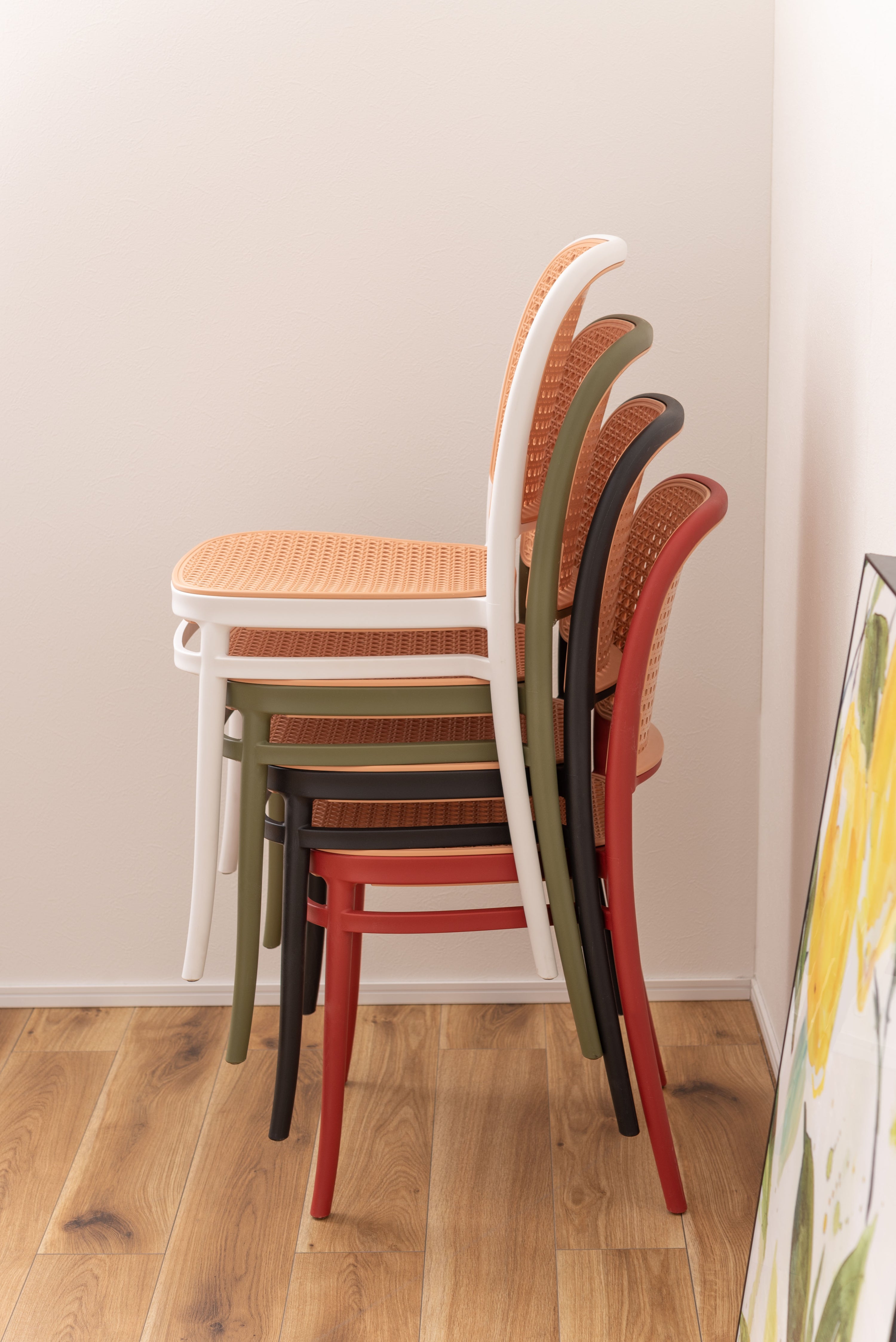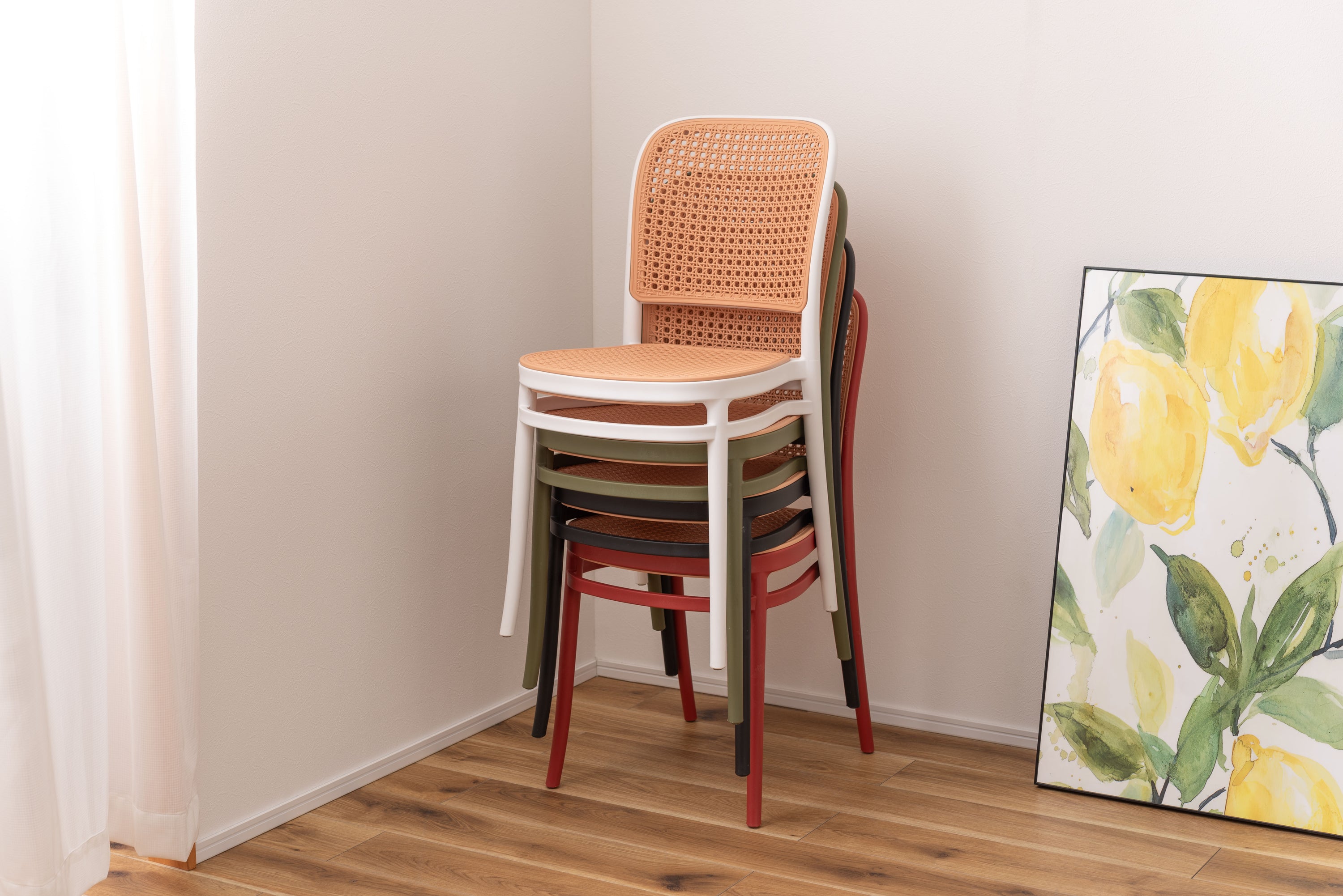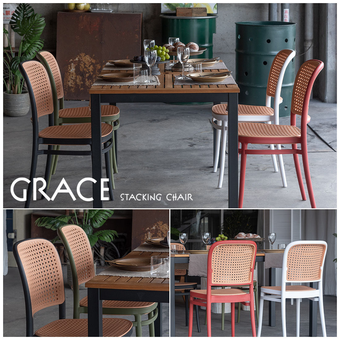 背面と座面にラタン調のデザインを施した、トレンド感溢れるグレイスチェア。ポリプロピレン製なので軽量で耐久性があり、傷や汚れに強いのも嬉しいポイント。どのカラーも落ち着いた合わせやすい色味をチョイスしており、お部屋ではもちろん、ガーデンシーンにもよく馴染むデザインです。スタッキング可能なので場所を取らずに収納することが出来ます。