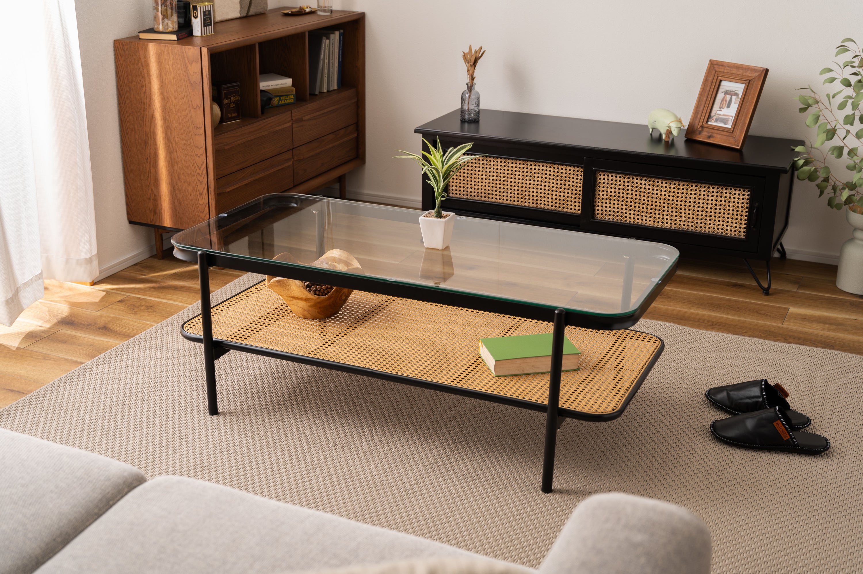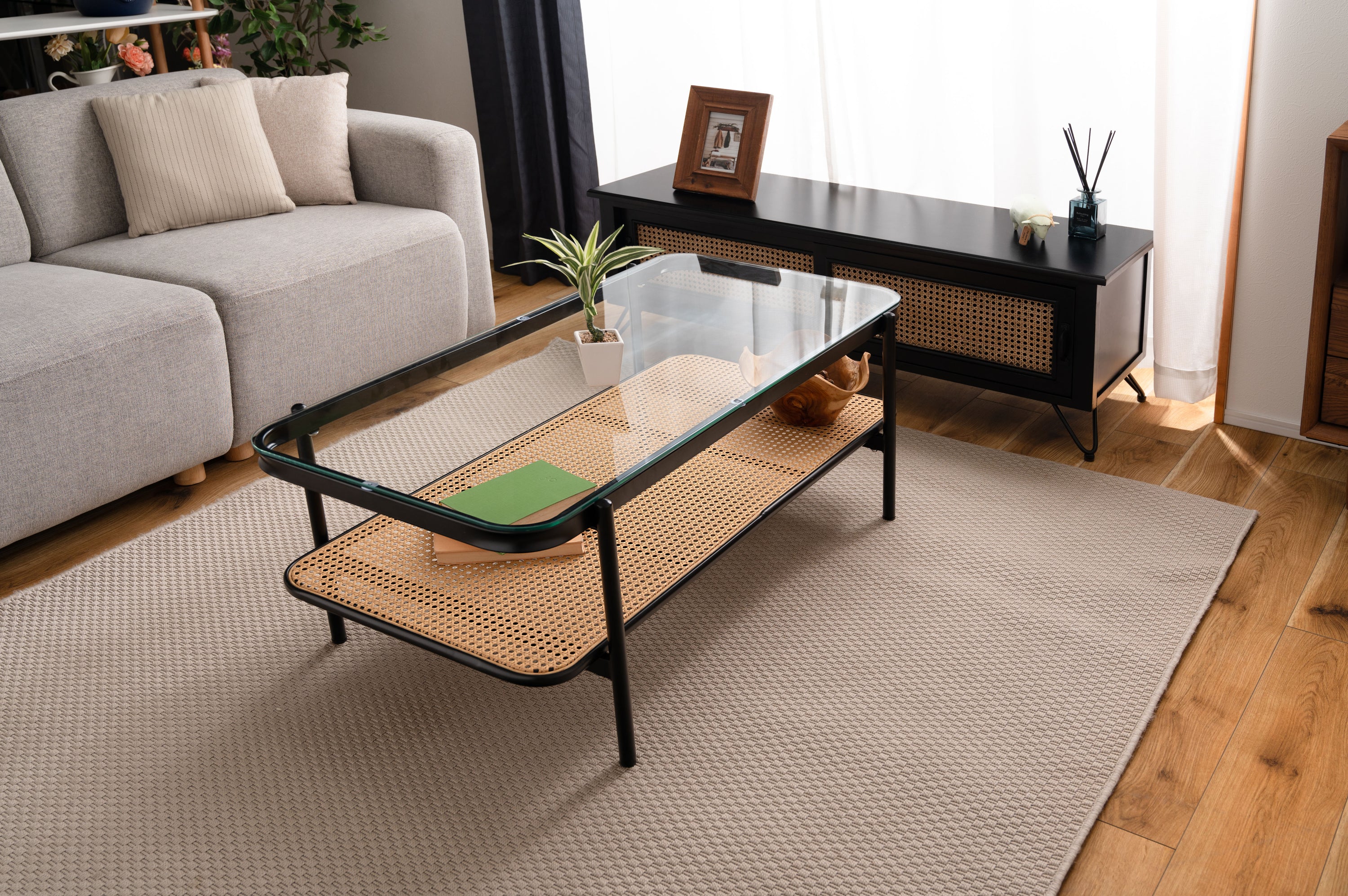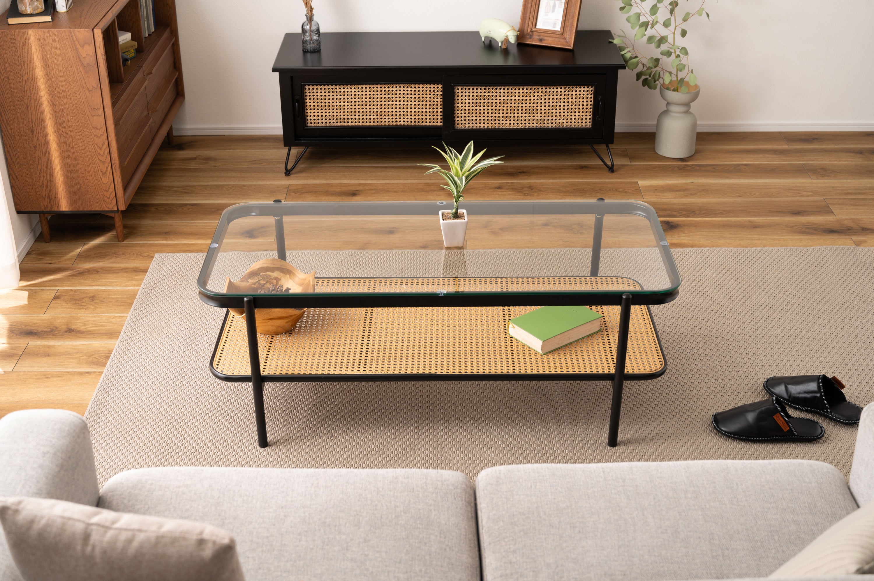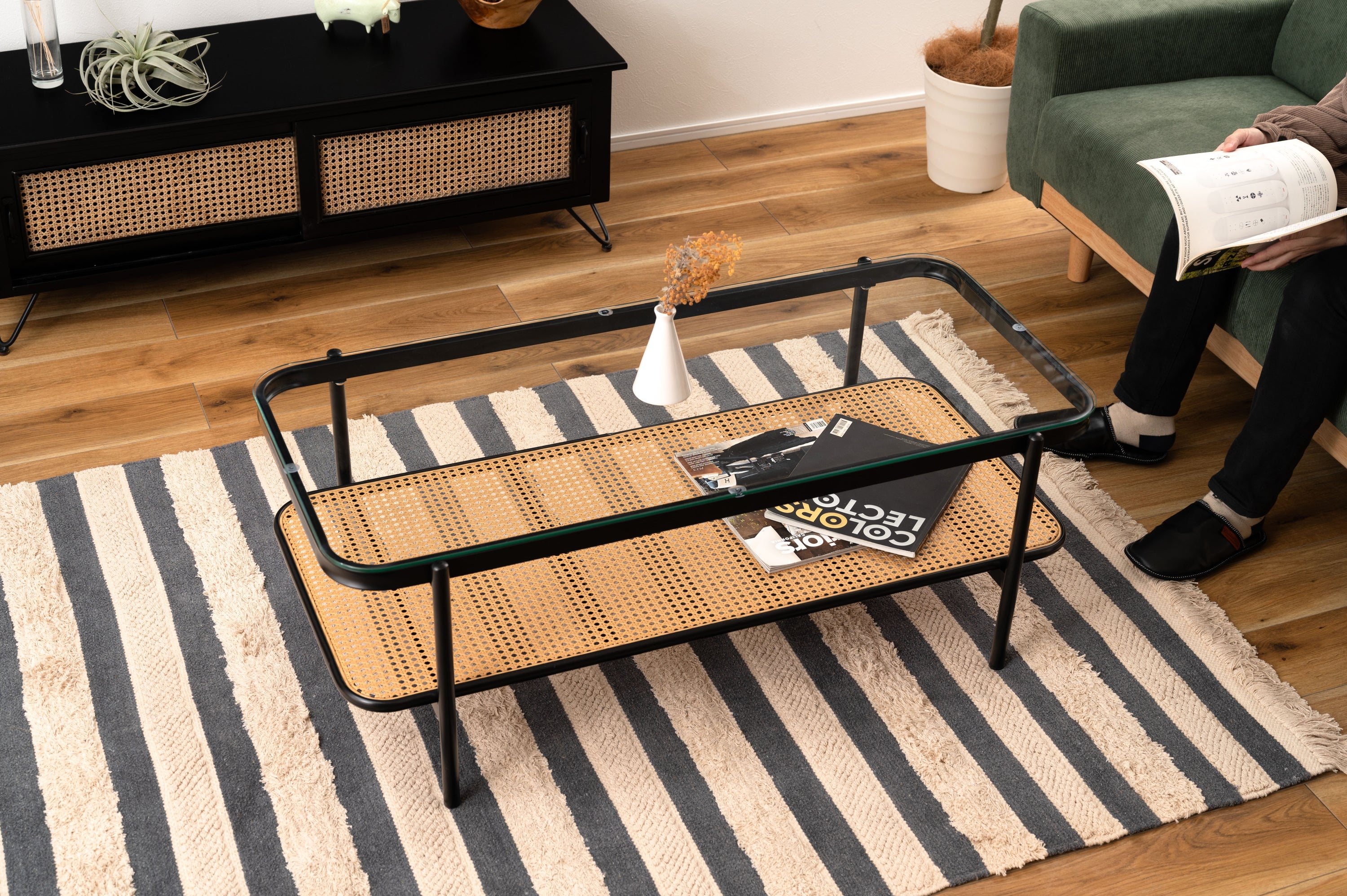 ブラックフレームと人工ラタンを組み合わせた、スタイリッシュさと温かみを兼ね揃えたリビングテーブル。ガラス天板とラタン調のラックが広々とした空間を演出し、堅苦しさのないモダンな雰囲気を楽しむことができます。ガラス天板と透け感のあるラタンは、存在感を発揮しつつもスマートな印象。軽やかで開放的なデザインなので、置くだけで広々としたリビングルームへと変化。天板がガラス製のため、下のラック部分を上から見ることができ、お気に入りの小物や雑貨を配置することでお洒落なディスプレイに。天板下のラック部分は、自然な色合いのラタン調デザインを採用。ブラックフレームとガラスのスタイリッシュな組み合わせの中に、ナチュラルなぬくもりを与えてくれます。ガラス天板は厚さ6mmの強化ガラスを使用。通常のガラスよりも強度があり、万が一割れた場合でも鋭利にならず粉々に砕けるので、ケガをしにくく安心してご使用いただけます。ガラス天板のズレやぐらつきを防止するために4箇所の吸盤で固定。ガラス天板の取り外しも行いやすく、日々の掃除やお手入れも簡単。