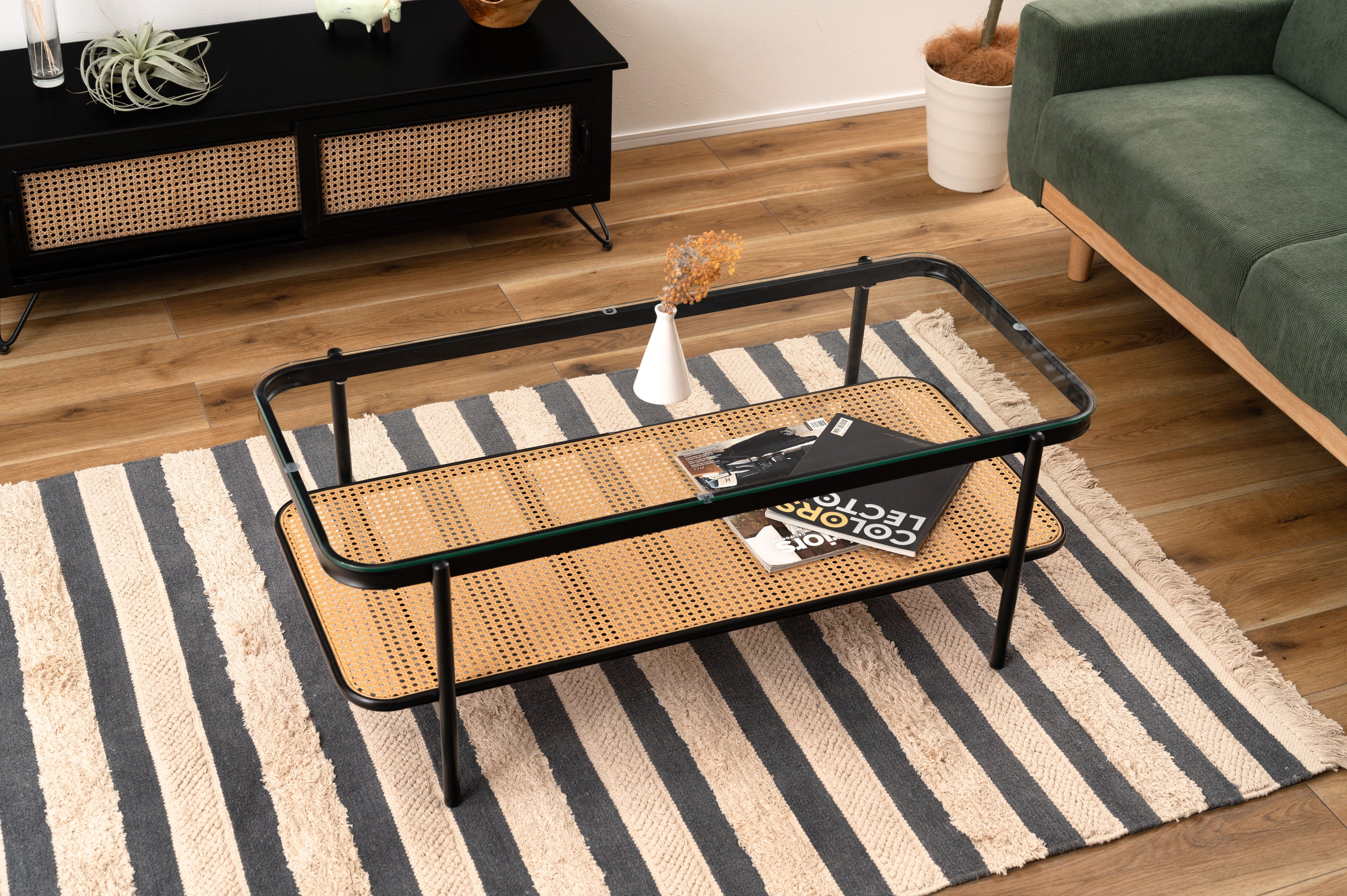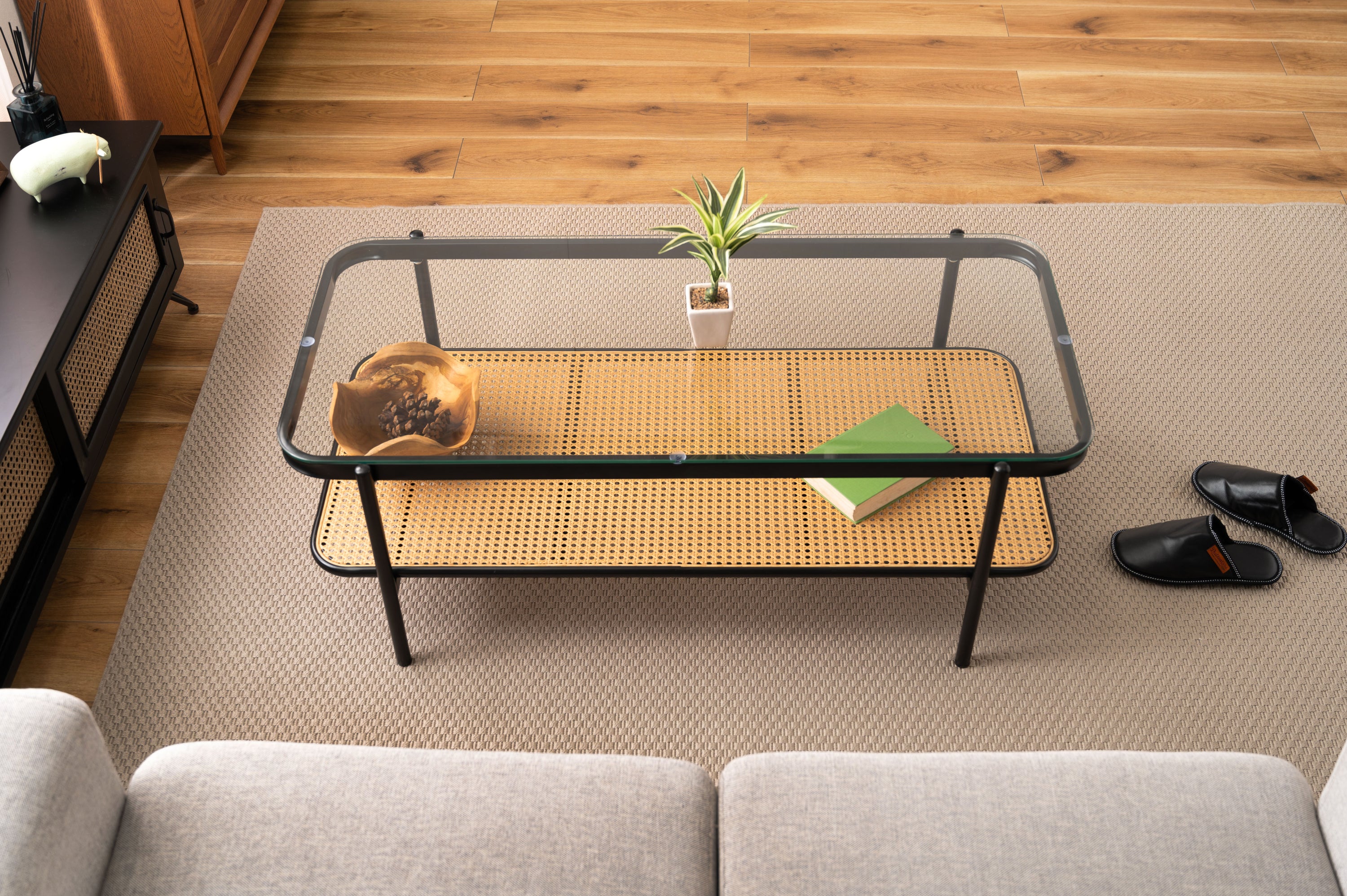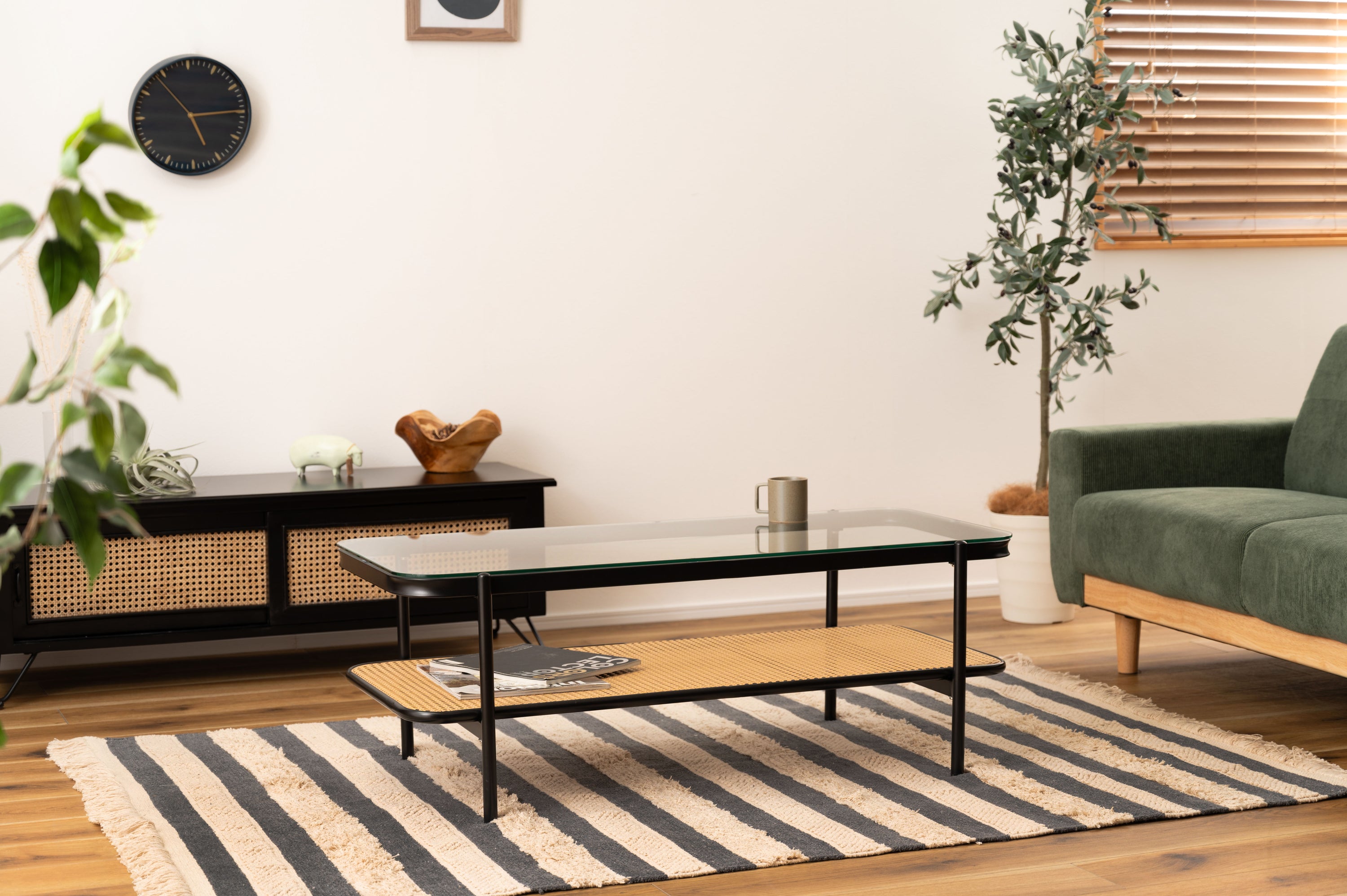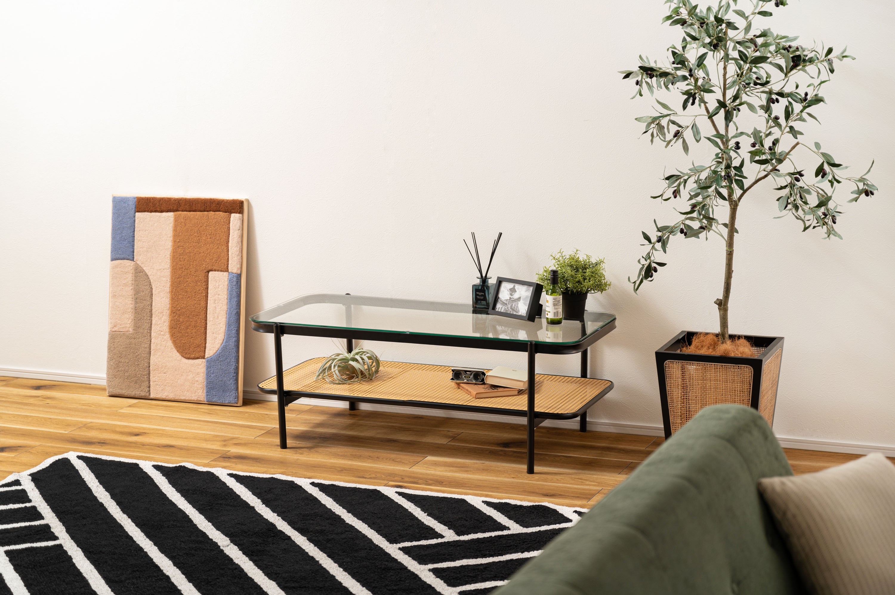 ブラックフレームと人工ラタンを組み合わせた、スタイリッシュさと温かみを兼ね揃えたリビングテーブル。ガラス天板とラタン調のラックが広々とした空間を演出し、堅苦しさのないモダンな雰囲気を楽しむことができます。ガラス天板と透け感のあるラタンは、存在感を発揮しつつもスマートな印象。軽やかで開放的なデザインなので、置くだけで広々としたリビングルームへと変化。天板がガラス製のため、下のラック部分を上から見ることができ、お気に入りの小物や雑貨を配置することでお洒落なディスプレイに。天板下のラック部分は、自然な色合いのラタン調デザインを採用。ブラックフレームとガラスのスタイリッシュな組み合わせの中に、ナチュラルなぬくもりを与えてくれます。ガラス天板は厚さ6mmの強化ガラスを使用。通常のガラスよりも強度があり、万が一割れた場合でも鋭利にならず粉々に砕けるので、ケガをしにくく安心してご使用いただけます。ガラス天板のズレやぐらつきを防止するために4箇所の吸盤で固定。ガラス天板の取り外しも行いやすく、日々の掃除やお手入れも簡単。