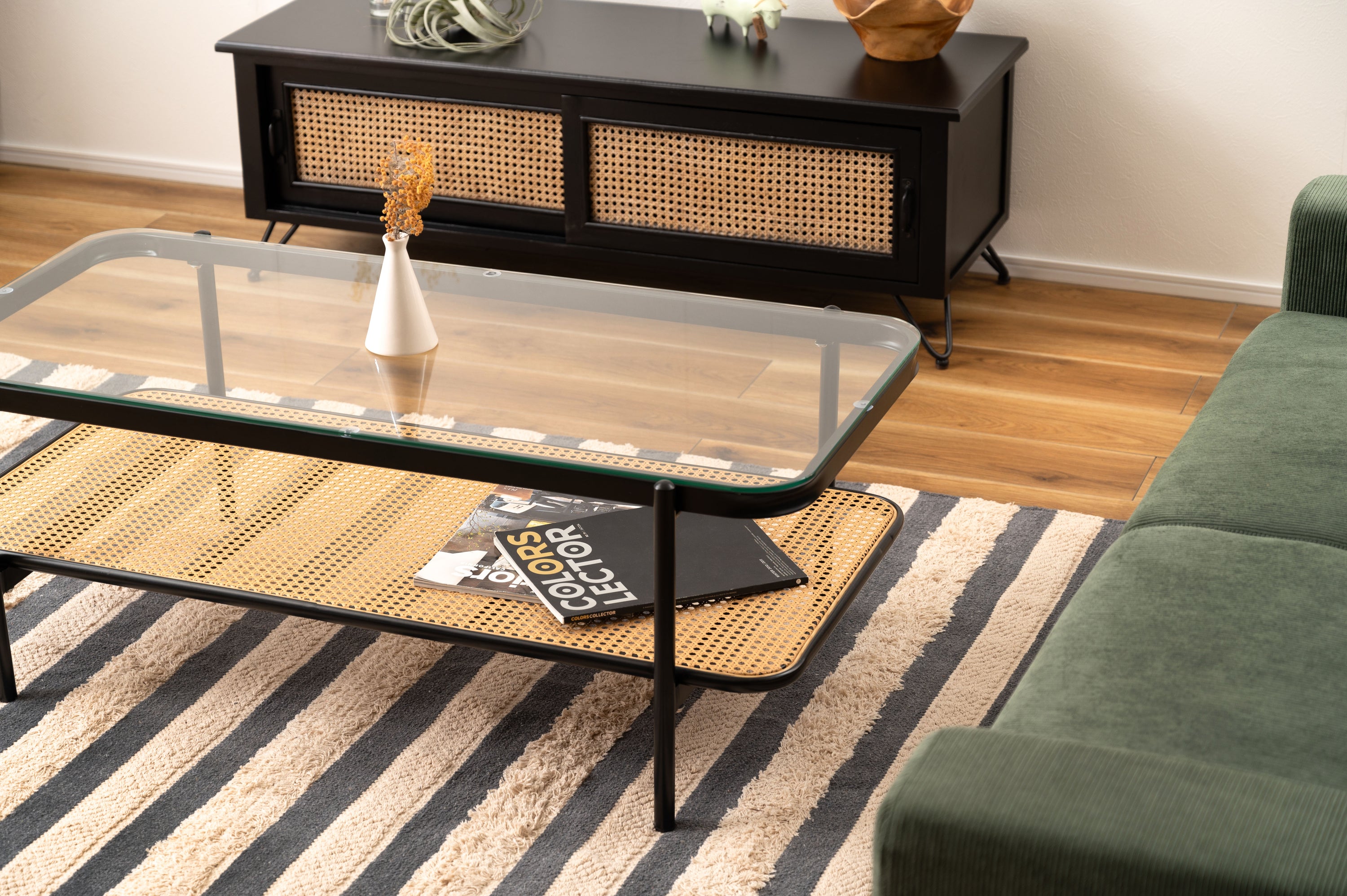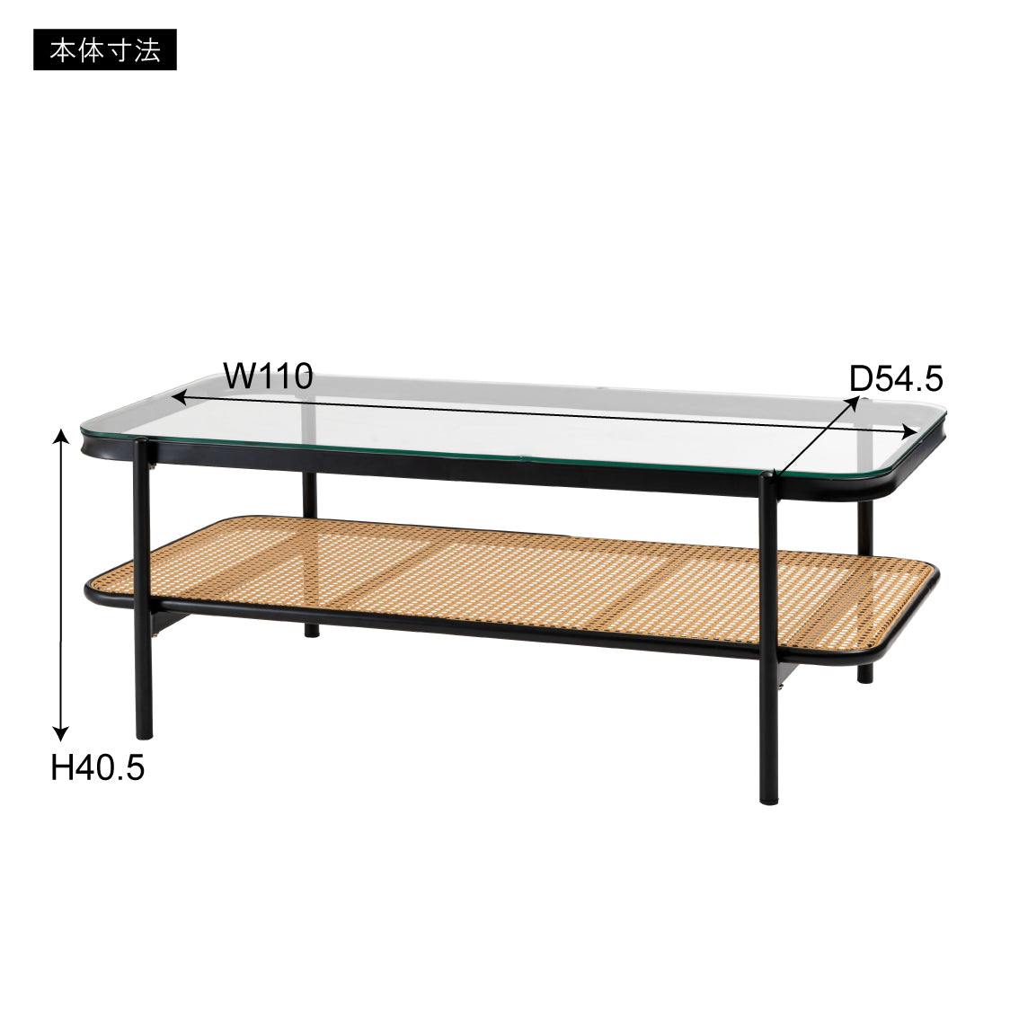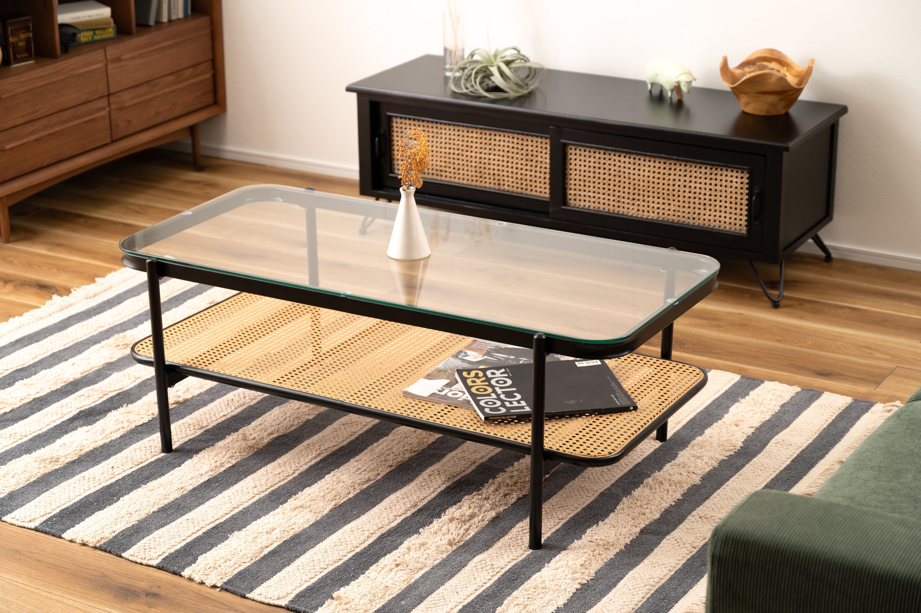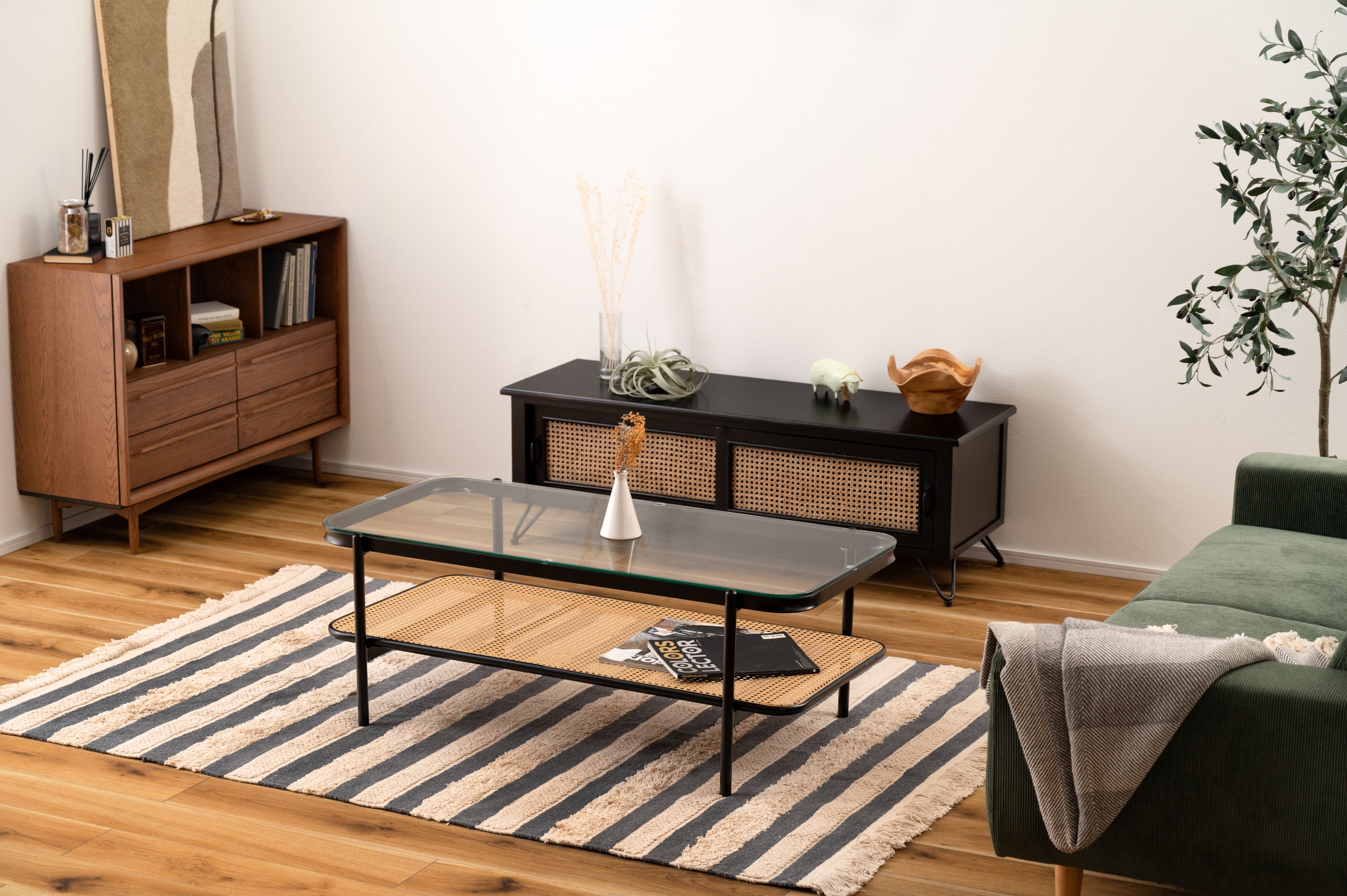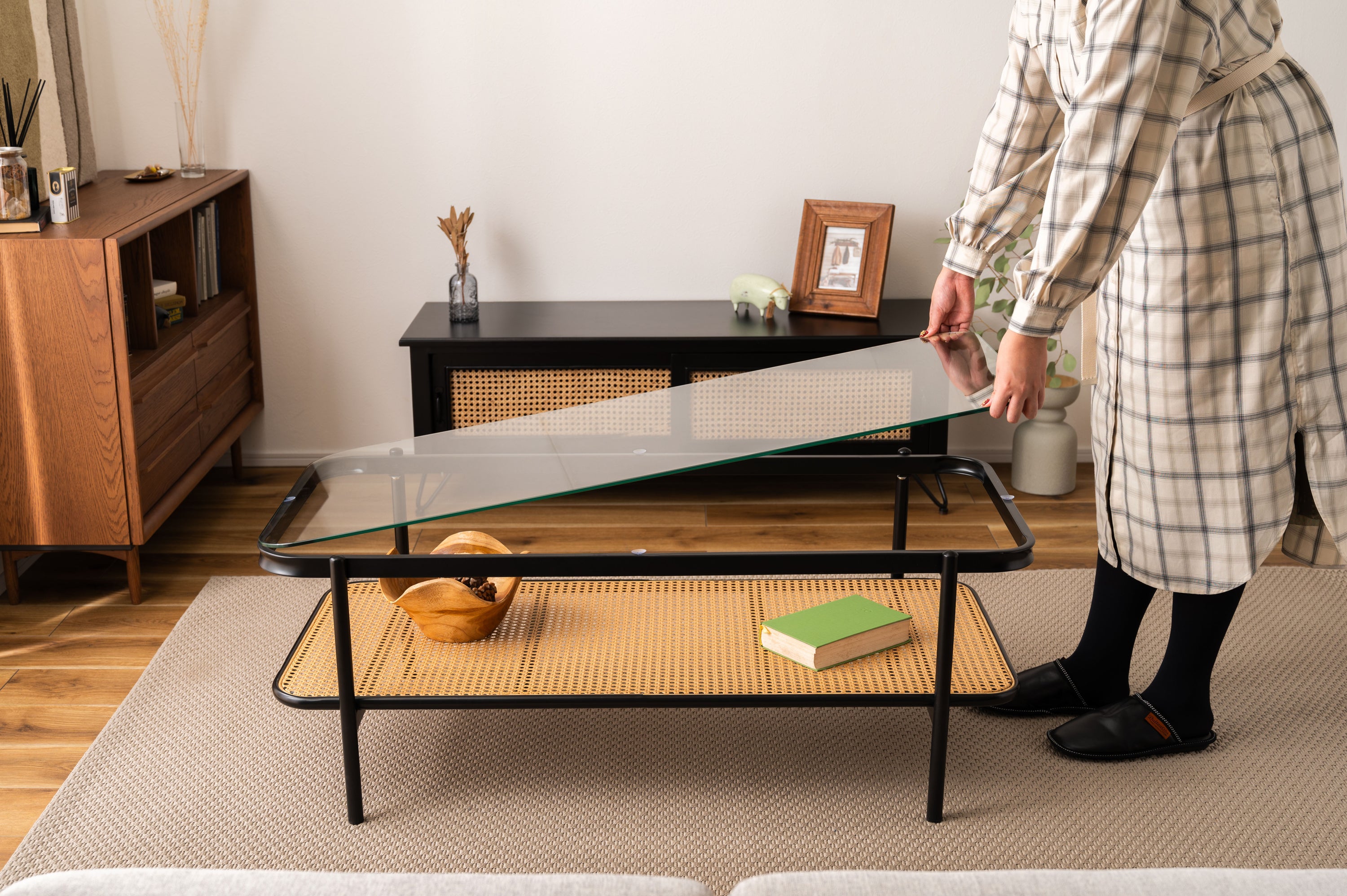 ブラックフレームと人工ラタンを組み合わせた、スタイリッシュさと温かみを兼ね揃えたリビングテーブル。ガラス天板とラタン調のラックが広々とした空間を演出し、堅苦しさのないモダンな雰囲気を楽しむことができます。ガラス天板と透け感のあるラタンは、存在感を発揮しつつもスマートな印象。軽やかで開放的なデザインなので、置くだけで広々としたリビングルームへと変化。天板がガラス製のため、下のラック部分を上から見ることができ、お気に入りの小物や雑貨を配置することでお洒落なディスプレイに。天板下のラック部分は、自然な色合いのラタン調デザインを採用。ブラックフレームとガラスのスタイリッシュな組み合わせの中に、ナチュラルなぬくもりを与えてくれます。ガラス天板は厚さ6mmの強化ガラスを使用。通常のガラスよりも強度があり、万が一割れた場合でも鋭利にならず粉々に砕けるので、ケガをしにくく安心してご使用いただけます。ガラス天板のズレやぐらつきを防止するために4箇所の吸盤で固定。ガラス天板の取り外しも行いやすく、日々の掃除やお手入れも簡単。