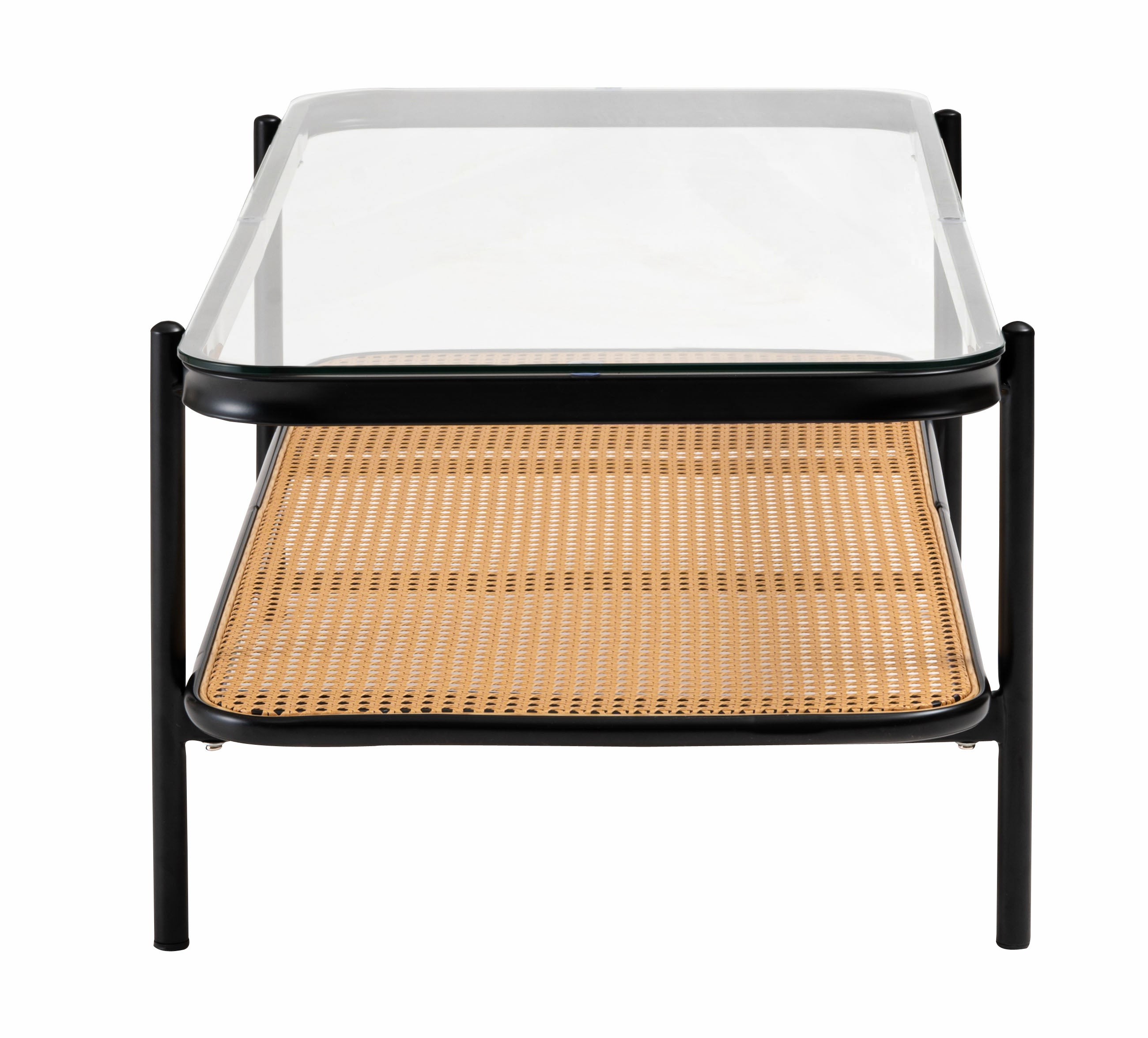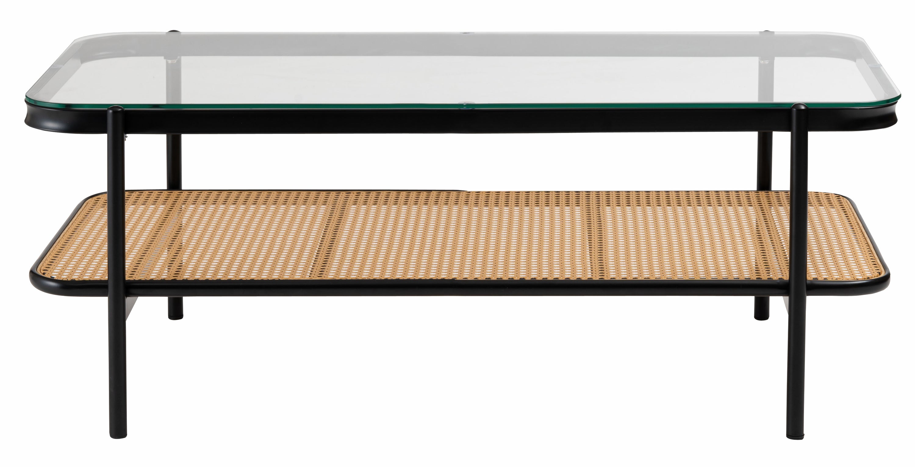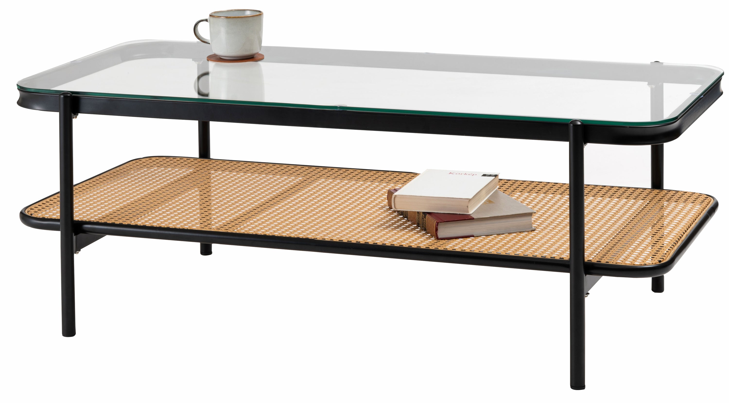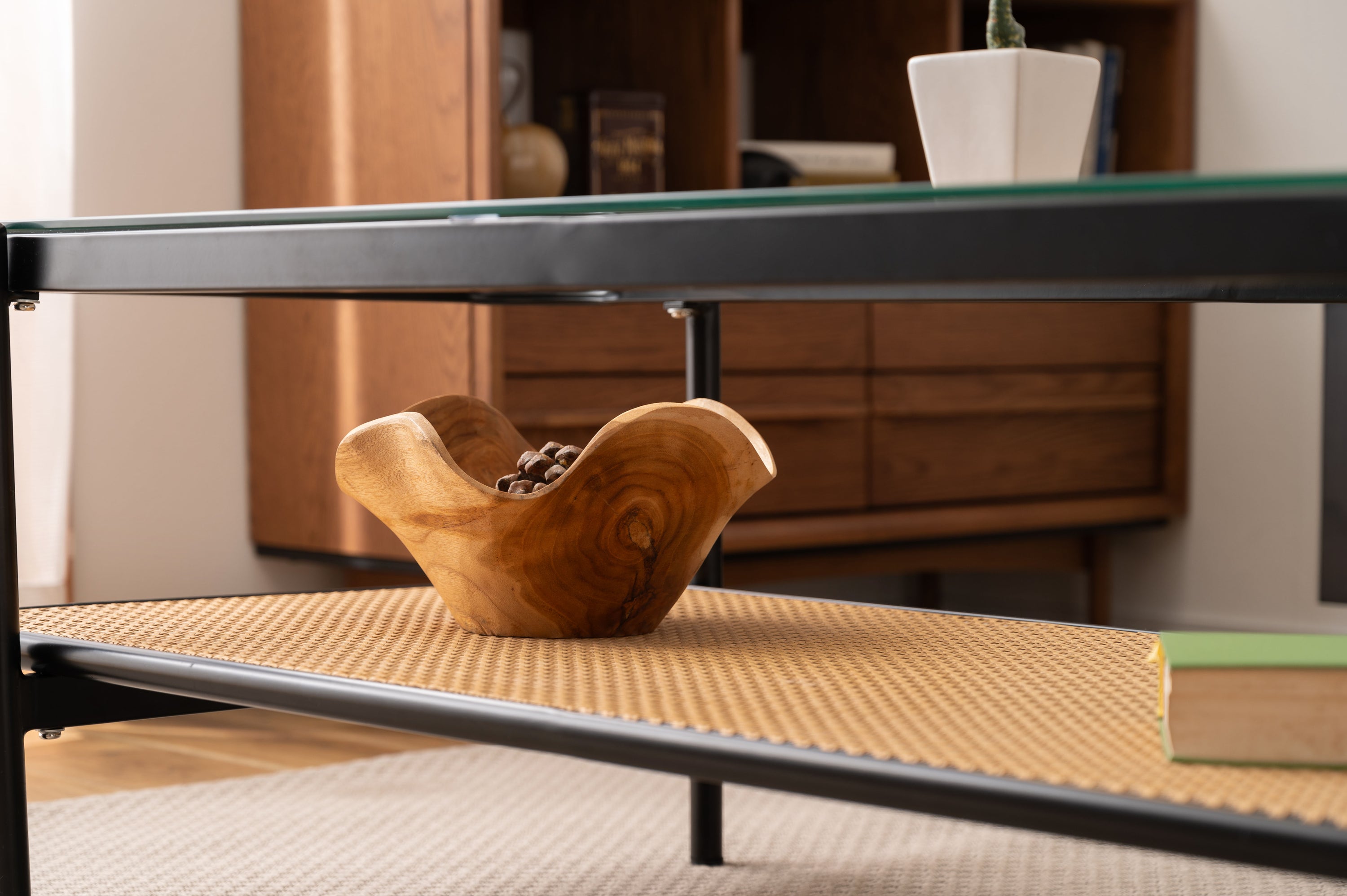 ブラックフレームと人工ラタンを組み合わせた、スタイリッシュさと温かみを兼ね揃えたリビングテーブル。ガラス天板とラタン調のラックが広々とした空間を演出し、堅苦しさのないモダンな雰囲気を楽しむことができます。ガラス天板と透け感のあるラタンは、存在感を発揮しつつもスマートな印象。軽やかで開放的なデザインなので、置くだけで広々としたリビングルームへと変化。天板がガラス製のため、下のラック部分を上から見ることができ、お気に入りの小物や雑貨を配置することでお洒落なディスプレイに。天板下のラック部分は、自然な色合いのラタン調デザインを採用。ブラックフレームとガラスのスタイリッシュな組み合わせの中に、ナチュラルなぬくもりを与えてくれます。ガラス天板は厚さ6mmの強化ガラスを使用。通常のガラスよりも強度があり、万が一割れた場合でも鋭利にならず粉々に砕けるので、ケガをしにくく安心してご使用いただけます。ガラス天板のズレやぐらつきを防止するために4箇所の吸盤で固定。ガラス天板の取り外しも行いやすく、日々の掃除やお手入れも簡単。