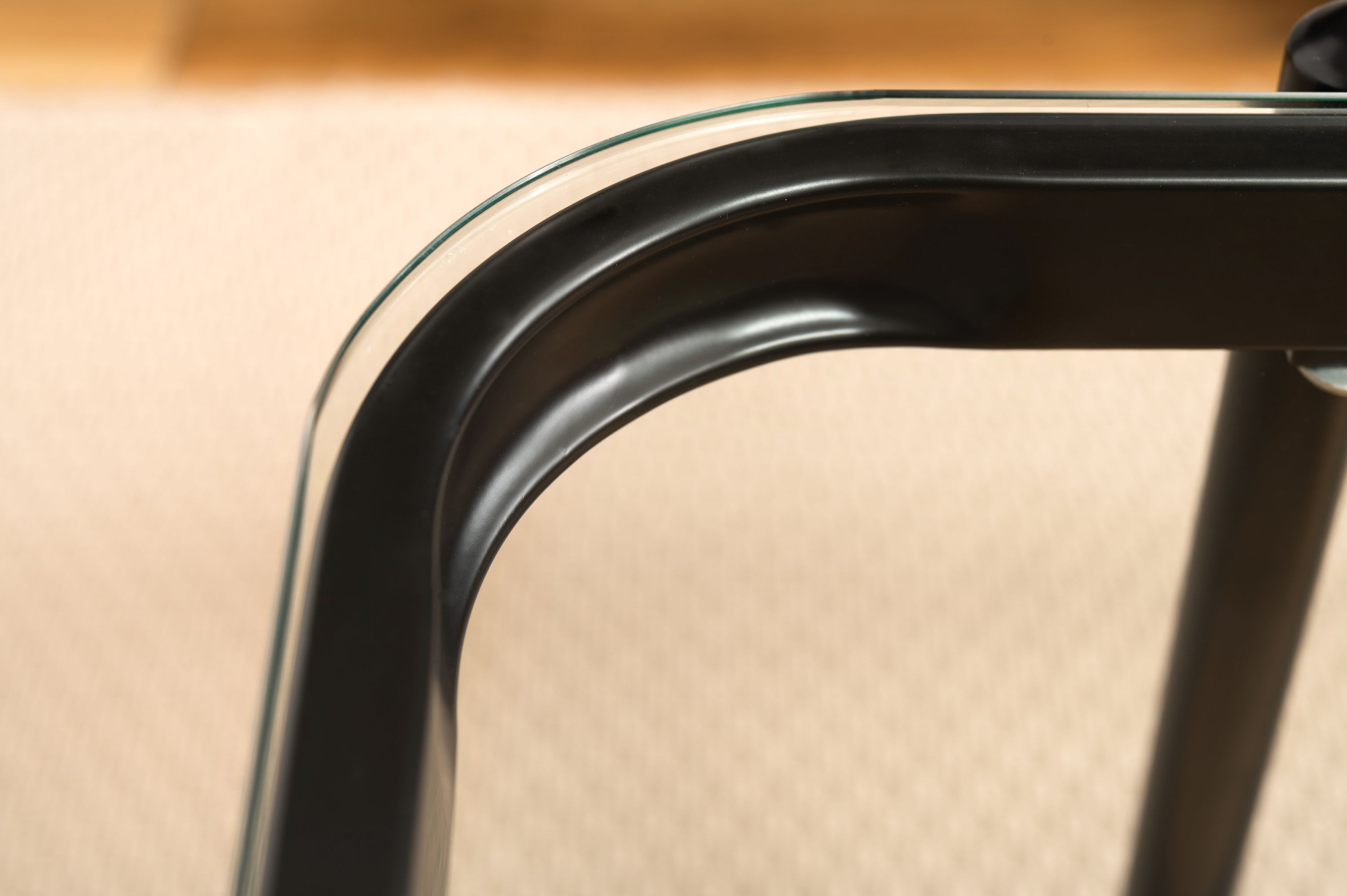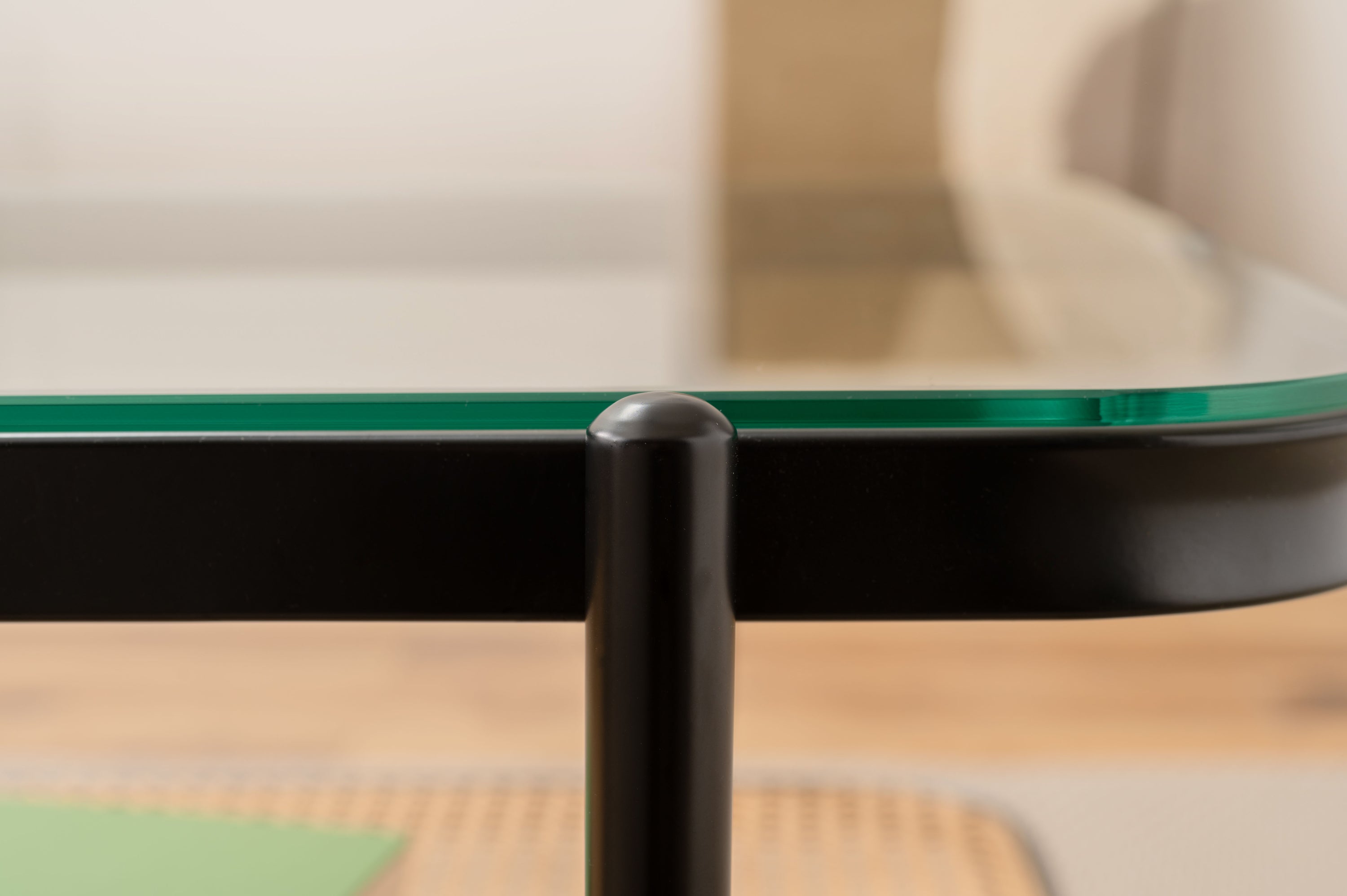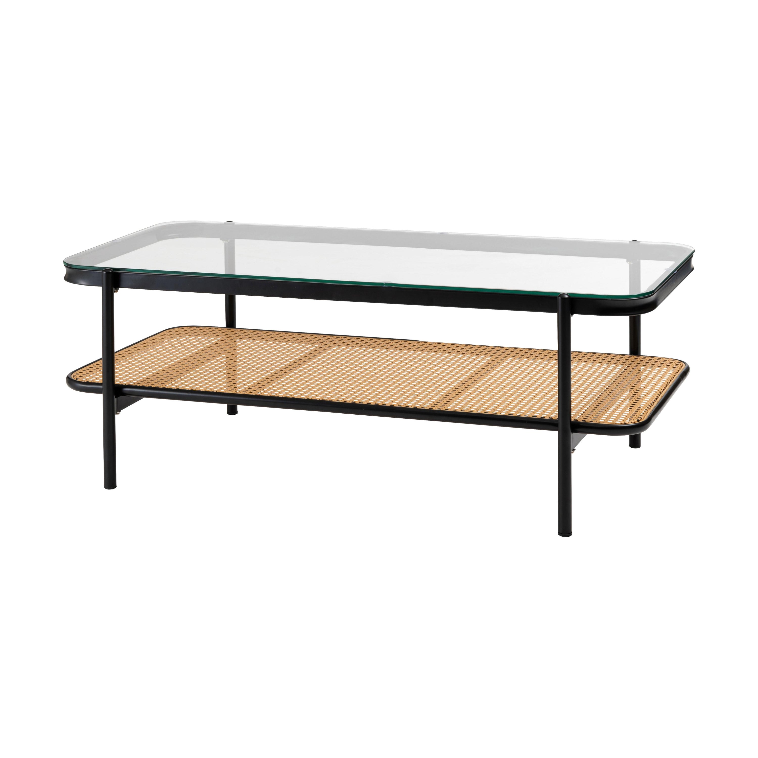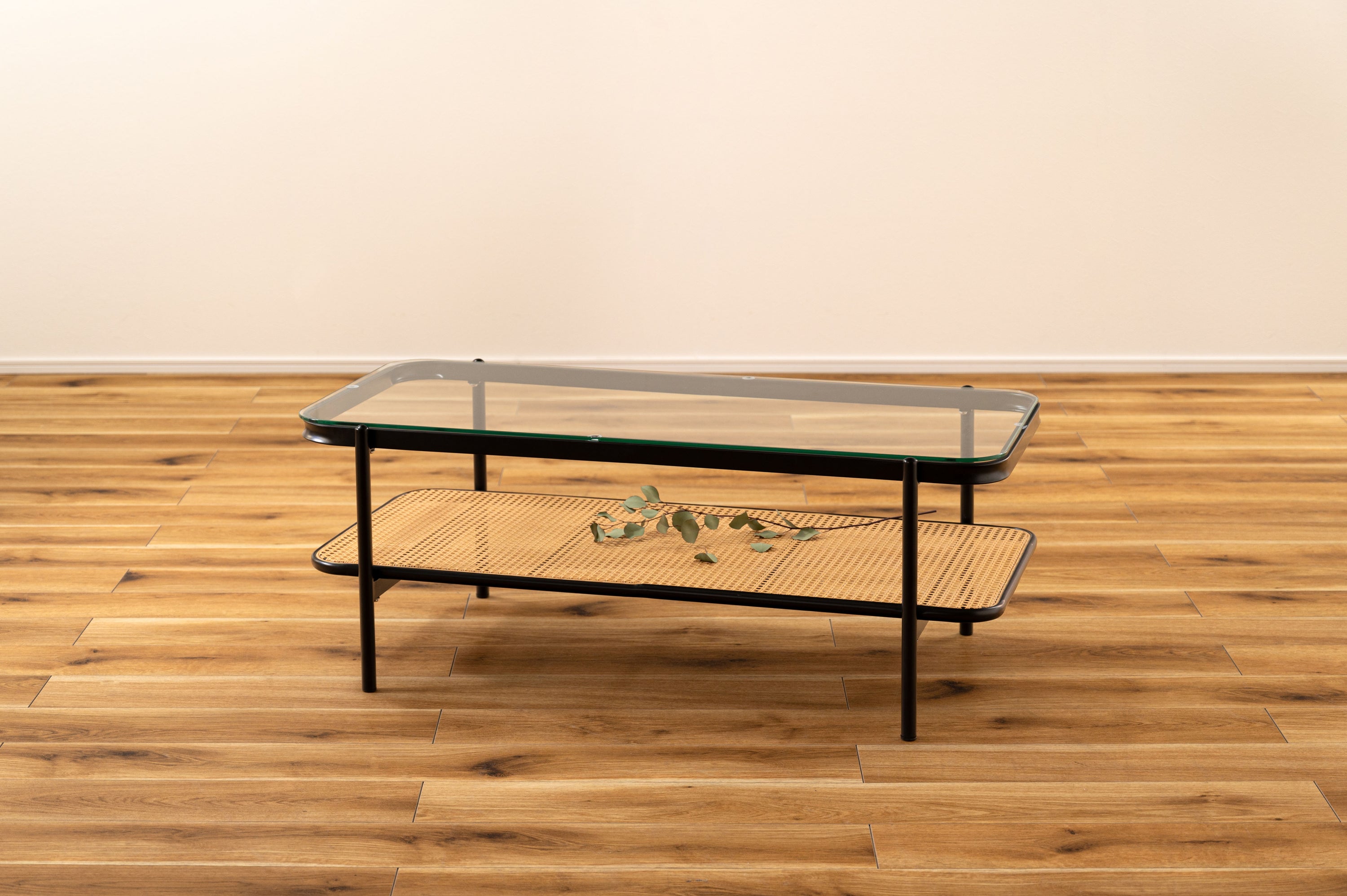 ブラックフレームと人工ラタンを組み合わせた、スタイリッシュさと温かみを兼ね揃えたリビングテーブル。ガラス天板とラタン調のラックが広々とした空間を演出し、堅苦しさのないモダンな雰囲気を楽しむことができます。ガラス天板と透け感のあるラタンは、存在感を発揮しつつもスマートな印象。軽やかで開放的なデザインなので、置くだけで広々としたリビングルームへと変化。天板がガラス製のため、下のラック部分を上から見ることができ、お気に入りの小物や雑貨を配置することでお洒落なディスプレイに。天板下のラック部分は、自然な色合いのラタン調デザインを採用。ブラックフレームとガラスのスタイリッシュな組み合わせの中に、ナチュラルなぬくもりを与えてくれます。ガラス天板は厚さ6mmの強化ガラスを使用。通常のガラスよりも強度があり、万が一割れた場合でも鋭利にならず粉々に砕けるので、ケガをしにくく安心してご使用いただけます。ガラス天板のズレやぐらつきを防止するために4箇所の吸盤で固定。ガラス天板の取り外しも行いやすく、日々の掃除やお手入れも簡単。