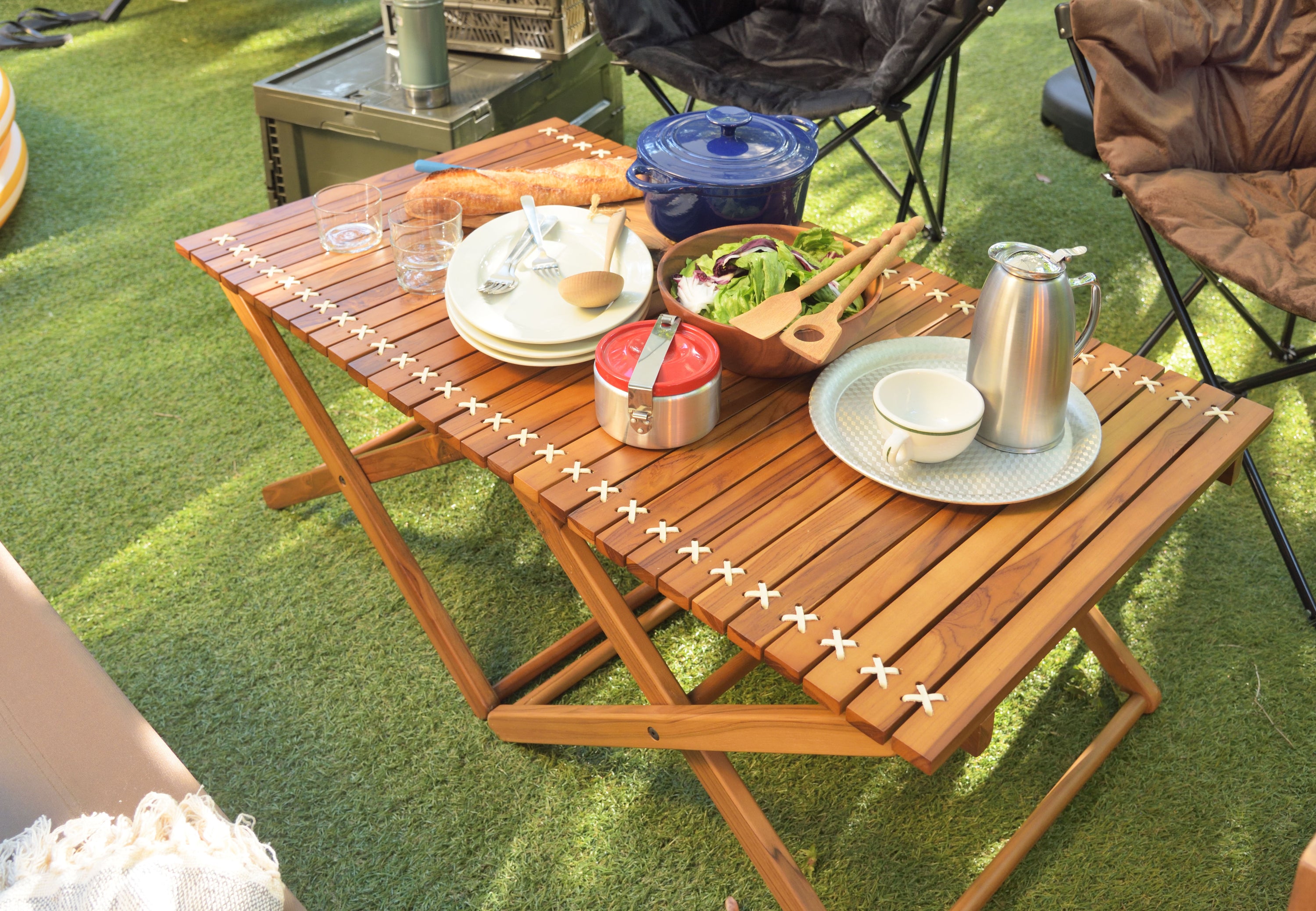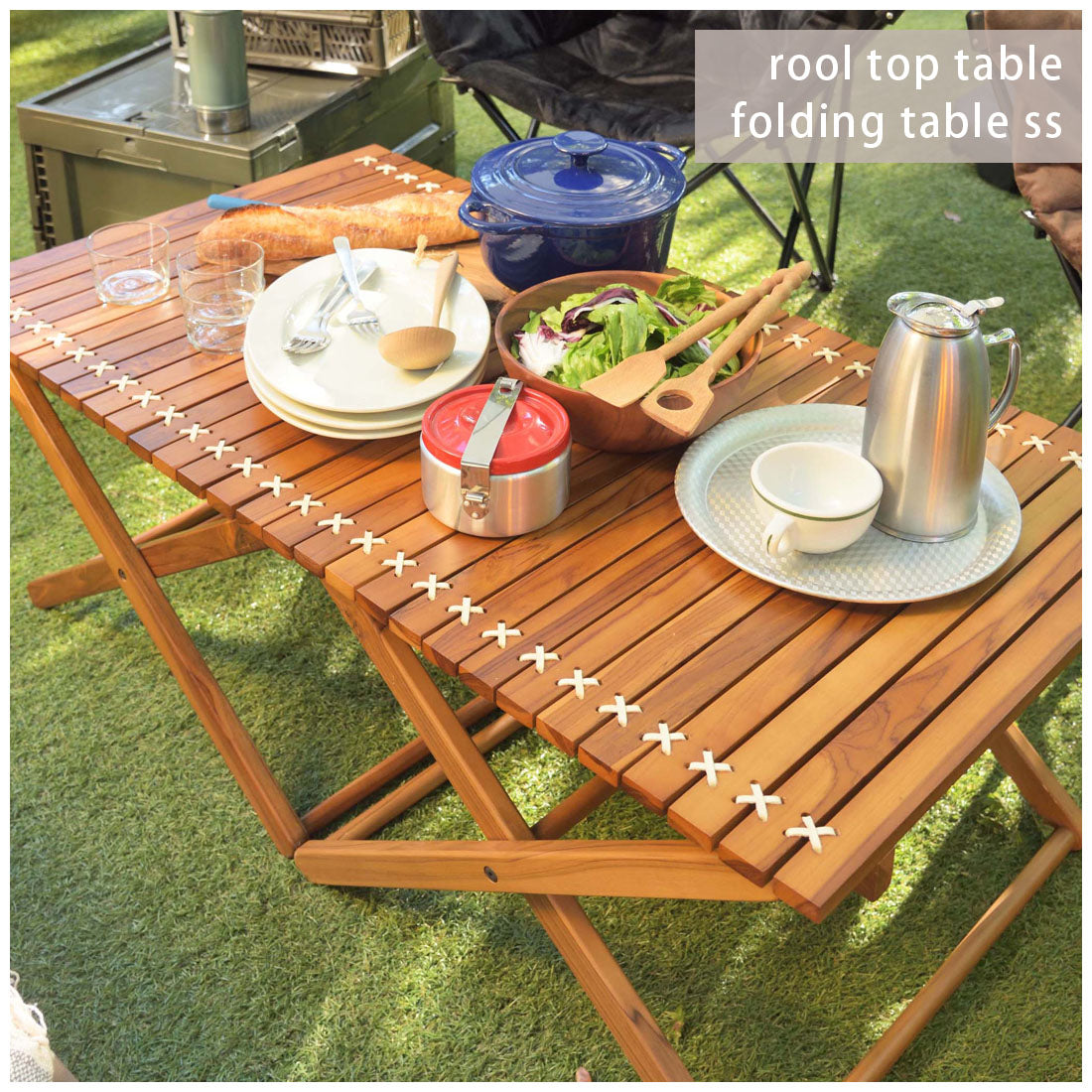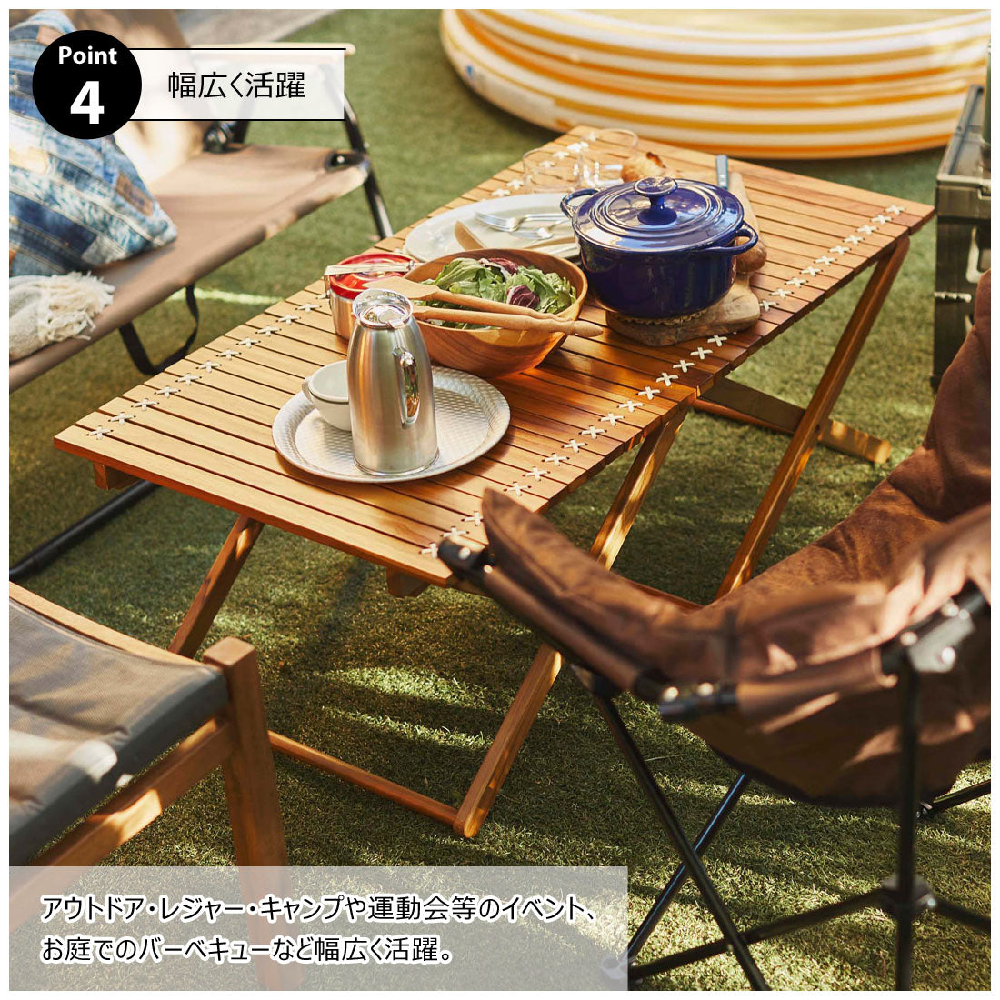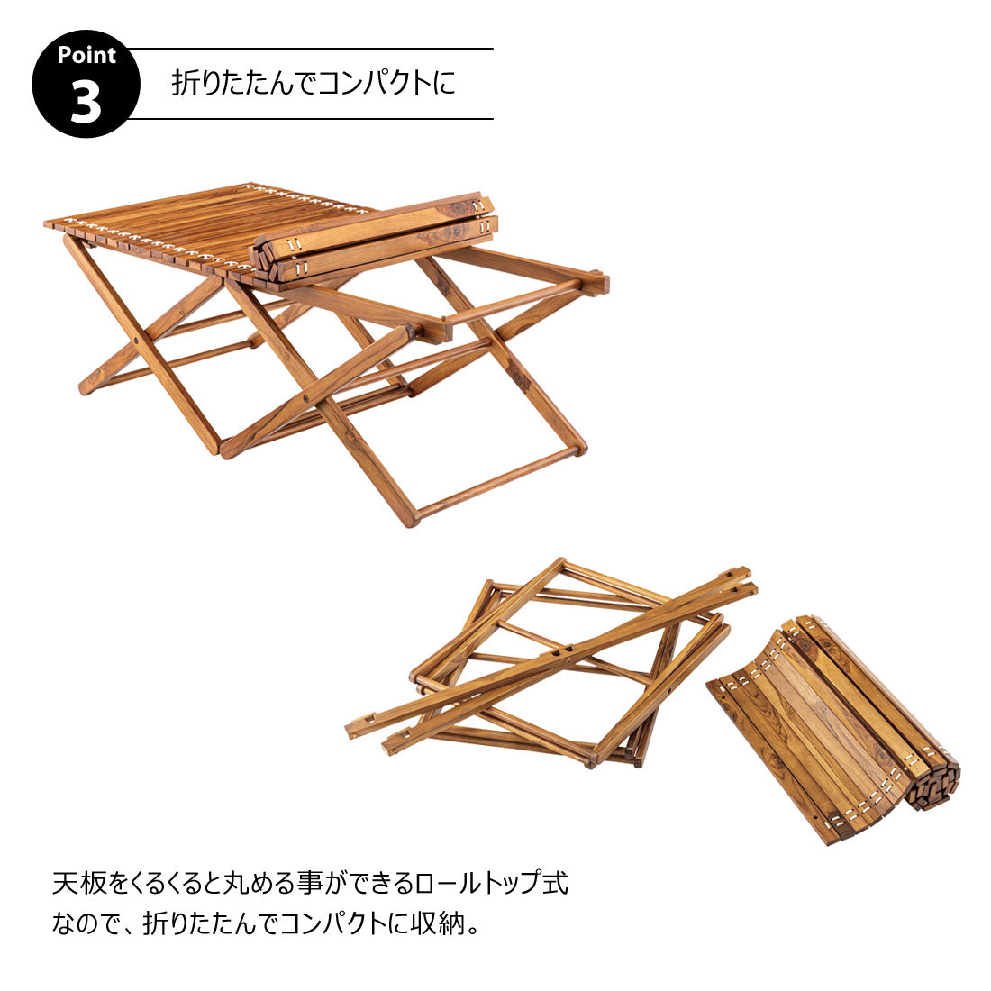 小さく収納・持ち運びが簡単なロールトップテーブル。チーク材と本革の風合いはインテリアとしても最適。 ロール天板のつなぎ目には贅沢に本革を使用。デザインとしてもオシャレなアクセントに。 工具不要でフレームを広げ補強バーを取り付け天板を設置するだけの簡単組立式。 天板をくるくると丸める事ができるロールトップ式なので、折りたたんでコンパクトに収納。 アウトドア・レジャー・キャンプや運動会等のイベント、お庭でのバーベキューなど幅広く活躍。
