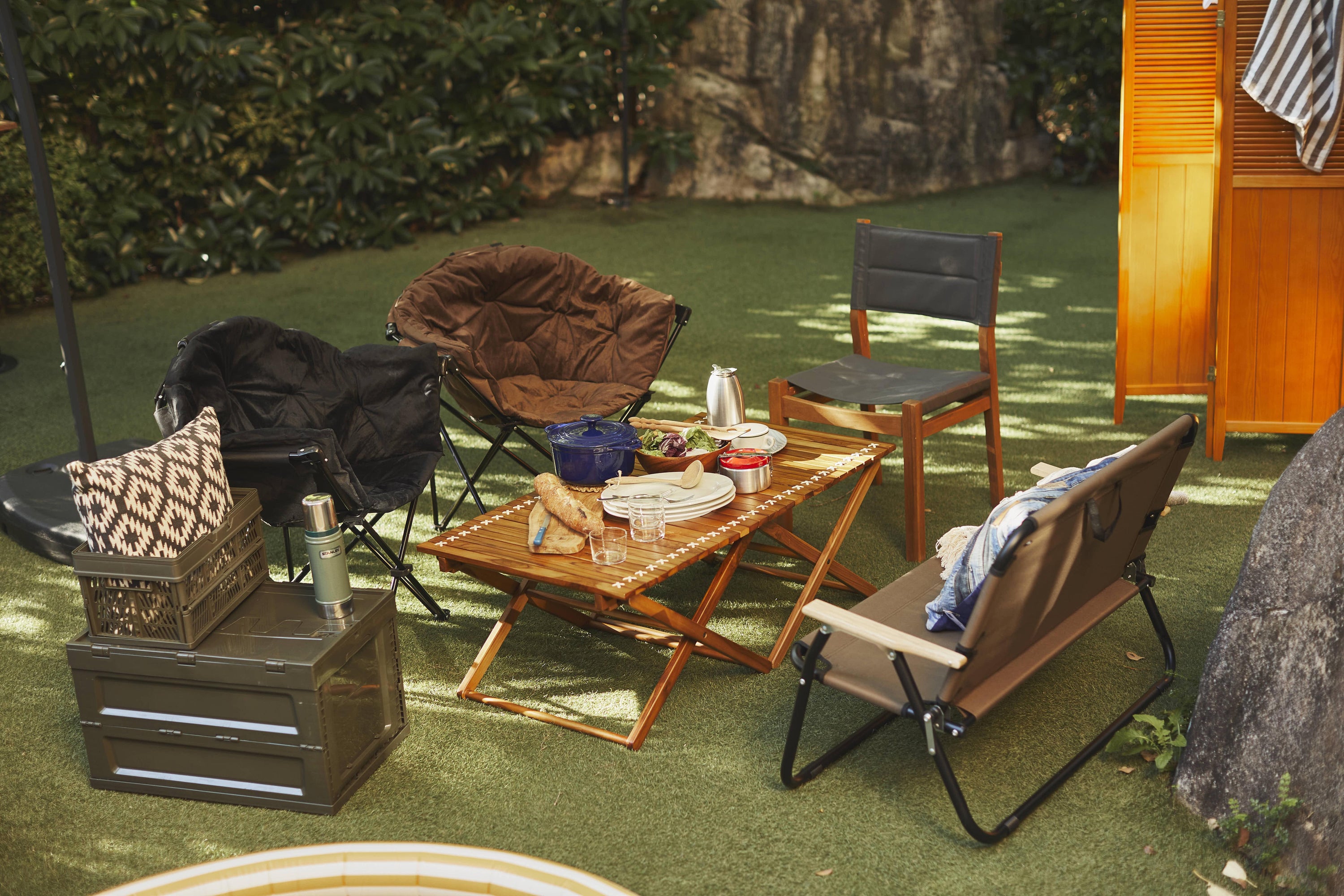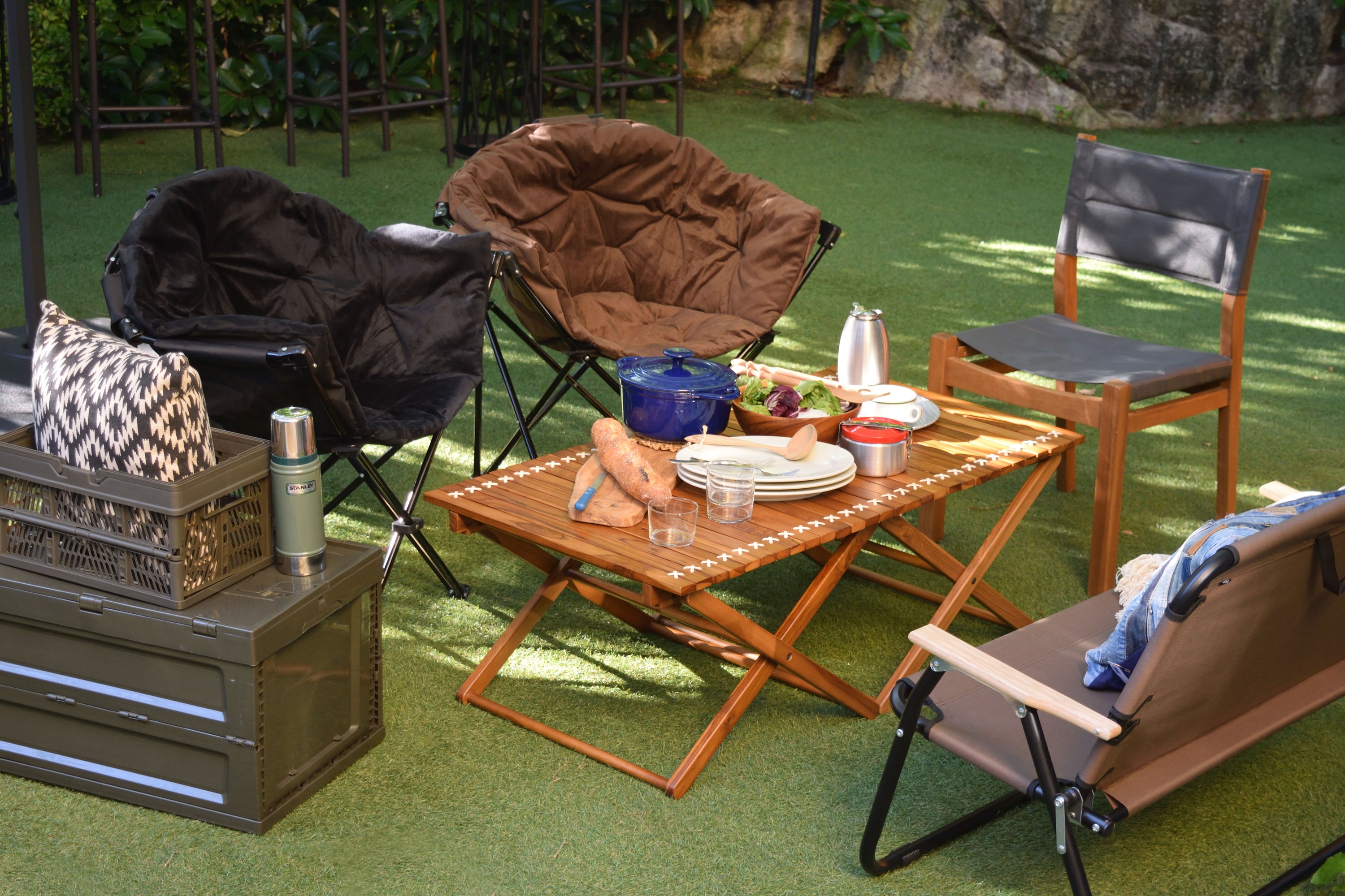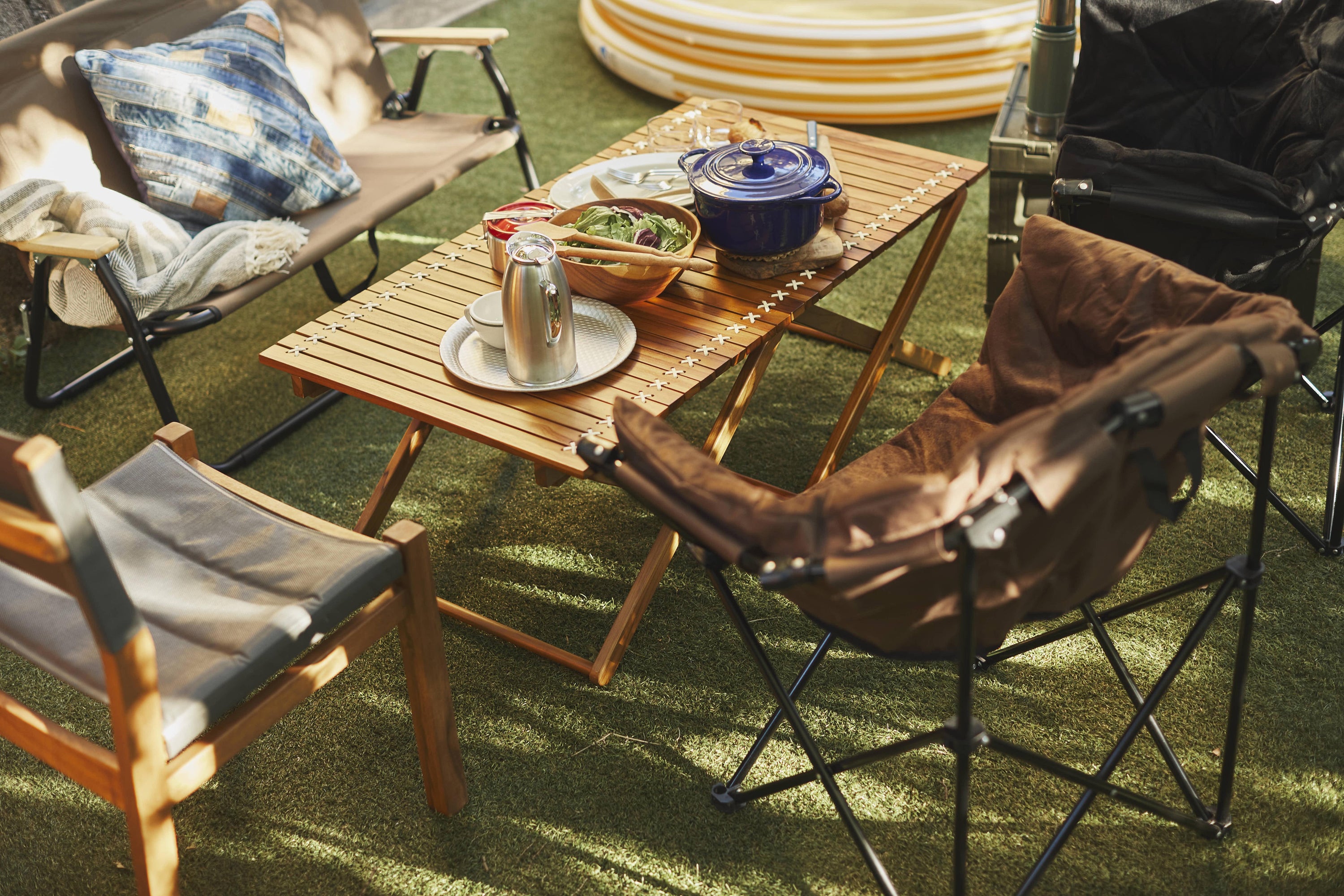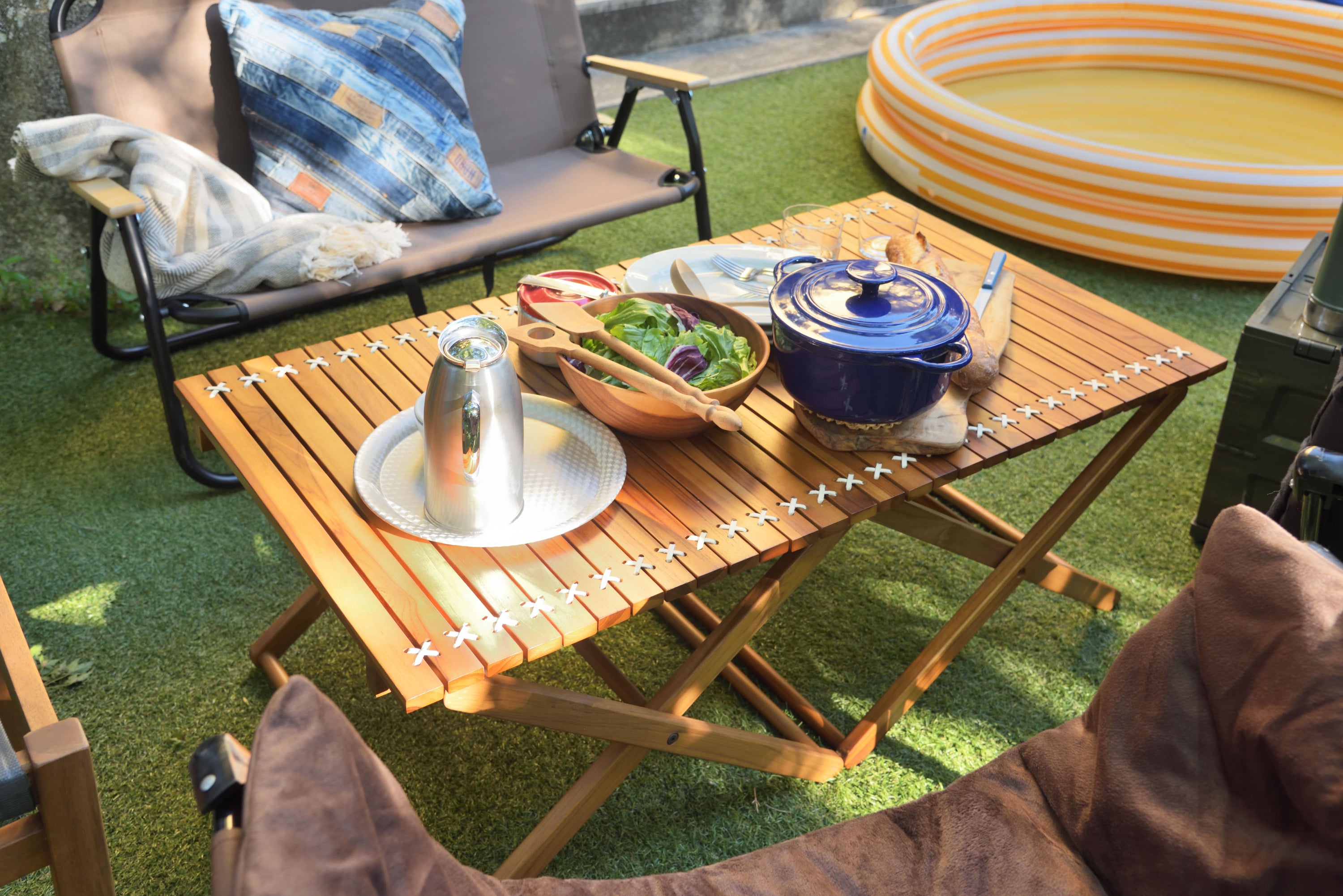 小さく収納・持ち運びが簡単なロールトップテーブル。チーク材と本革の風合いはインテリアとしても最適。 ロール天板のつなぎ目には贅沢に本革を使用。デザインとしてもオシャレなアクセントに。 工具不要でフレームを広げ補強バーを取り付け天板を設置するだけの簡単組立式。 天板をくるくると丸める事ができるロールトップ式なので、折りたたんでコンパクトに収納。 アウトドア・レジャー・キャンプや運動会等のイベント、お庭でのバーベキューなど幅広く活躍。