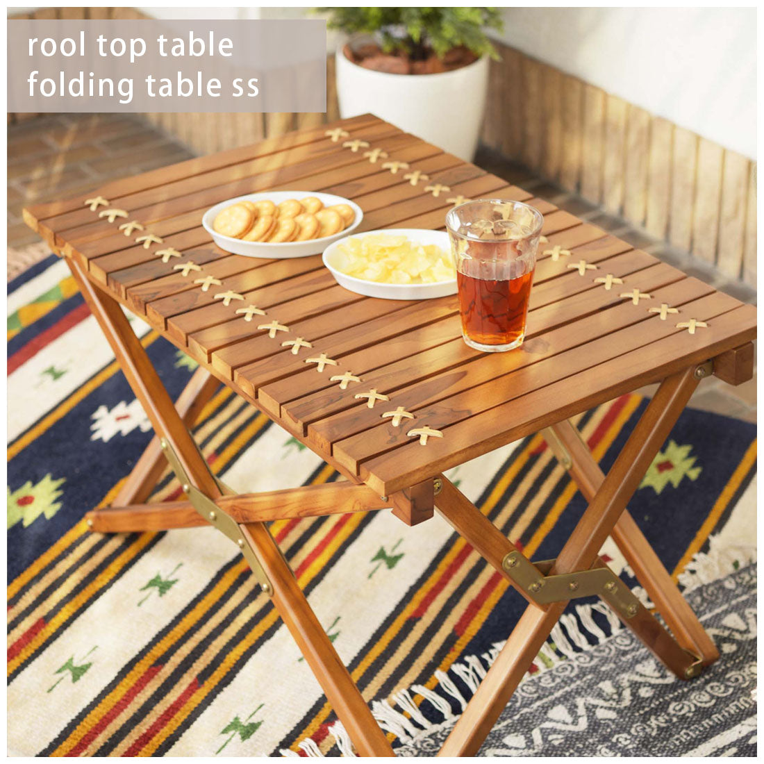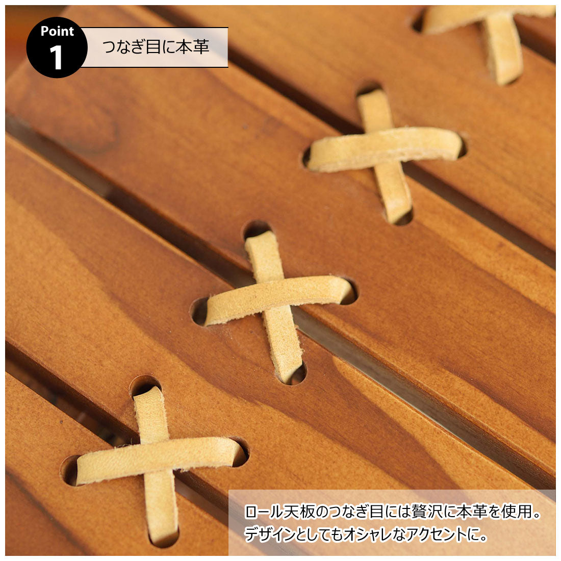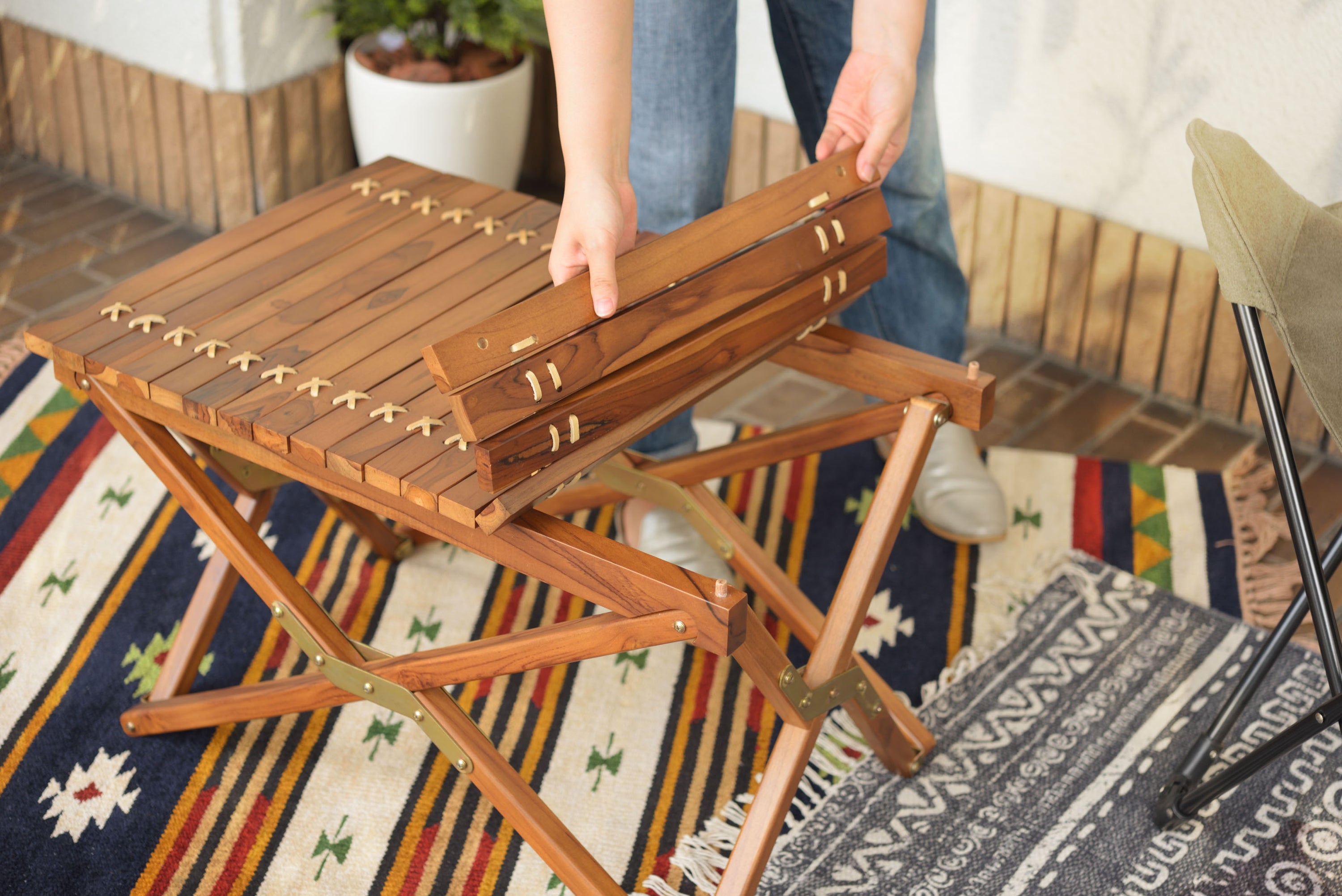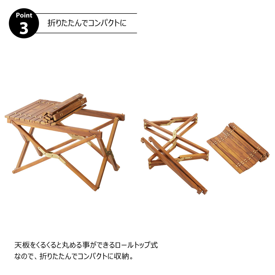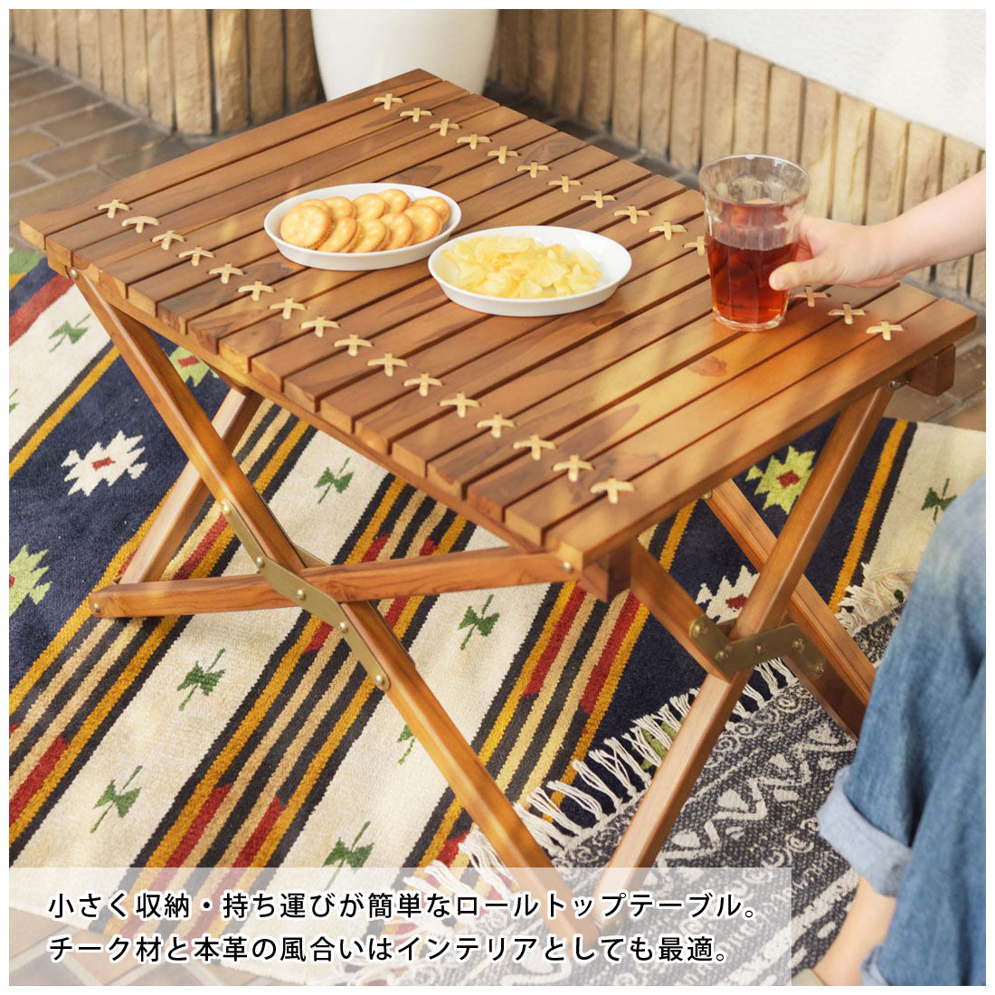 小さく収納・持ち運びが簡単なロールトップテーブル。チーク材と本革の風合いはインテリアとしても最適。 ロール天板のつなぎ目には贅沢に本革を使用。デザインとしてもオシャレなアクセントに。 工具不要で、フレームを広げ補強バーを取り付け天板を設置するだけの簡単組立式。 天板をくるくると丸める事ができるロールトップ式なので、折りたたんでコンパクトに収納。 アウトドア・レジャー・キャンプや運動会等のイベント、お庭でのバーベキューなど幅広く活躍。