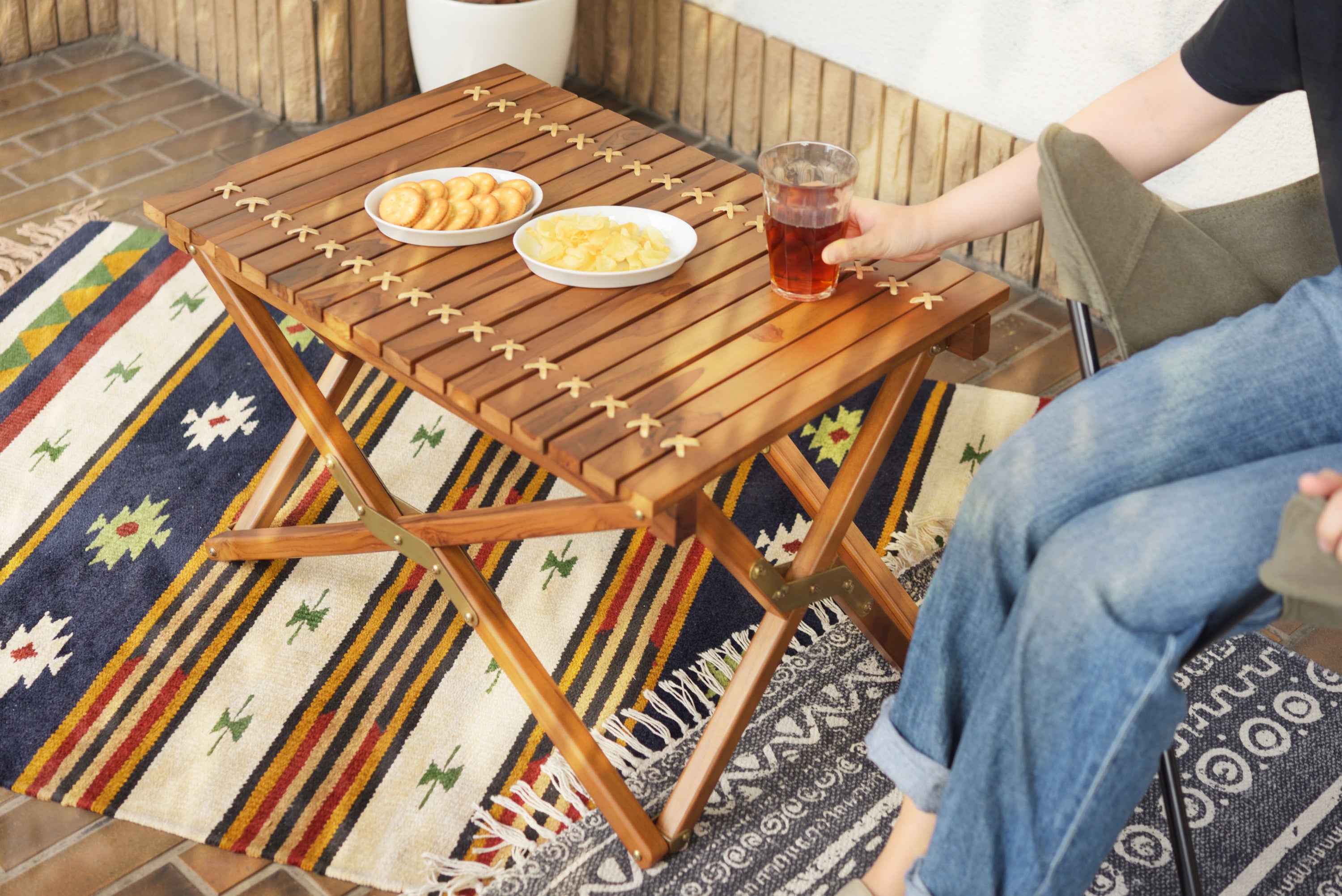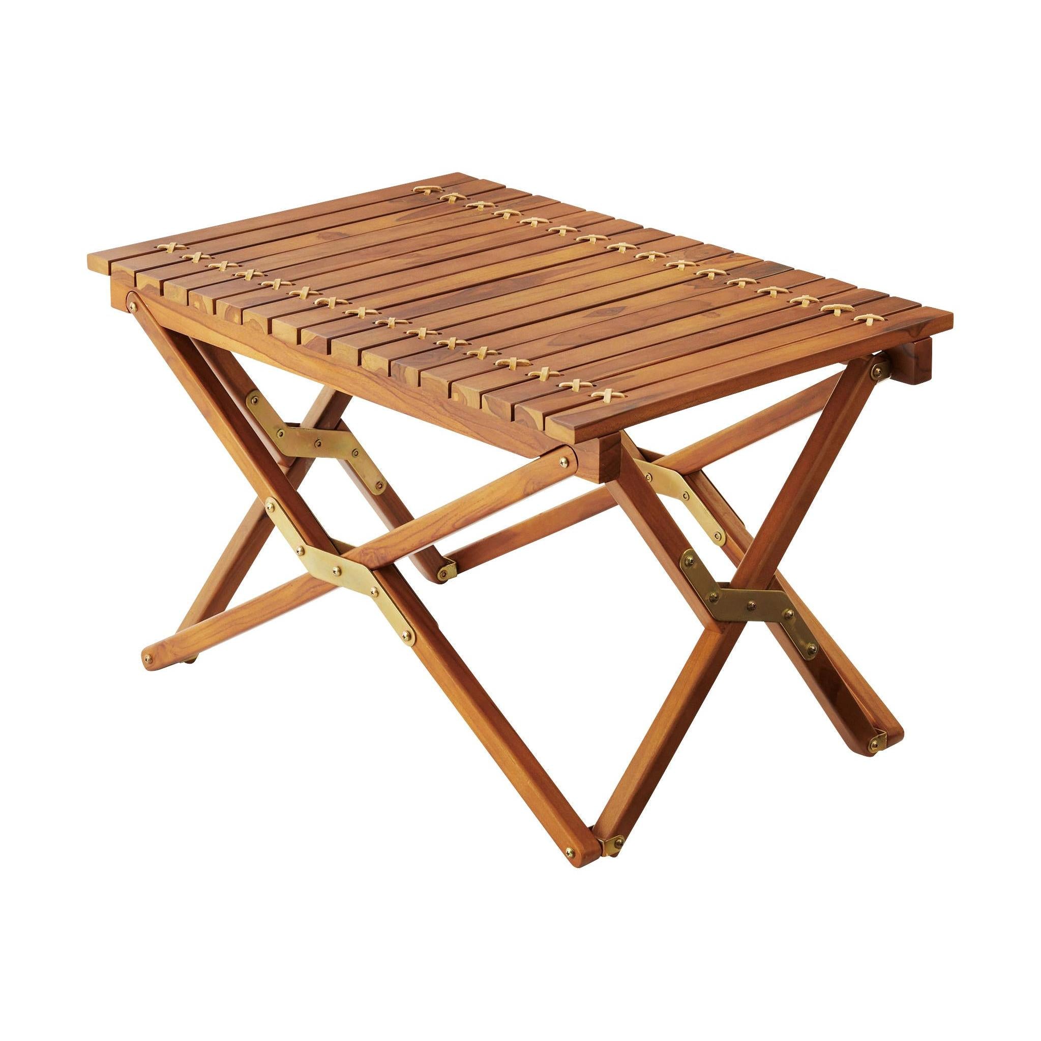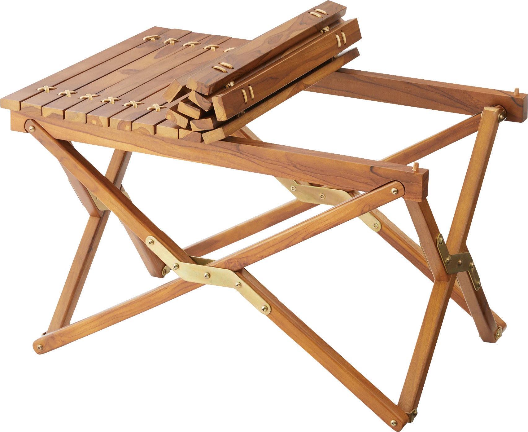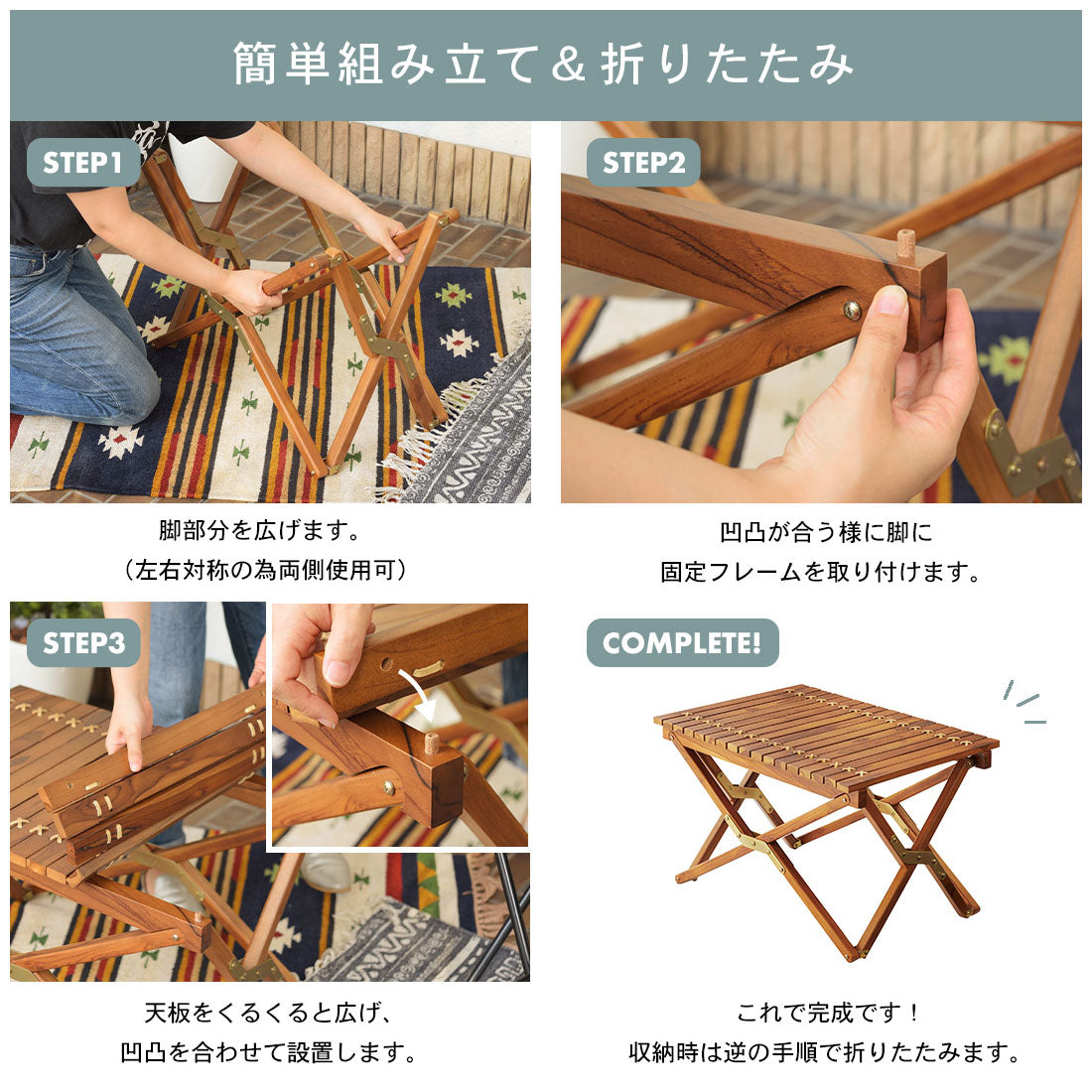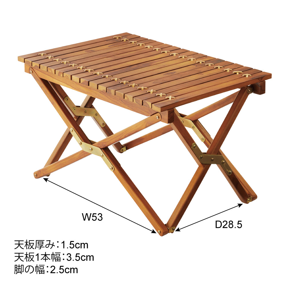 小さく収納・持ち運びが簡単なロールトップテーブル。チーク材と本革の風合いはインテリアとしても最適。 ロール天板のつなぎ目には贅沢に本革を使用。デザインとしてもオシャレなアクセントに。 工具不要で、フレームを広げ補強バーを取り付け天板を設置するだけの簡単組立式。 天板をくるくると丸める事ができるロールトップ式なので、折りたたんでコンパクトに収納。 アウトドア・レジャー・キャンプや運動会等のイベント、お庭でのバーベキューなど幅広く活躍。