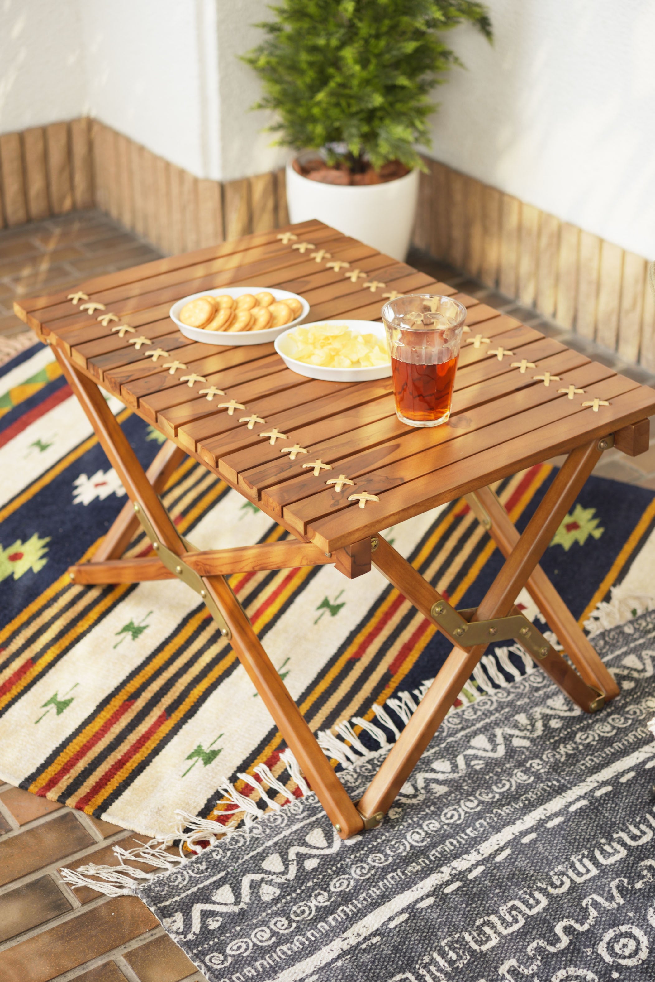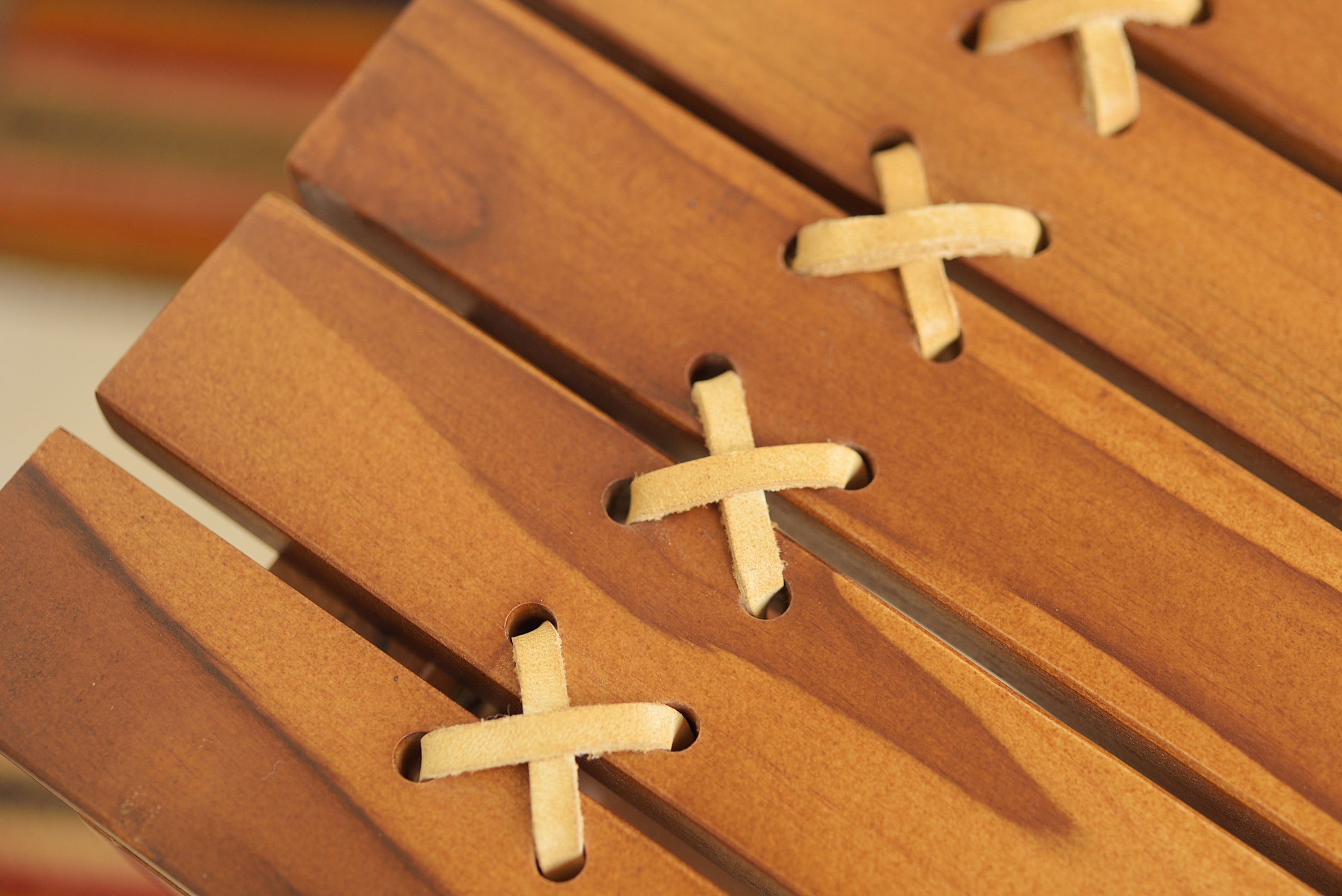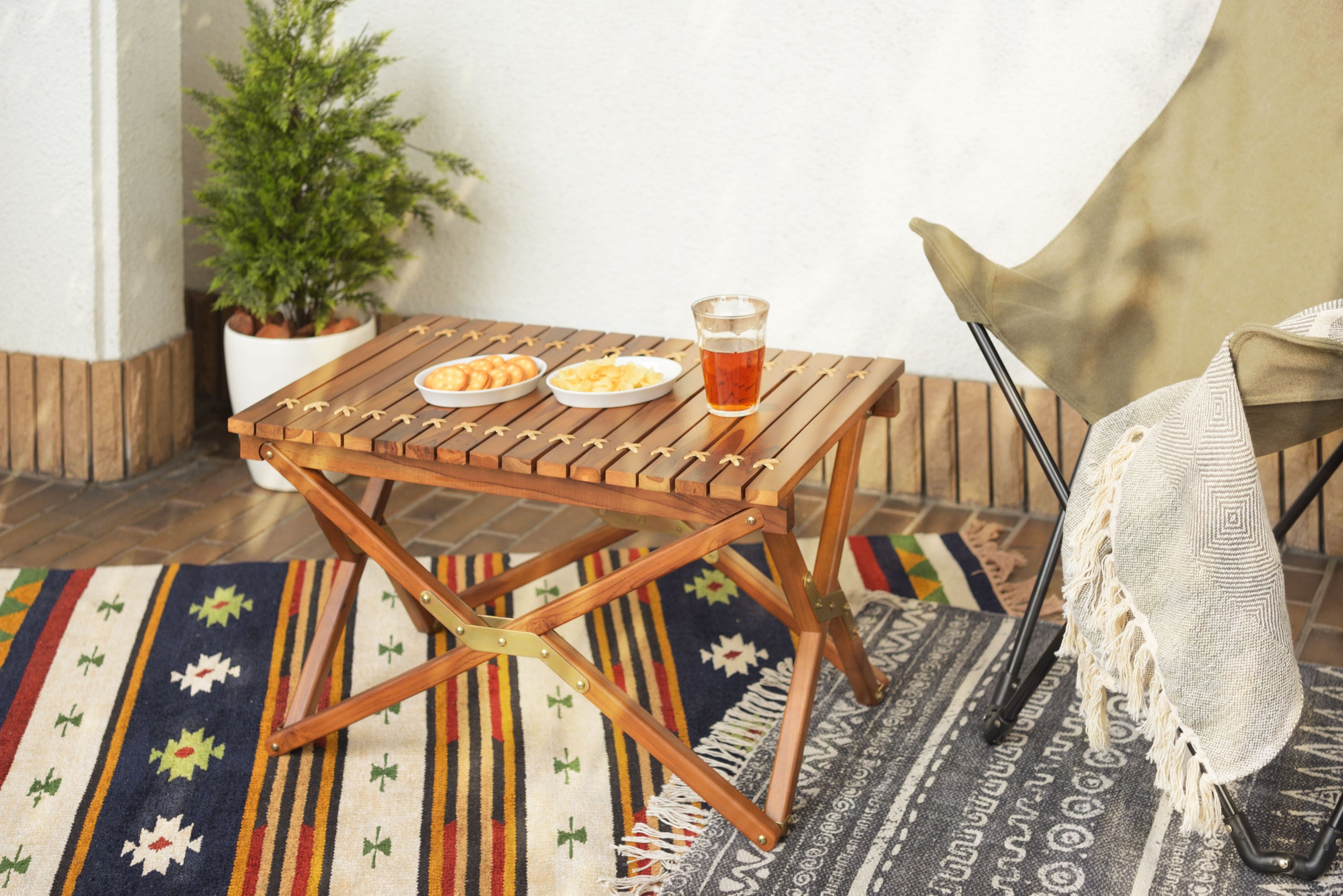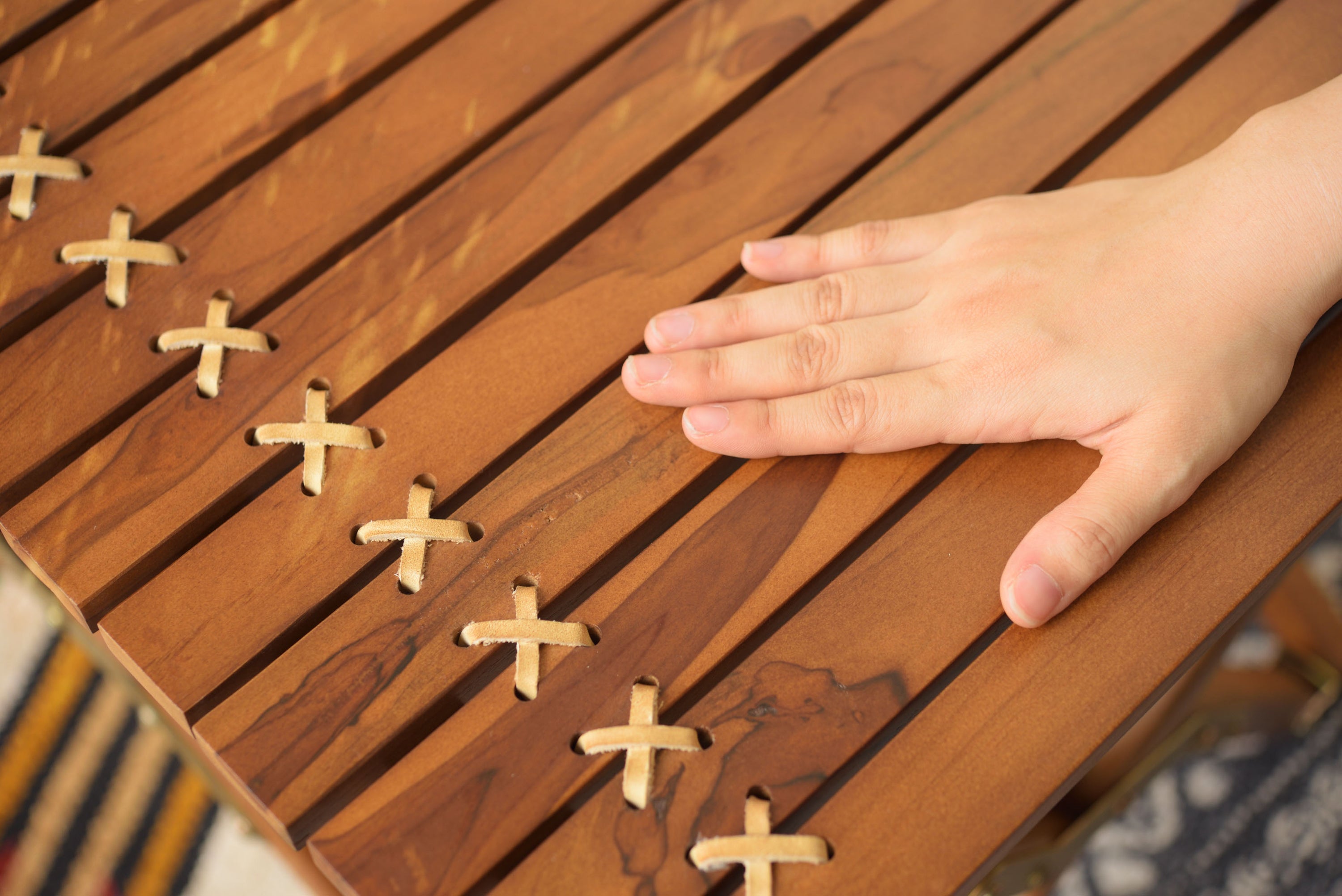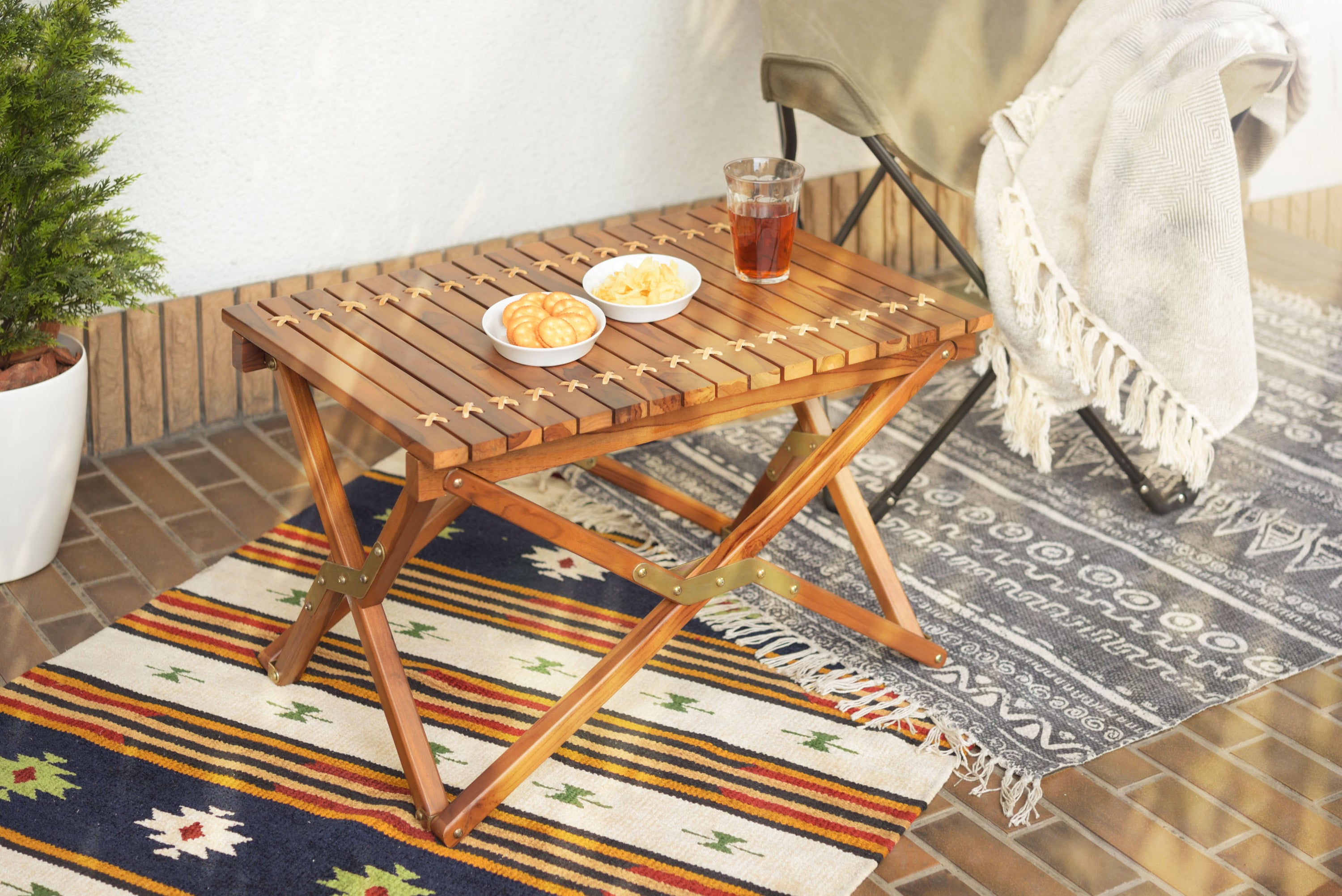 小さく収納・持ち運びが簡単なロールトップテーブル。チーク材と本革の風合いはインテリアとしても最適。 ロール天板のつなぎ目には贅沢に本革を使用。デザインとしてもオシャレなアクセントに。 工具不要で、フレームを広げ補強バーを取り付け天板を設置するだけの簡単組立式。 天板をくるくると丸める事ができるロールトップ式なので、折りたたんでコンパクトに収納。 アウトドア・レジャー・キャンプや運動会等のイベント、お庭でのバーベキューなど幅広く活躍。