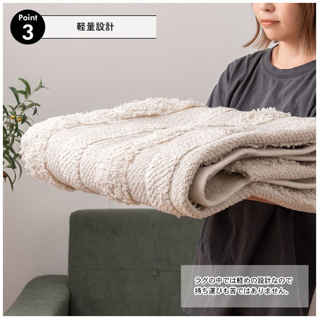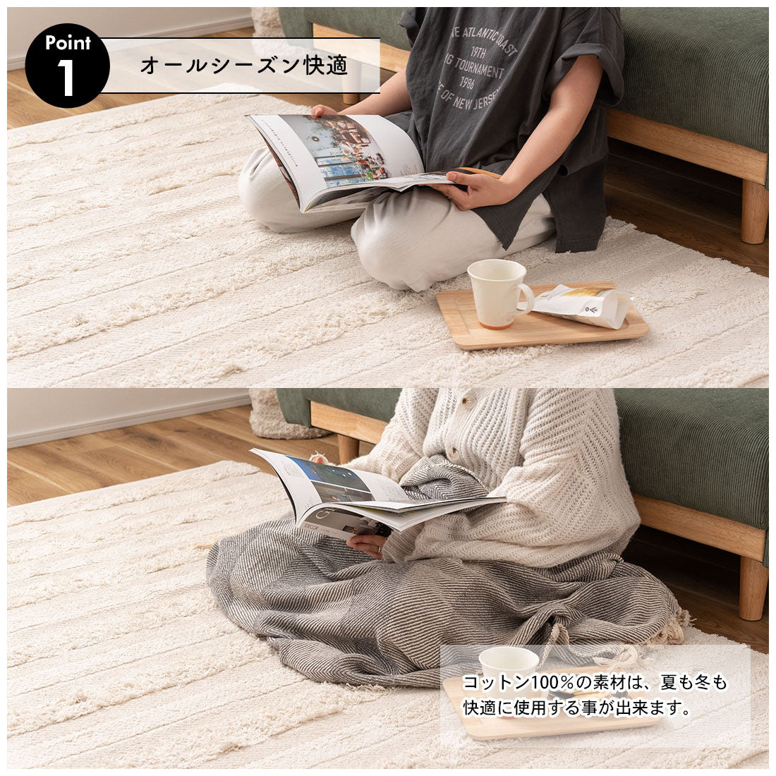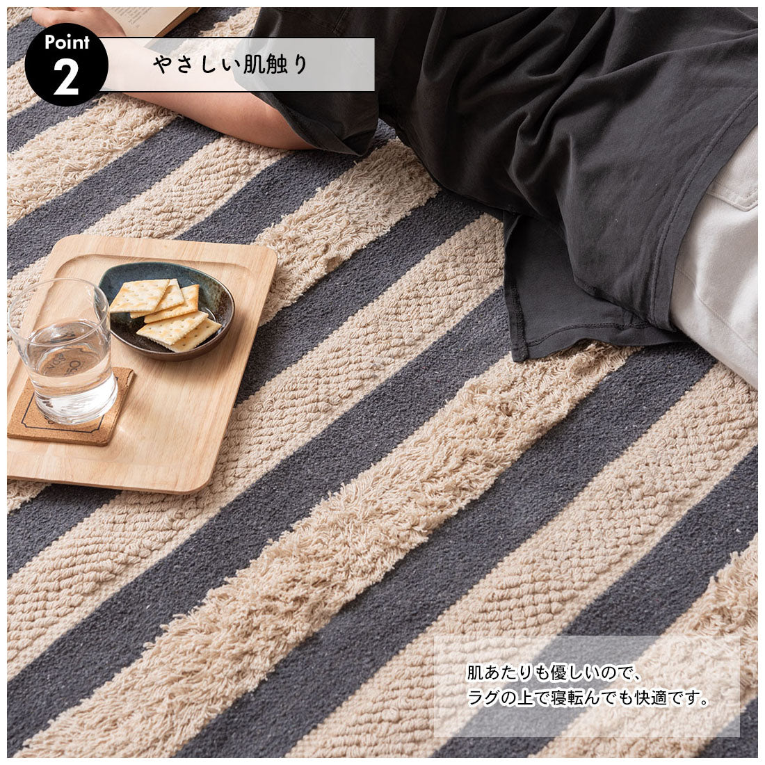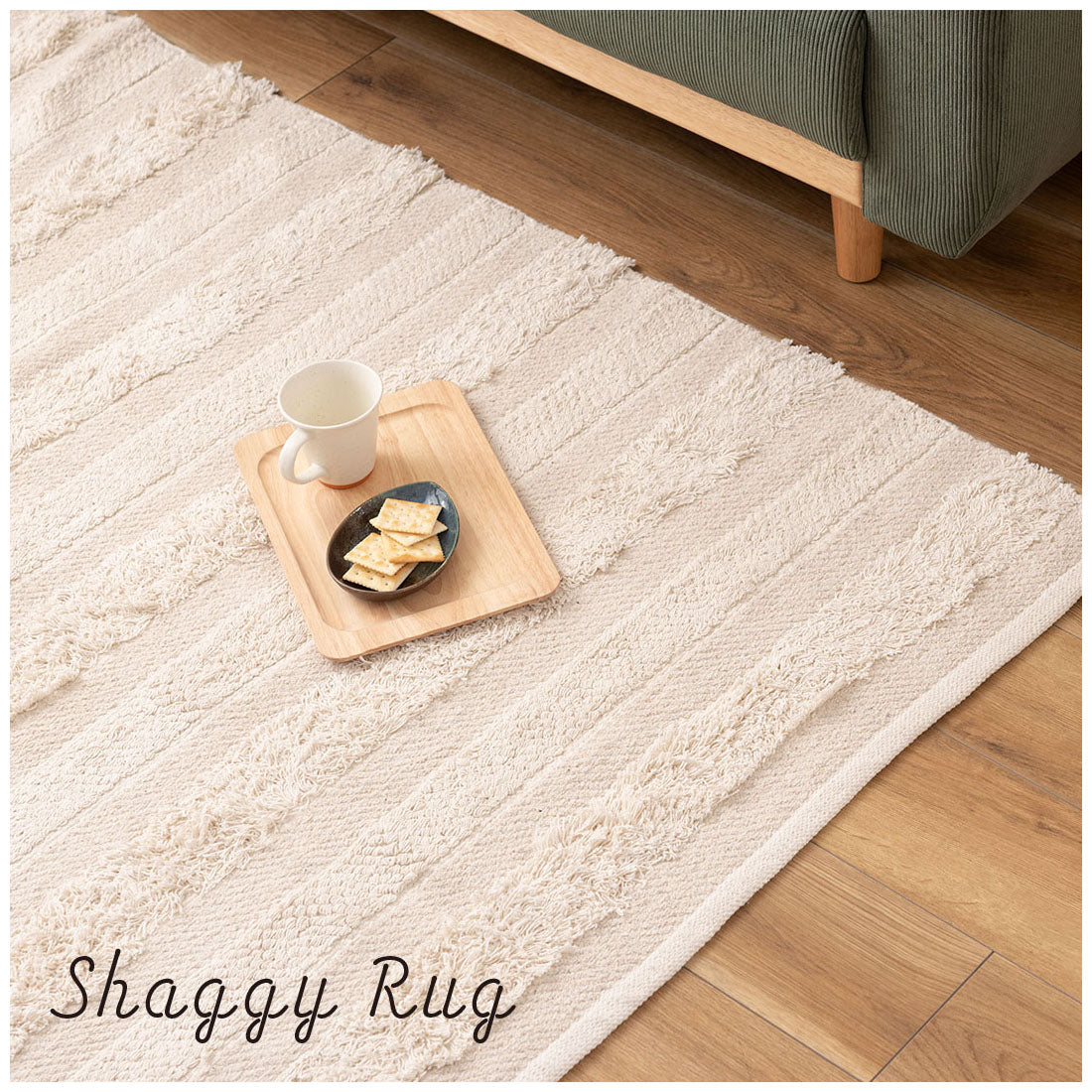 ナチュラルコットンを手織りで丁寧に作られたシャギーマット。 手触りの良いふわふわとした風合いが特徴。 織り方を変えて表現された太目のストライプは優しいお部屋のインテリアを演出。 コットン100%の素材は、夏も冬も快適に使用する事が出来ます。 肌あたりも優しいので、ラグの上で寝転んでも快適。 ラグの中では軽めの設計なので、持ち運びも苦ではありません。