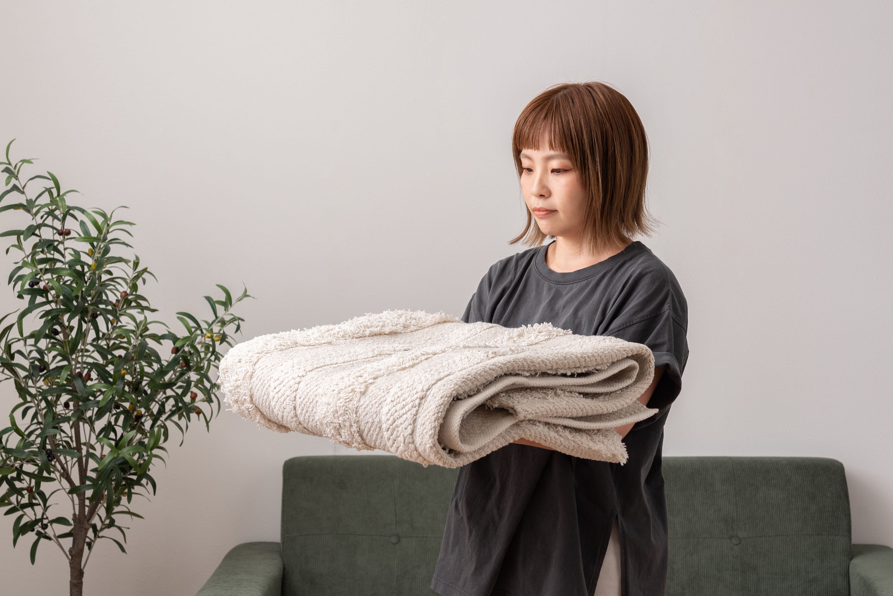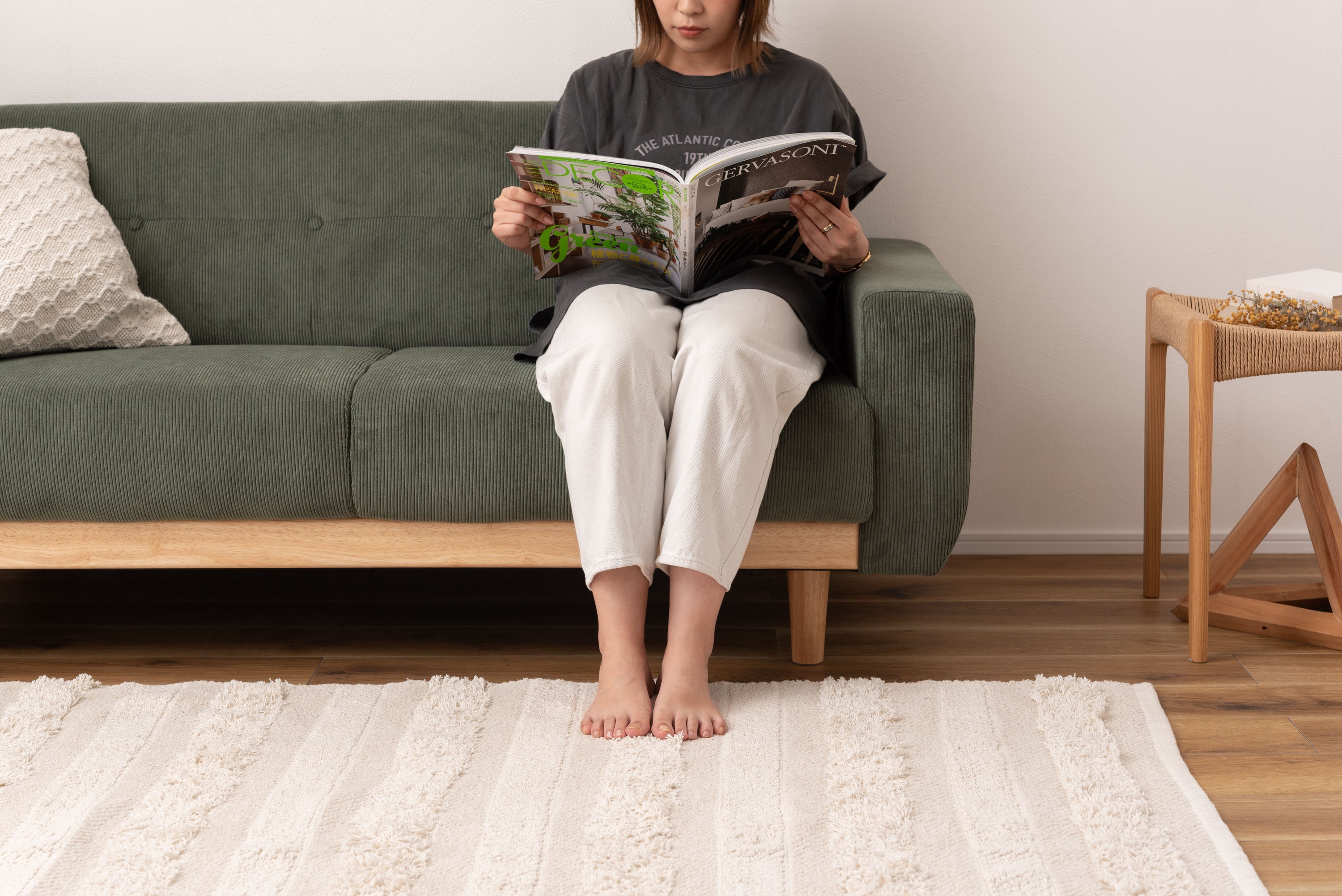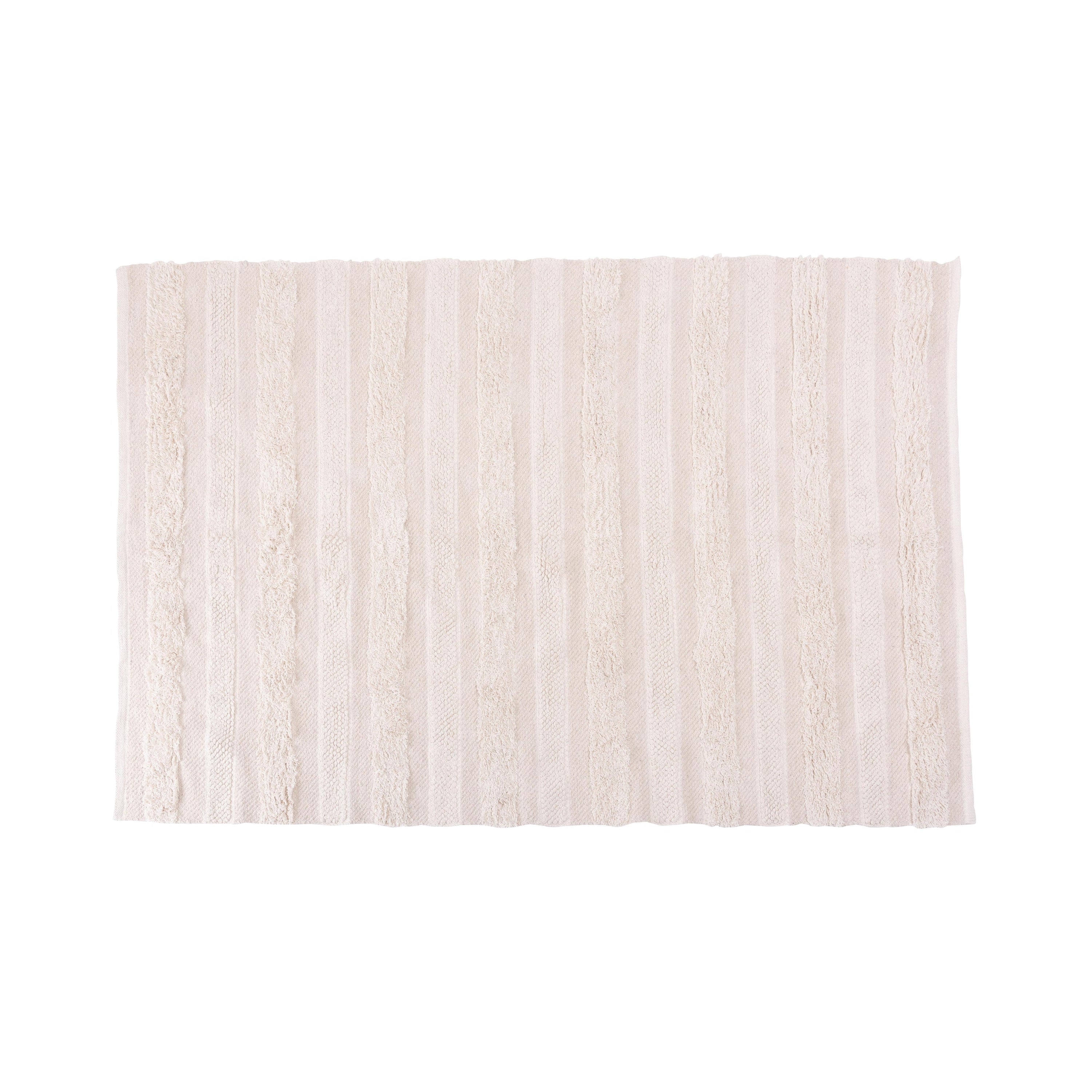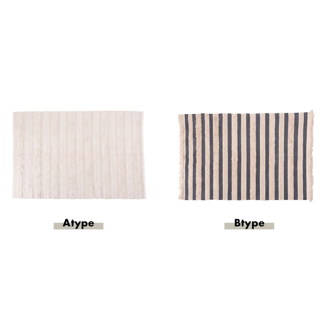ナチュラルコットンを手織りで丁寧に作られたシャギーマット。 手触りの良いふわふわとした風合いが特徴。 織り方を変えて表現された太目のストライプは優しいお部屋のインテリアを演出。 コットン100%の素材は、夏も冬も快適に使用する事が出来ます。 肌あたりも優しいので、ラグの上で寝転んでも快適。 ラグの中では軽めの設計なので、持ち運びも苦ではありません。