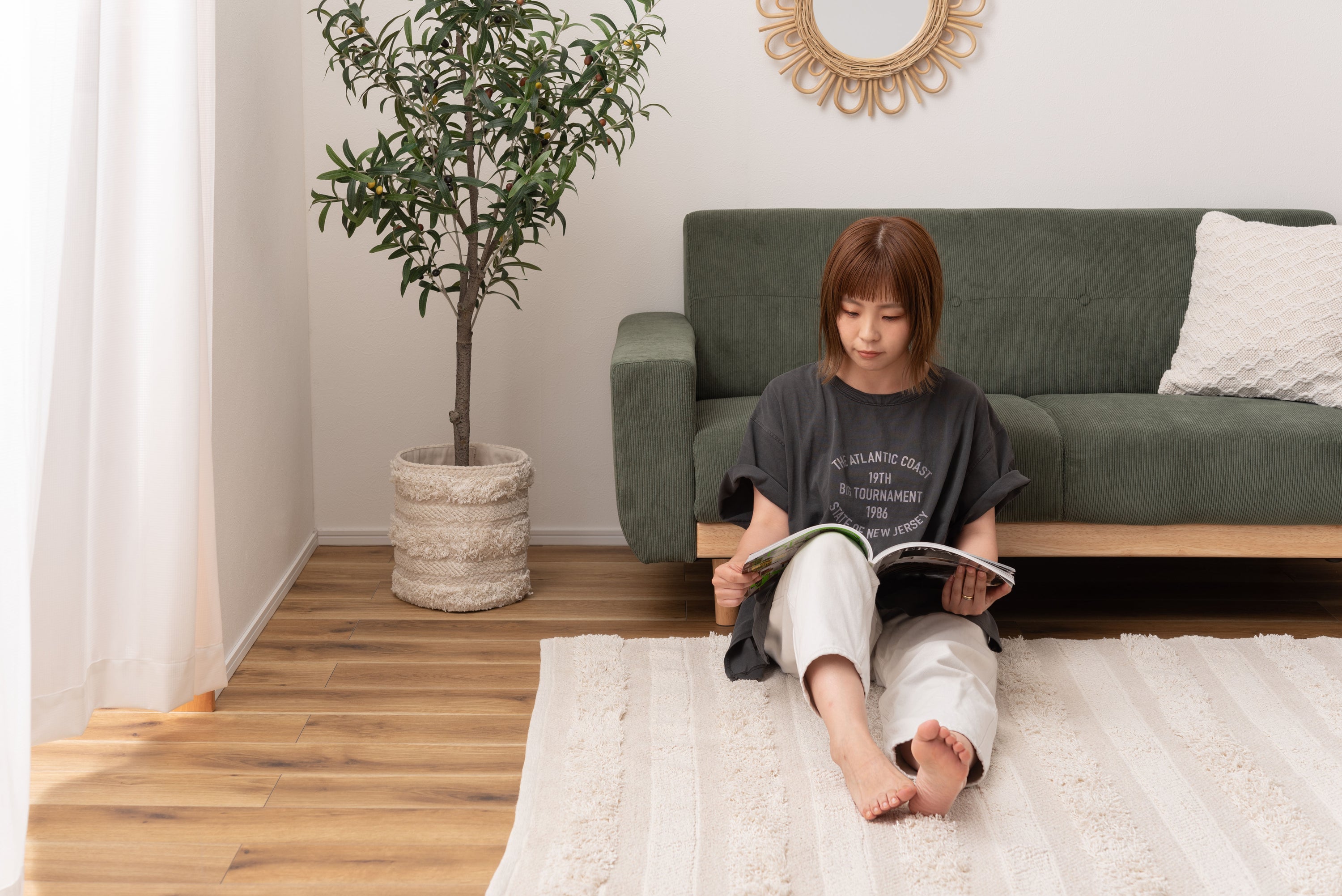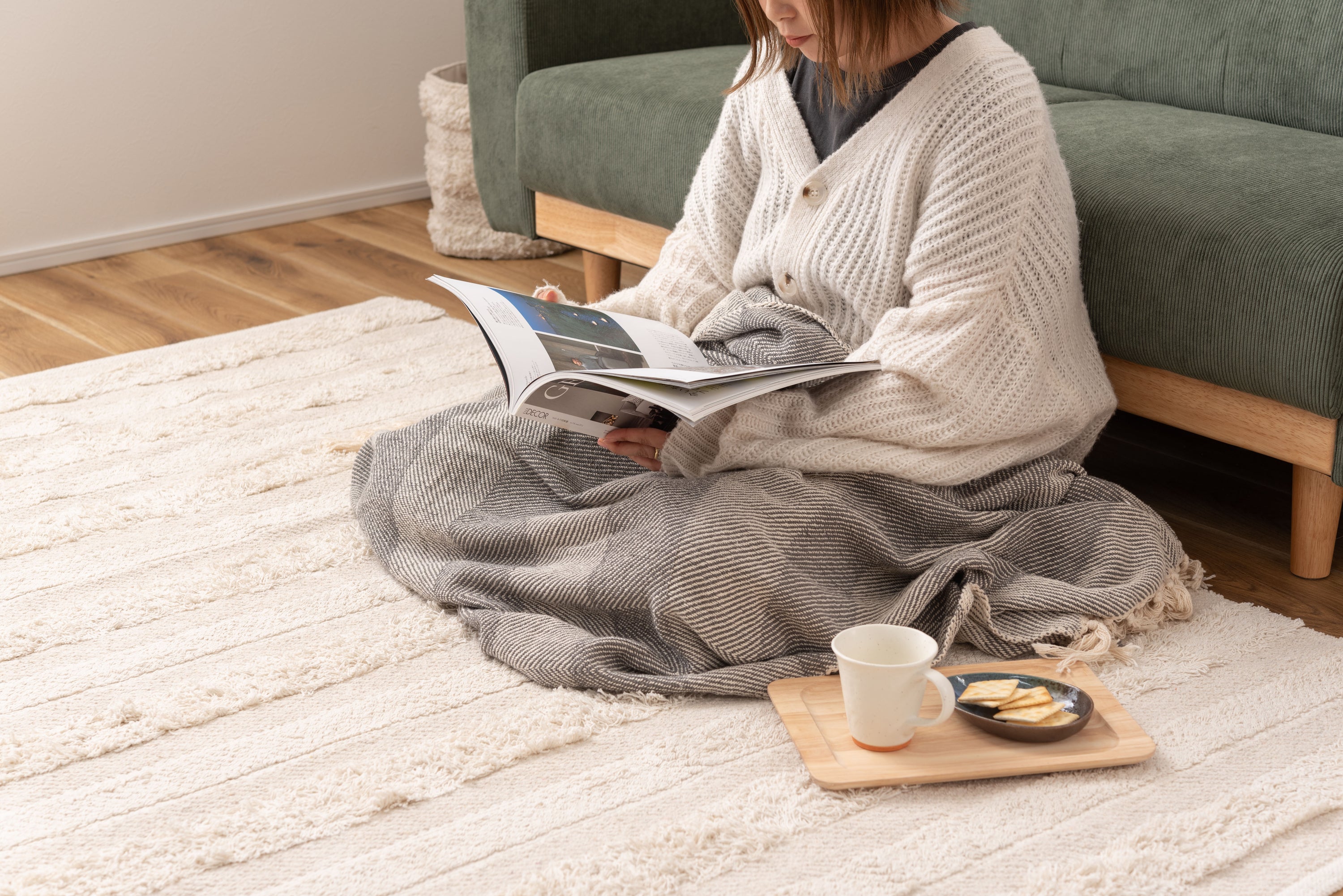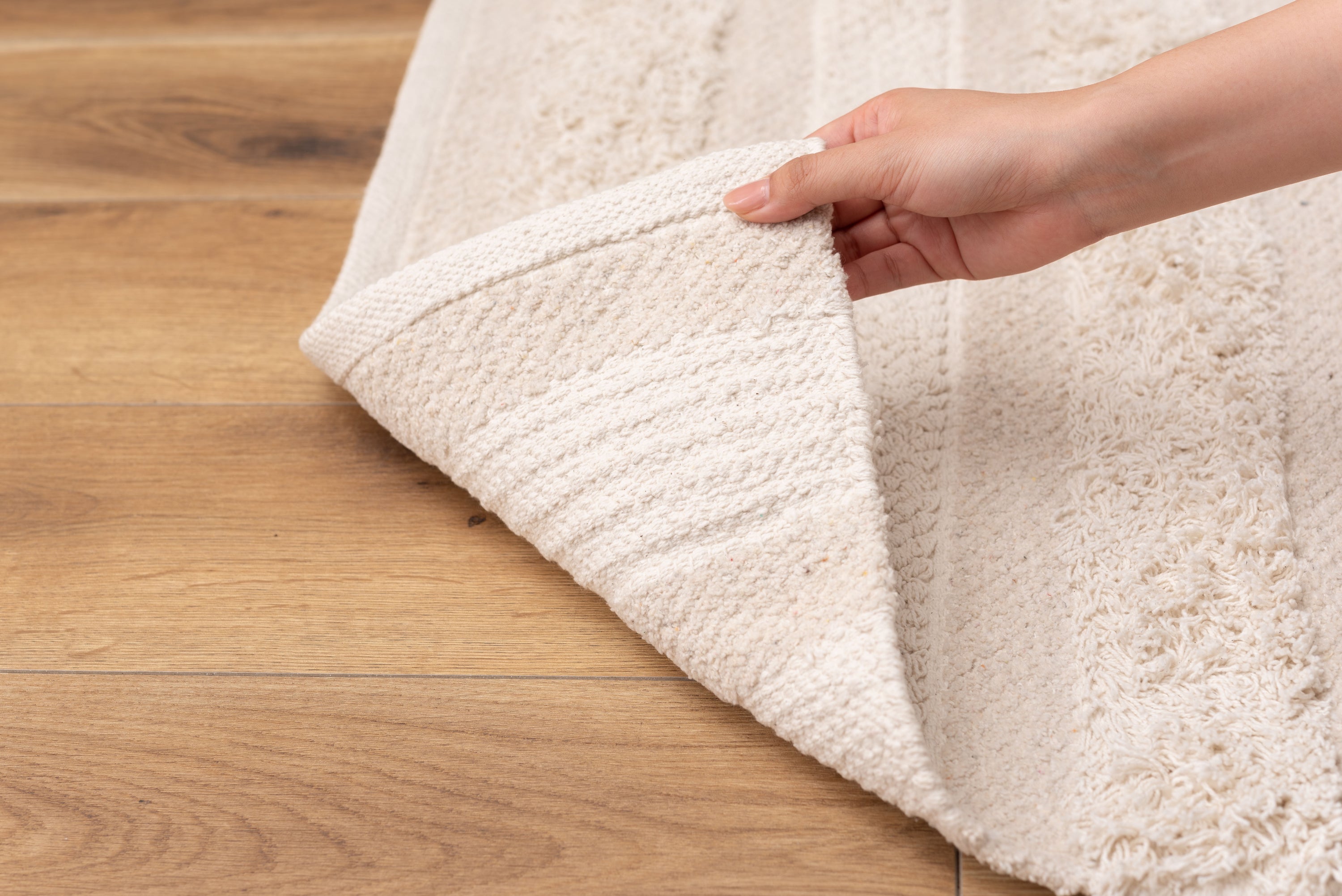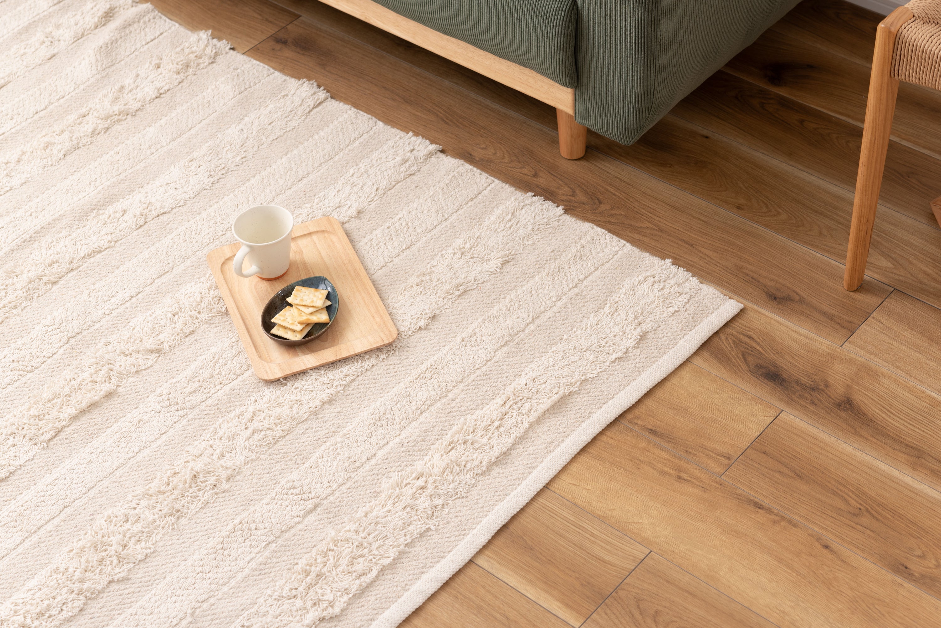 ナチュラルコットンを手織りで丁寧に作られたシャギーマット。 手触りの良いふわふわとした風合いが特徴。 織り方を変えて表現された太目のストライプは優しいお部屋のインテリアを演出。 コットン100%の素材は、夏も冬も快適に使用する事が出来ます。 肌あたりも優しいので、ラグの上で寝転んでも快適。 ラグの中では軽めの設計なので、持ち運びも苦ではありません。