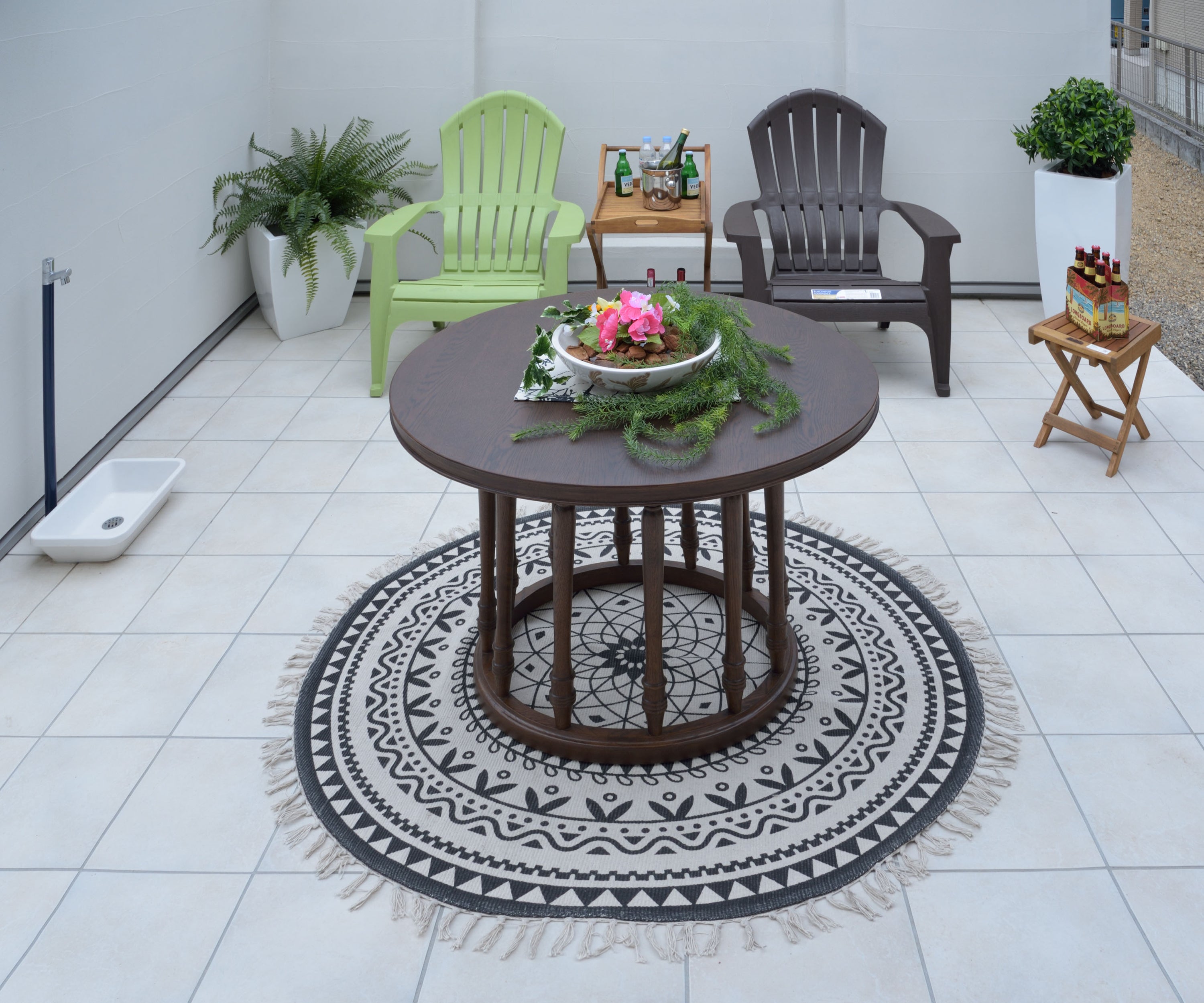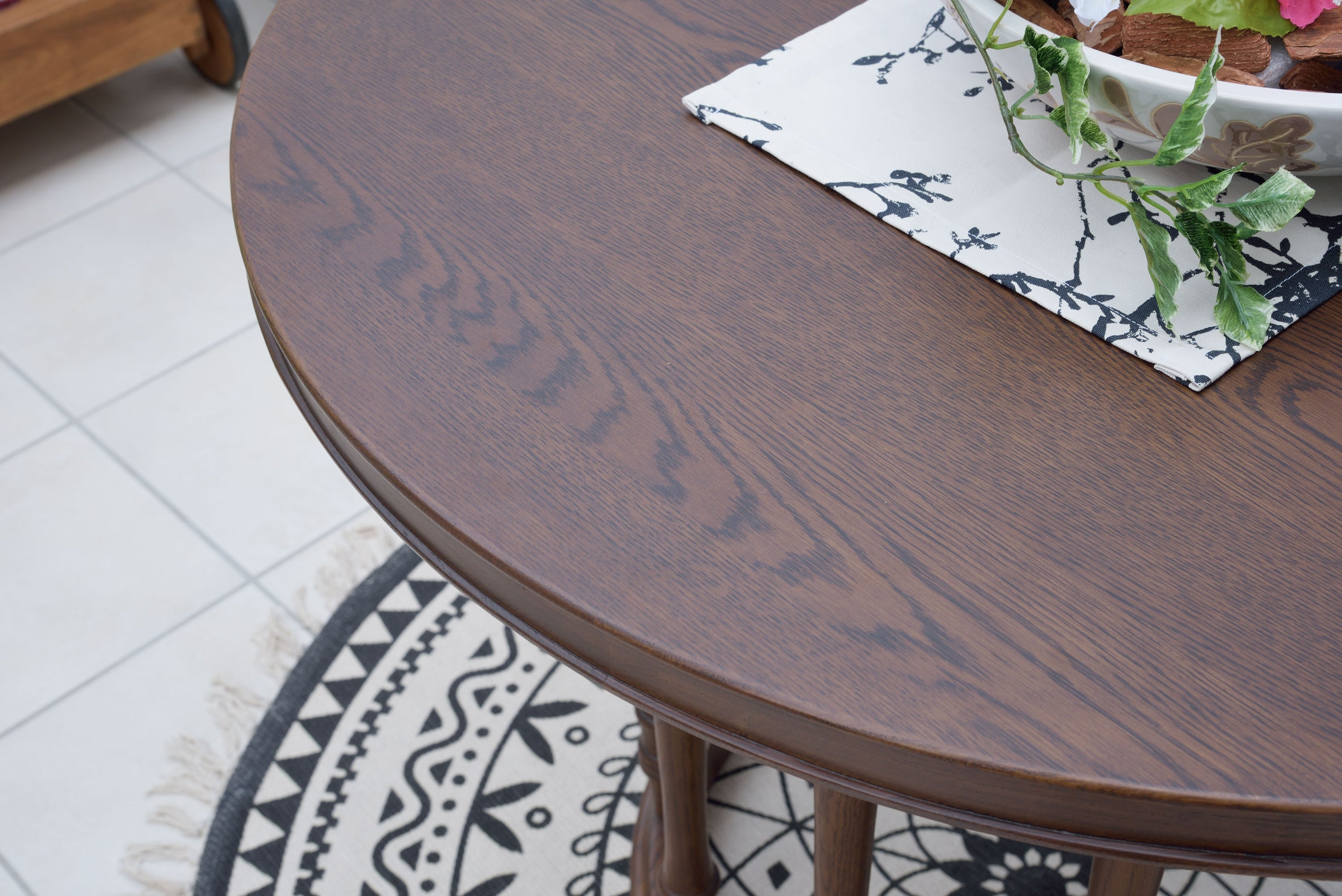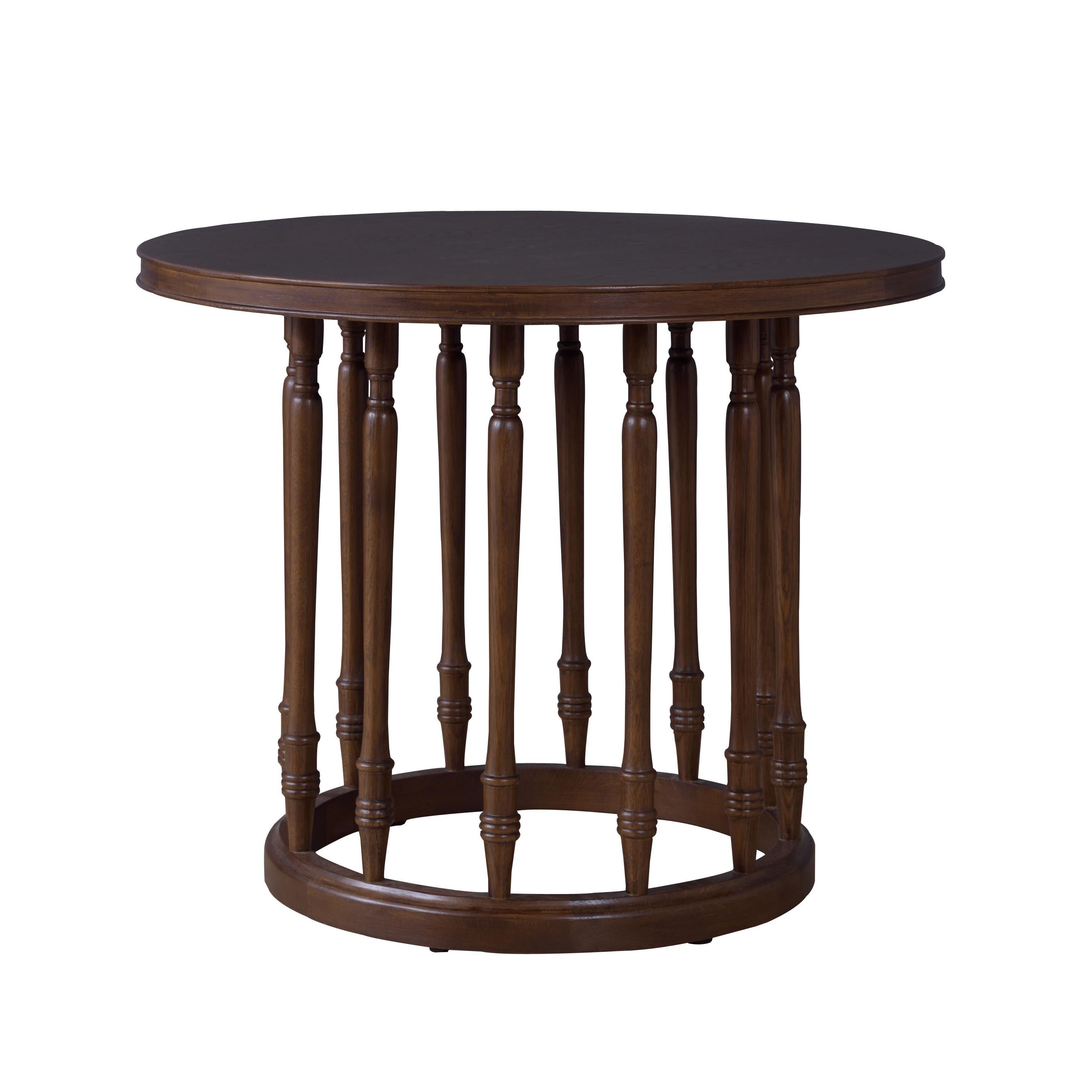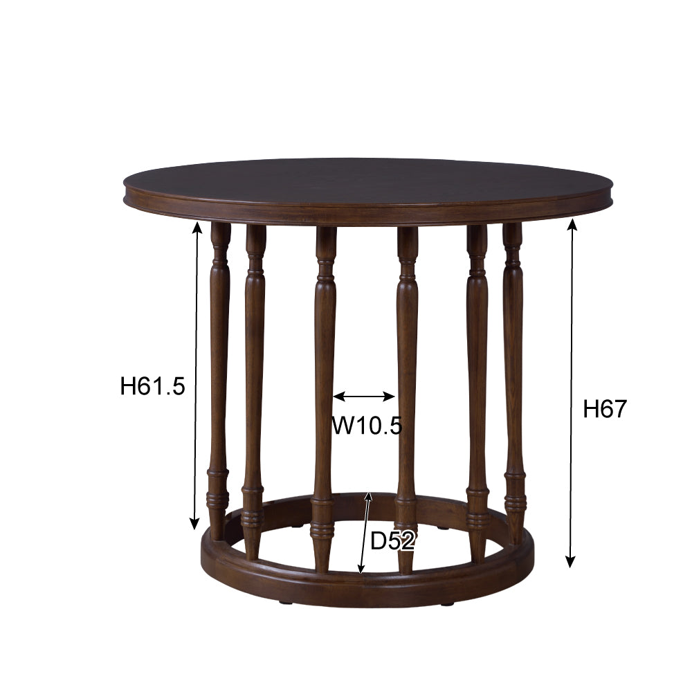 カタチを活かした空間づくり。 ホテルやオフィスの花台として使用するのはもちろん、ご家庭内でダイニングテーブルとしても ご使用いただけます。天板のエッジや装飾彫りが施された脚部が上品な印象を与え、 また、円形にすることでスペースを最小限に抑え、空間を広く見せたい場所に最適です。 天然木を落ち着いたブラウン色で塗装し、暖かみが感じられるテーブルに仕上げました。