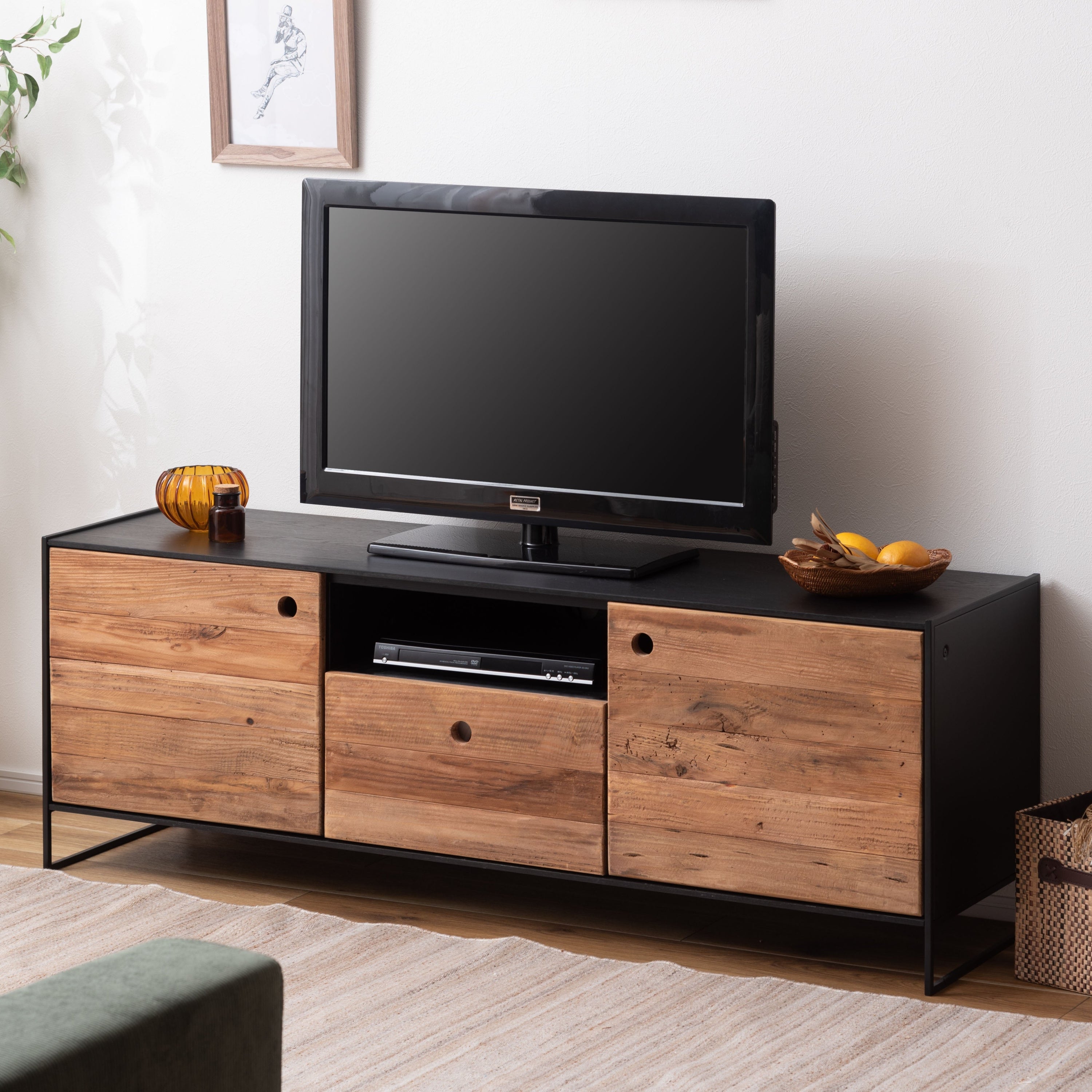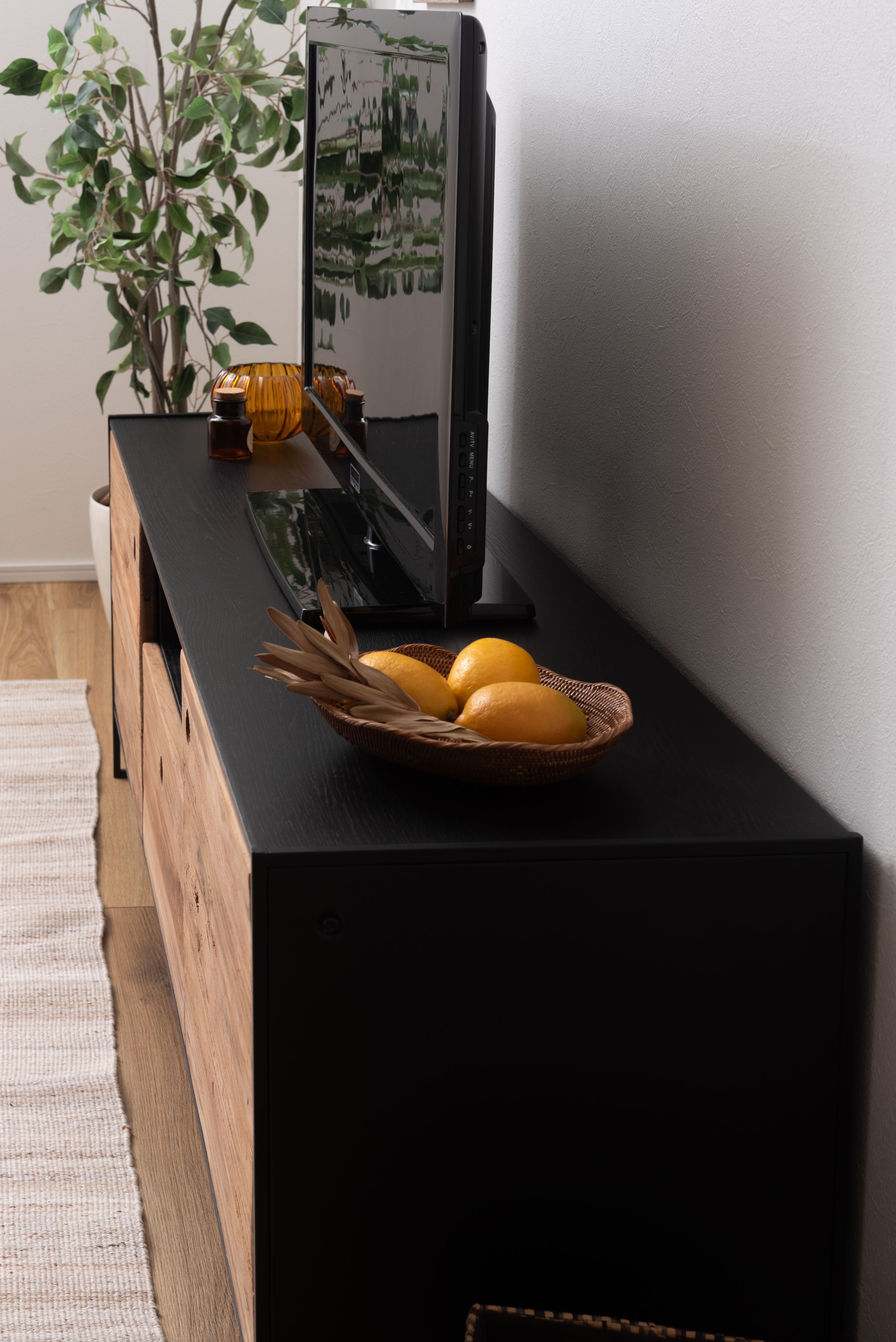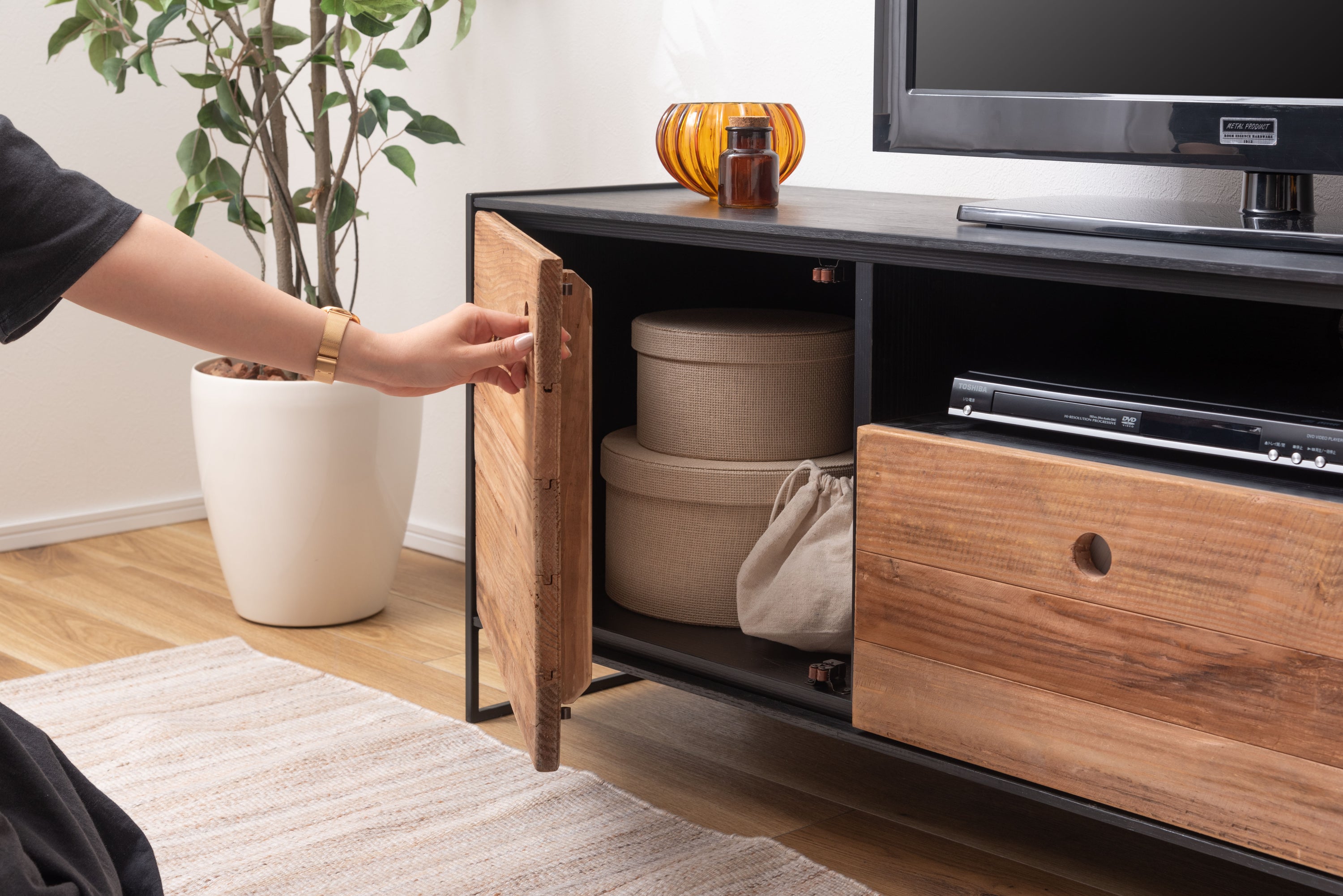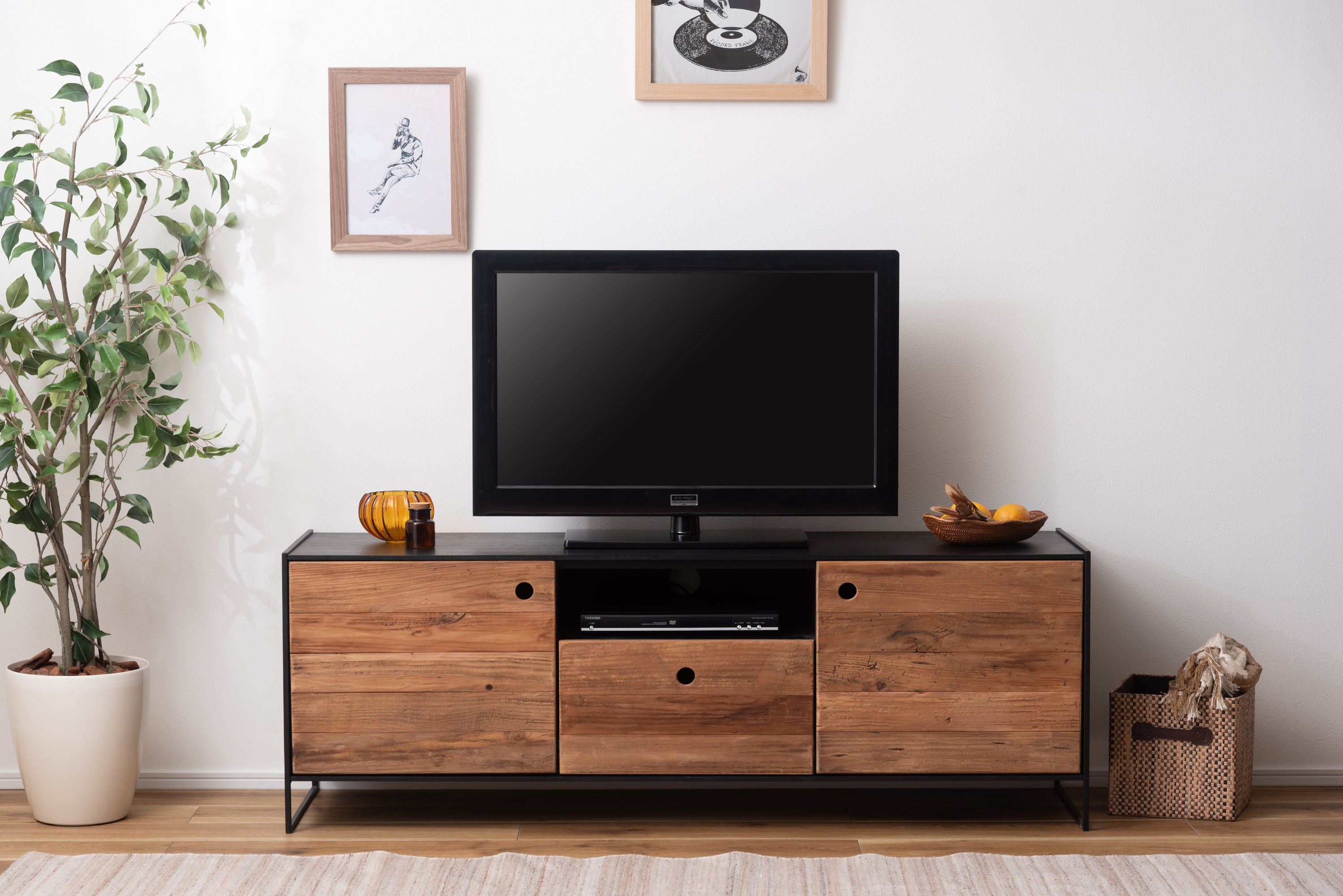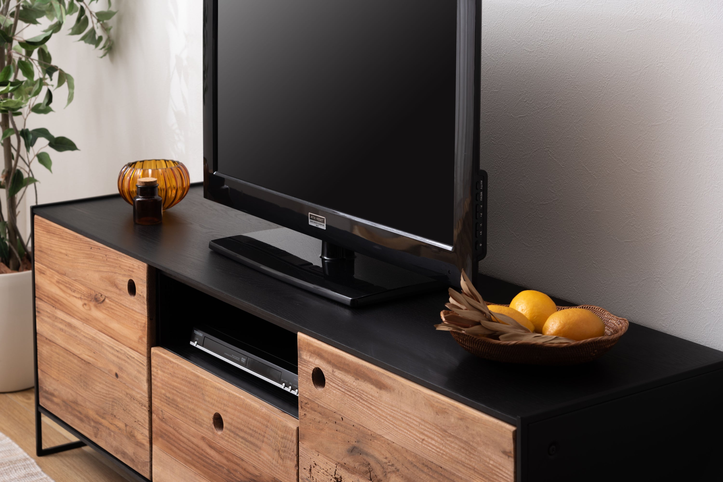 パイン古材を使用した味のあるローボード。 表面の扉と引き出し部分にパイン古材を使用したローボード。 古材×ブラックのデザインは、ヴィンテージ感のある雰囲気だけでなく、インダストリアル・ブルックリン風・西海岸風など、様々なインテリアと相性が良く、お部屋の主役になってくれるアイテム。 風合いのあるパイン古材。 両サイドには扉付きの収納。 中央下段は大容量の引き出し。 配線に便利なコード穴。 扉・引き出しはソフトクローズ仕様。