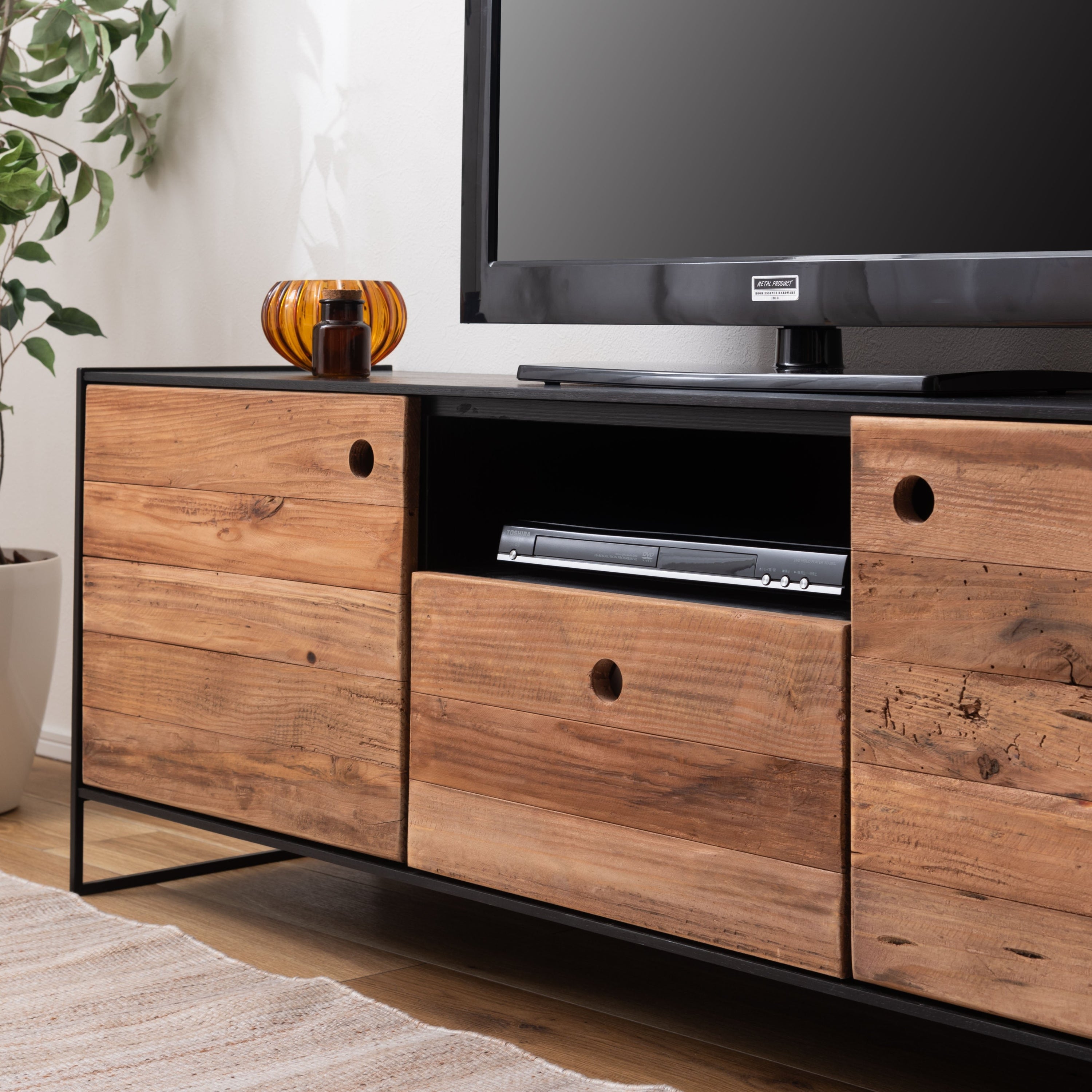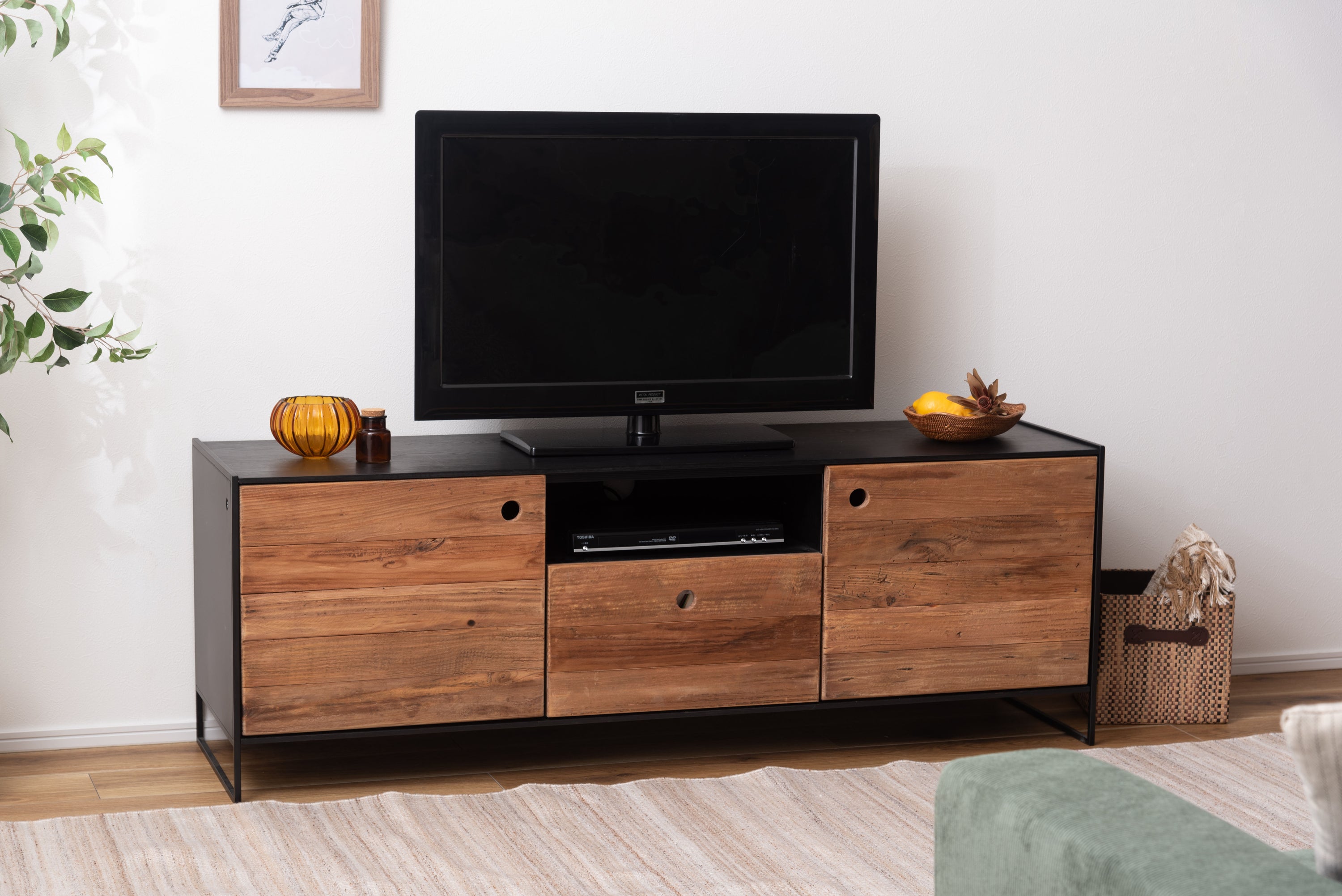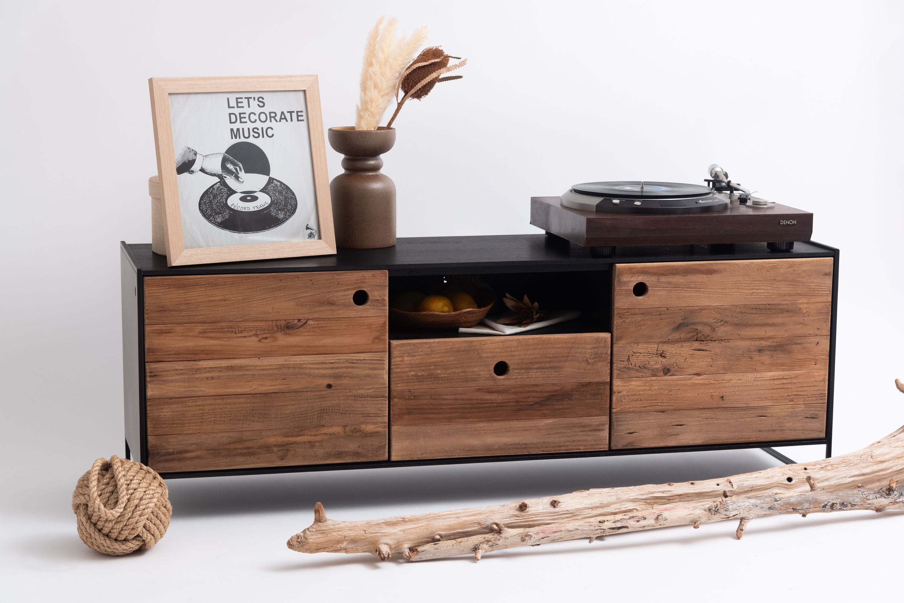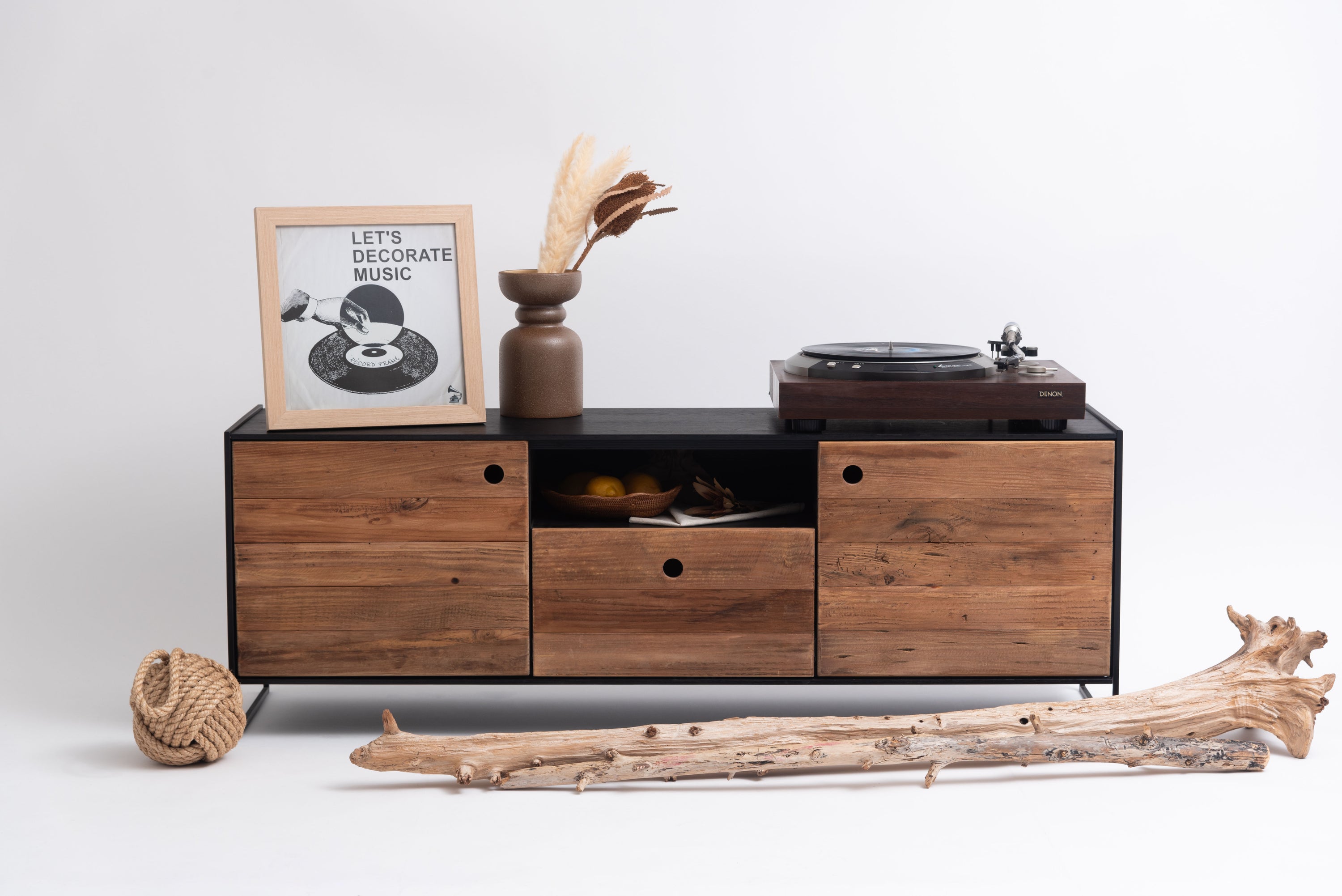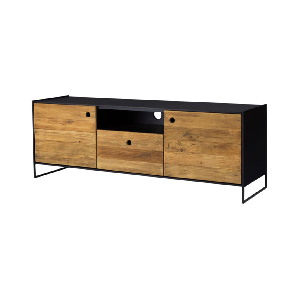 パイン古材を使用した味のあるローボード。 表面の扉と引き出し部分にパイン古材を使用したローボード。 古材×ブラックのデザインは、ヴィンテージ感のある雰囲気だけでなく、インダストリアル・ブルックリン風・西海岸風など、様々なインテリアと相性が良く、お部屋の主役になってくれるアイテム。 風合いのあるパイン古材。 両サイドには扉付きの収納。 中央下段は大容量の引き出し。 配線に便利なコード穴。 扉・引き出しはソフトクローズ仕様。