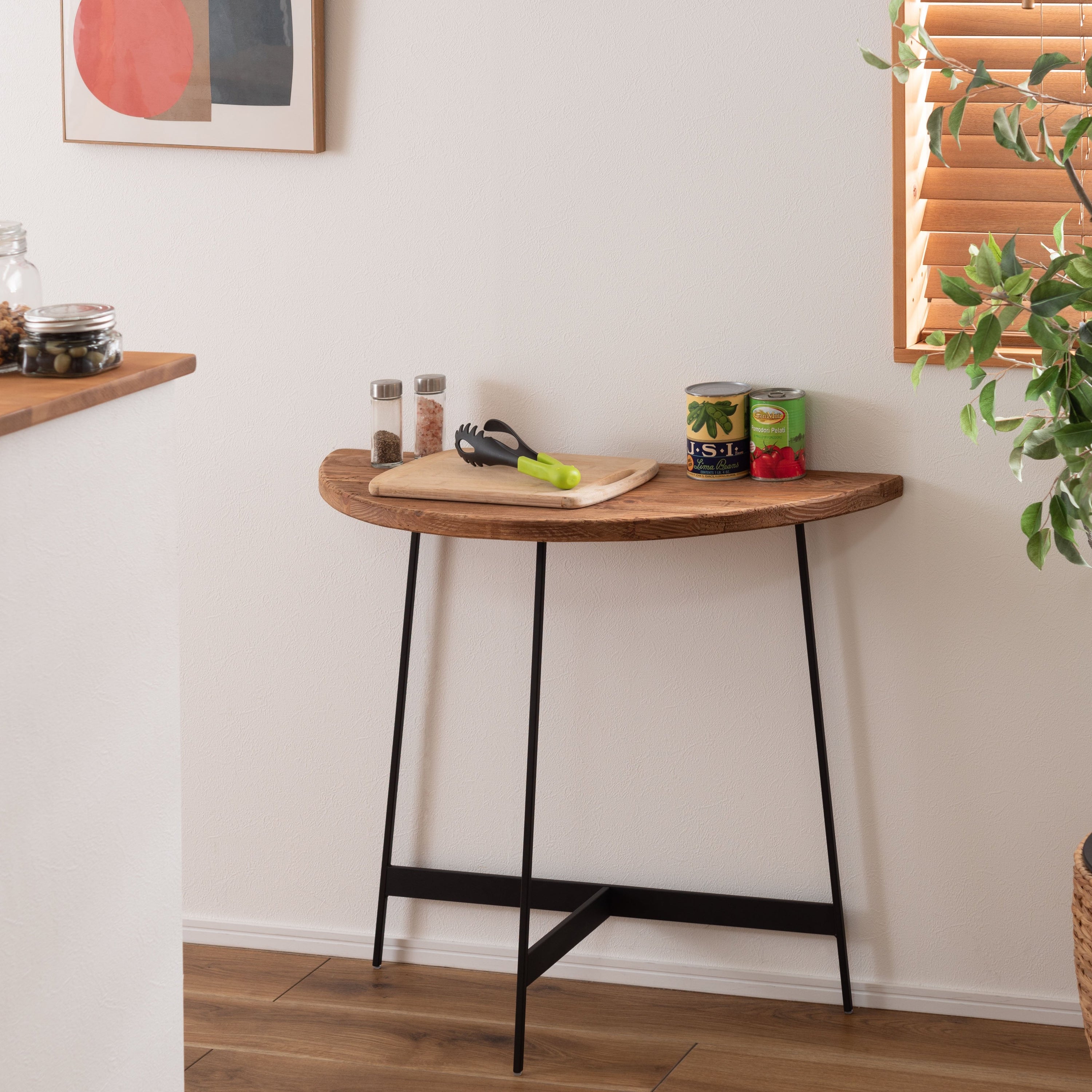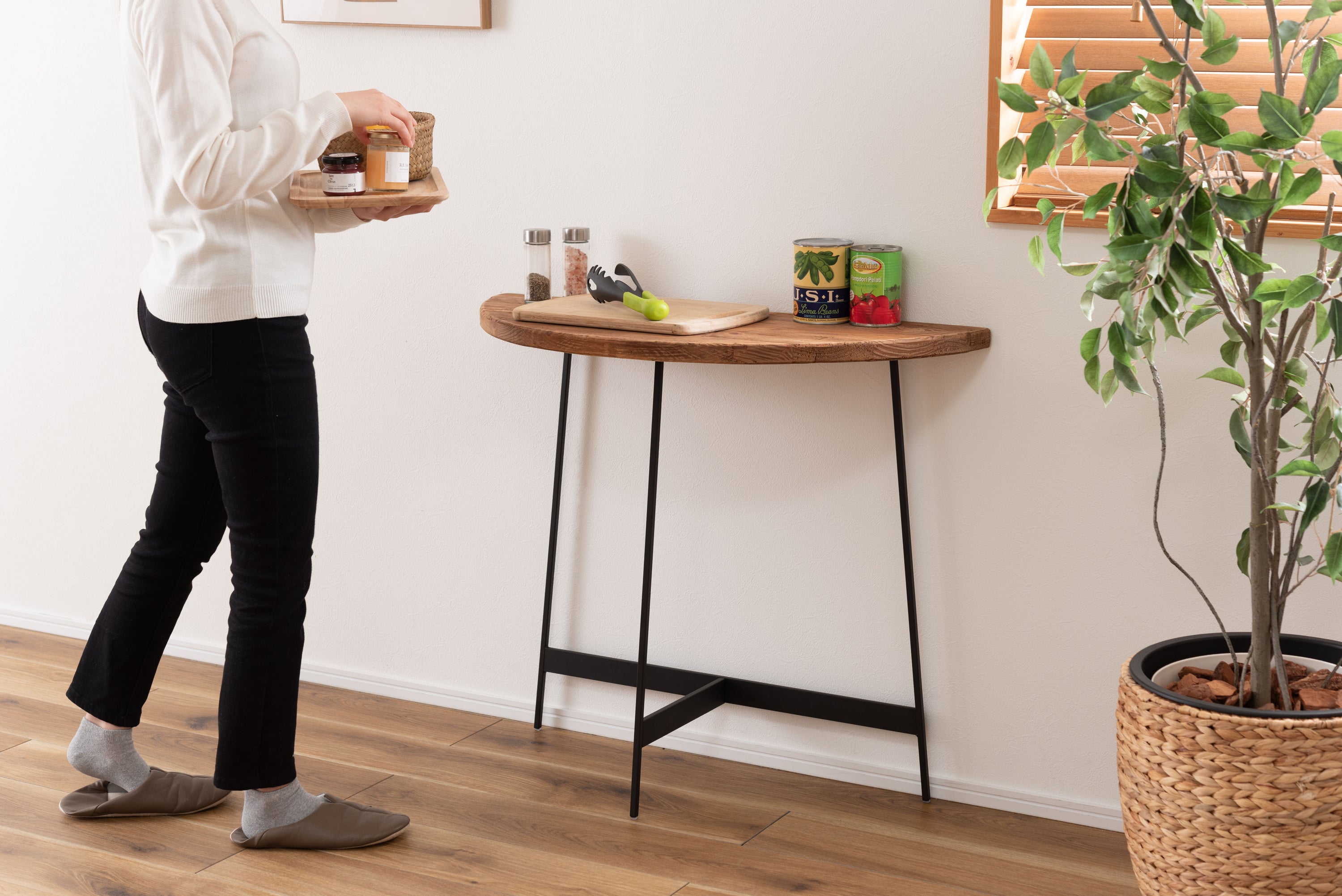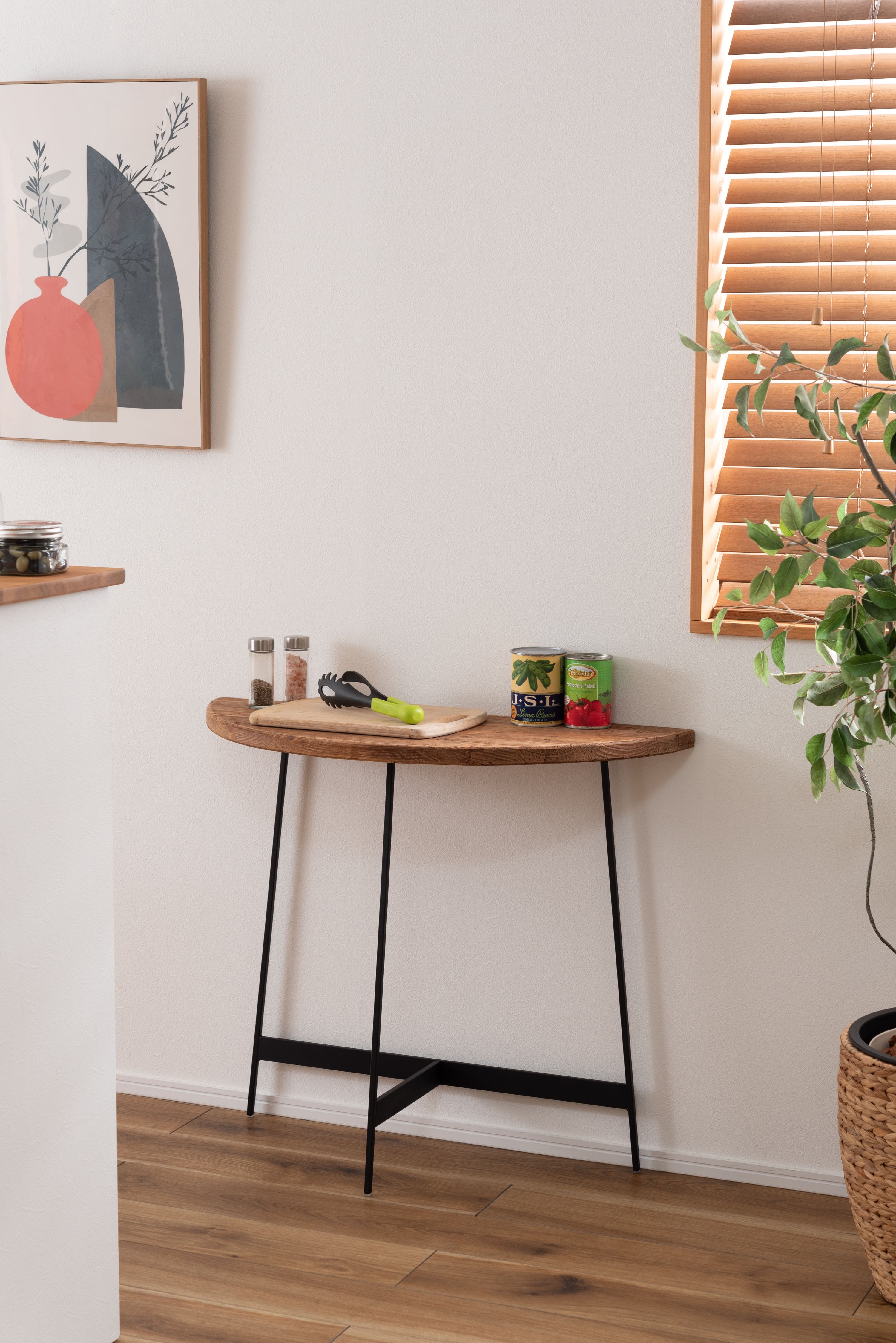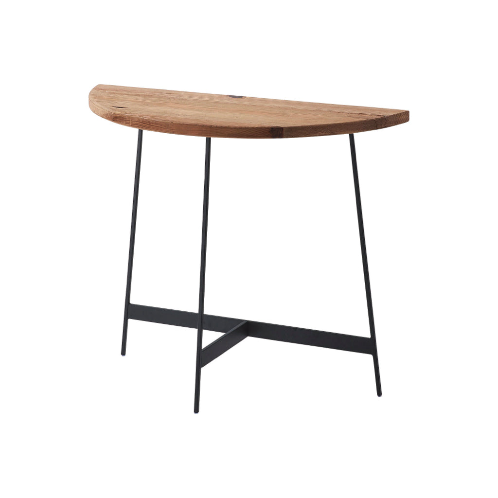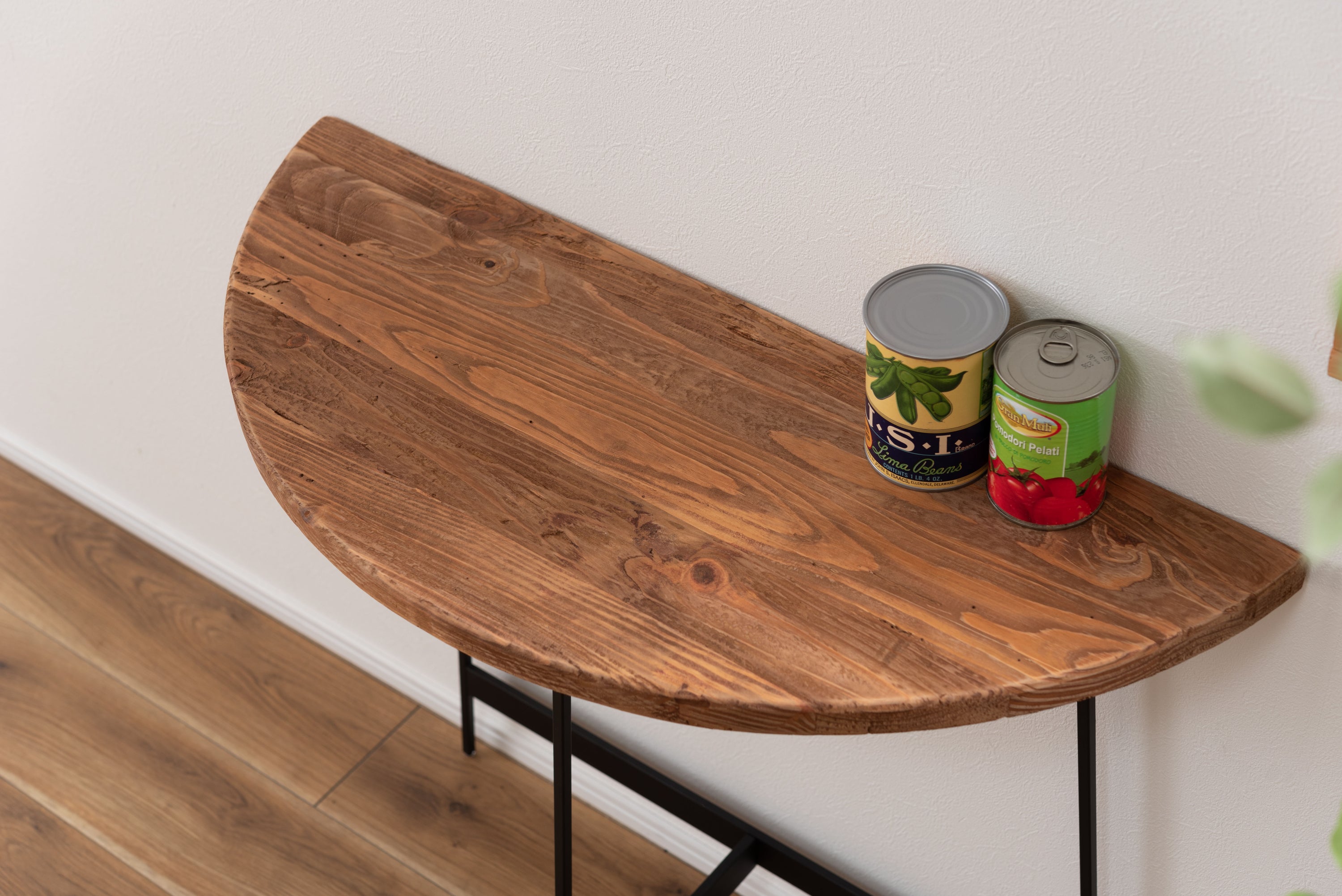 古材を使用した、天然素材の風合いを感じられるコンソールです。半円なので、様々なシチュエーションで場所を選ばず使用できます。味のある天板と、スタイリッシュなアイアンレッグの異素材デザインが特徴です。