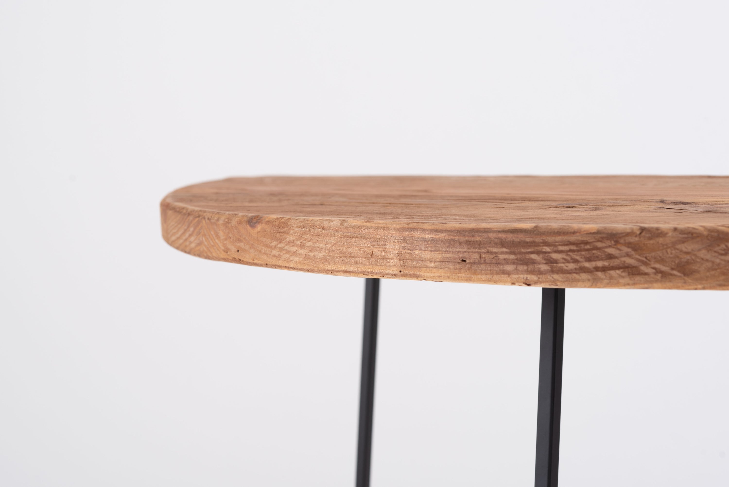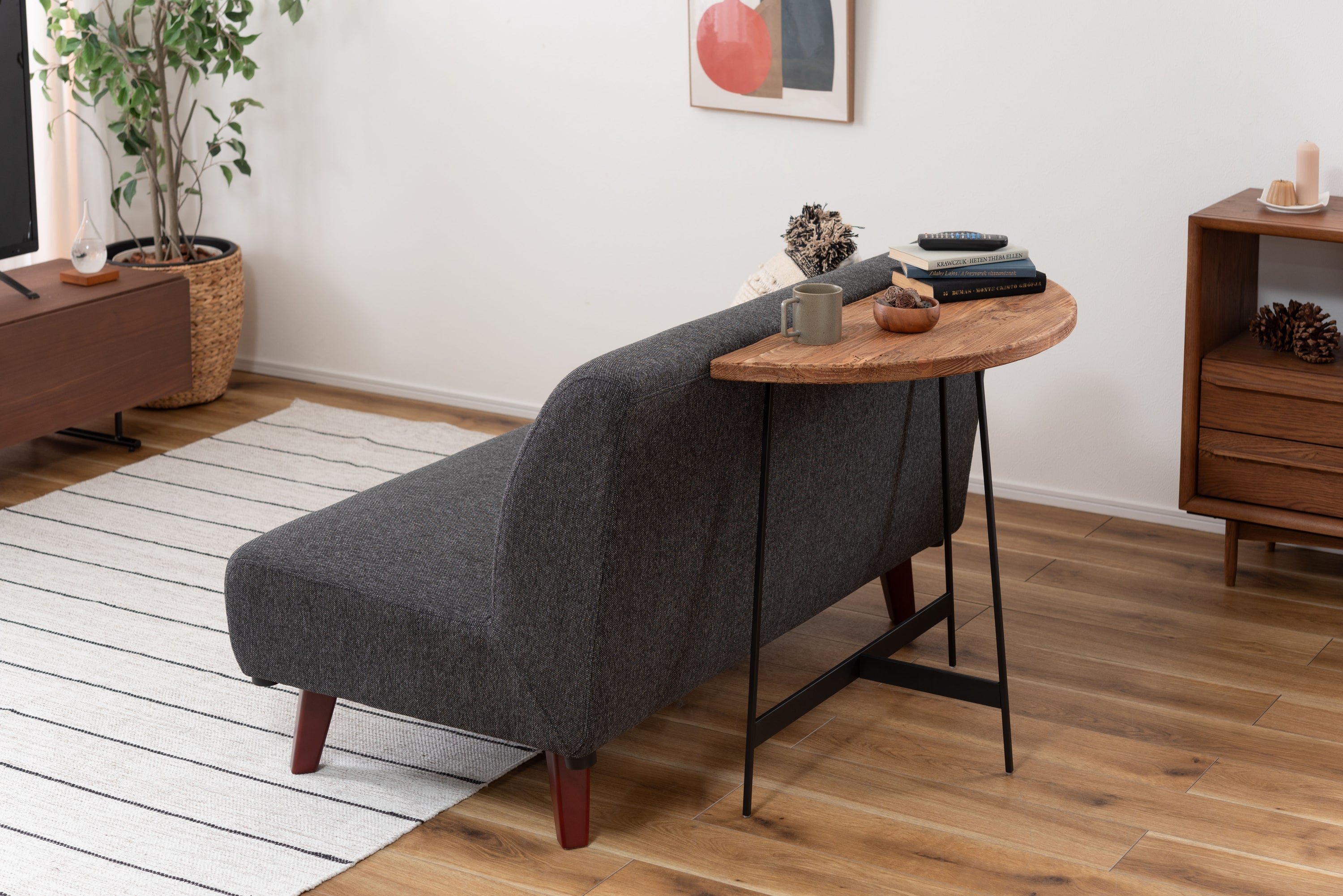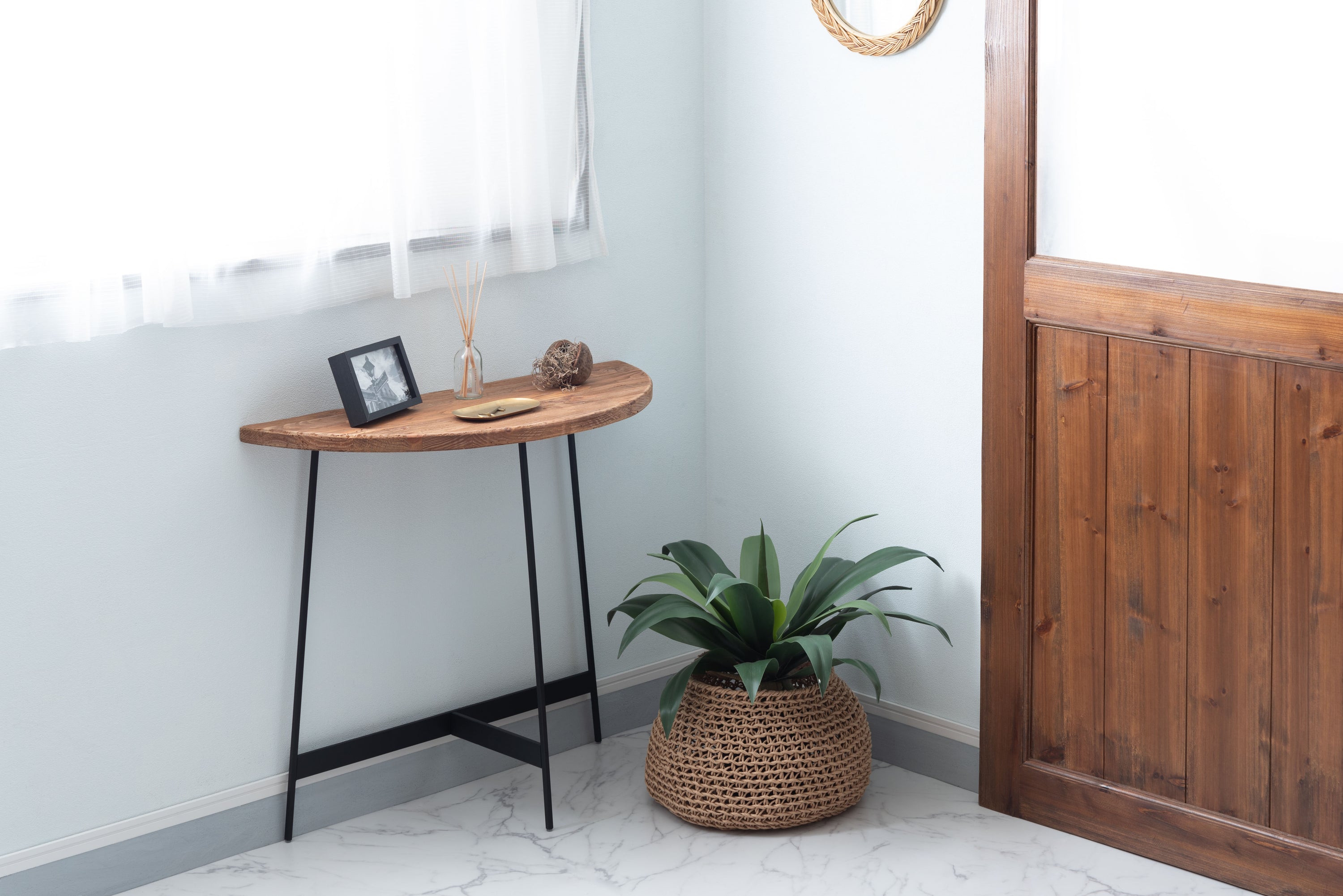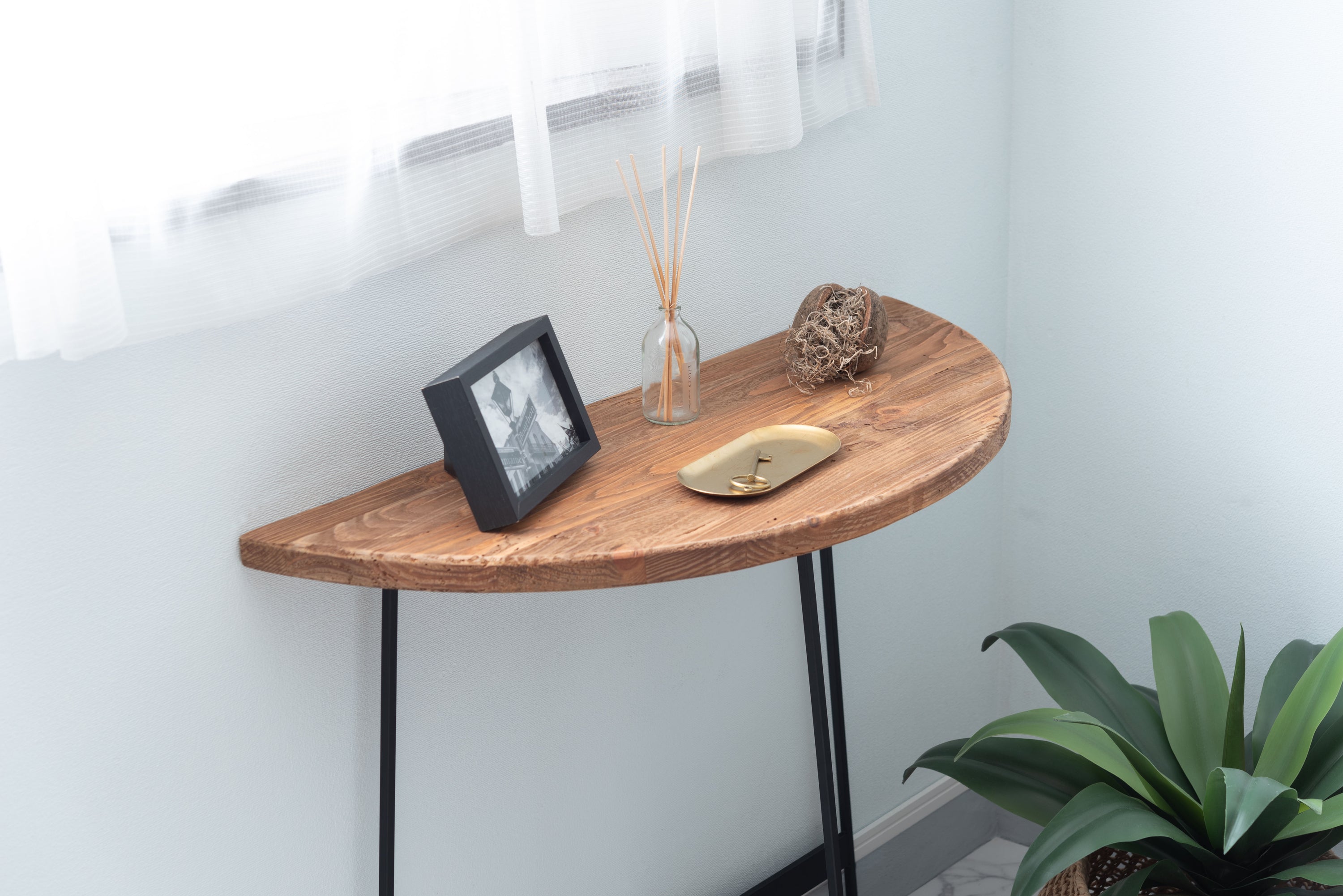 古材を使用した、天然素材の風合いを感じられるコンソールです。半円なので、様々なシチュエーションで場所を選ばず使用できます。味のある天板と、スタイリッシュなアイアンレッグの異素材デザインが特徴です。