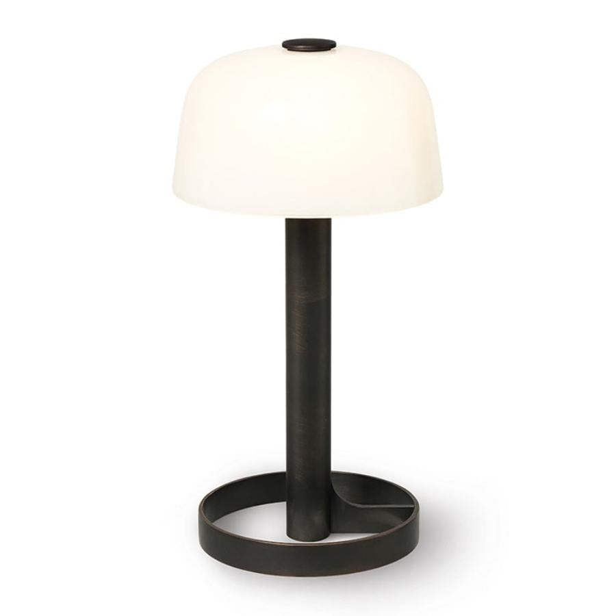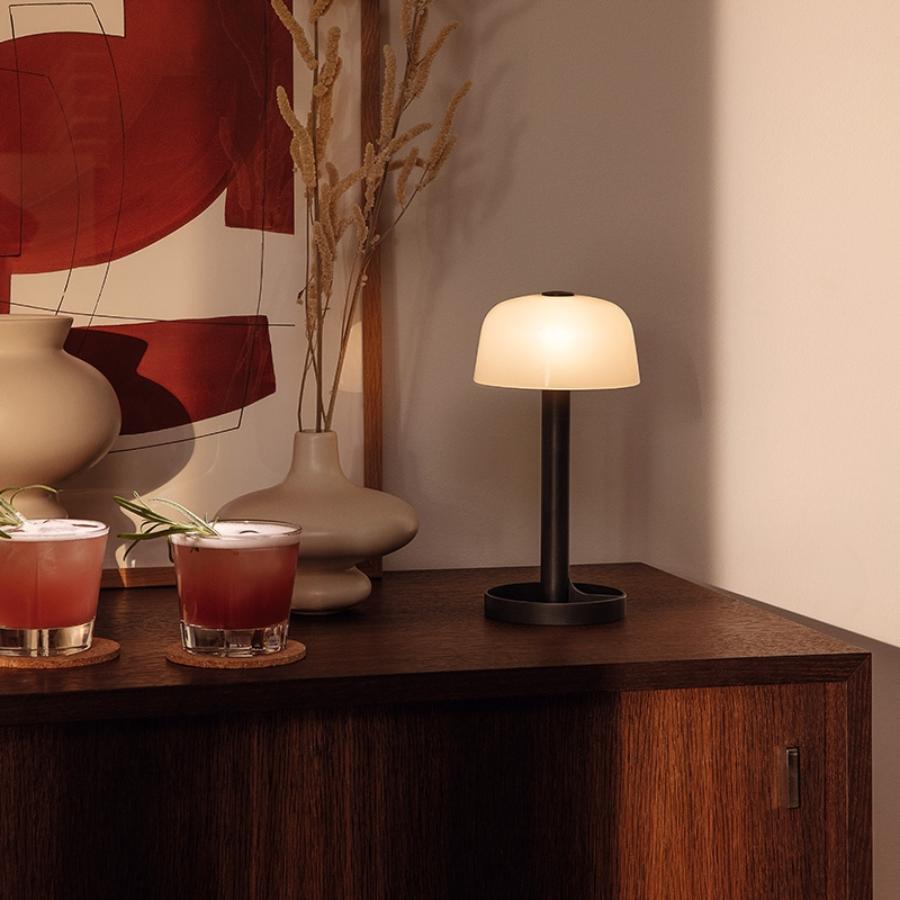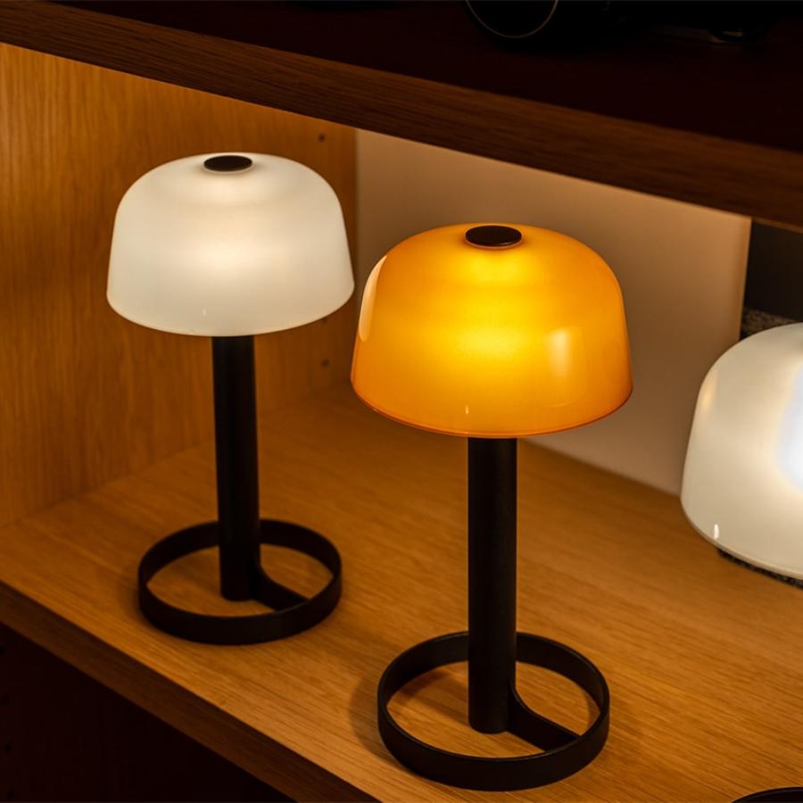 自由自在に持ち運びができるコードレス卓上ランプです。シェード上部をタッチすれば明るさも3段階に調光可能です。ハンドプレスガラス越しの灯りはニュアンスと深みを感じさせ、スチール製のベースとともに質感の高さも魅力的です。ダイニングでの楽しい食事、リビングでのリラックスタイム、おやすみ前のベッドルームからテラスまで、目的に合わせた明るさでスマートに活用できます。約2時間の充電で、最長約8時間のご使用が可能です。