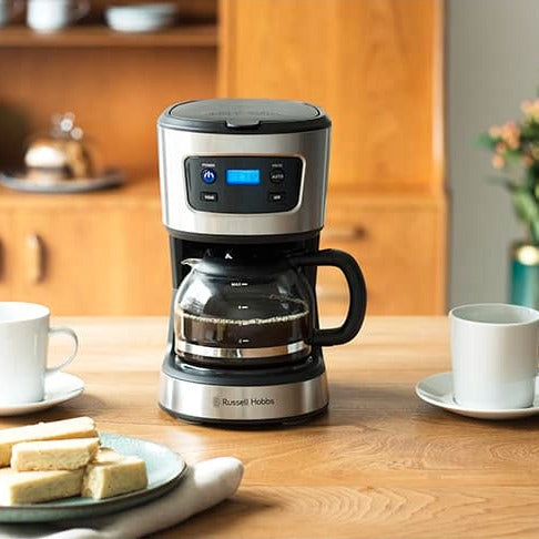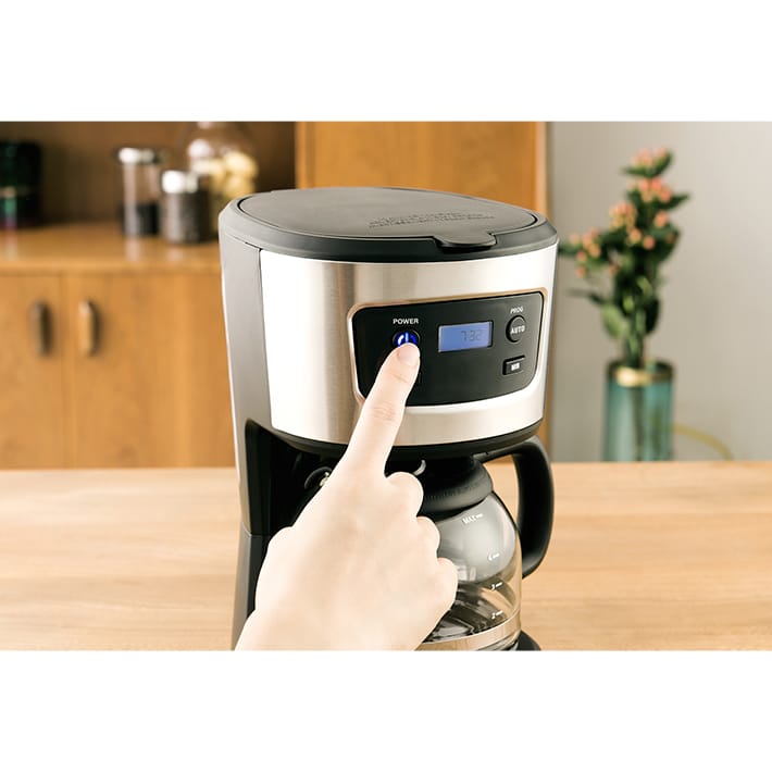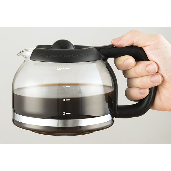 美味しいコーヒーを手軽に楽しめる、すっきりとしたデザインのコーヒーメーカー。夫婦やカップルでのリラックスタイムにもぴったりな5カップ分を注げます。付属のフィルターにそのまま粉を入れて、繰り返し使えるため、エコで経済的。最大で3時間まで保温可能で、飲みたい時間にセットできる便利なタイマー機能も備えています。どんなインテリアにも自然と馴染む、シルバーのステンレスとブラックカラーの配色です。