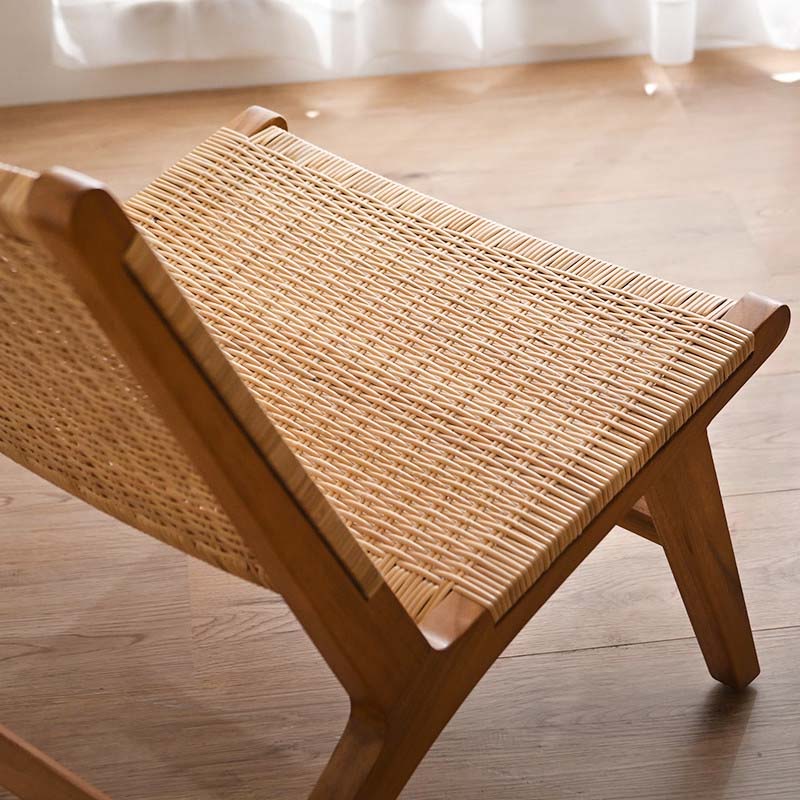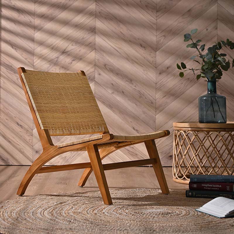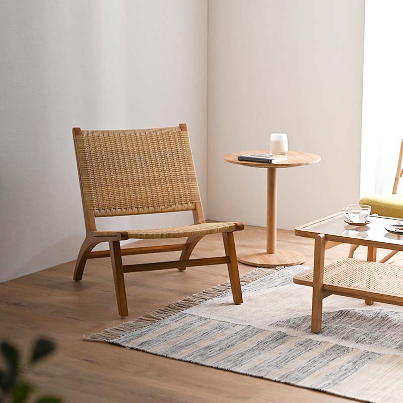 素材にラタンとチーク無垢材を組み合わせたラウンジチェアです。木目が1つ1つ違い、自然の木目を活かしたこの世に2つとない木目のデザインをお楽しみいただけます。座面や、背面には天然素材ラタンをあしらい、編み上げています。天然素材のもつ優しさとあたたかみのある雰囲気は、お部屋を温かみと静けさのある落ち着いた空間に演出します。