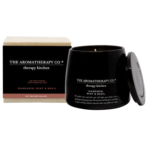 The Aroma Therapy COMPANY - Therapy Kitchen (セラピーキッチン)、ボディケアからホームフレグランスまで幅広い商品ラインを展開している シリーズです。Essential Oil Soy Wax Candle(エッセンシャルオイル ソイワックスキャンドル)は、エッセンシャルオイルだけで香り付けされた植物性のキャンドルです。フレグランスの種類・Mandarin, Mint & Basilマンダリン、ミント&バジル透明感のある爽やかなシトラスとハーブの香り。