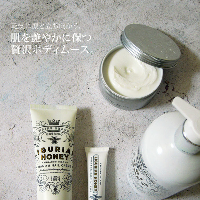 【MAINE BEACH】マインビーチ、LIGURIAN HONEYリグリアンハニーシリーズです。リグリアンハニーとは現存しているミツバチの中で最後の純血種と言われるイタリア系のミツバチから採取する事が出来る貴重な蜂蜜の事です。真のオーガニックハニーと言える物を使用しているボディケアシリーズがリグリアンハニーシリーズです。ボディムース(クリーム)。
