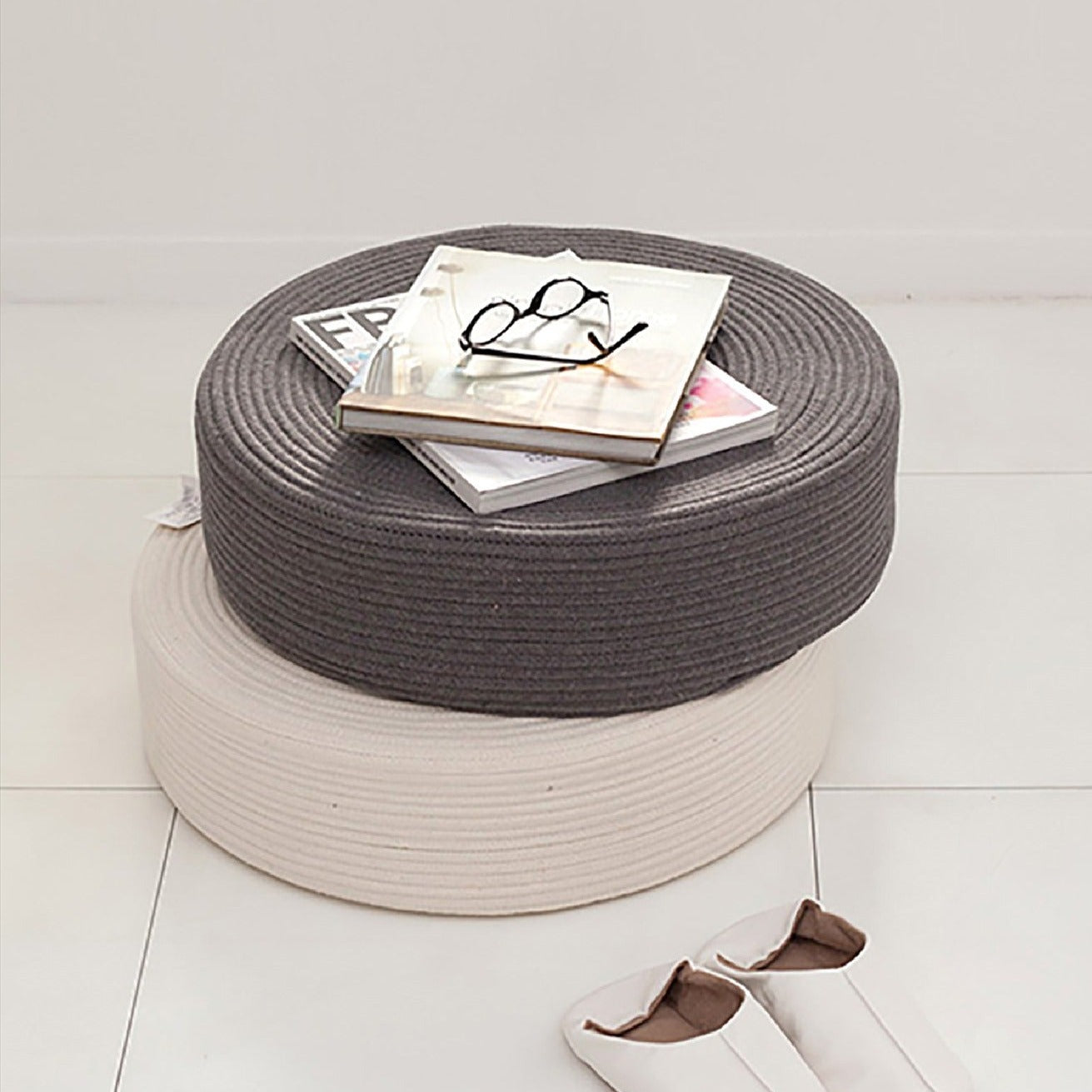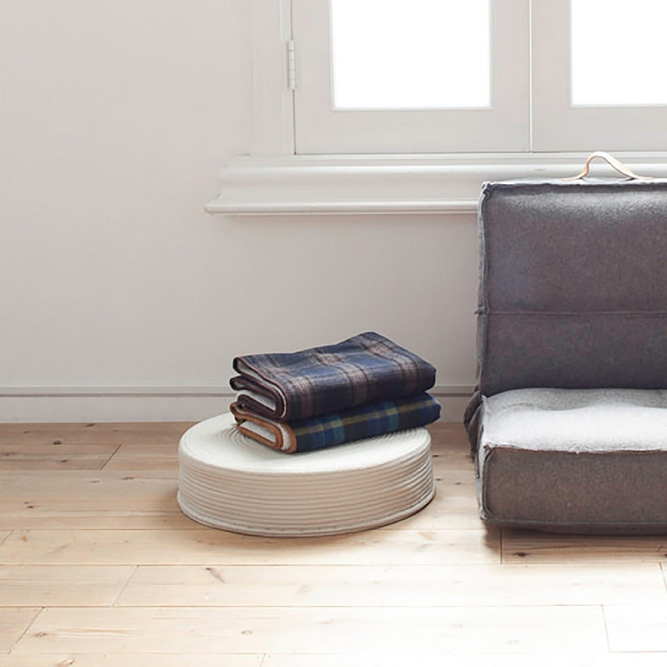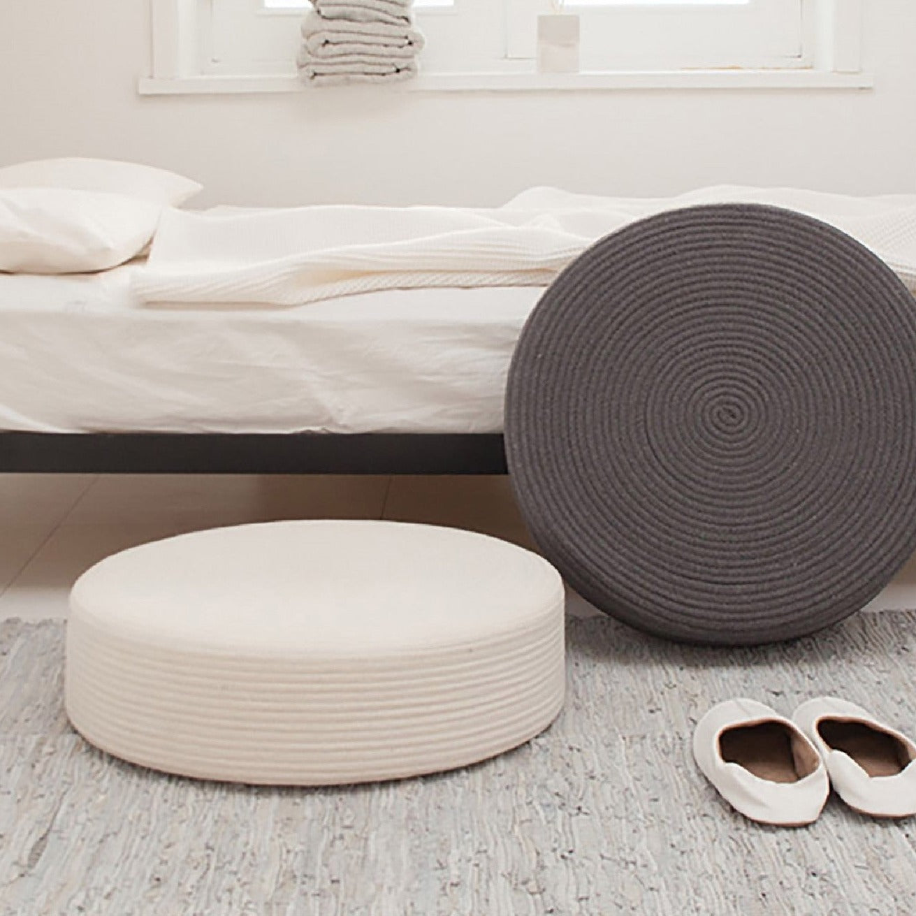 綿100%の直径約8mmの太いコットンロープで作ったフロアクッションです。綿100%の1本のコットンロープを中心から巻くように縫い上げて作りました。コットンならではのやさしい手触りとシンプルな製造方法だからこそ生まれた独特のマッシブな量感が特徴です。ソファの補助や座椅子の代わりにお使いいただけたりと、様々なシーンで活躍できます。