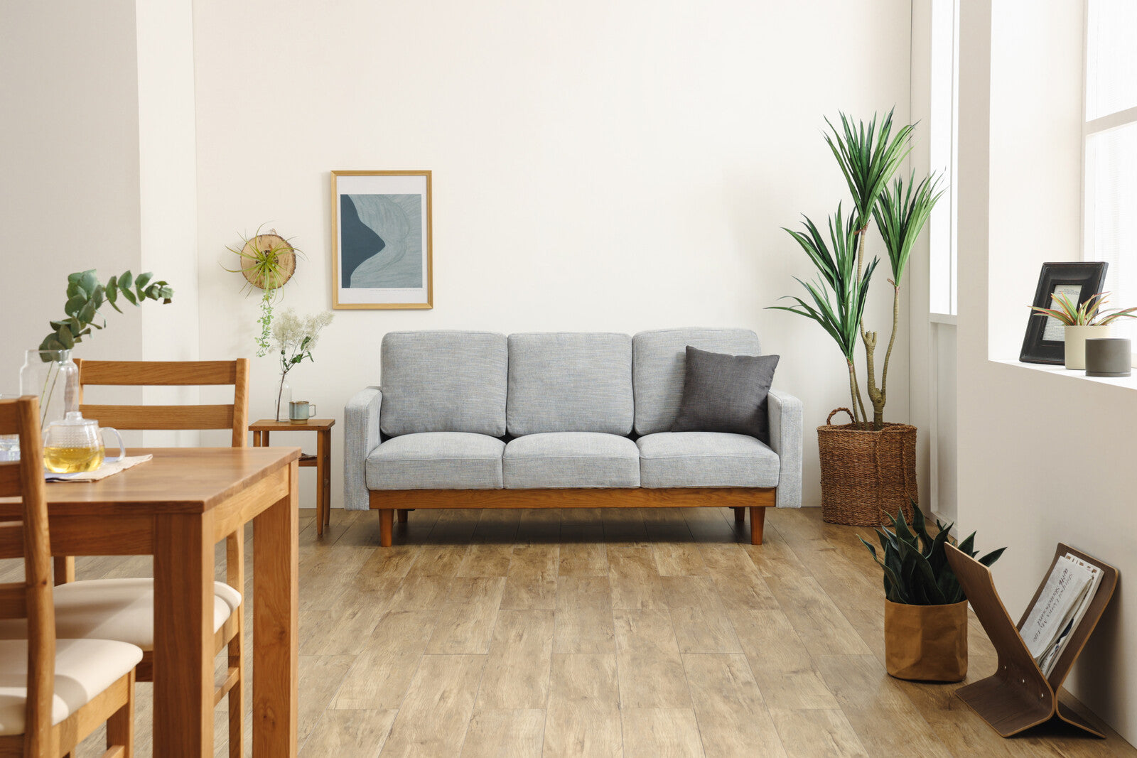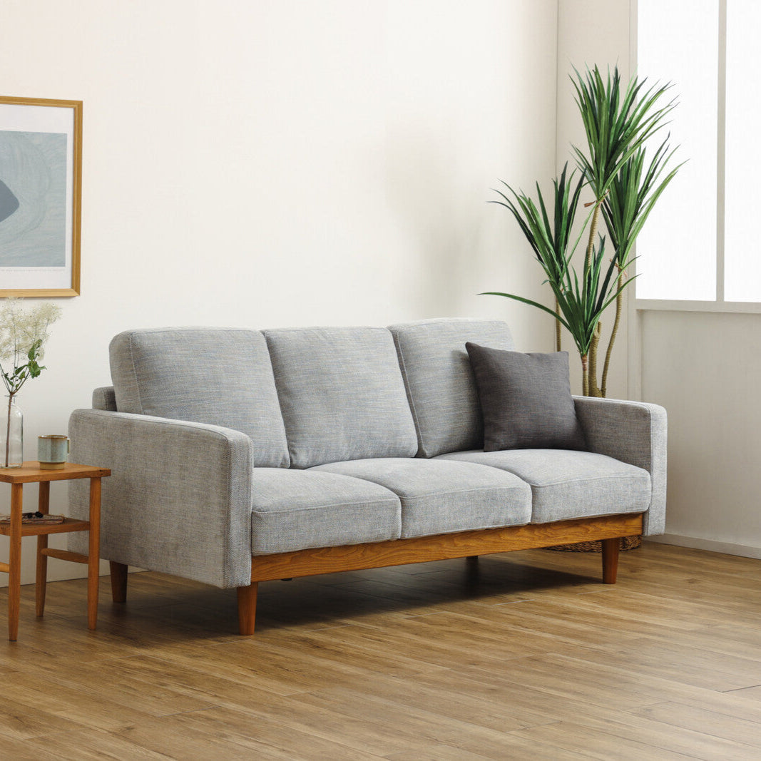 アッシュ材の前板がアクセントのファブリックソファです。ソファ下にあしらったアッシュ材がアクセントになっています。木目が美しく、ビンテージスタイルにもナチュラルスタイルにも合わせやすいデザインです。脚の高さが120mmあるため、お掃除ロボットもお使いいただけます。