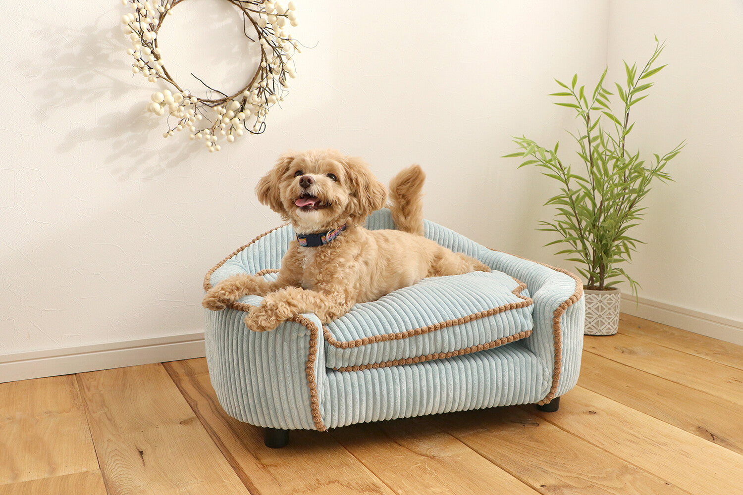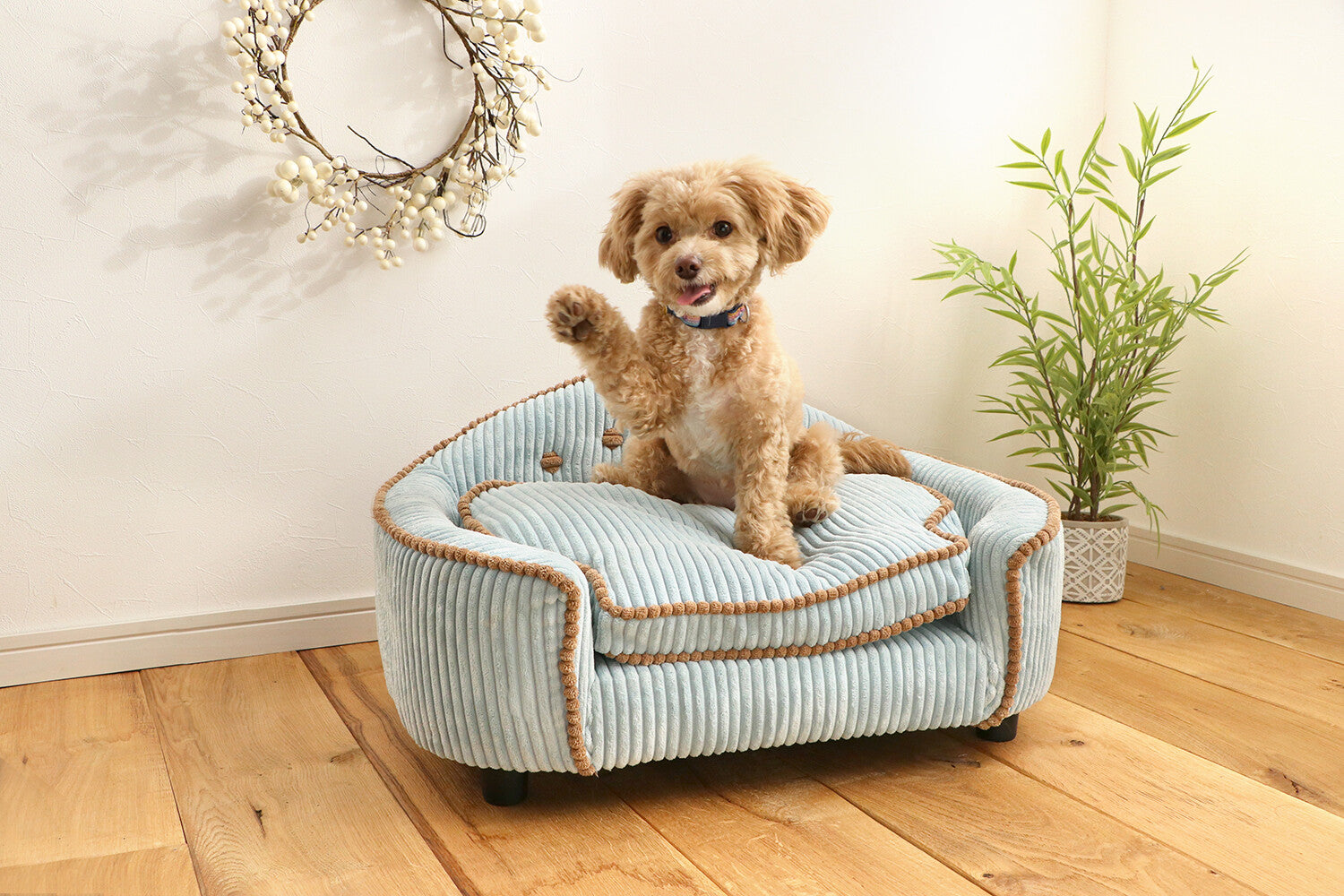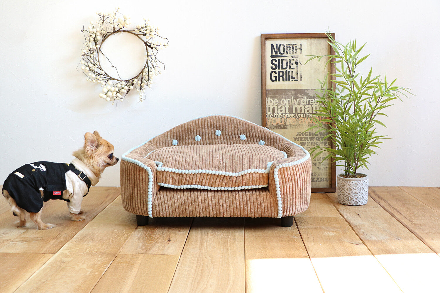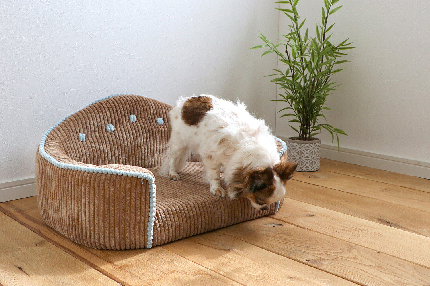 コーデュロイ生地が可愛らしいペットソファです。小型犬や高齢犬など高所が苦手なワンちゃんでも使えるように、脚は取り外すことができるので安心です。気持ちの良いふかふかのクッションで、ぐっすりお昼寝できます。SNS映え間違いなしのペット用ベッドです。