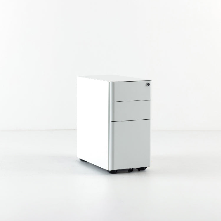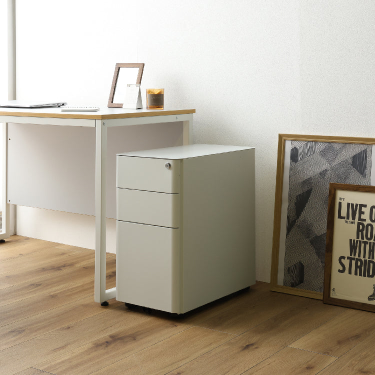 定番カラーでどんなデスクとも合わせやすいスチールワゴンです。丸みを持たせたエッジが目を惹き、柔らかい印象を与えます。前面に取っ手がないすっきりとしたデザインになっています。