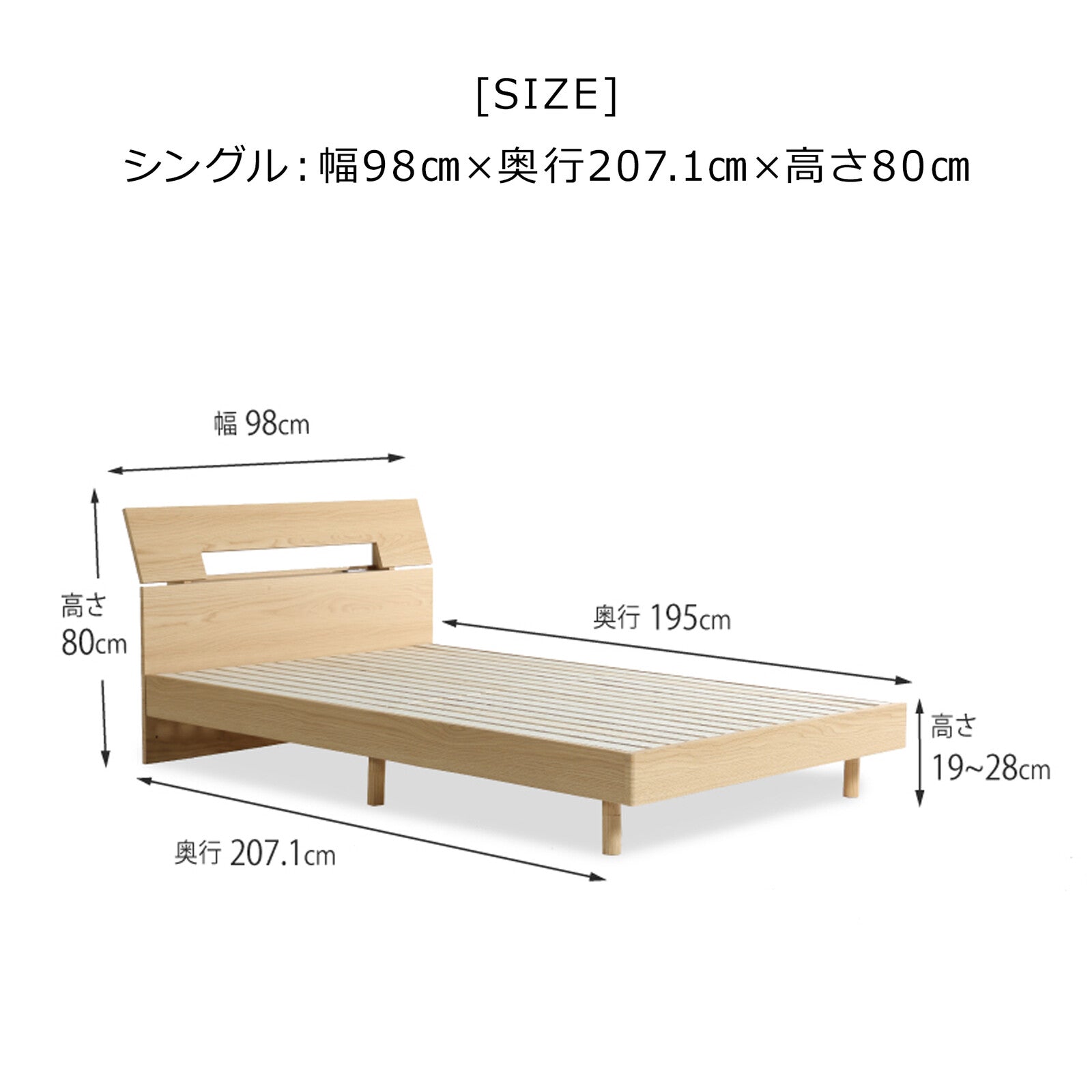 お好みで脚の高さを調節できるチョイ宮付きのベッドです。色はブラウン・ナチュラルの2色、サイズはシングル・セミダブル・ダブルの3展開です。 床面からの高さは19・28cmの2段階から調整可能 ヘッドボードには小物を置くのに丁度いいチョイ宮付き 2口コンセント付きで、枕元でスマートフォンの充電ができます。