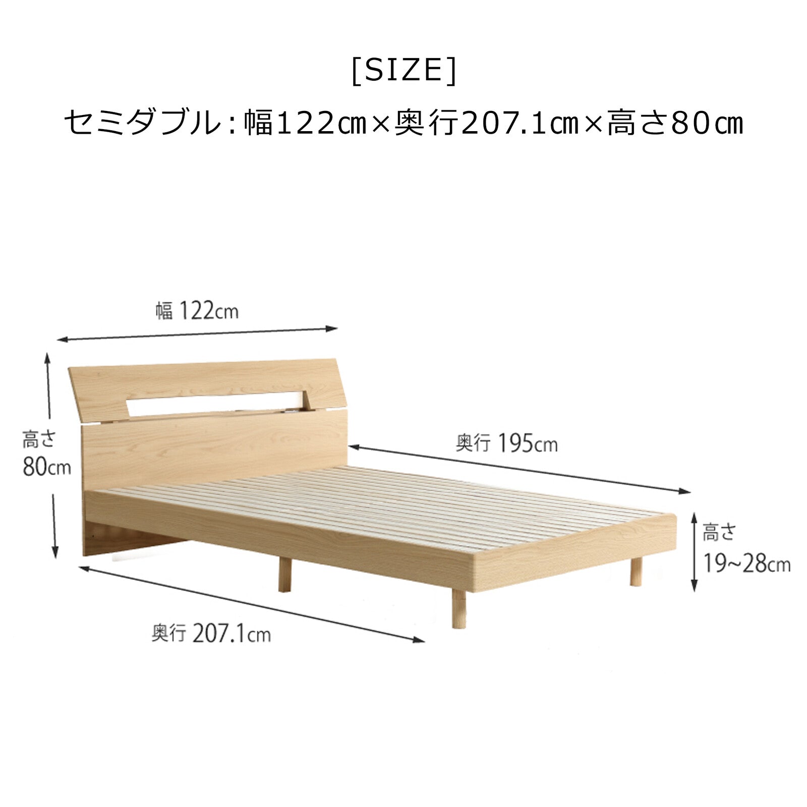 お好みで脚の高さを調節できるチョイ宮付きのベッドです。色はブラウン・ナチュラルの2色、サイズはシングル・セミダブル・ダブルの3展開です。 床面からの高さは19・28cmの2段階から調整可能 ヘッドボードには小物を置くのに丁度いいチョイ宮付き 2口コンセント付きで、枕元でスマートフォンの充電ができます。