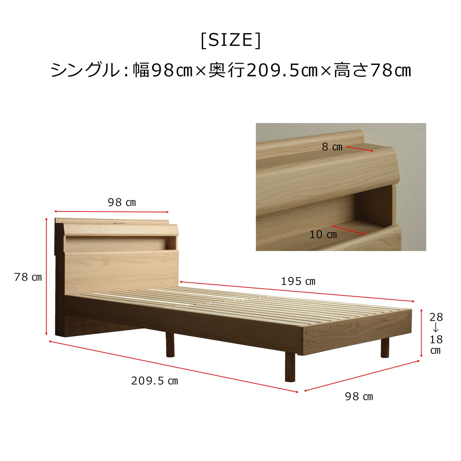 落ち着いた雰囲気をもつシンプルな宮付きベッドフレームです。色はブラウン・ナチュラルの2色、サイズはシングル・セミダブル・ダブルの3展開です。床面からの高さは19・28cmの2段階から調整可能 ヘッドボードには小物を置くのに丁度いいチョイ宮付で2口コンセント付と小物が置ける棚付です。端に丸みを持たせた優しいデザインのベッドフレームとなっております。