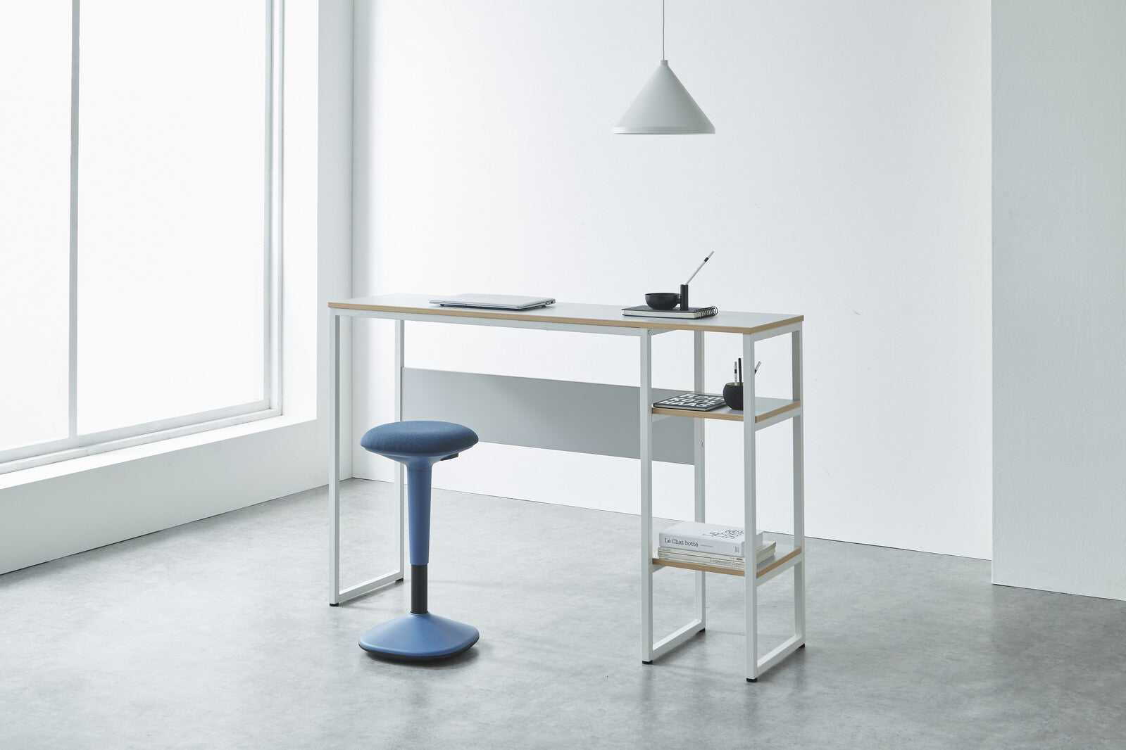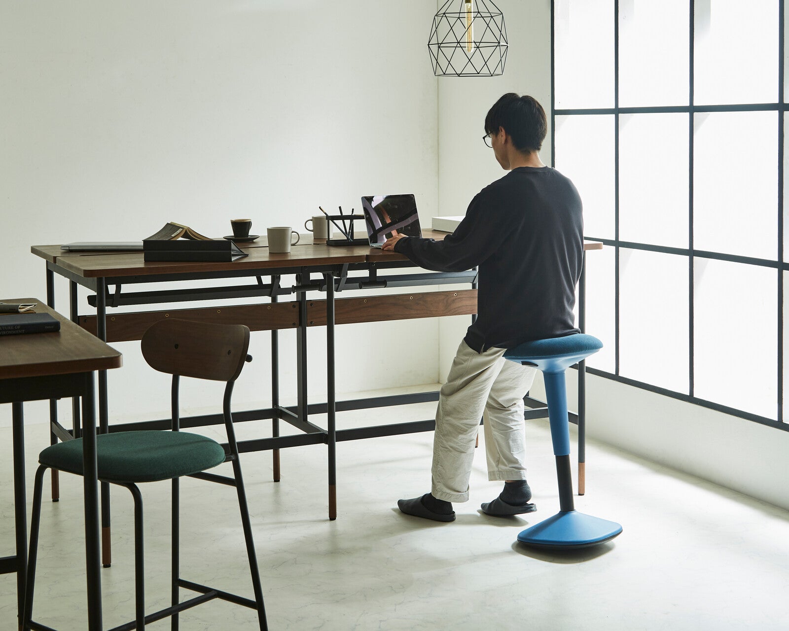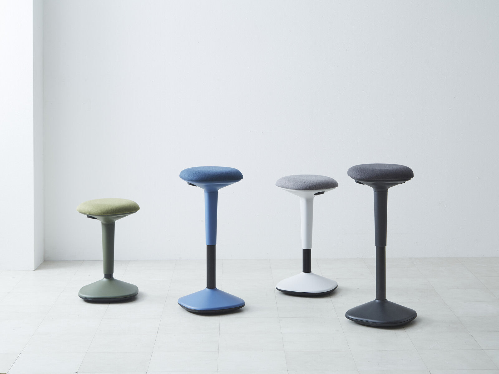 カラフルでシンプルなデザインの昇降式ハイスツールです。身体の動きに合わせて座面がゆらゆらと動くことで背中や腰の筋肉を使い、座りながらストレッチすることができます。また、身体を動かすことで脳が活性化し、集中力アップにも効果的です。座面裏のレバーで高さ調節ができるので、簡単にデスクの高さや身長に合わせて調節することができます。カラーはグリーン・ブルー・ホワイト・ブラックの4 色からお選びいただけます。デスクワークやちょっとしたミーティングなどのシーンにも最適なスツールです。身体を動かすことで脳が活性化し、集中力アップにも効果的です。グリップがあるので掴みやすく持ち運びも簡単です。高さが54~79cmまで調節可能なので、環境や身長に合わせてお使いいただけます。チェアに腰かけた時にバランスを取り、自然と正しい姿勢で座ることができます。