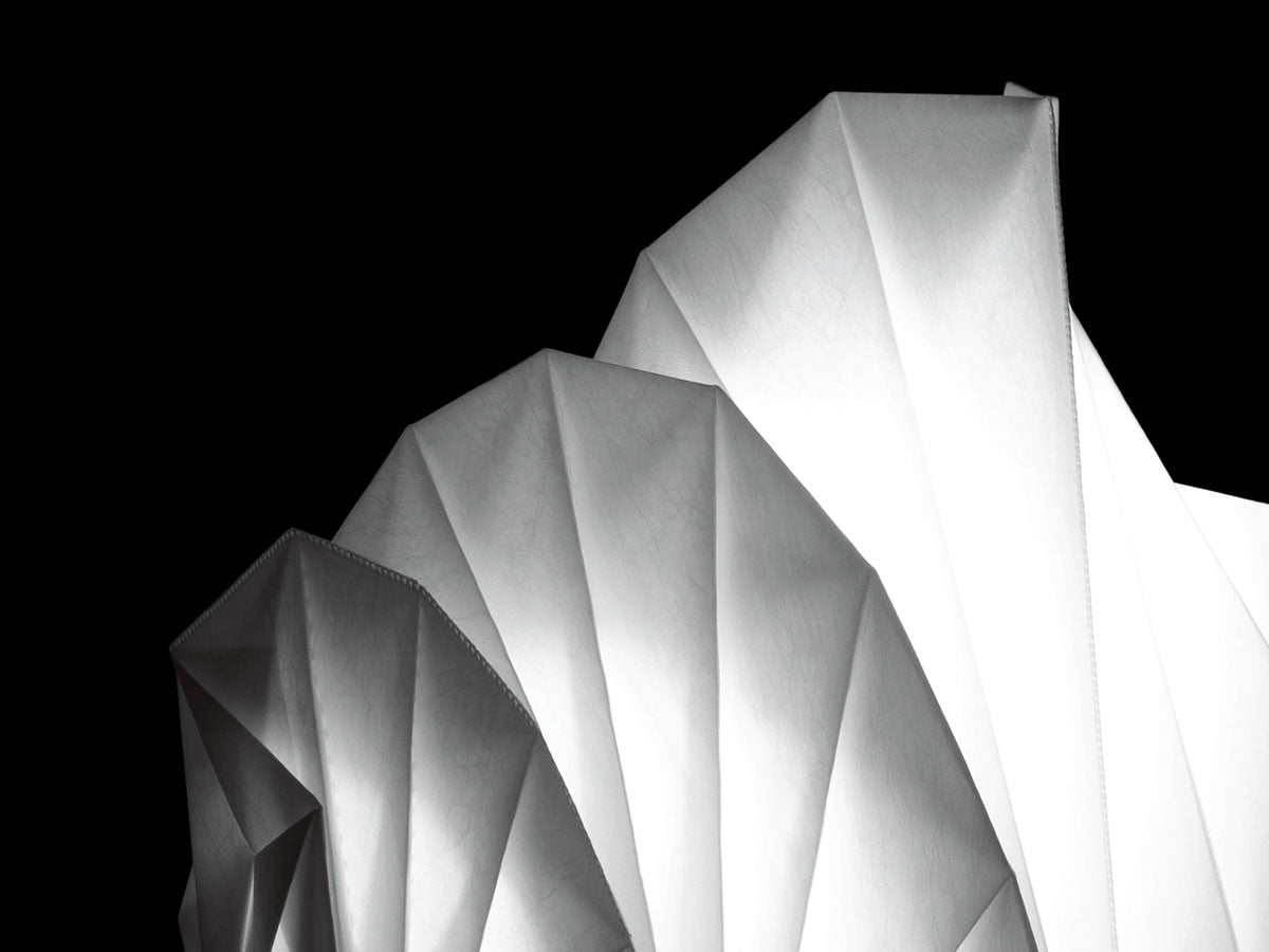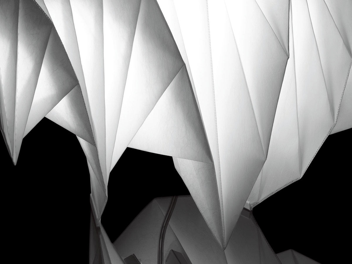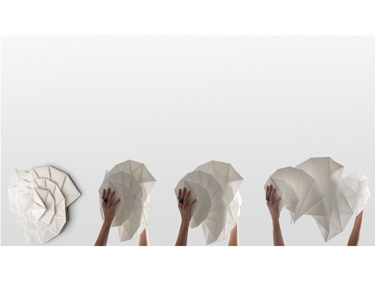 IN-EIは、PETボトルのリサイクル繊維のみで作られた不織布(リサイクルポリエステル素材)にしわ加工を施した、独特の外観と強度を持つ素材を使用し、ハンドメイドでつくられています。展開すると、シェードはらせん状に回転し、形状を3次元にし、素材の特性により、内部構造なしで素材を自由に立てたりぶら下げたりできます。様々な深さと影のパターンによって生み出される光のニュアンスからヒントを得て、現代の空間にこの品質の光をもたらす努力をしています。