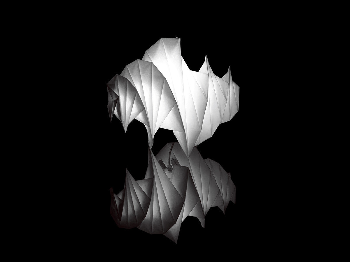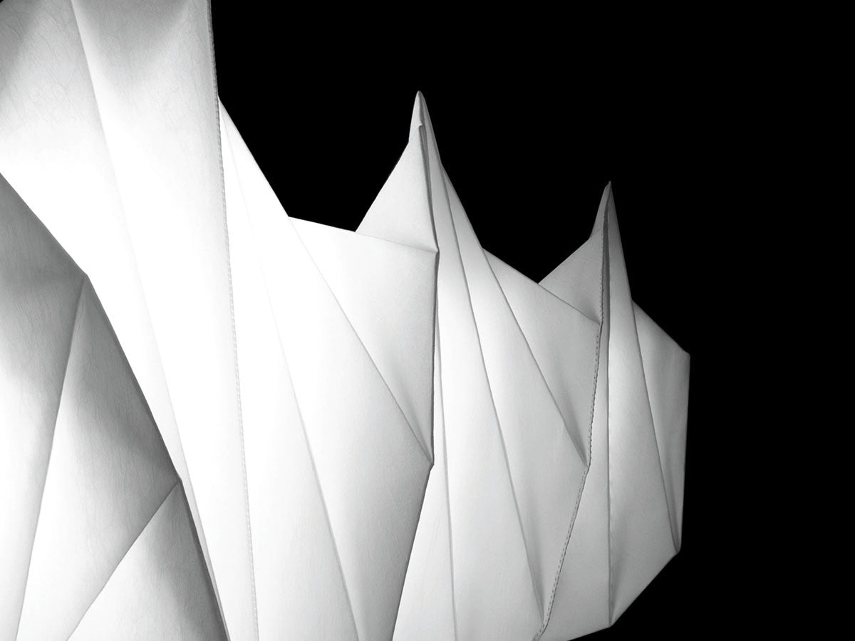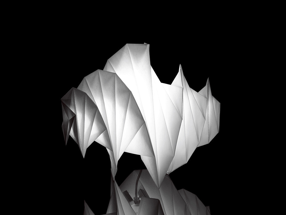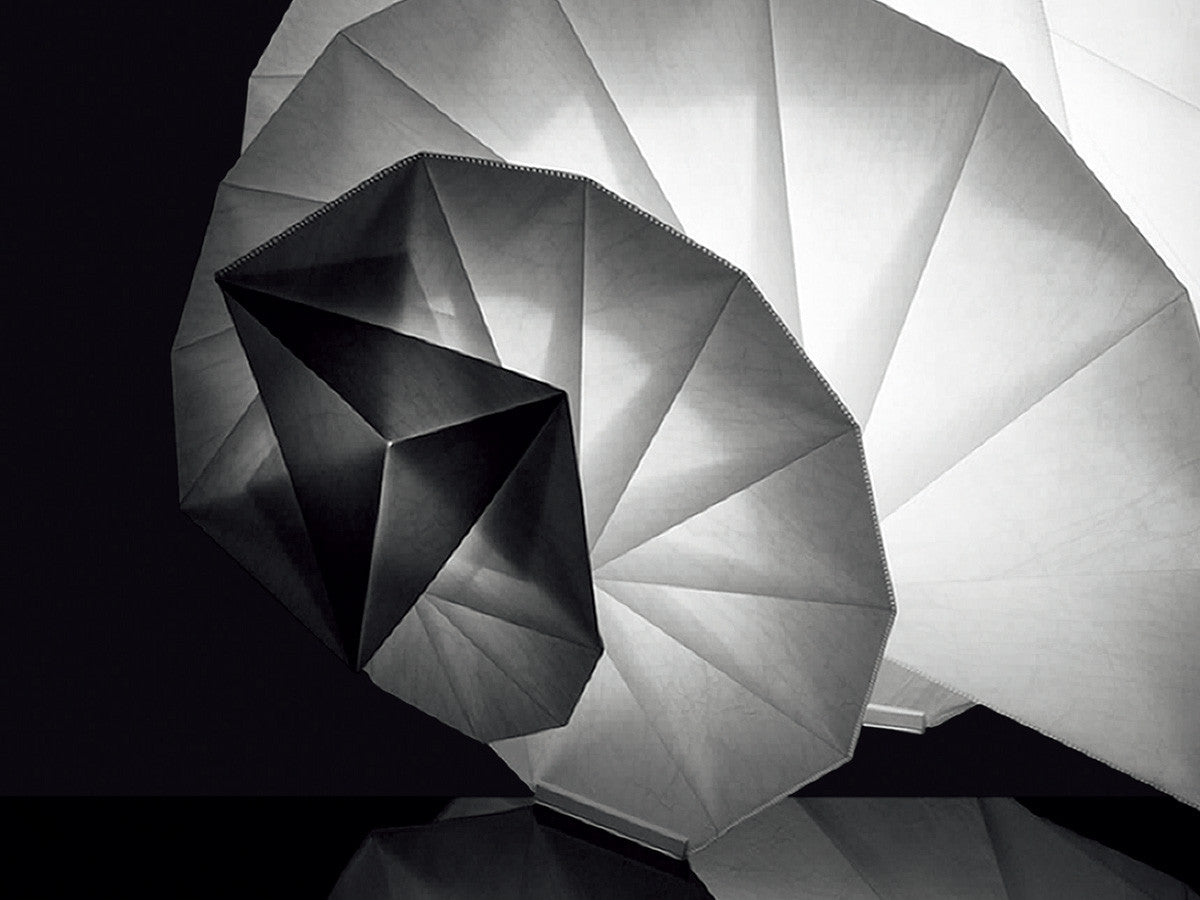 IN-EIは、PETボトルのリサイクル繊維のみで作られた不織布(リサイクルポリエステル素材)にしわ加工を施した、独特の外観と強度を持つ素材を使用し、ハンドメイドでつくられています。展開すると、シェードはらせん状に回転し、形状を3次元にし、素材の特性により、内部構造なしで素材を自由に立てたりぶら下げたりできます。様々な深さと影のパターンによって生み出される光のニュアンスからヒントを得て、現代の空間にこの品質の光をもたらす努力をしています。